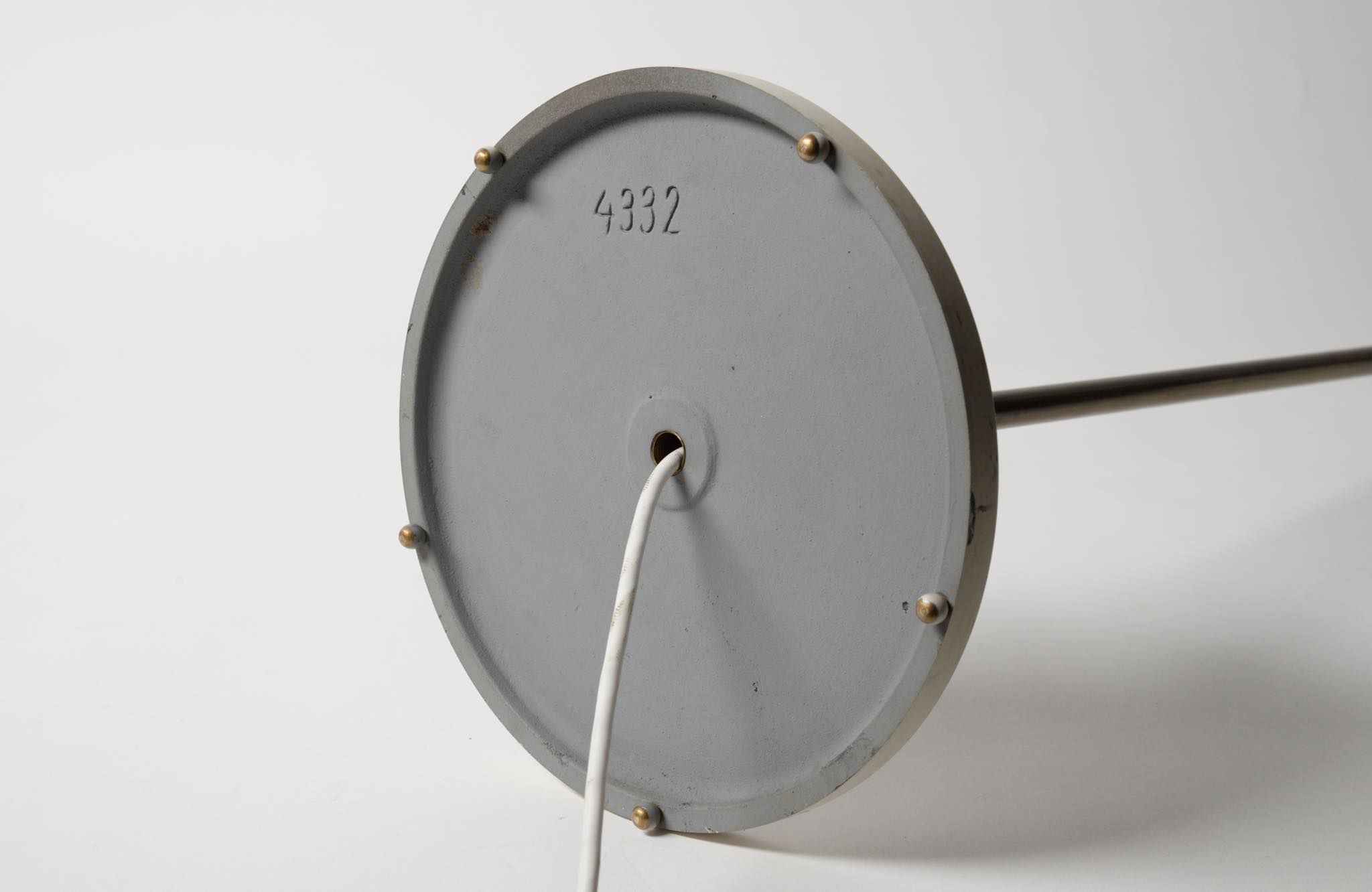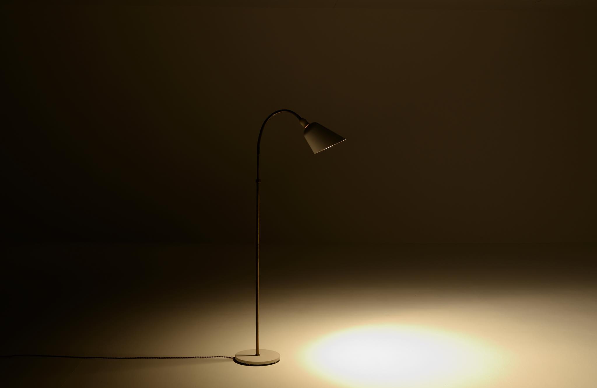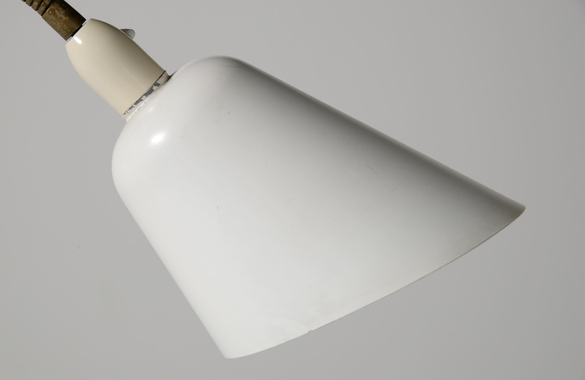 デンマークの高名な建築家、Arne Jacobsen/アルネ・ヤコブセンによって1929年に発表されたフロアランプです。自身の事務所を設立した年に発表されたランプで、「House of the future/未来の家」のためにデザインしたと云われています。ヤコブセンがその後に設計した大規模リゾート計画「ベルビュー」で有名になったこともあり、通称 "Bellevue lamp”として親しまれました。近年、&tradition社より復刻されておりますが、こちらは当時ルイス・ポールセン社によって作られたヴィンテージ品です。シェードとベースの白ペイントはオリジナルと思われます。