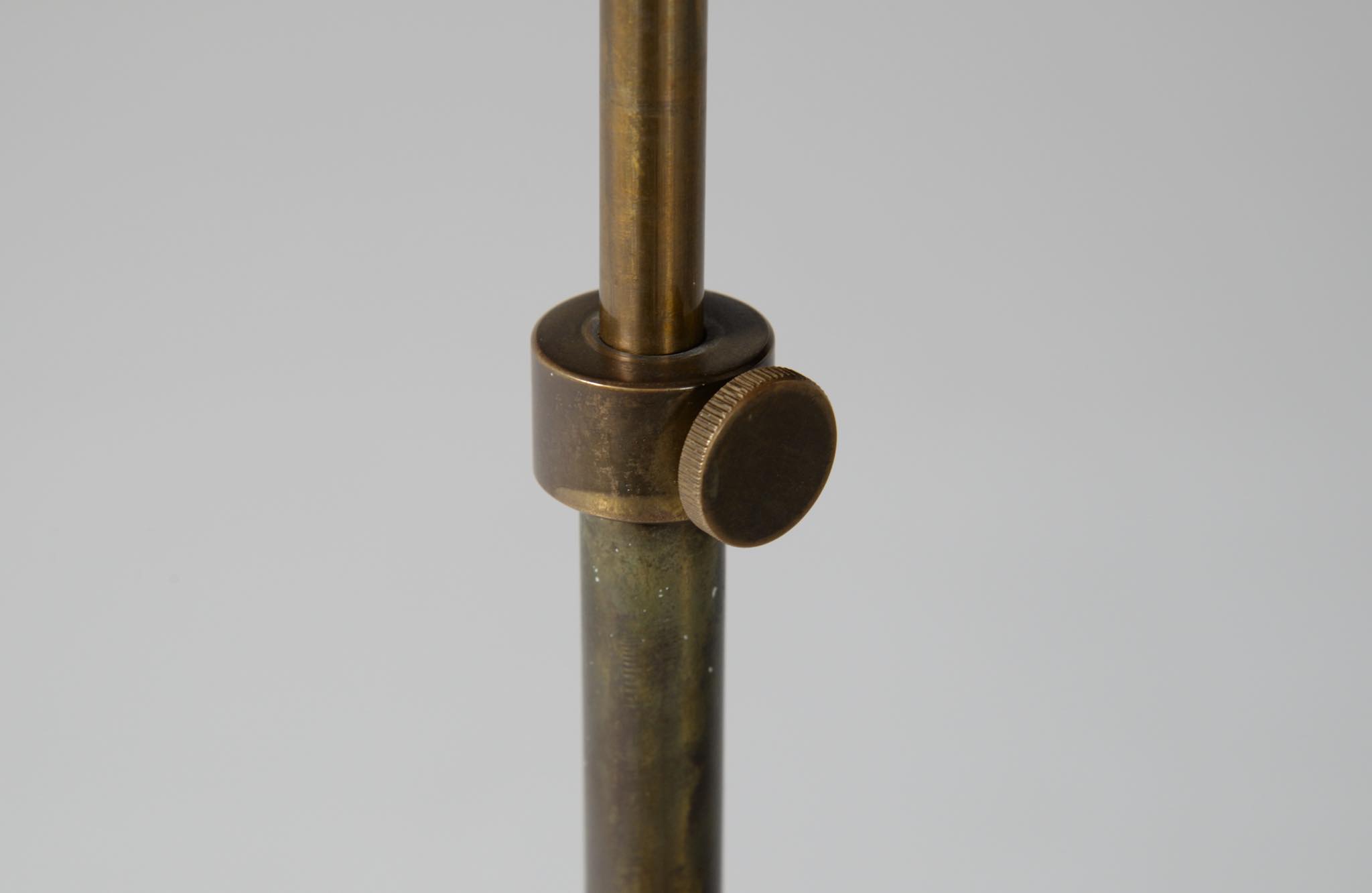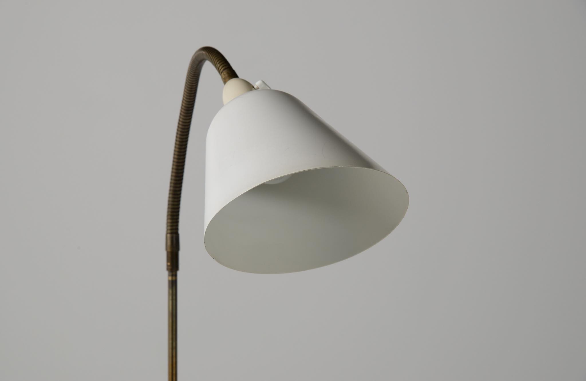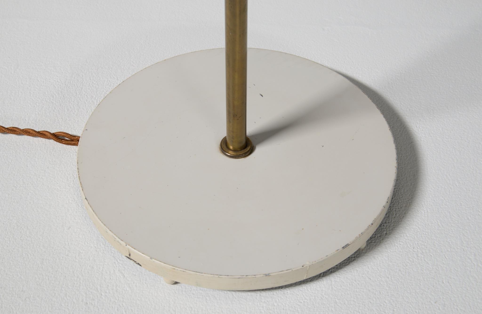 デンマークの高名な建築家、Arne Jacobsen/アルネ・ヤコブセンによって1929年に発表されたフロアランプです。自身の事務所を設立した年に発表されたランプで、「House of the future/未来の家」のためにデザインしたと云われています。ヤコブセンがその後に設計した大規模リゾート計画「ベルビュー」で有名になったこともあり、通称 "Bellevue lamp”として親しまれました。近年、&tradition社より復刻されておりますが、こちらは当時ルイス・ポールセン社によって作られたヴィンテージ品です。シェードとベースの白ペイントはオリジナルと思われます。