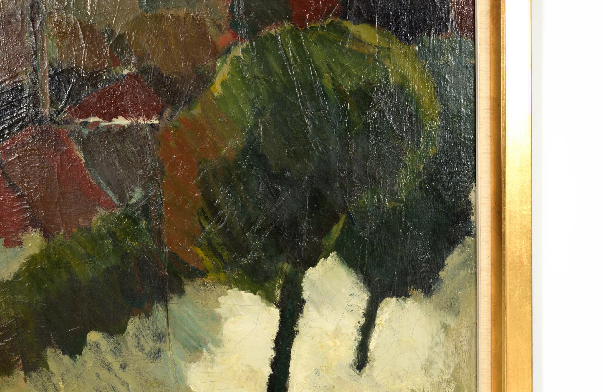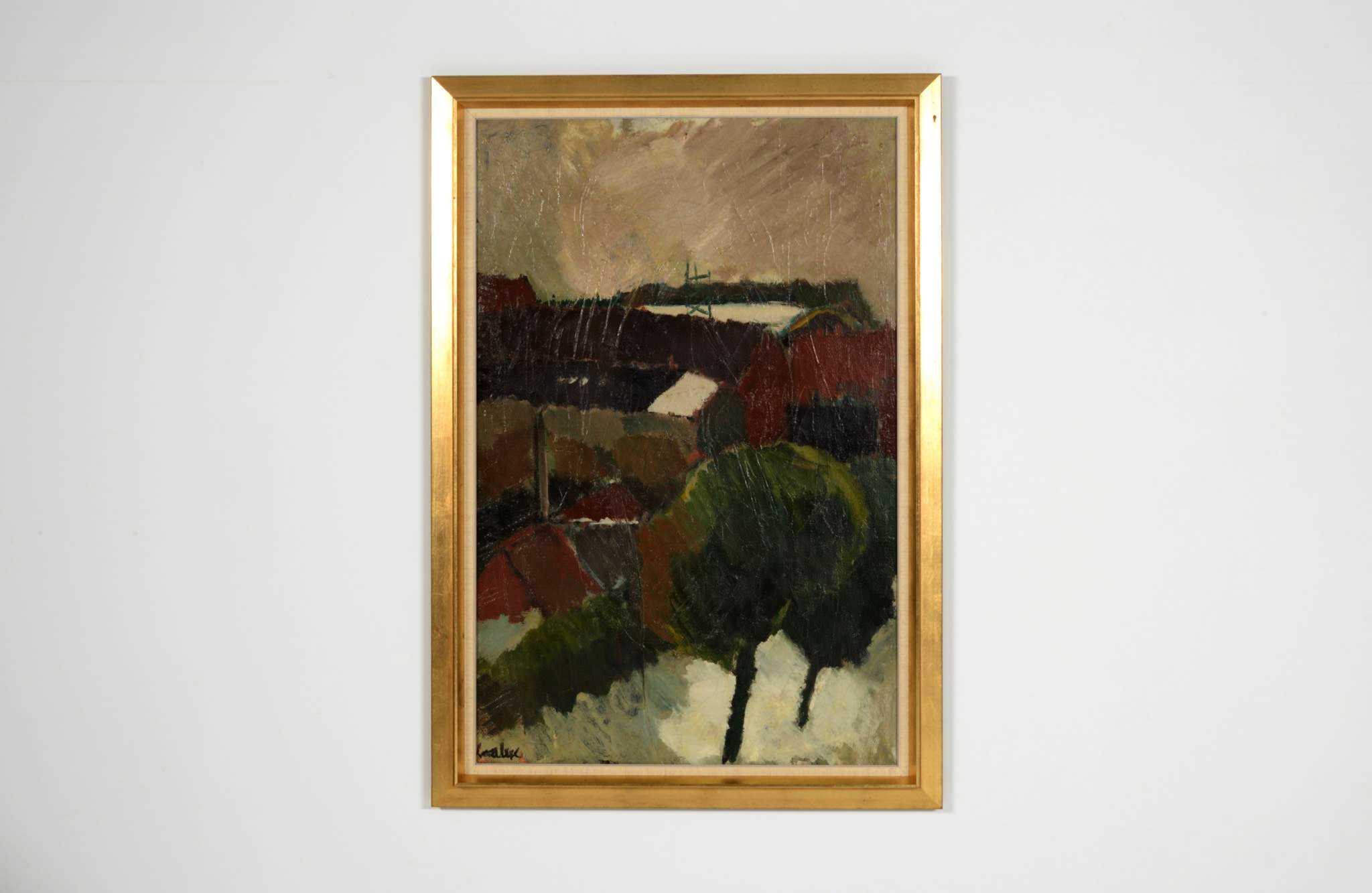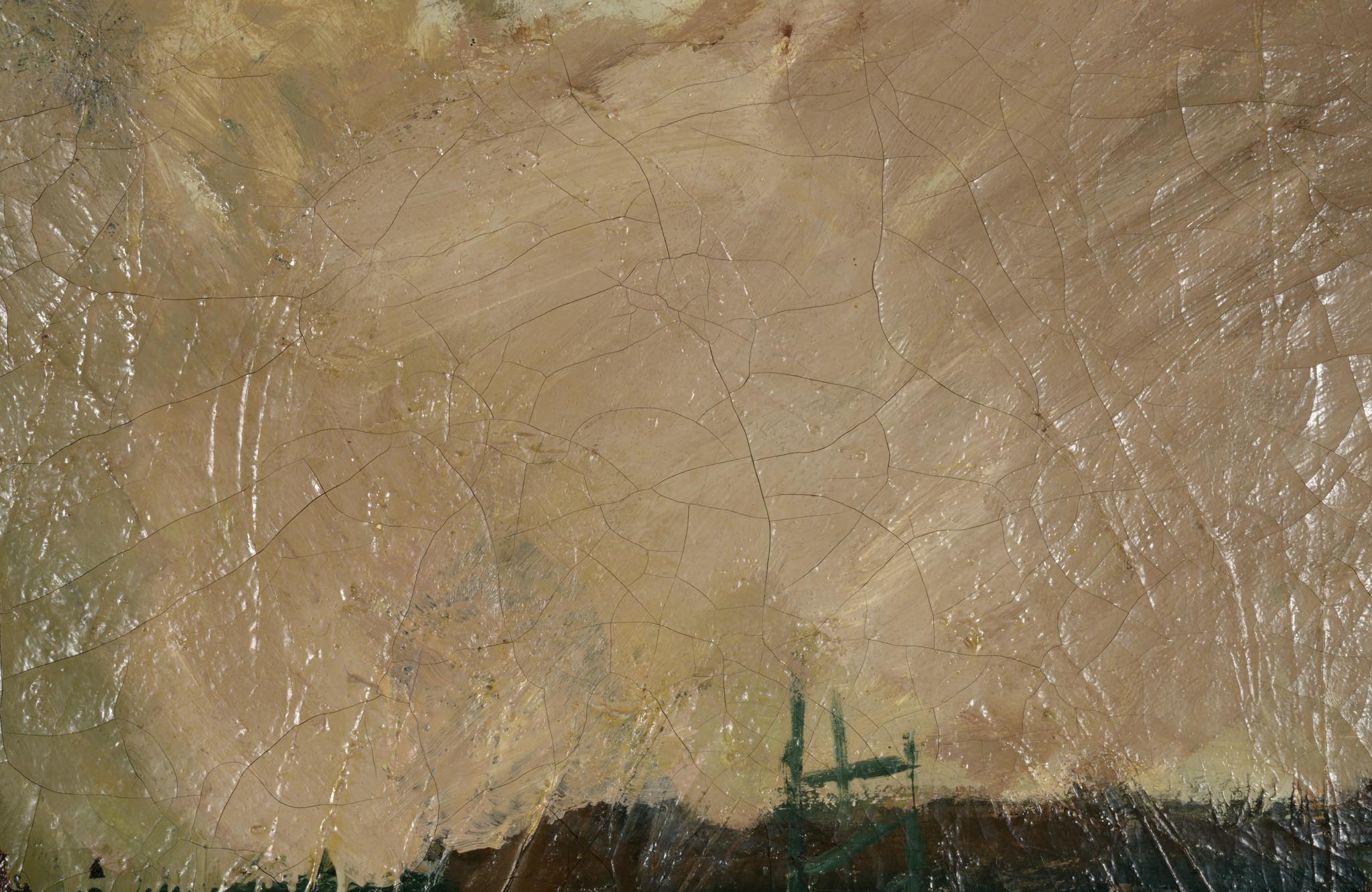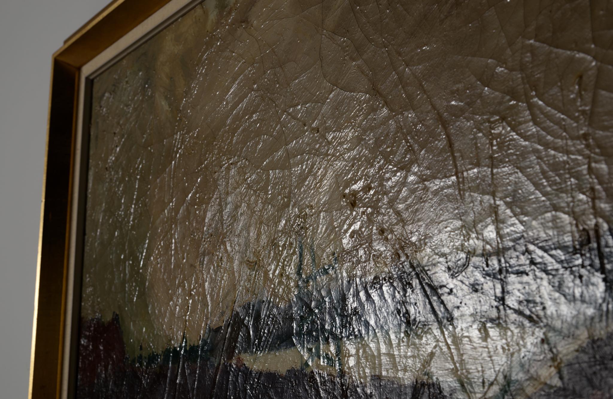 デンマークの画家、Svend Saabye/スヴェン・サービュによる風景画、大振りな作品です。高台から望む深秋の様子が独特の構図で描かれています。また、下地にレリーフを思わせるような表面の凹凸も表現されているようです。この撮影では光を強く当てているためその凹凸感が強く現れていますが、実際はもう少し落ち着いた雰囲気です。また、乾燥によるものか、絵の具の表面に無数のひび割れが見られますが、大きなダメージではなさそうで、ひび割れが進行することもなさそうです。レリーフのような凹凸感とひび割れとが相まって複雑な表情を見せています。当初キャンバスに緩みが見られたため、作品に裏打ちを行いボードに張りました。金箔のフレームはオリジナルで、コンディションは良好と言って良いでしょう。