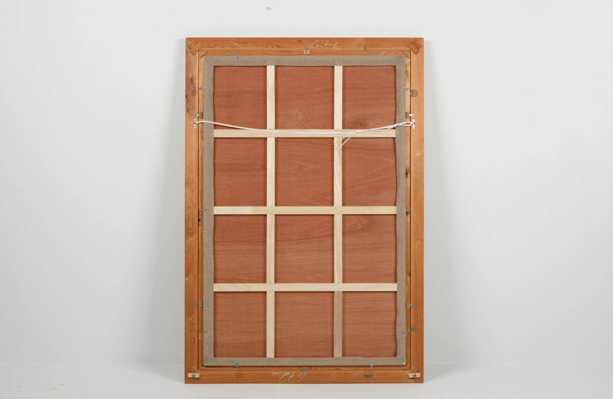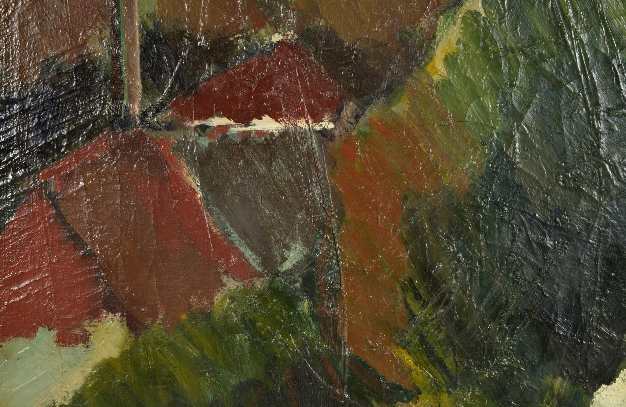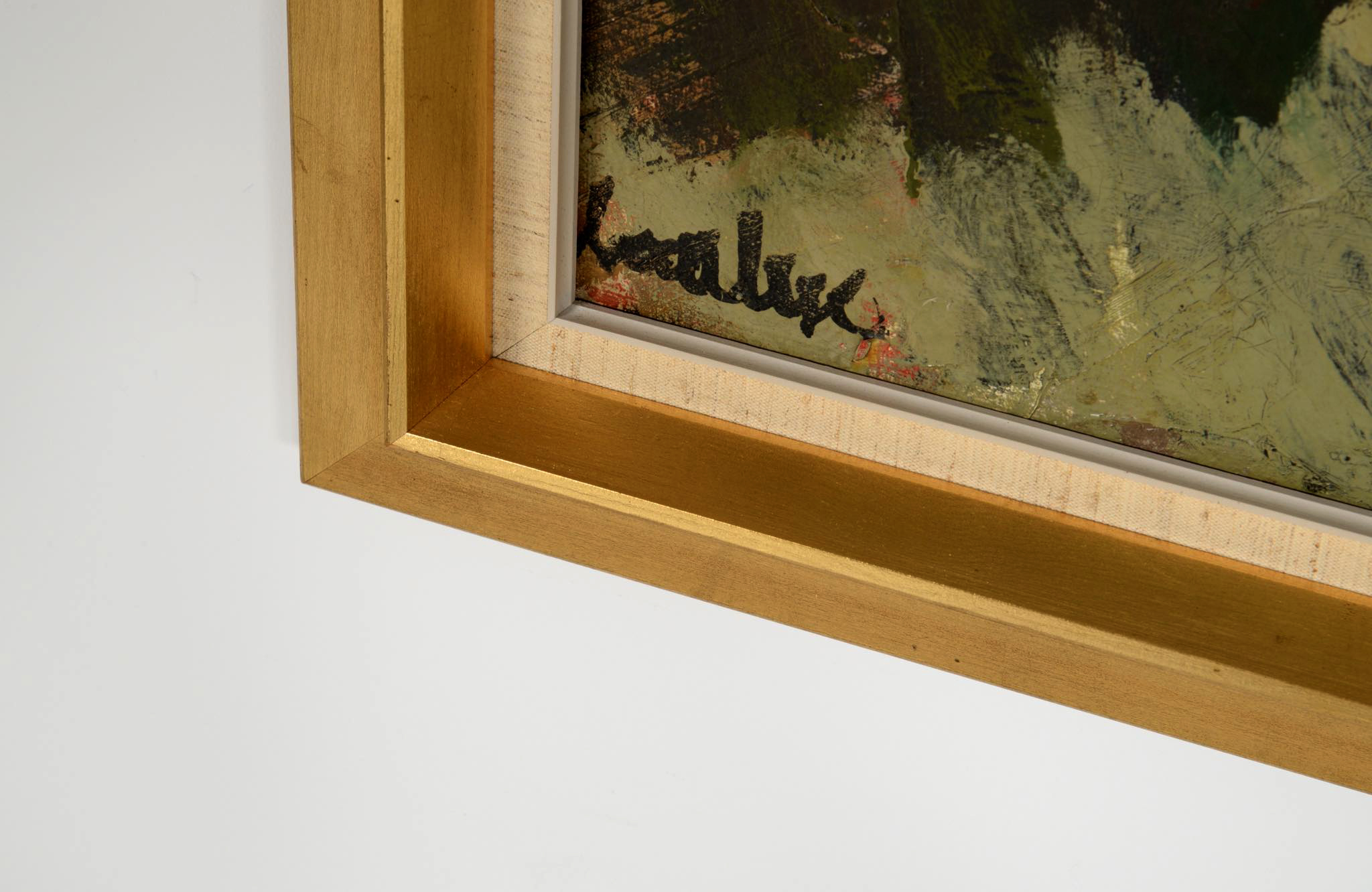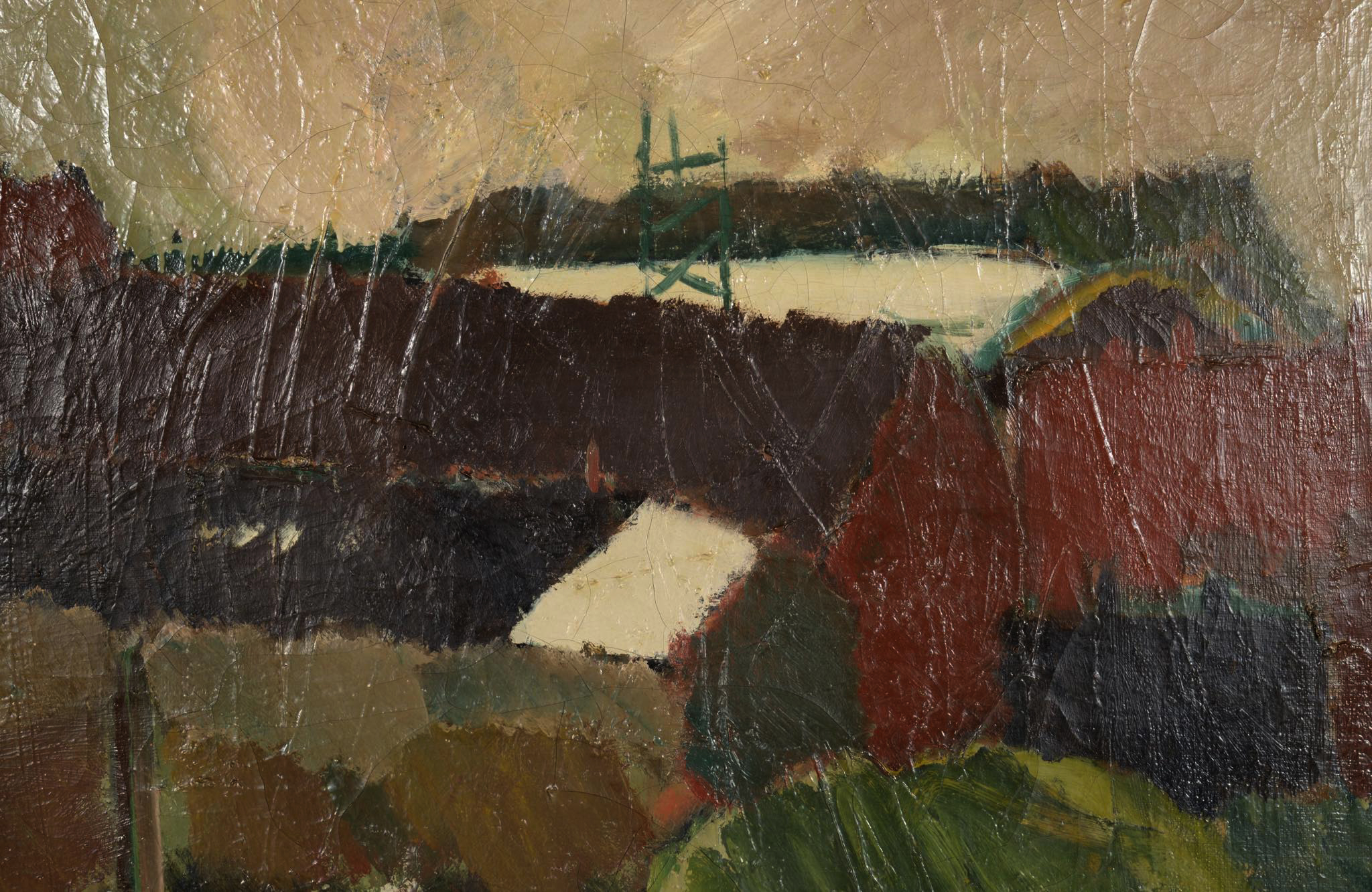 デンマークの画家、Svend Saabye/スヴェン・サービュによる風景画、大振りな作品です。高台から望む深秋の様子が独特の構図で描かれています。また、下地にレリーフを思わせるような表面の凹凸も表現されているようです。この撮影では光を強く当てているためその凹凸感が強く現れていますが、実際はもう少し落ち着いた雰囲気です。また、乾燥によるものか、絵の具の表面に無数のひび割れが見られますが、大きなダメージではなさそうで、ひび割れが進行することもなさそうです。レリーフのような凹凸感とひび割れとが相まって複雑な表情を見せています。当初キャンバスに緩みが見られたため、作品に裏打ちを行いボードに張りました。金箔のフレームはオリジナルで、コンディションは良好と言って良いでしょう。