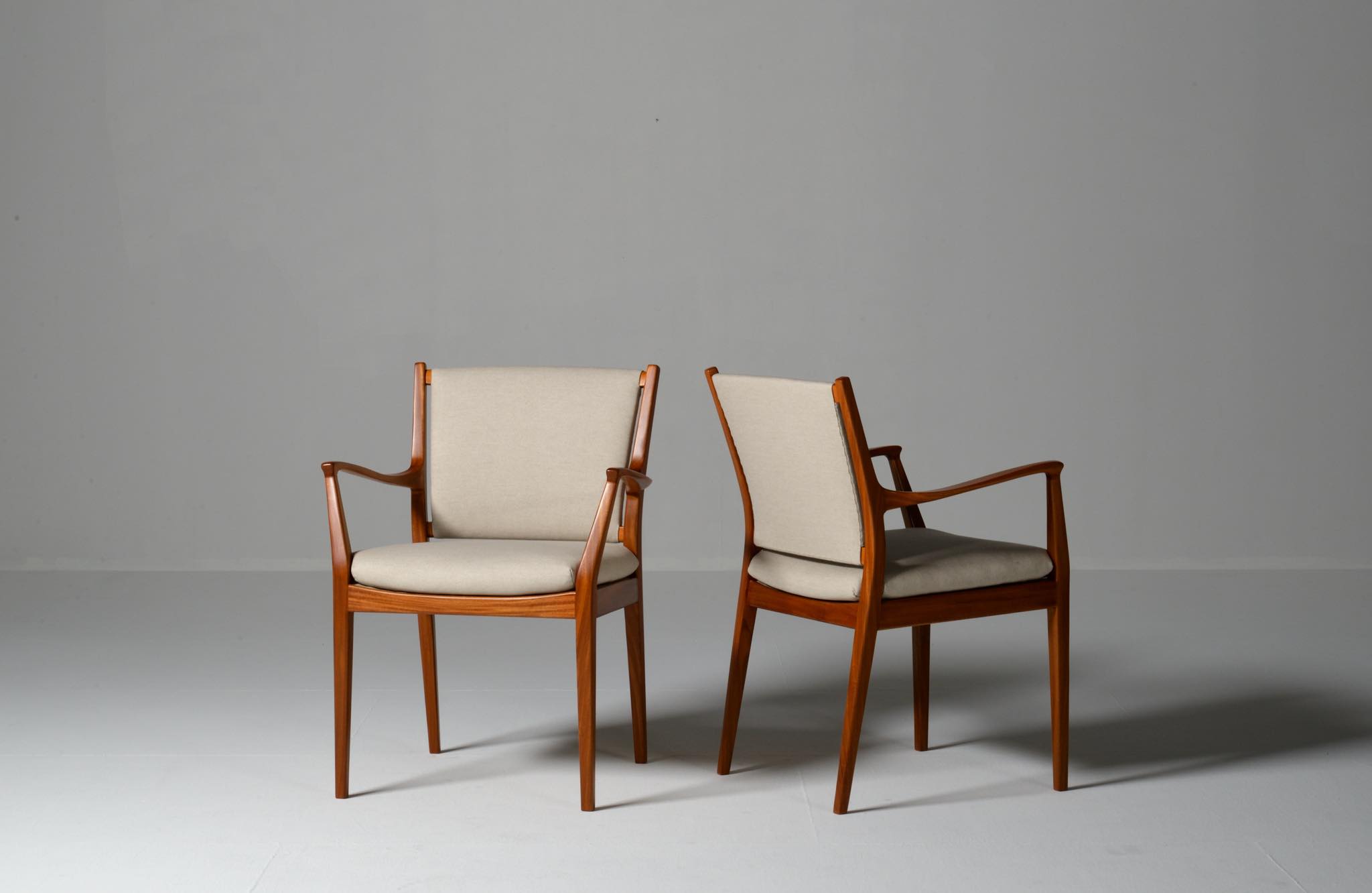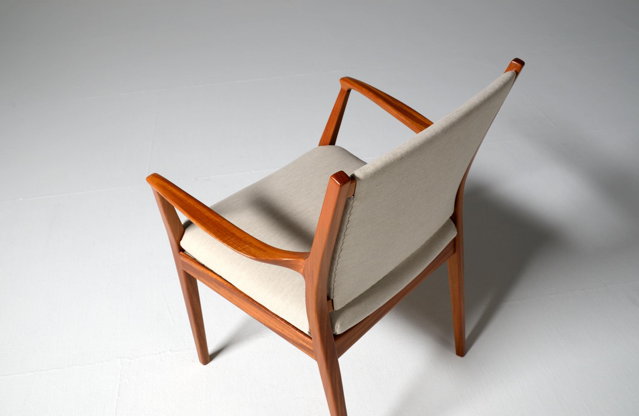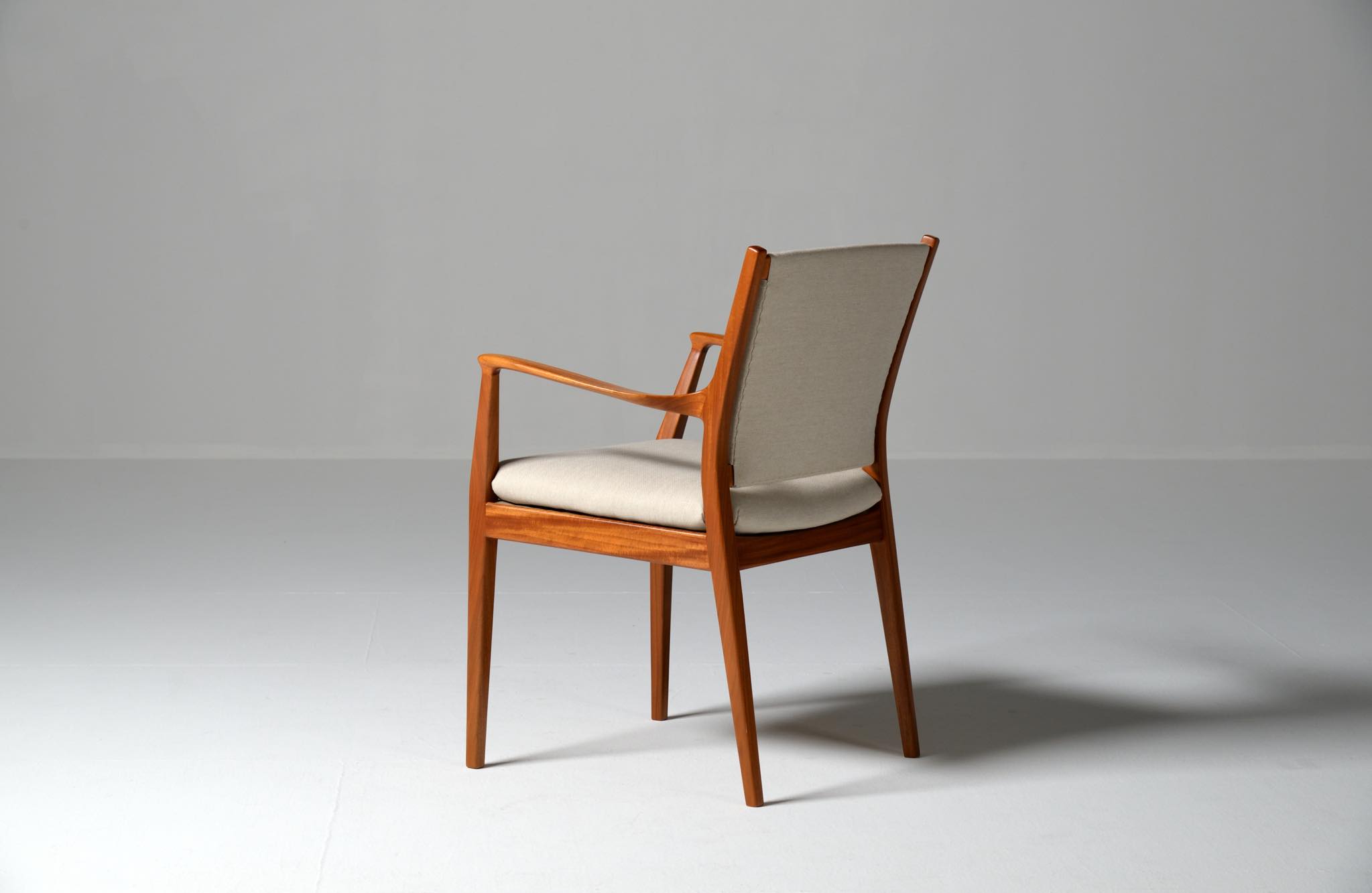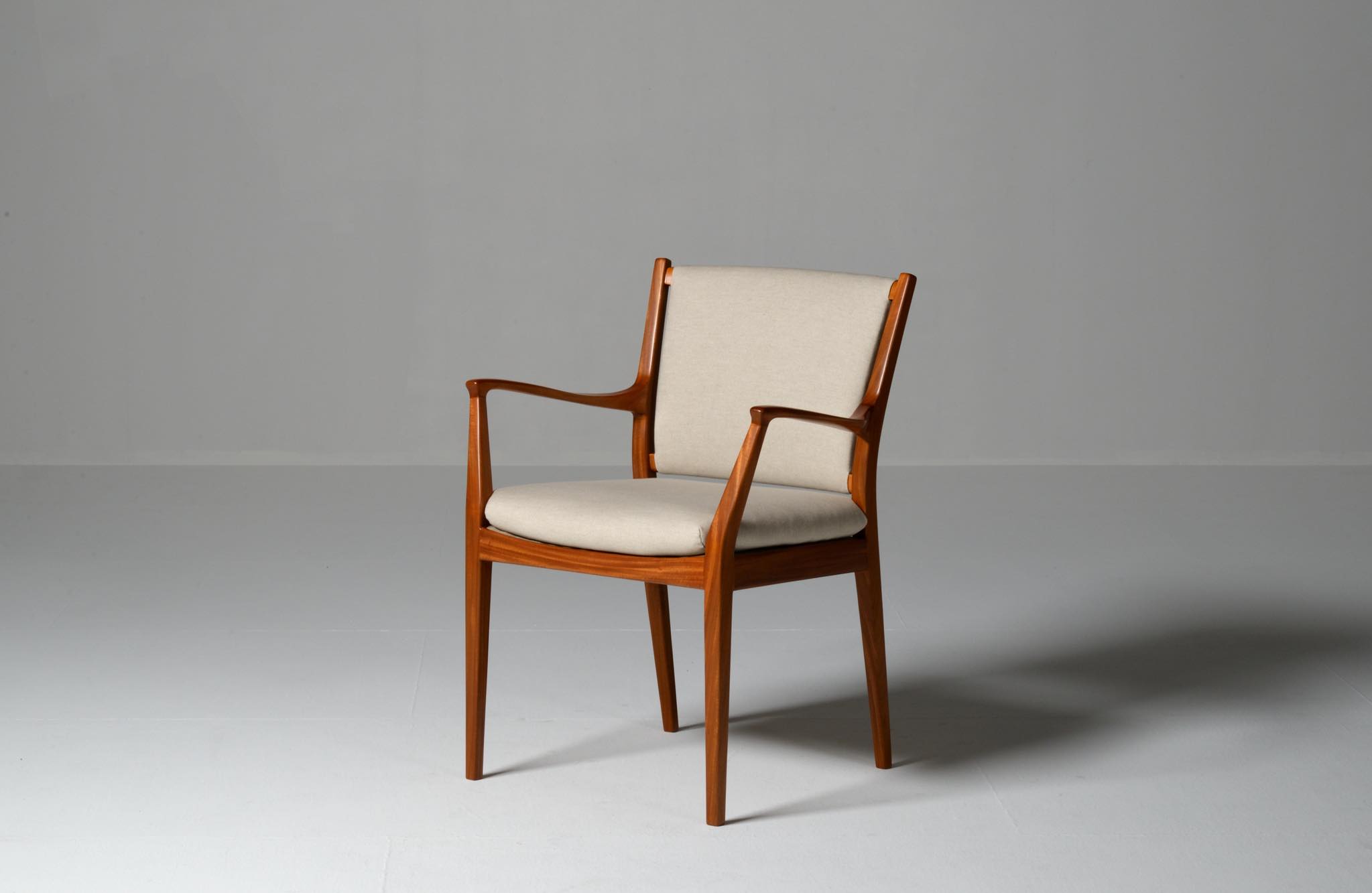 デンマークの家具デザイナー、Erik Kolling Andersen/エリック・コーリング・アナセンによるアームチェア、一対です。名工ペダー・ペダーセンによって作られたもので、フレームにはマホガニー材が用いられています。背もたれとシートはイタリアの生地メーカー、ロロ・ピアーナ・インテリアのコットンリネン生地を用いて張り替えました。肌理の細かな綺麗な生地です。シートの下にはスプリング式のウェビングが設られており、お尻の当たりも柔らかく、座り心地の良い椅子です。こちらは一対での販売となります。