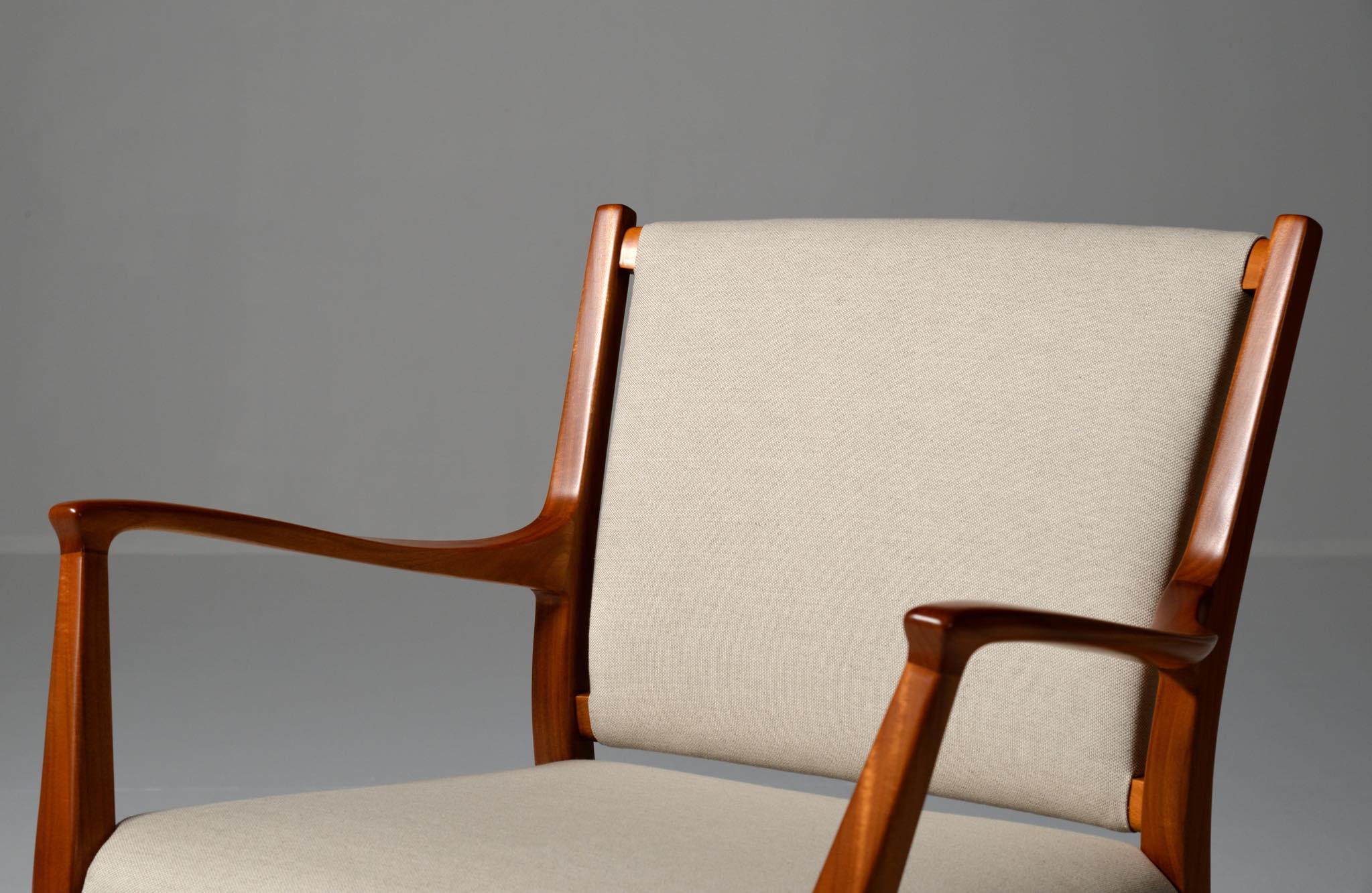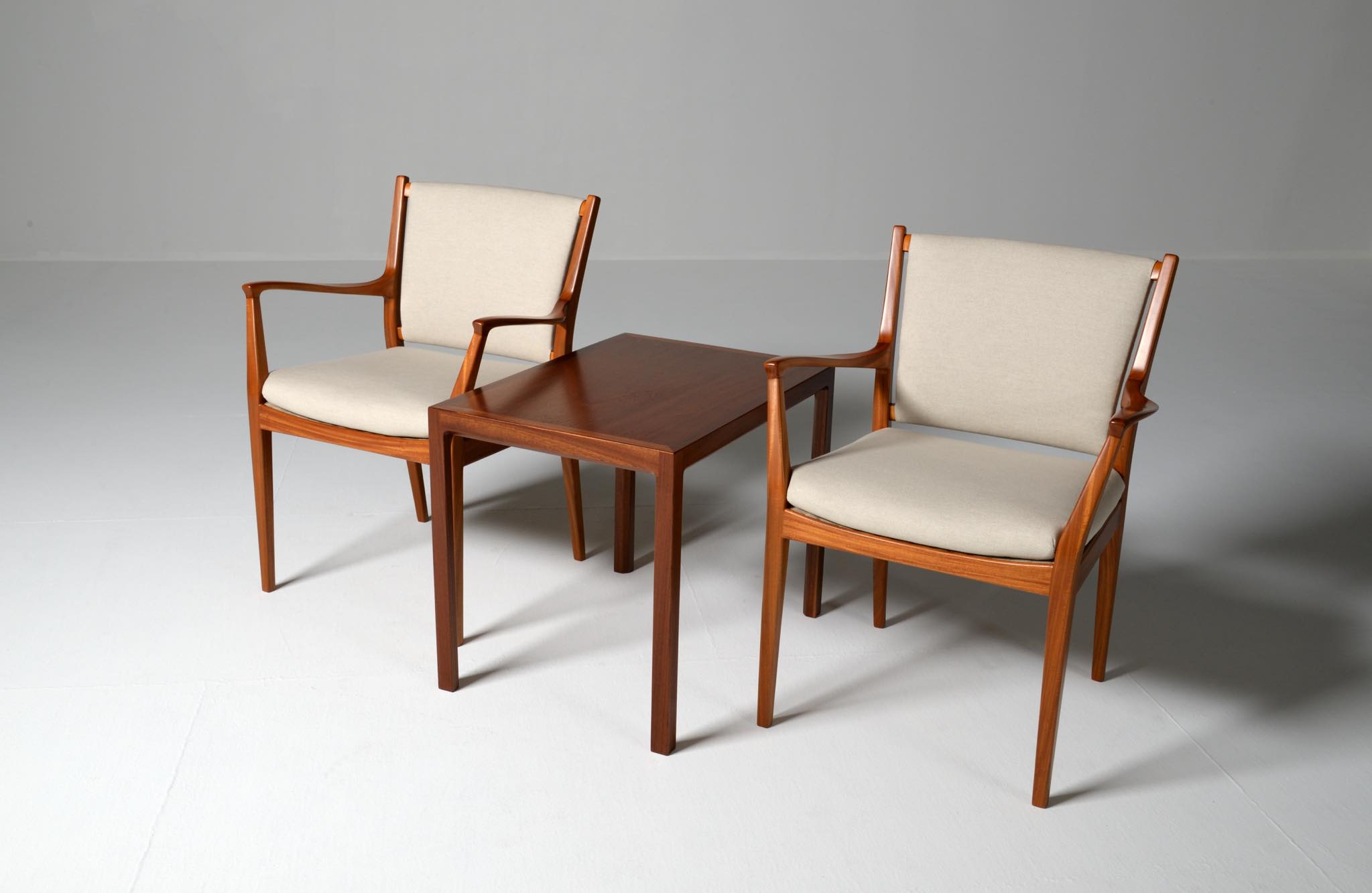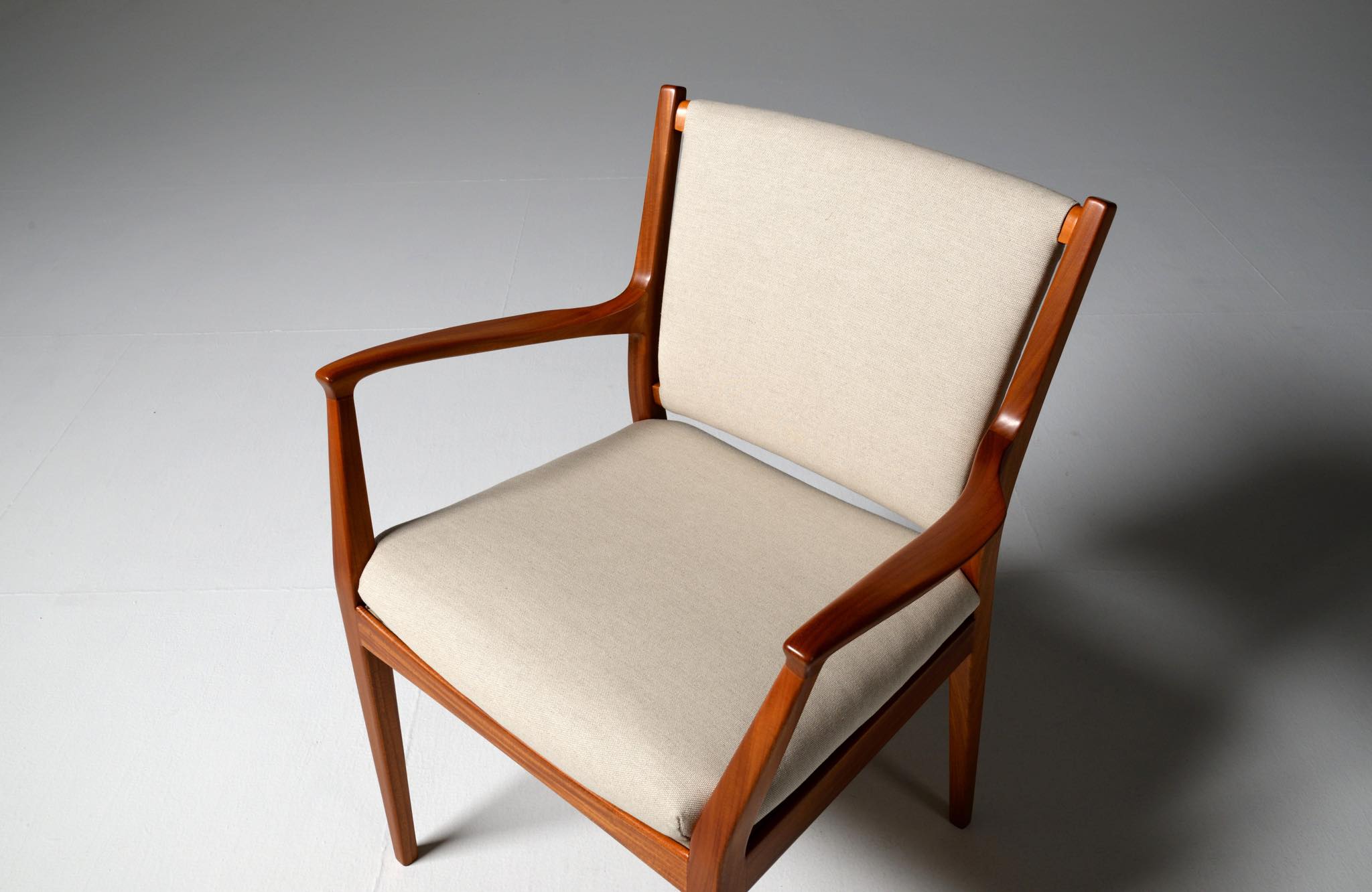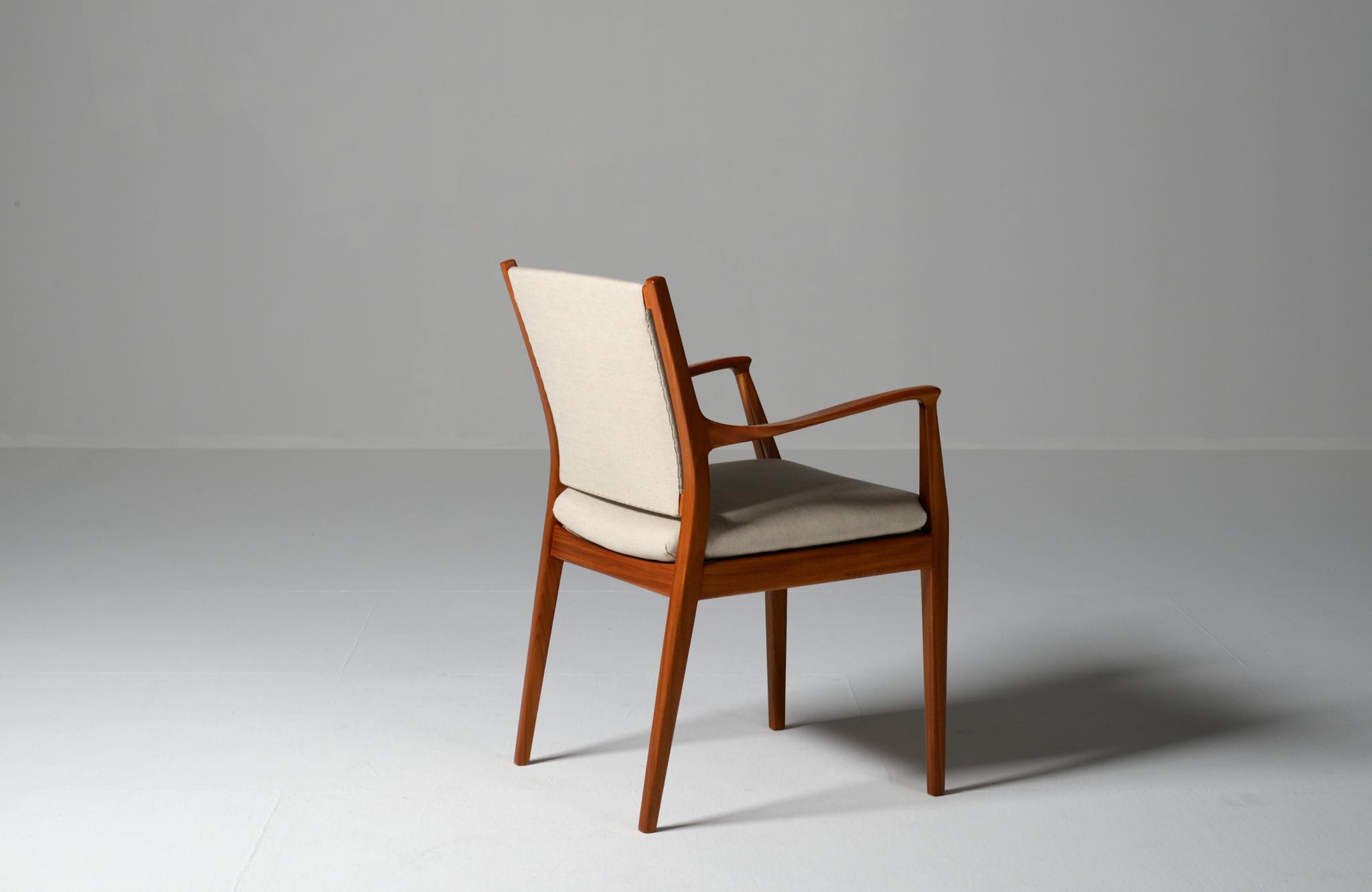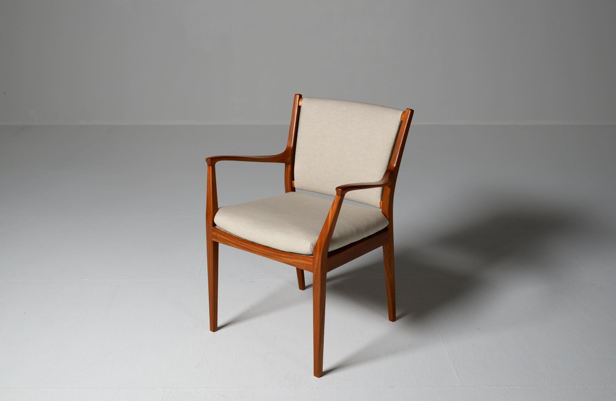 デンマークの家具デザイナー、Erik Kolling Andersen/エリック・コーリング・アナセンによるアームチェア、一対です。名工ペダー・ペダーセンによって作られたもので、フレームにはマホガニー材が用いられています。背もたれとシートはイタリアの生地メーカー、ロロ・ピアーナ・インテリアのコットンリネン生地を用いて張り替えました。肌理の細かな綺麗な生地です。シートの下にはスプリング式のウェビングが設られており、お尻の当たりも柔らかく、座り心地の良い椅子です。こちらは一対での販売となります。