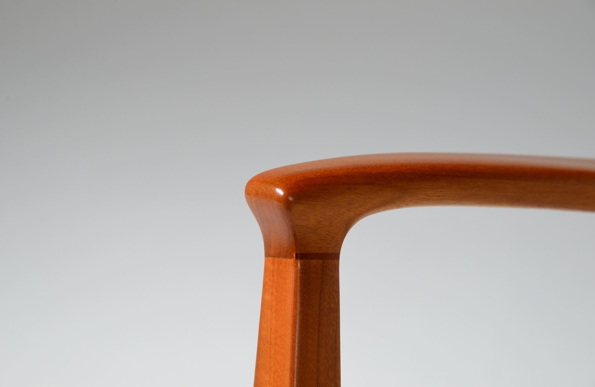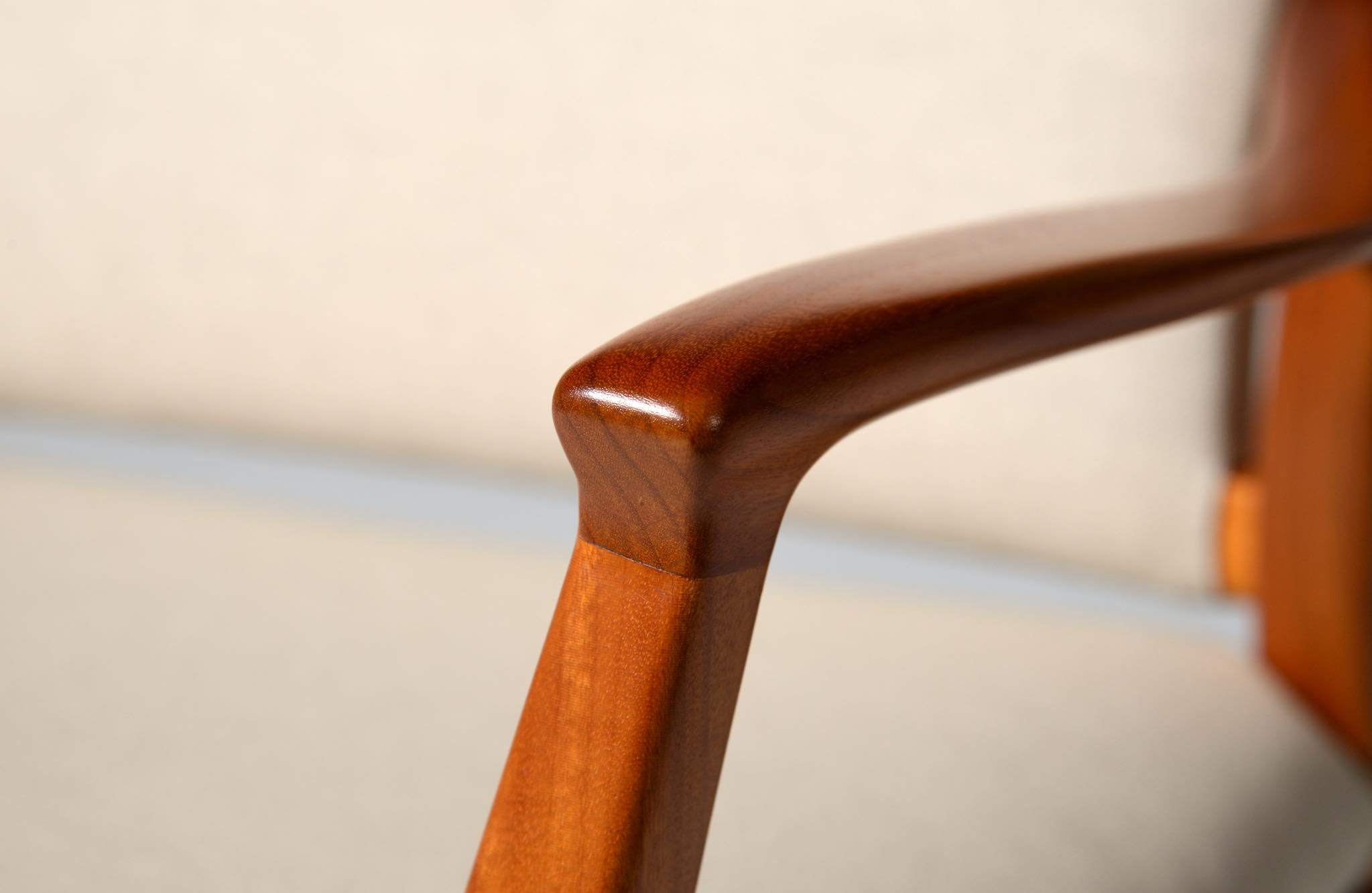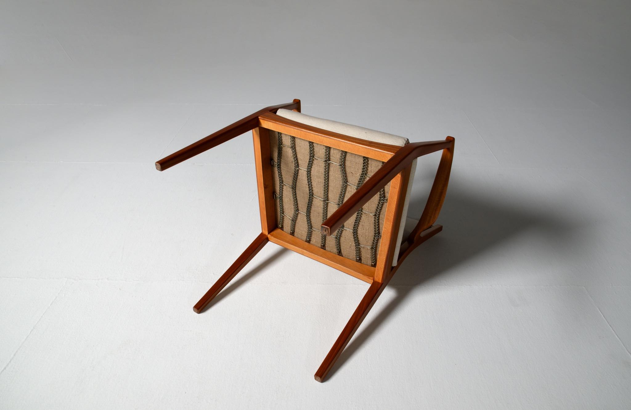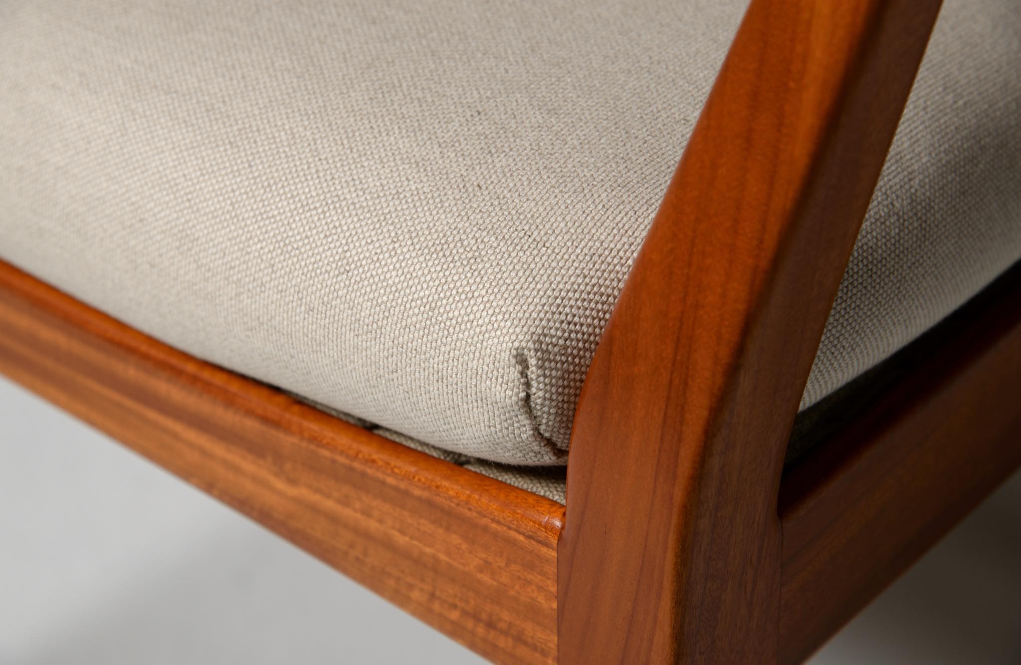 デンマークの家具デザイナー、Erik Kolling Andersen/エリック・コーリング・アナセンによるアームチェア、一対です。名工ペダー・ペダーセンによって作られたもので、フレームにはマホガニー材が用いられています。背もたれとシートはイタリアの生地メーカー、ロロ・ピアーナ・インテリアのコットンリネン生地を用いて張り替えました。肌理の細かな綺麗な生地です。シートの下にはスプリング式のウェビングが設られており、お尻の当たりも柔らかく、座り心地の良い椅子です。こちらは一対での販売となります。