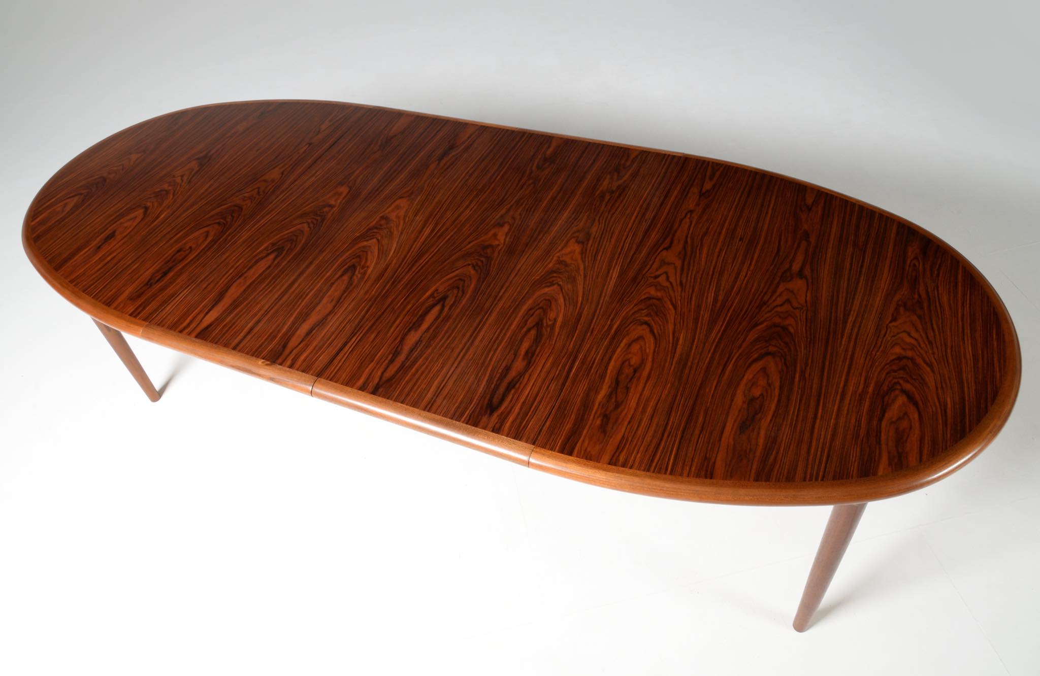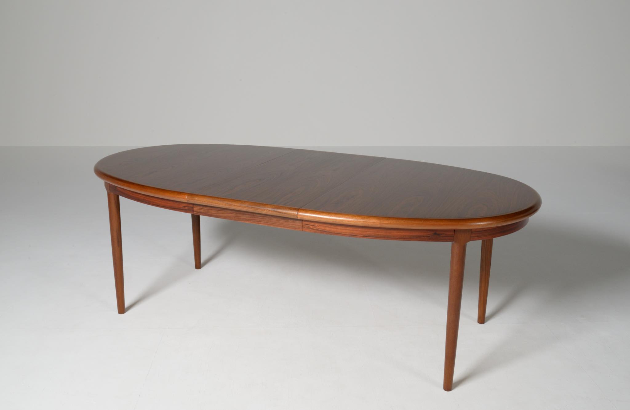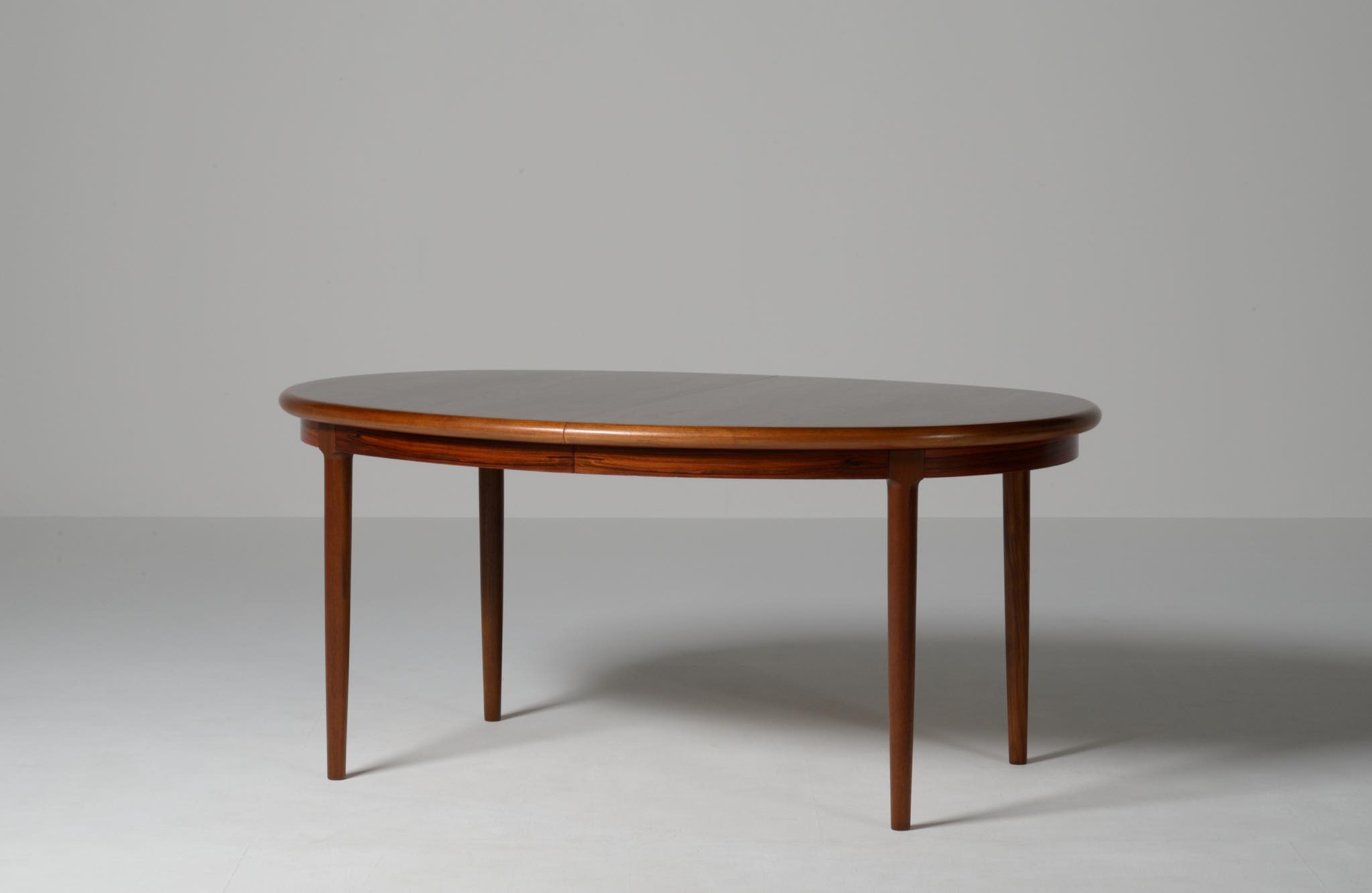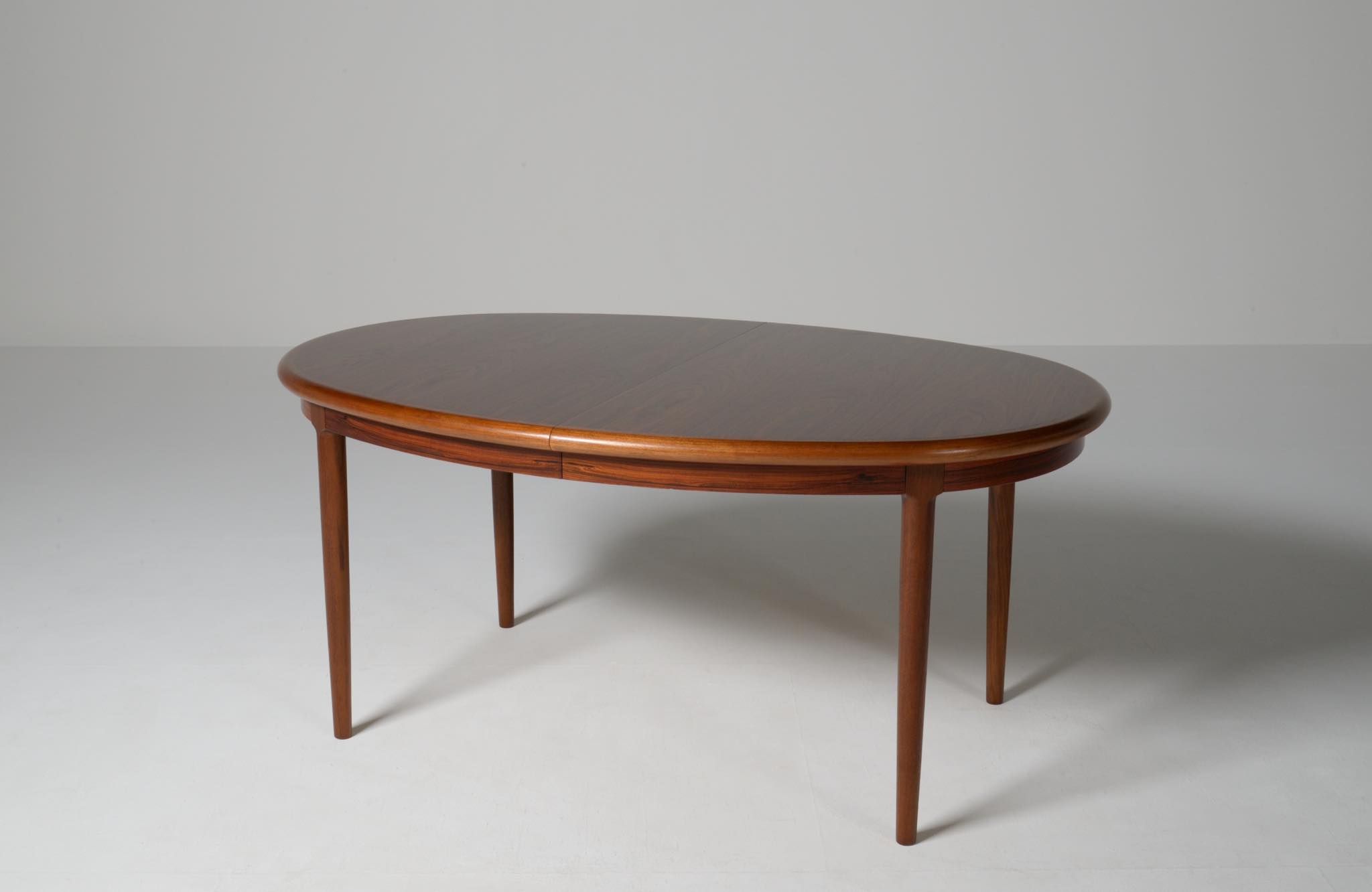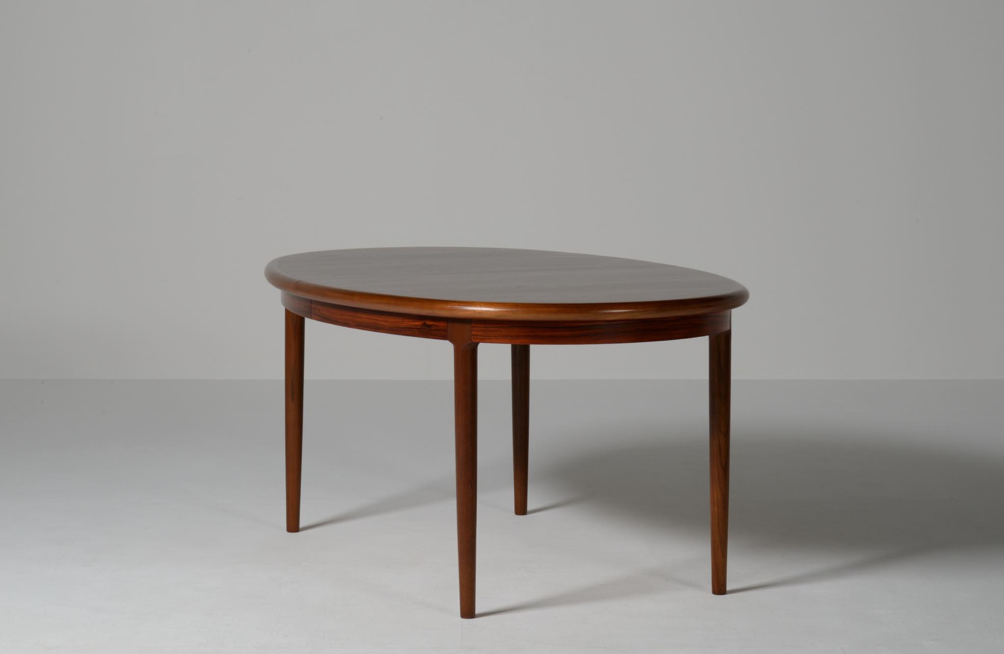 デンマーク製、オーバル型のダイニングテーブルです。工房など不明で、1970年代頃のものと思われます。ローズウッド材の天板にチーク材の脚の構成です。小振りなサイズ感のもので、エクステンションリーフが2枚付属します。コンディションは良好です。