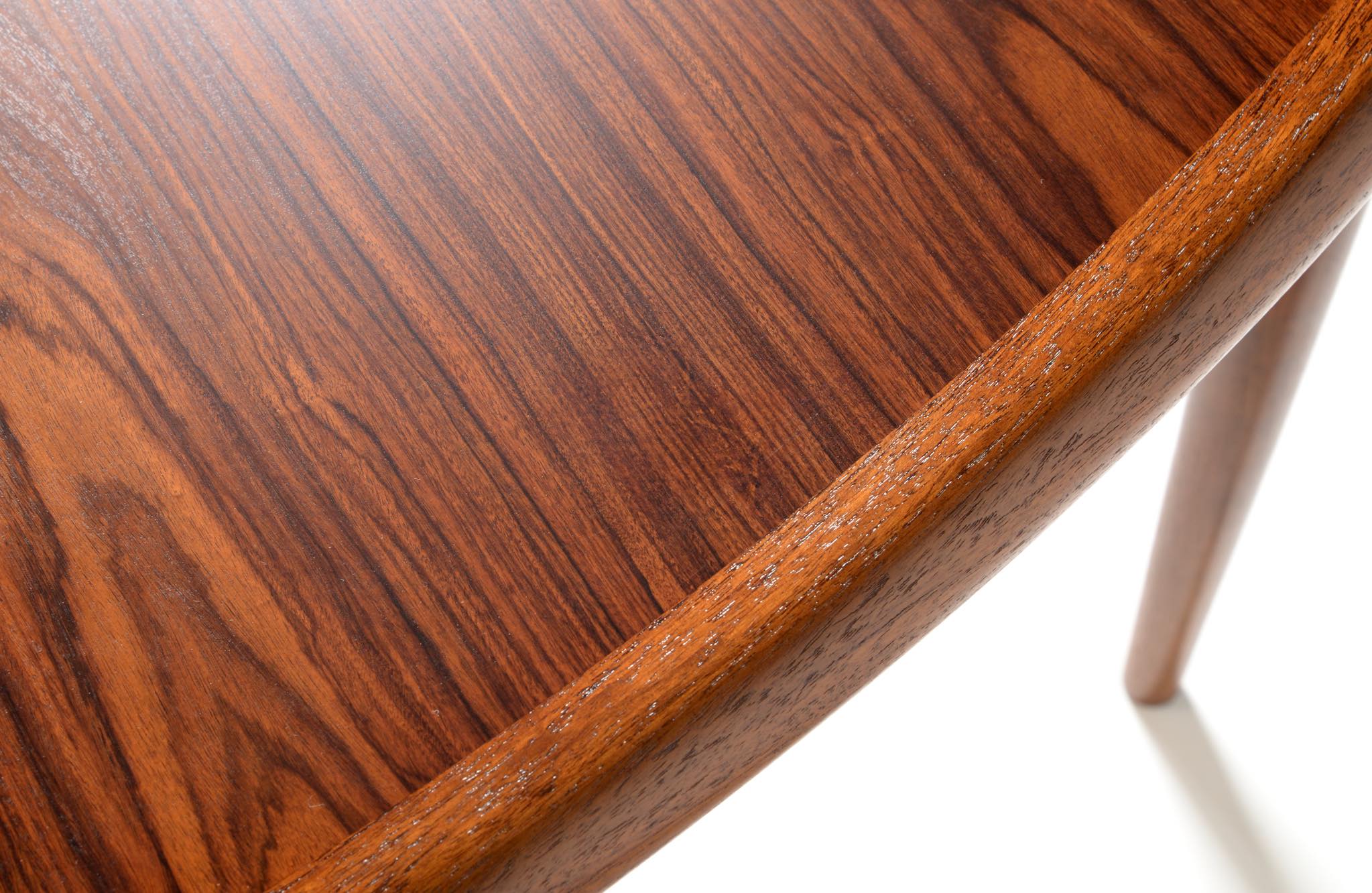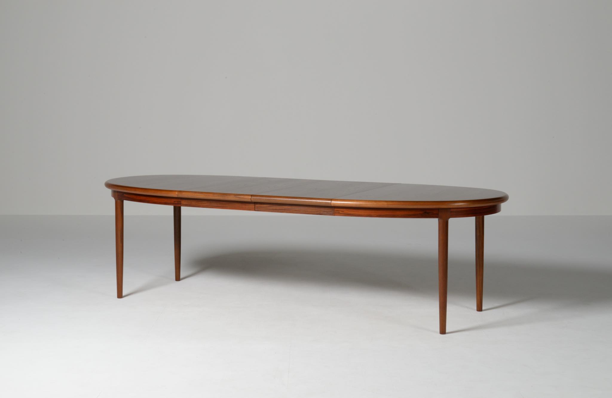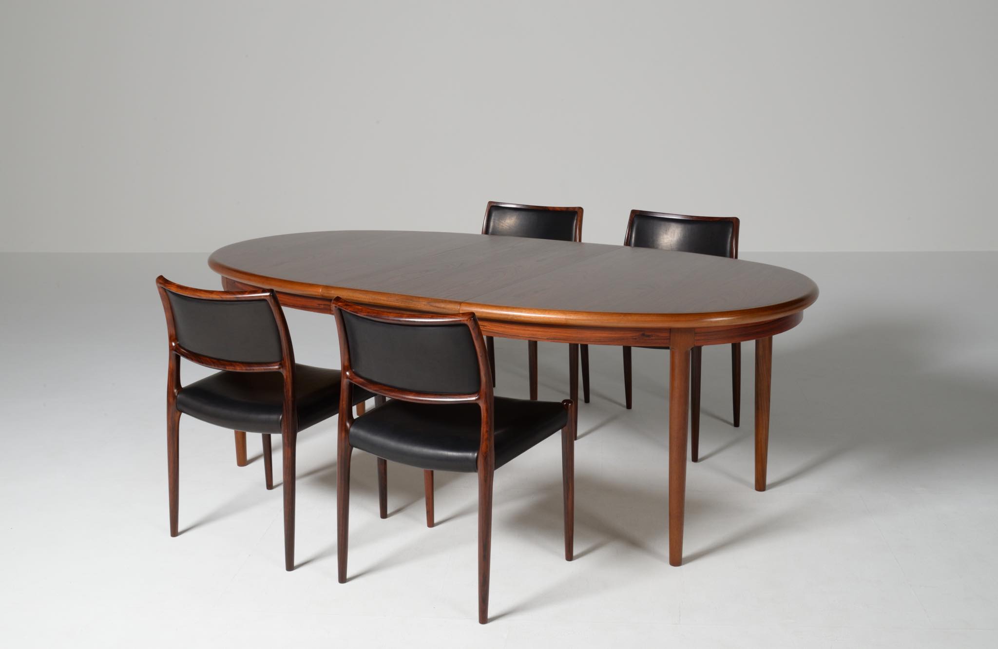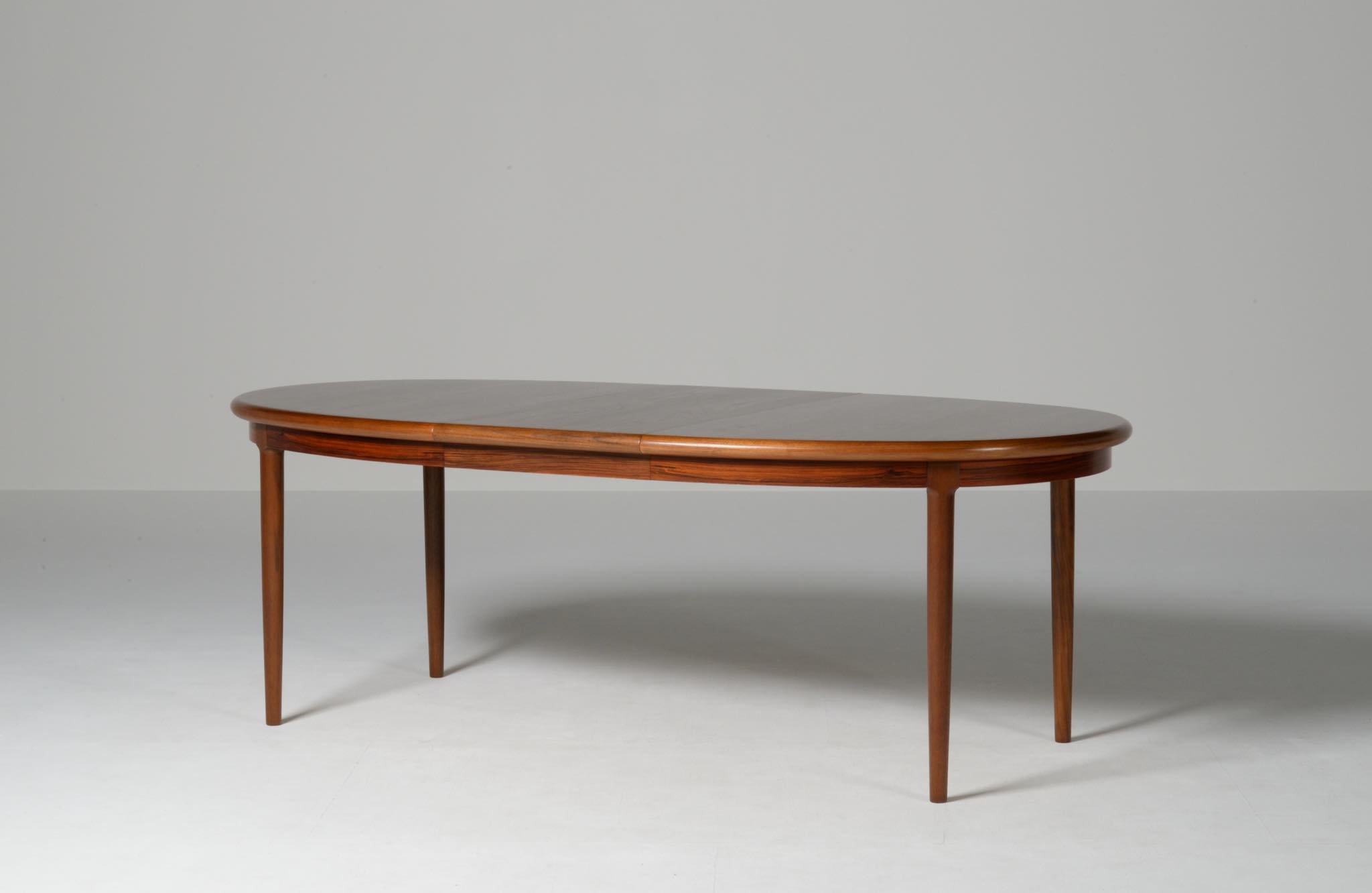 デンマーク製、オーバル型のダイニングテーブルです。工房など不明で、1970年代頃のものと思われます。ローズウッド材の天板にチーク材の脚の構成です。小振りなサイズ感のもので、エクステンションリーフが2枚付属します。コンディションは良好です。