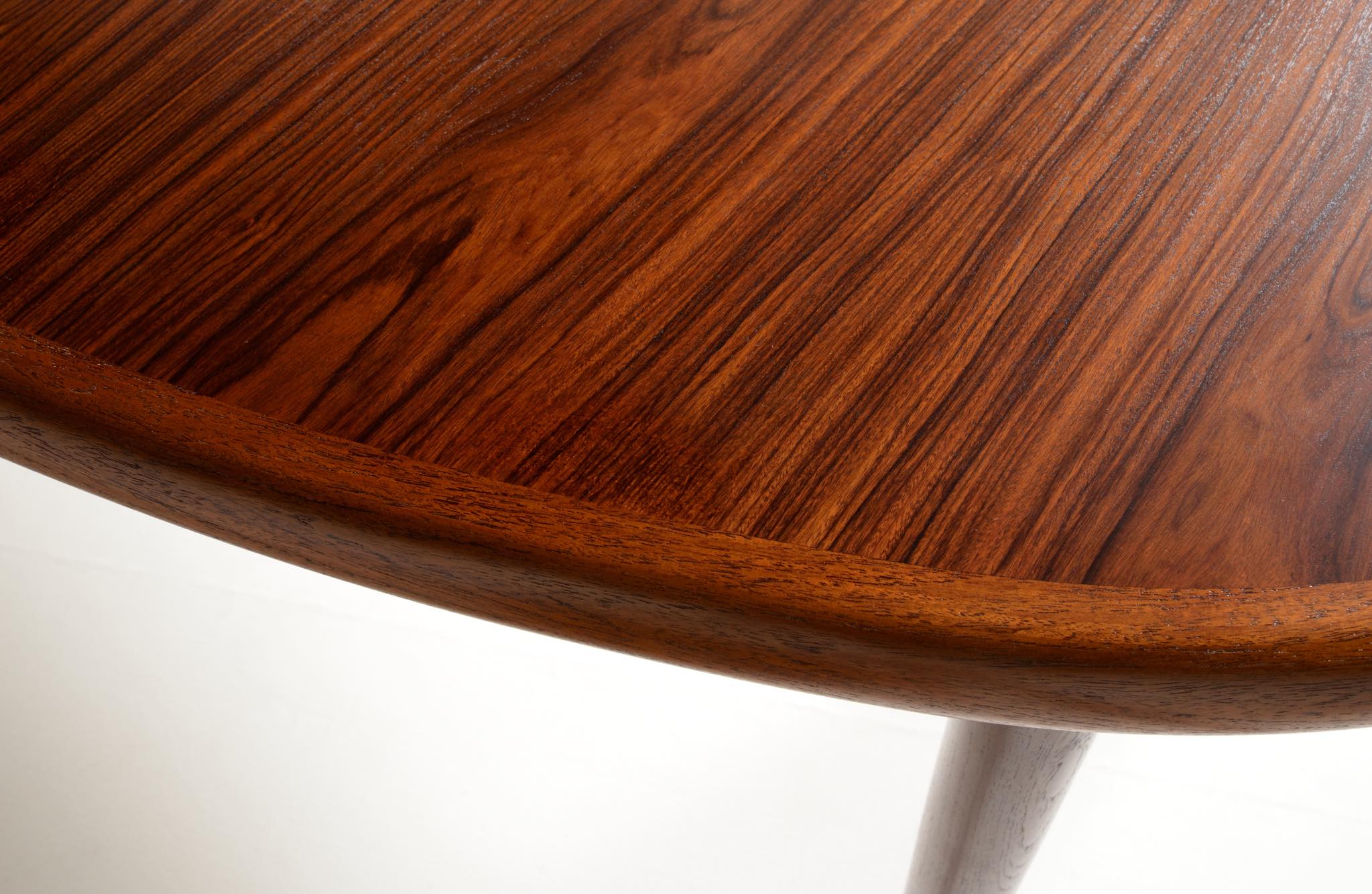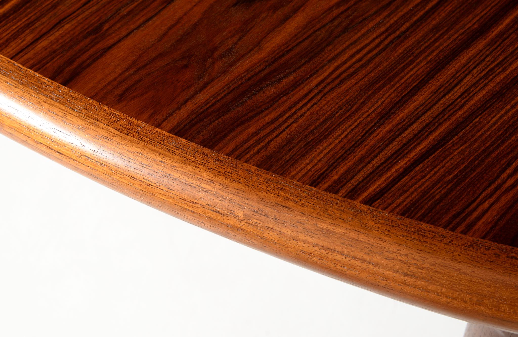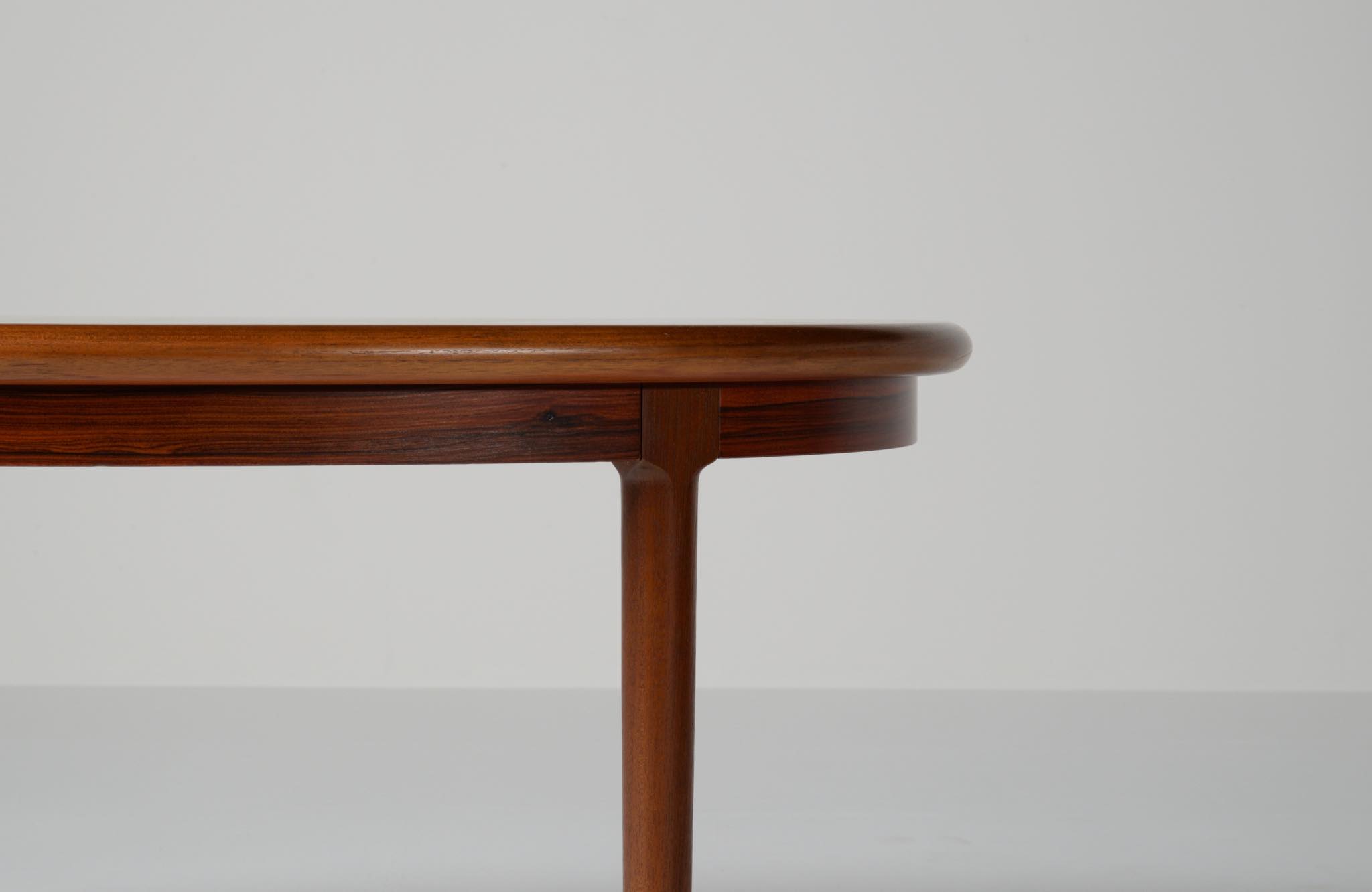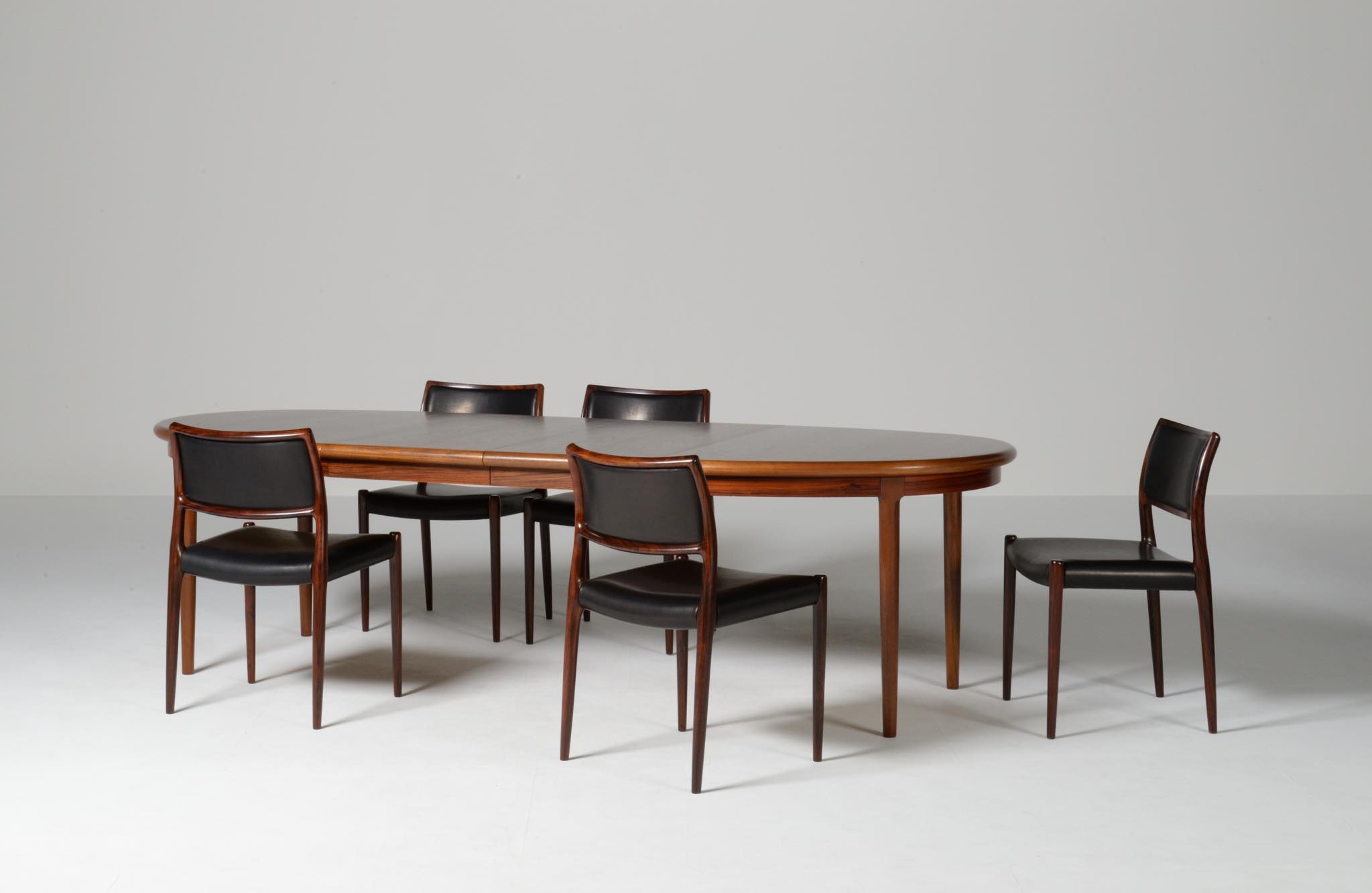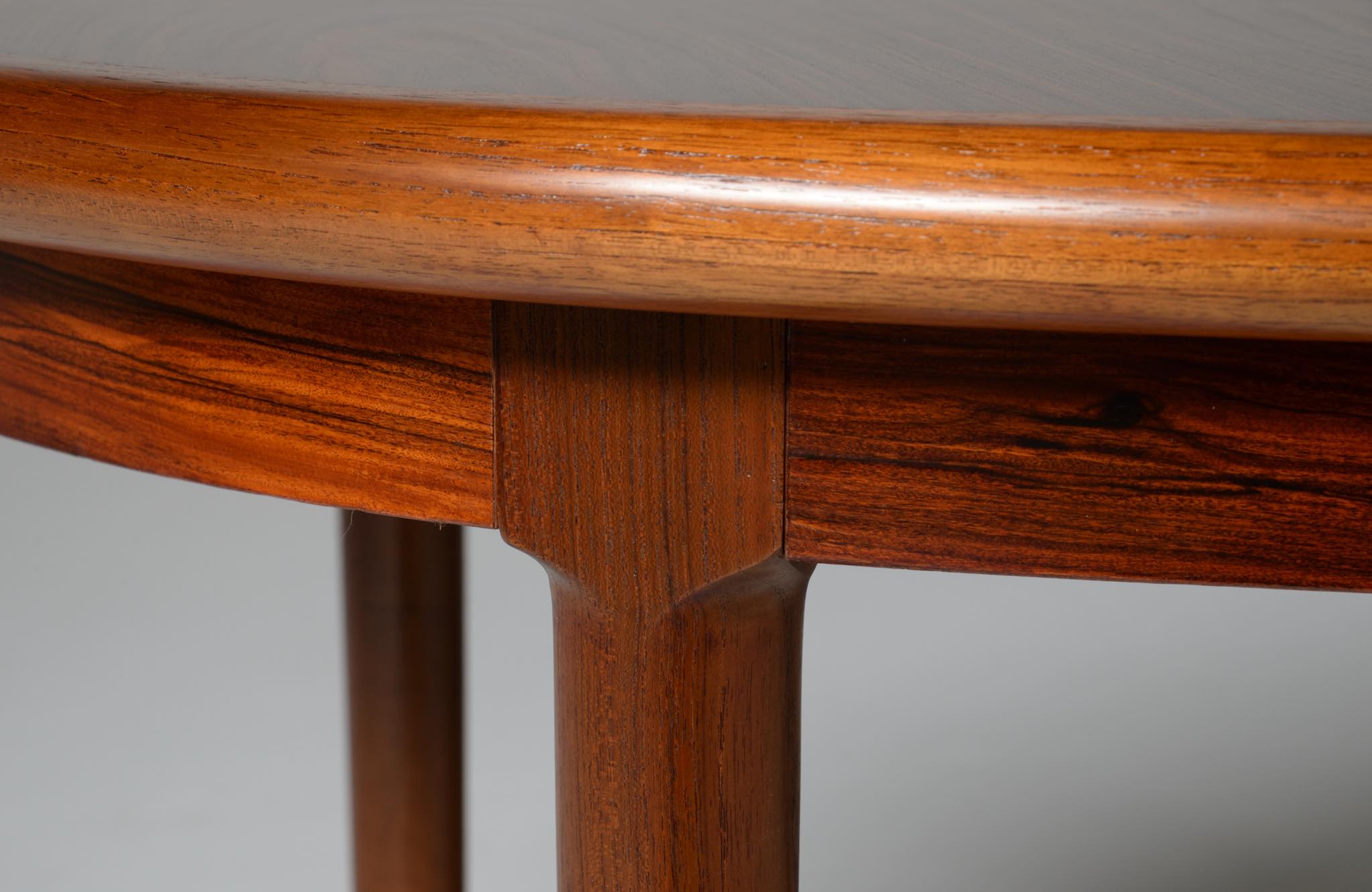 デンマーク製、オーバル型のダイニングテーブルです。工房など不明で、1970年代頃のものと思われます。ローズウッド材の天板にチーク材の脚の構成です。小振りなサイズ感のもので、エクステンションリーフが2枚付属します。コンディションは良好です。