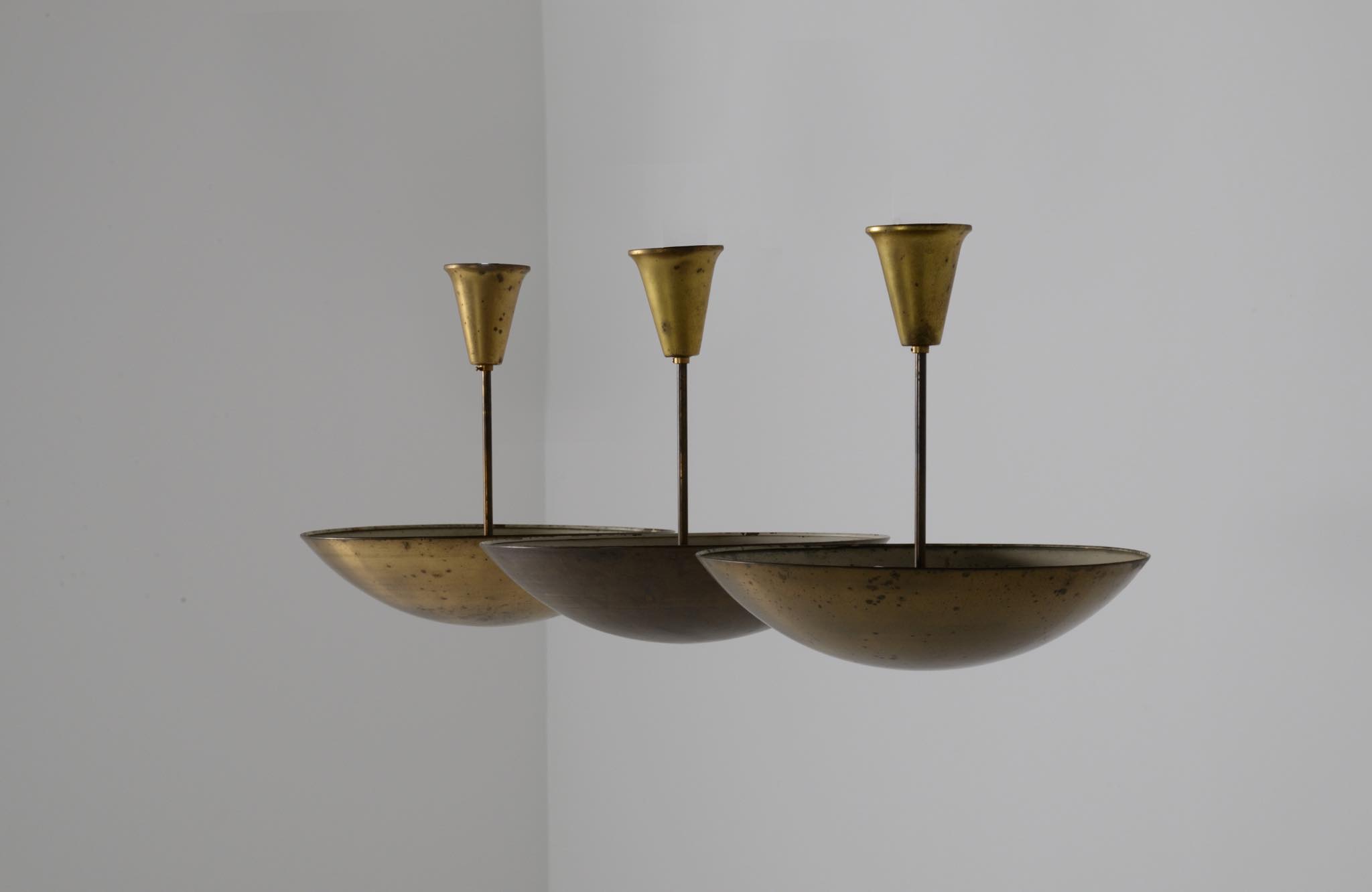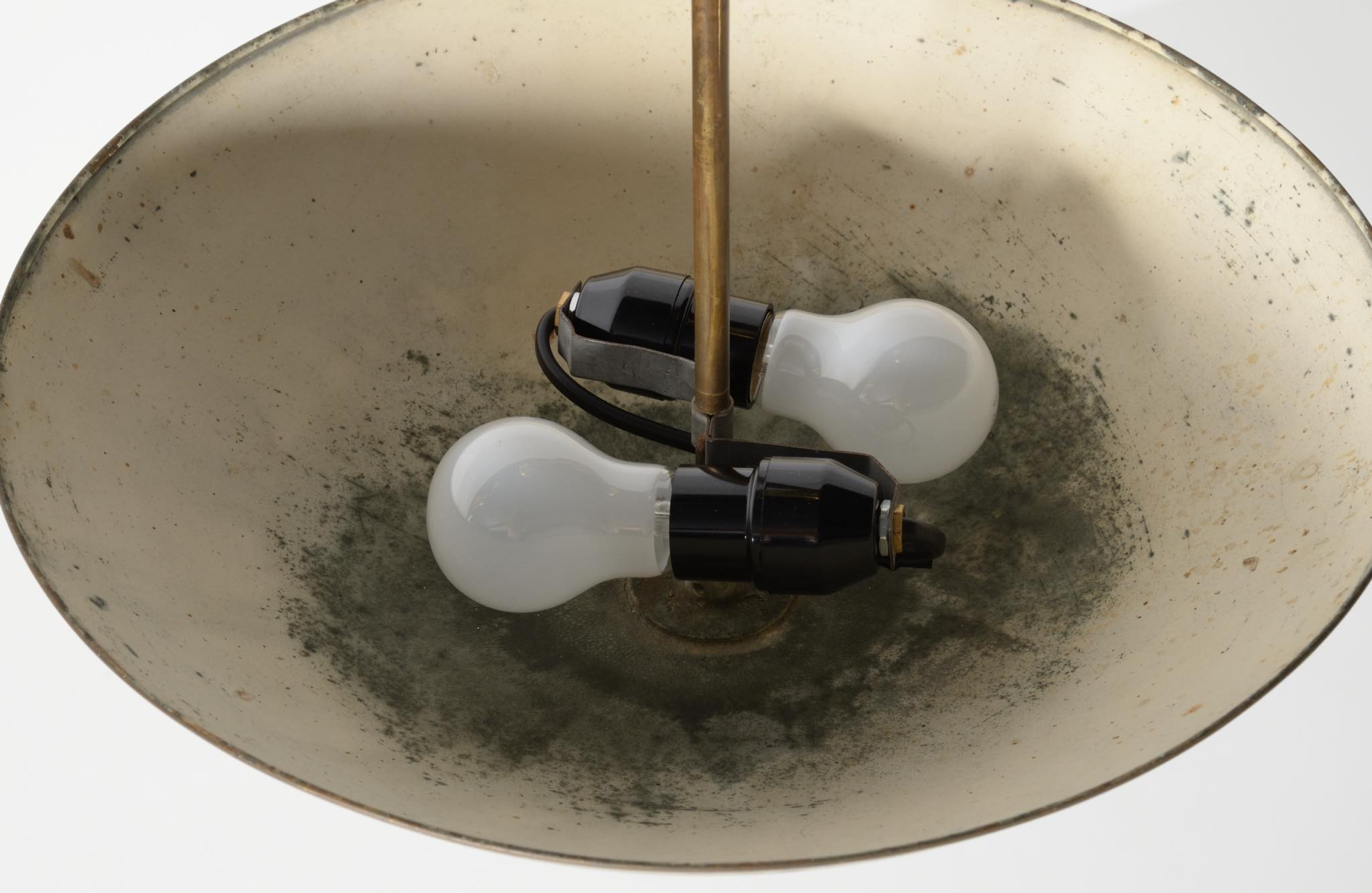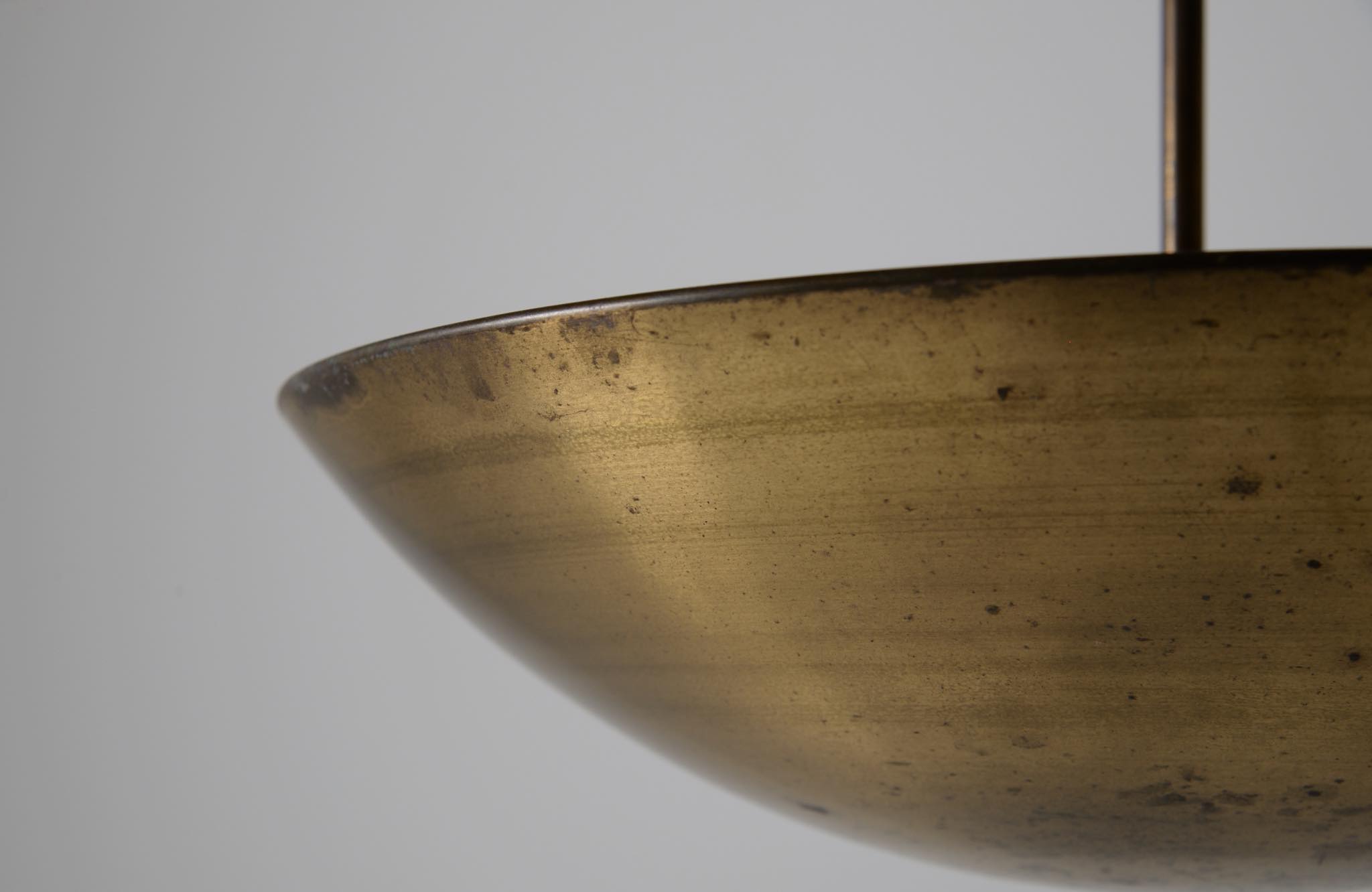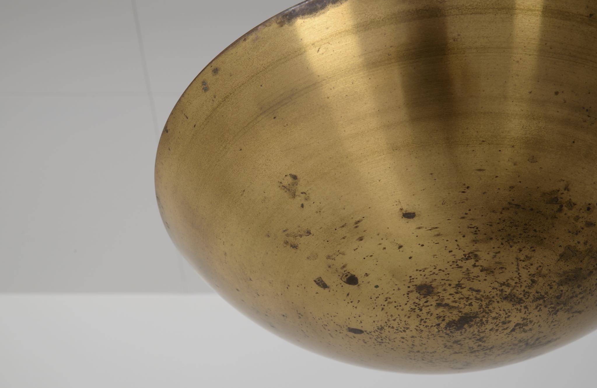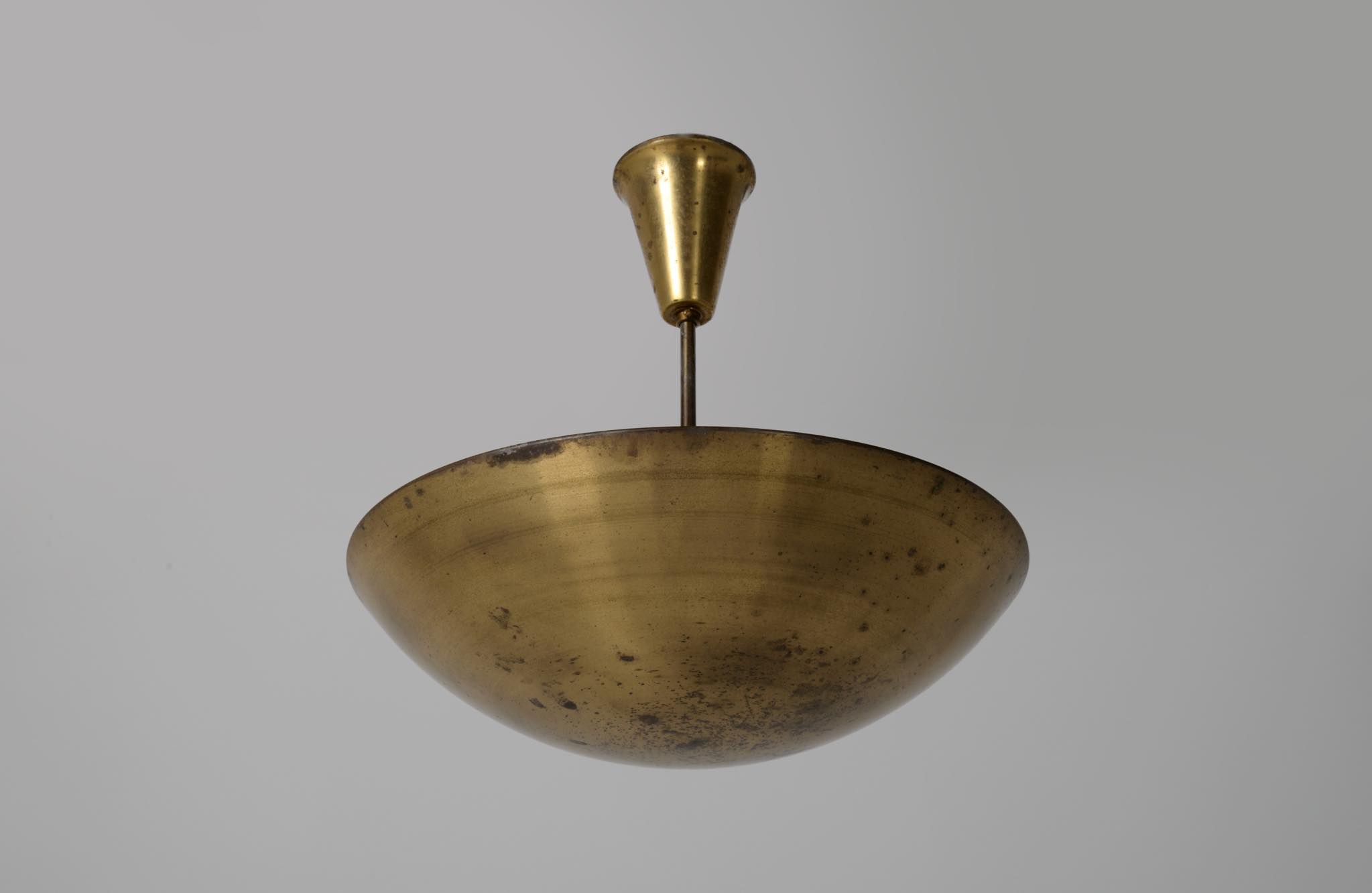 デンマークの照明メーカーの Lyfa/リーファ社製とされるシーリングランプです。1930〜40年代に作られたもので、アール・デコの様式漂う優雅なランプです。本体は真鍮で作られており、ふた口のソケットに電球をセットし、被反射面となる天井へ反射させ、柔らかな光で空間を包む構造です。経年による真鍮の変色が著しいですが、このままの状態での販売となります。こちらは単体での販売となります。