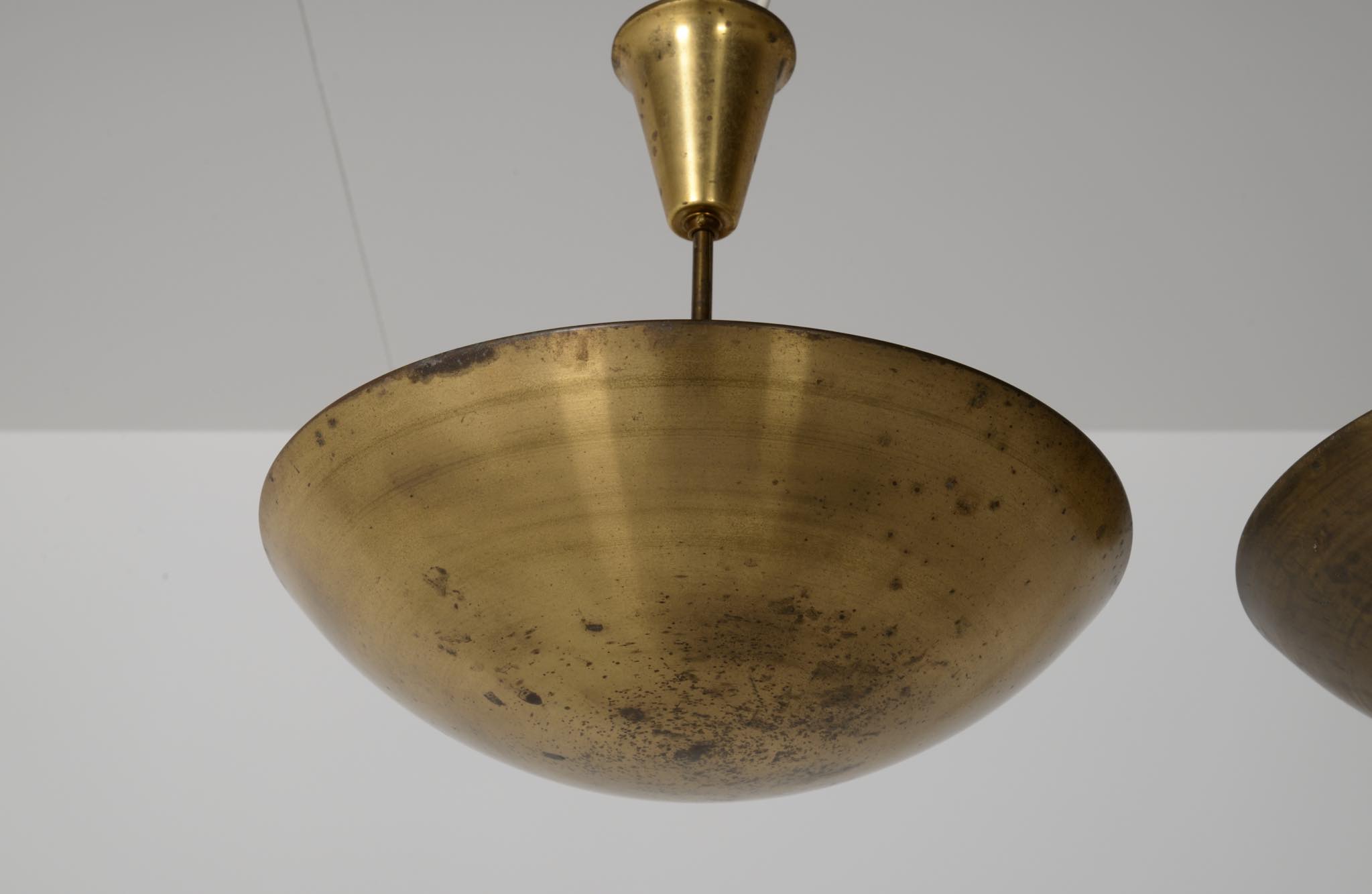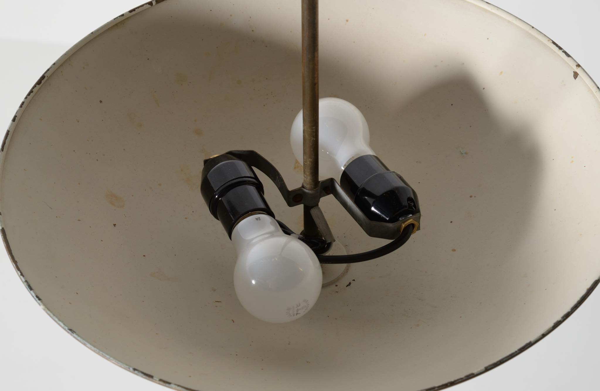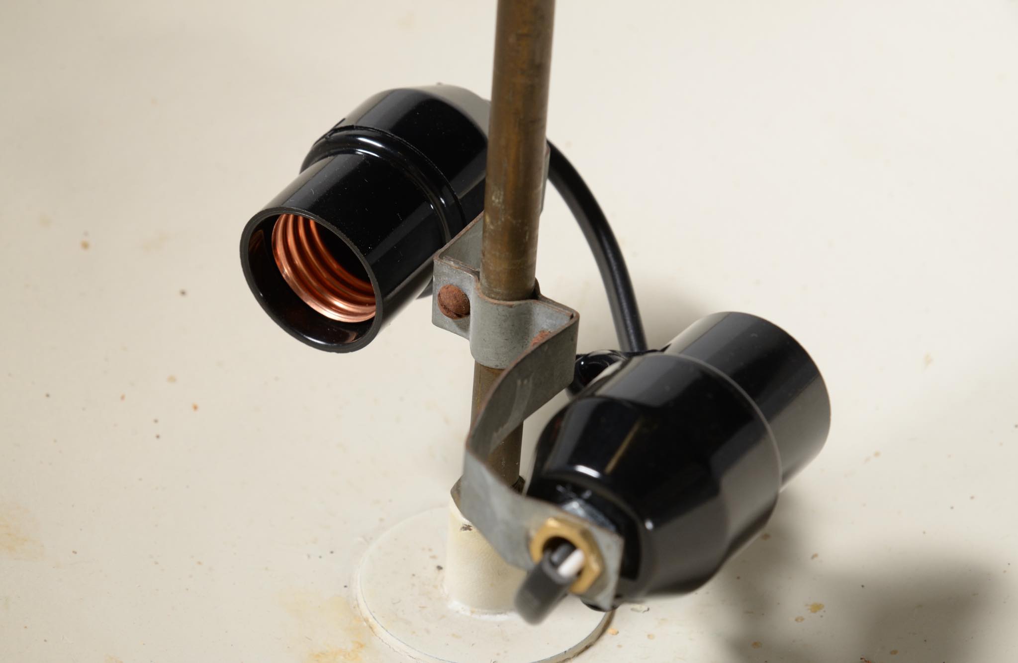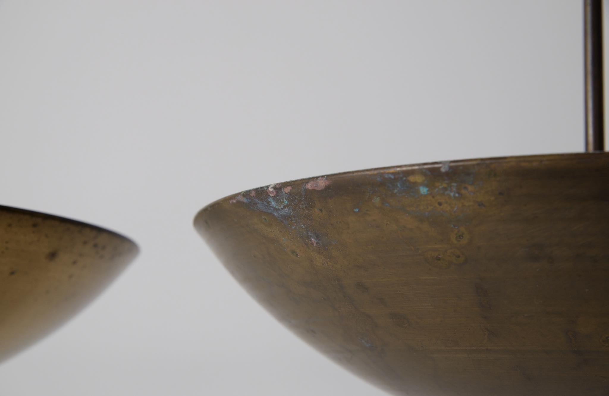 デンマークの照明メーカーの Lyfa/リーファ社製とされるシーリングランプです。1930〜40年代に作られたもので、アール・デコの様式漂う優雅なランプです。本体は真鍮で作られており、ふた口のソケットに電球をセットし、被反射面となる天井へ反射させ、柔らかな光で空間を包む構造です。経年による真鍮の変色が著しいですが、このままの状態での販売となります。こちらは単体での販売となります。