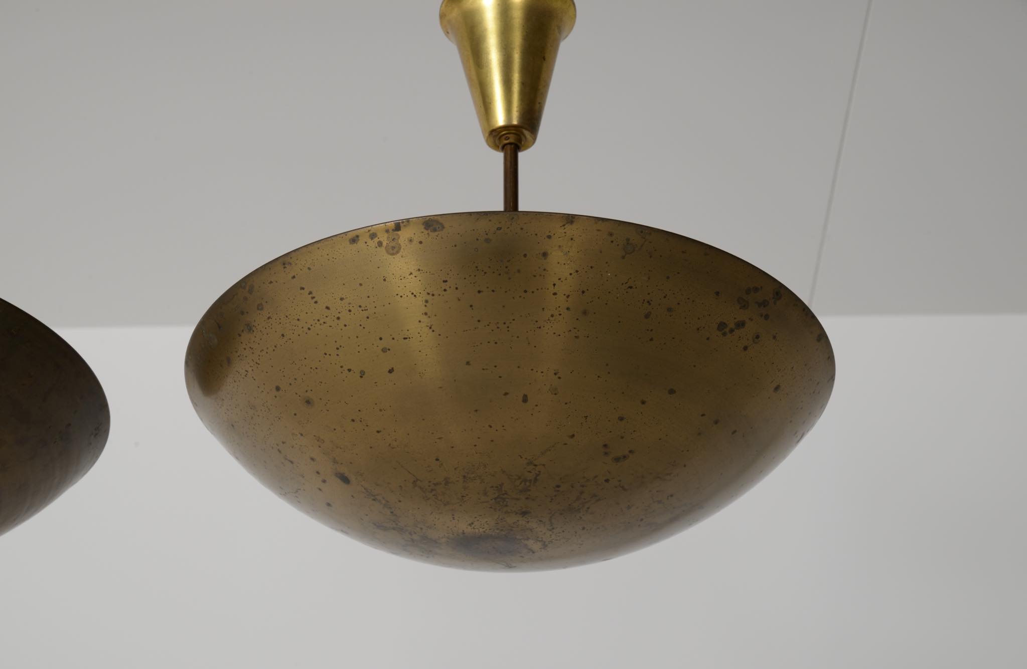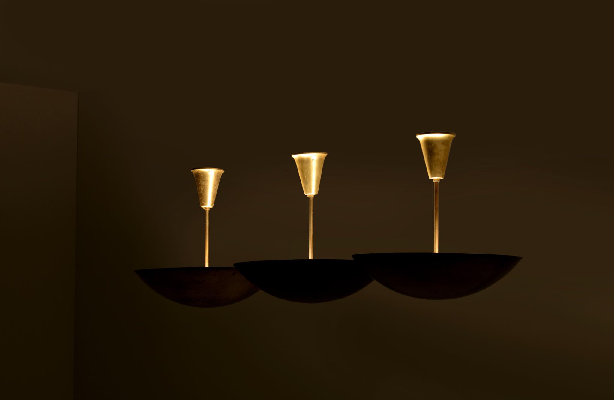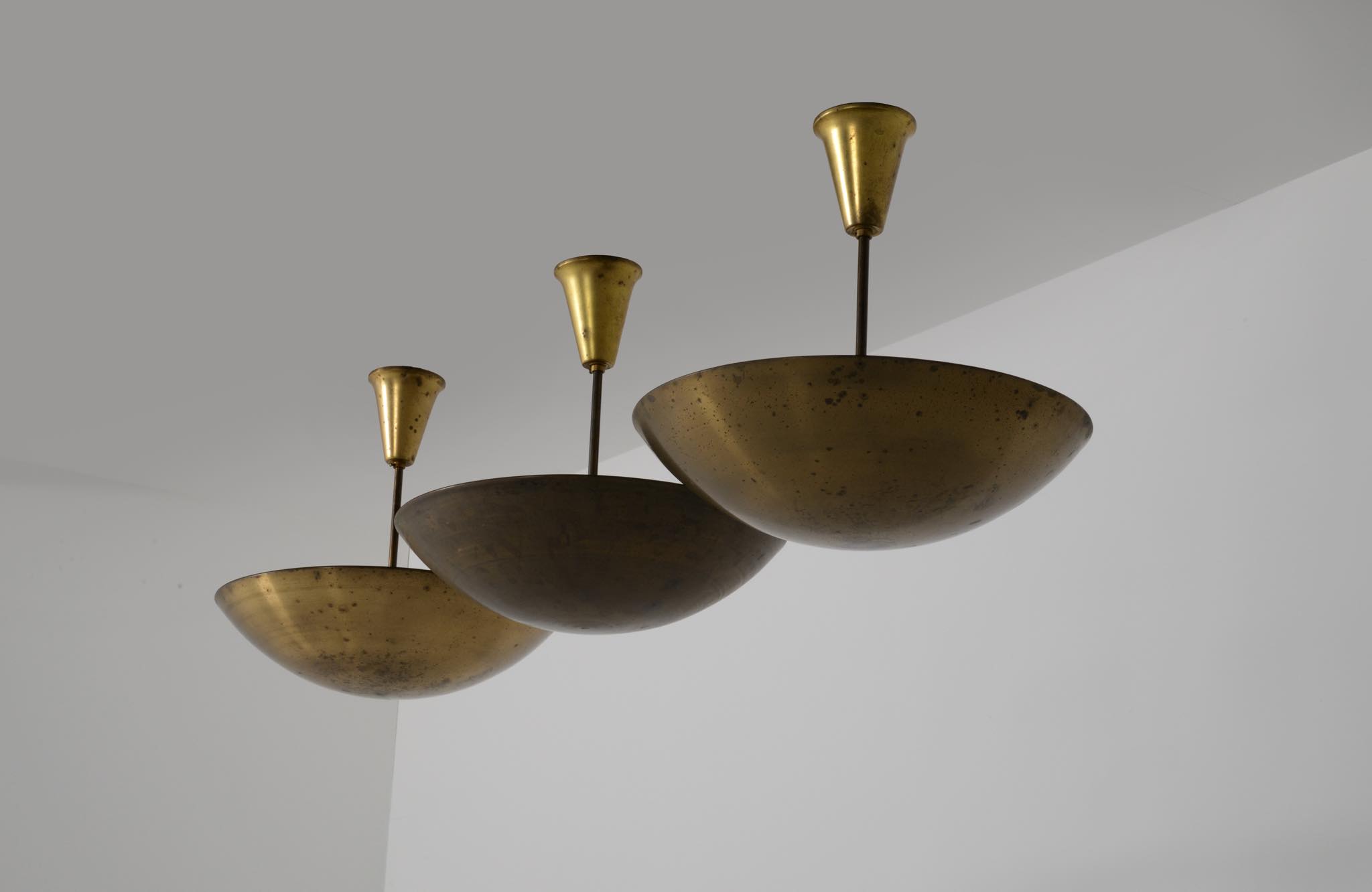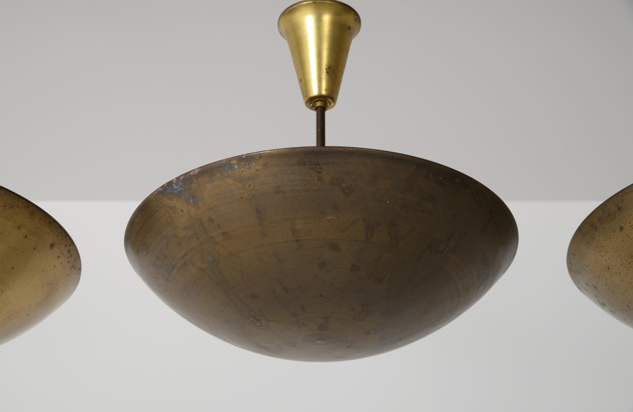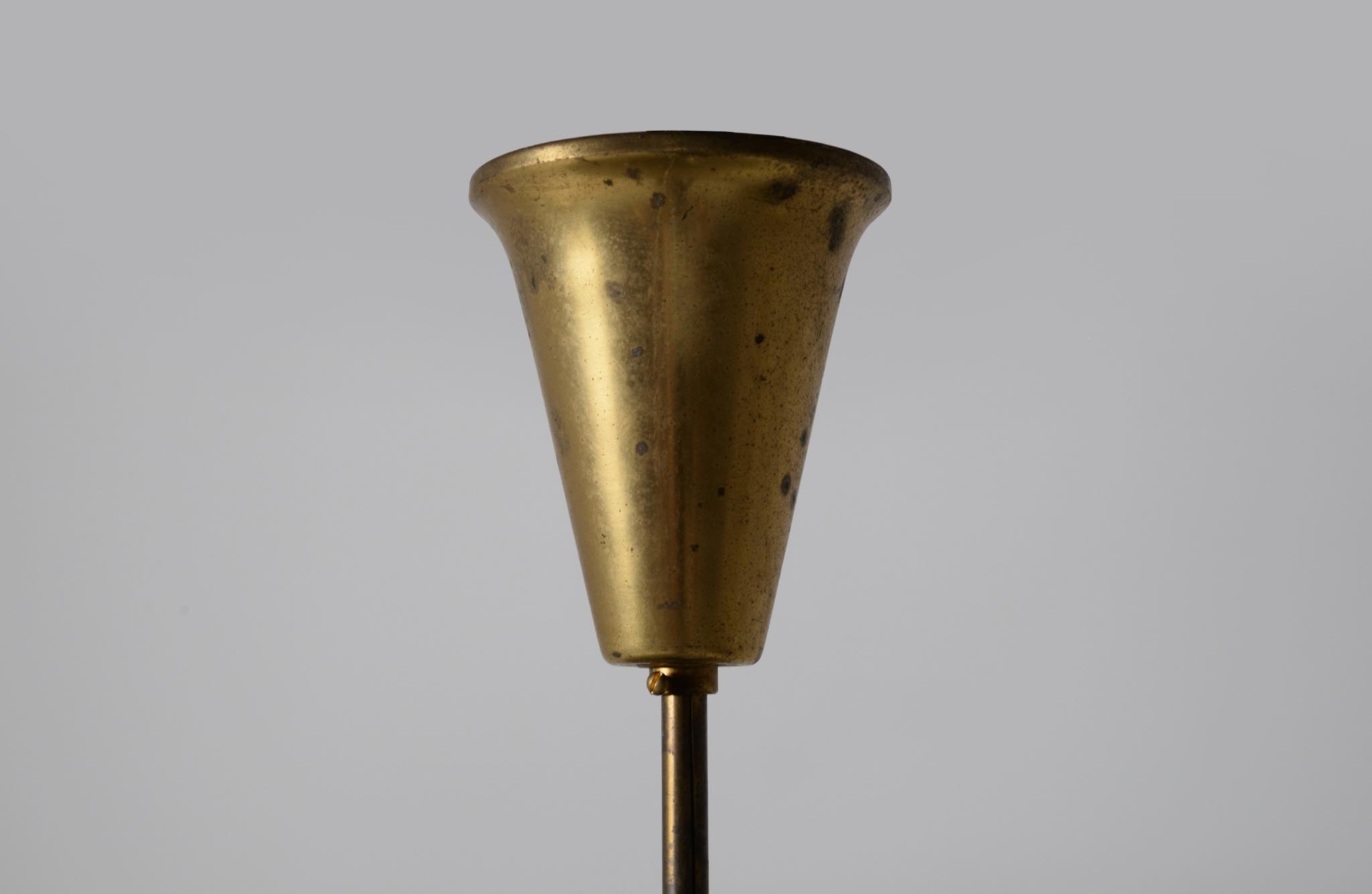 デンマークの照明メーカーの Lyfa/リーファ社製とされるシーリングランプです。1930〜40年代に作られたもので、アール・デコの様式漂う優雅なランプです。本体は真鍮で作られており、ふた口のソケットに電球をセットし、被反射面となる天井へ反射させ、柔らかな光で空間を包む構造です。経年による真鍮の変色が著しいですが、このままの状態での販売となります。こちらは単体での販売となります。
