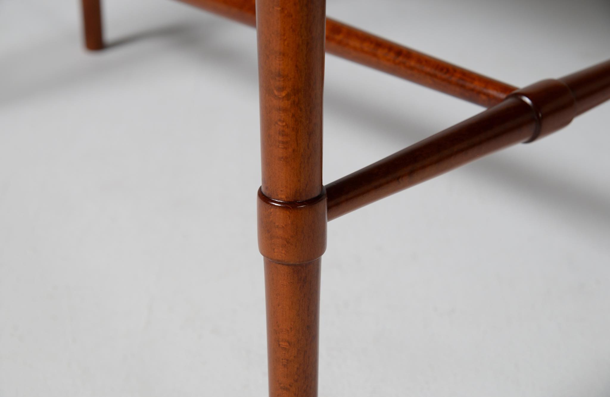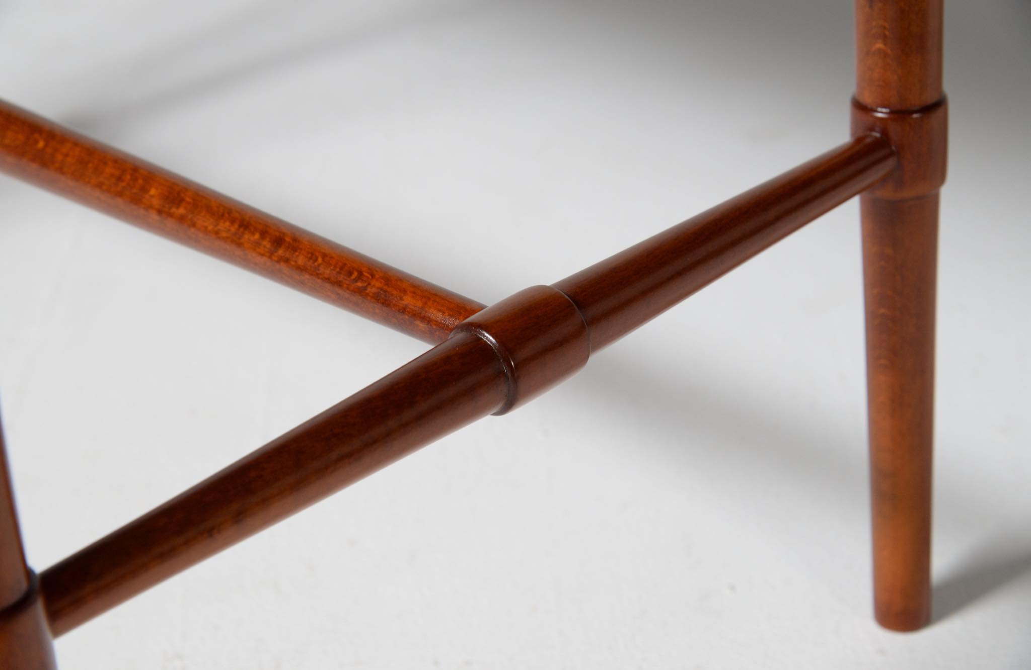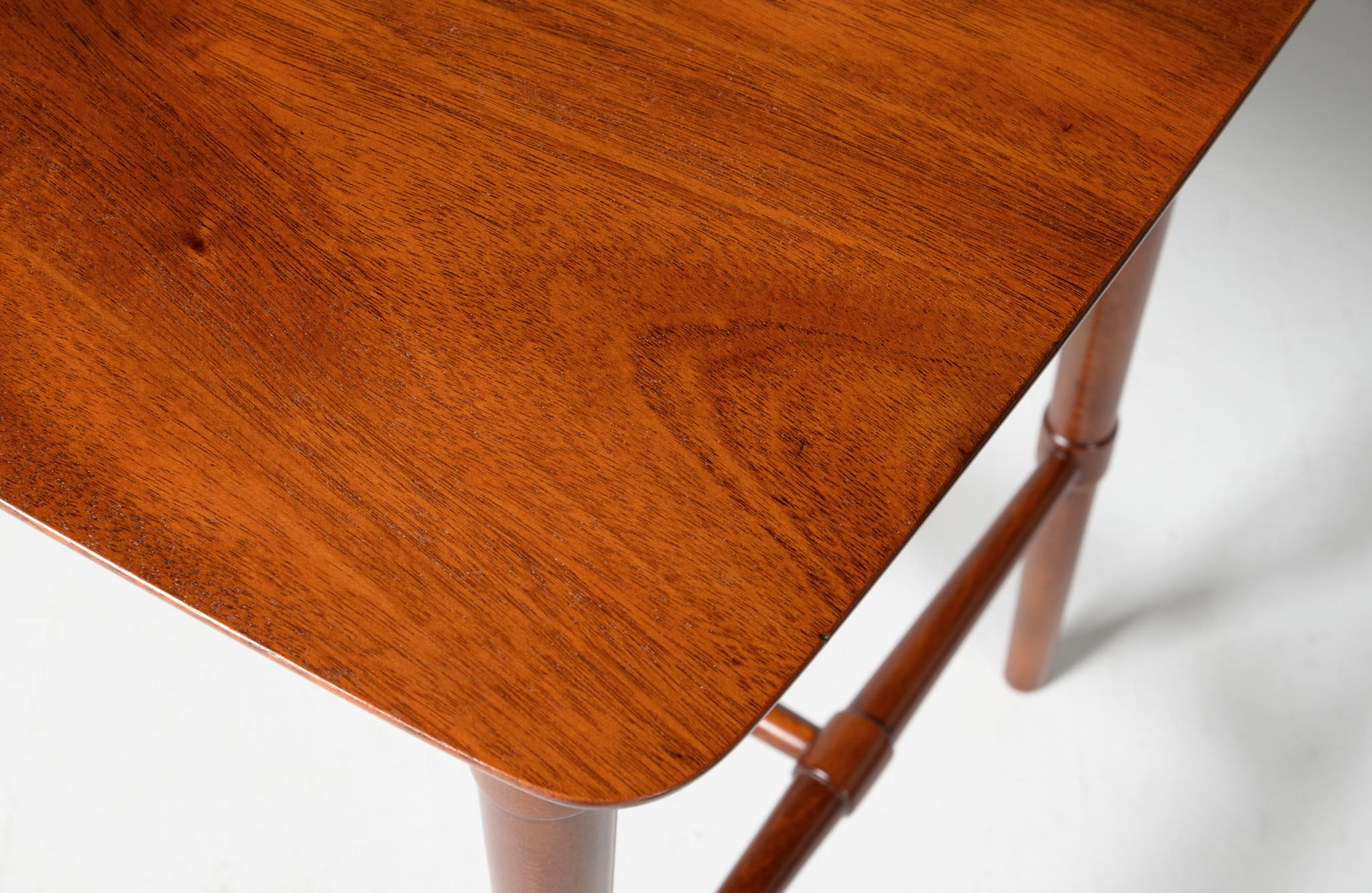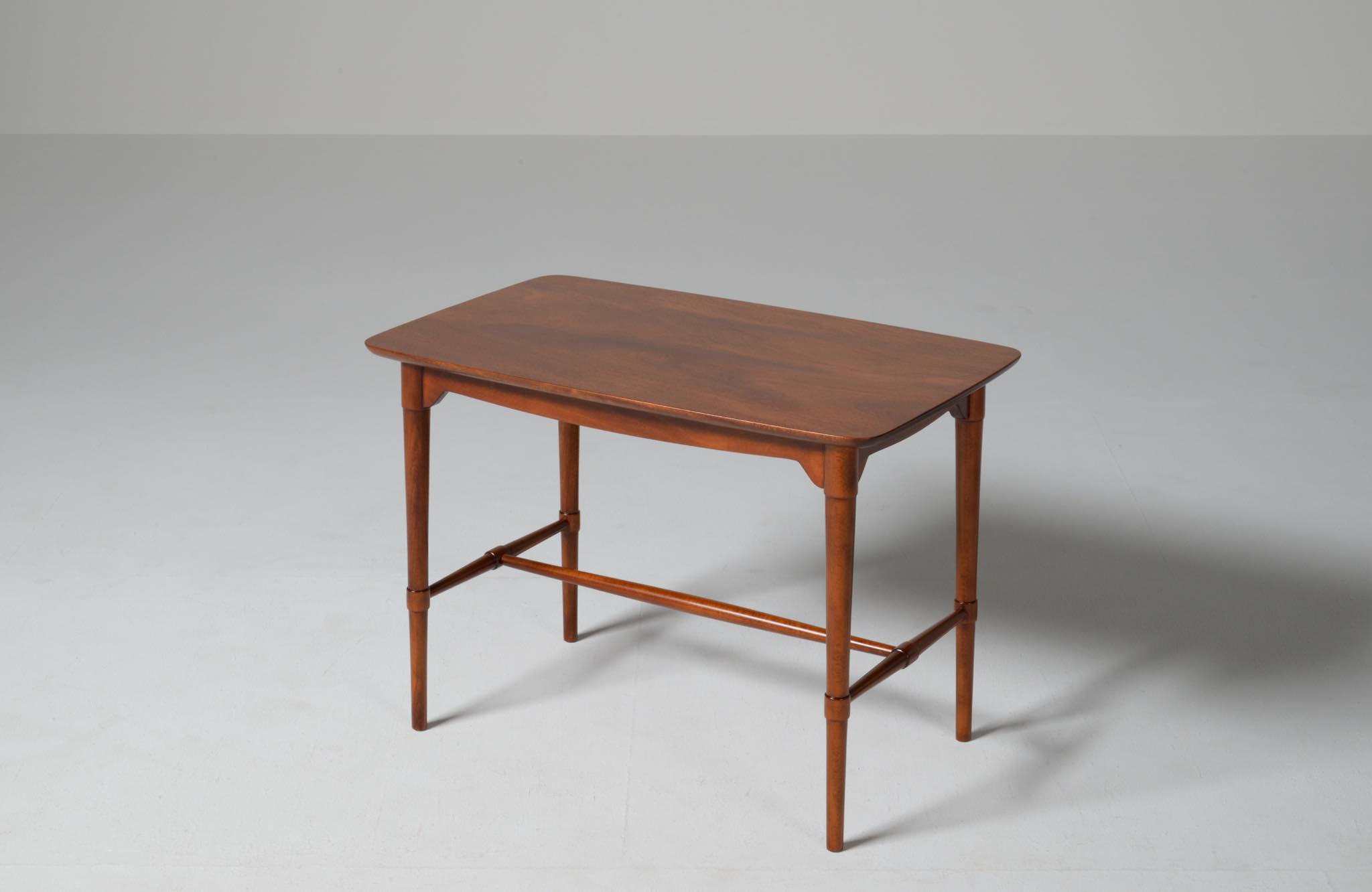 1940〜50年代頃のデンマークで作られた小振りなコーヒーテーブルです。20世紀前葉に活躍した家具デザイナーでキャビネットメーカーのフリッツ・ヘニングセンによるものと云われておりますが、確証は得ておりません。天板にはマホガニー材、脚にはビーチ材を用いたもので、脚と貫の接合が特徴的です。デンマークの老舗インテリアショップのイルムス・ボリフスで販売されたもので、比較的高品質な製品であると云えるでしょう。