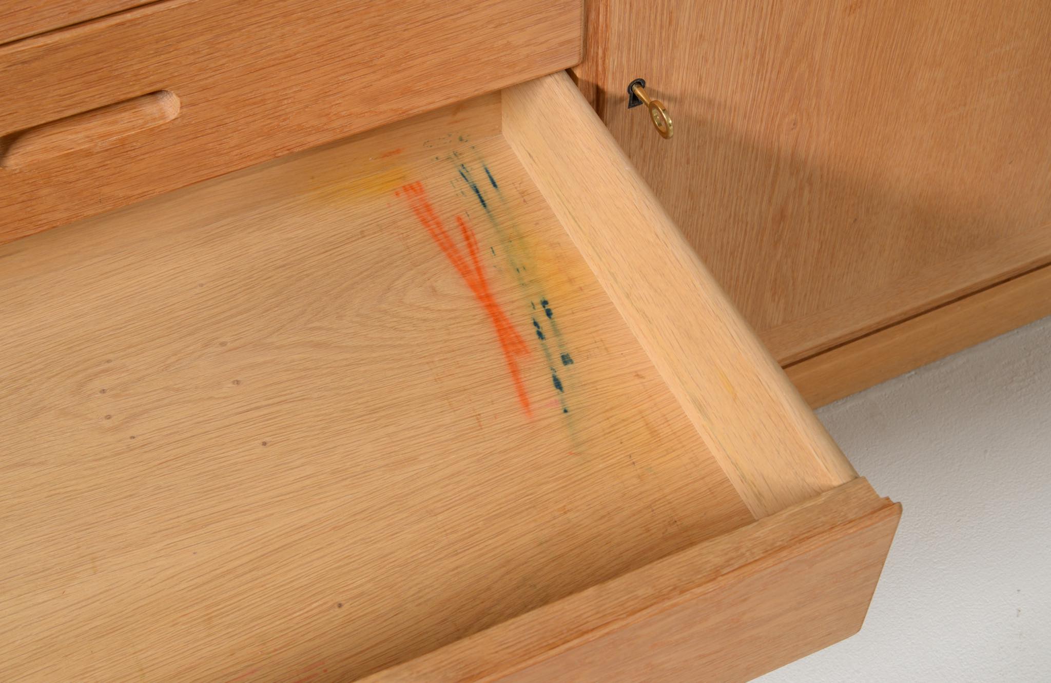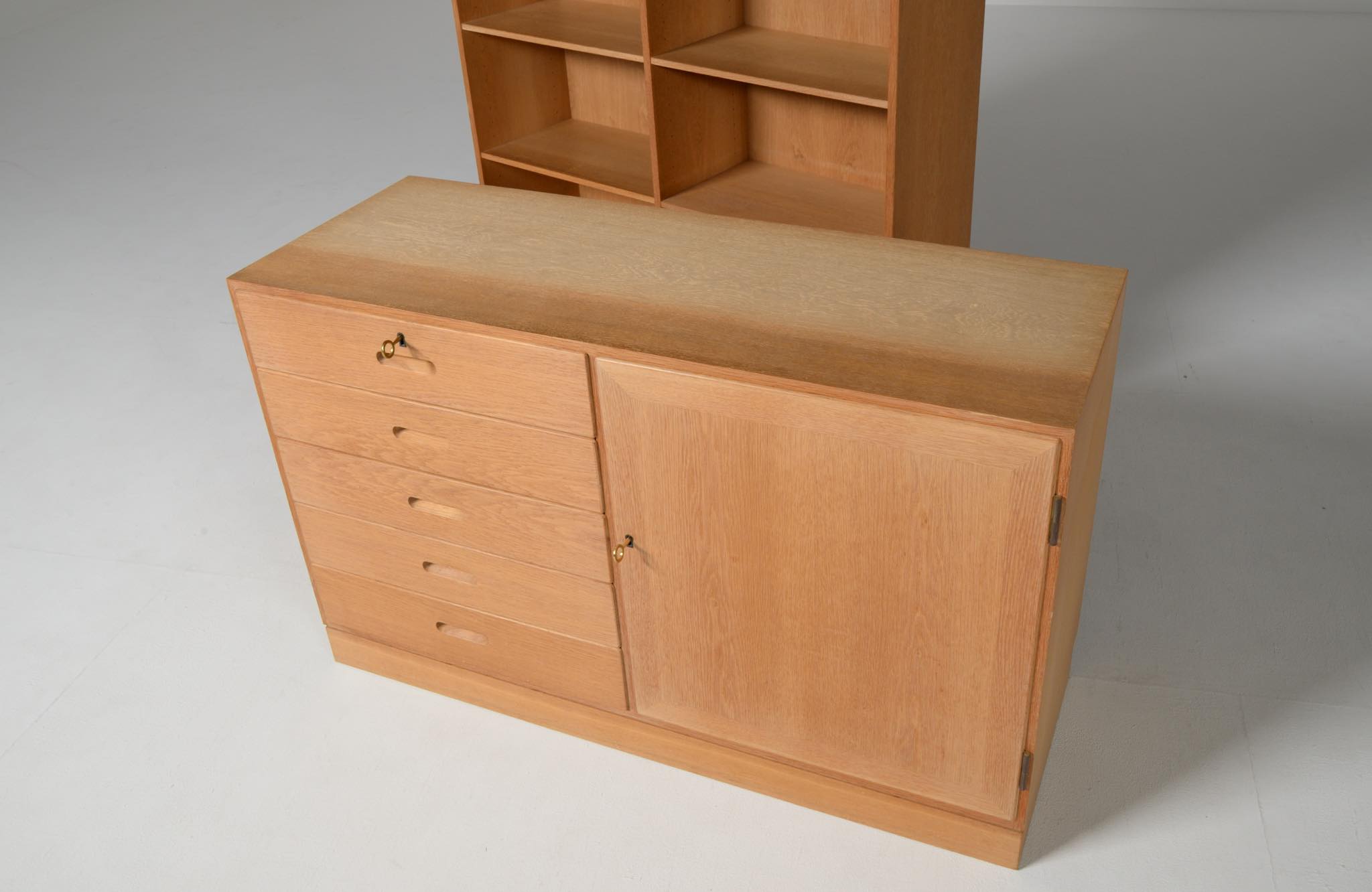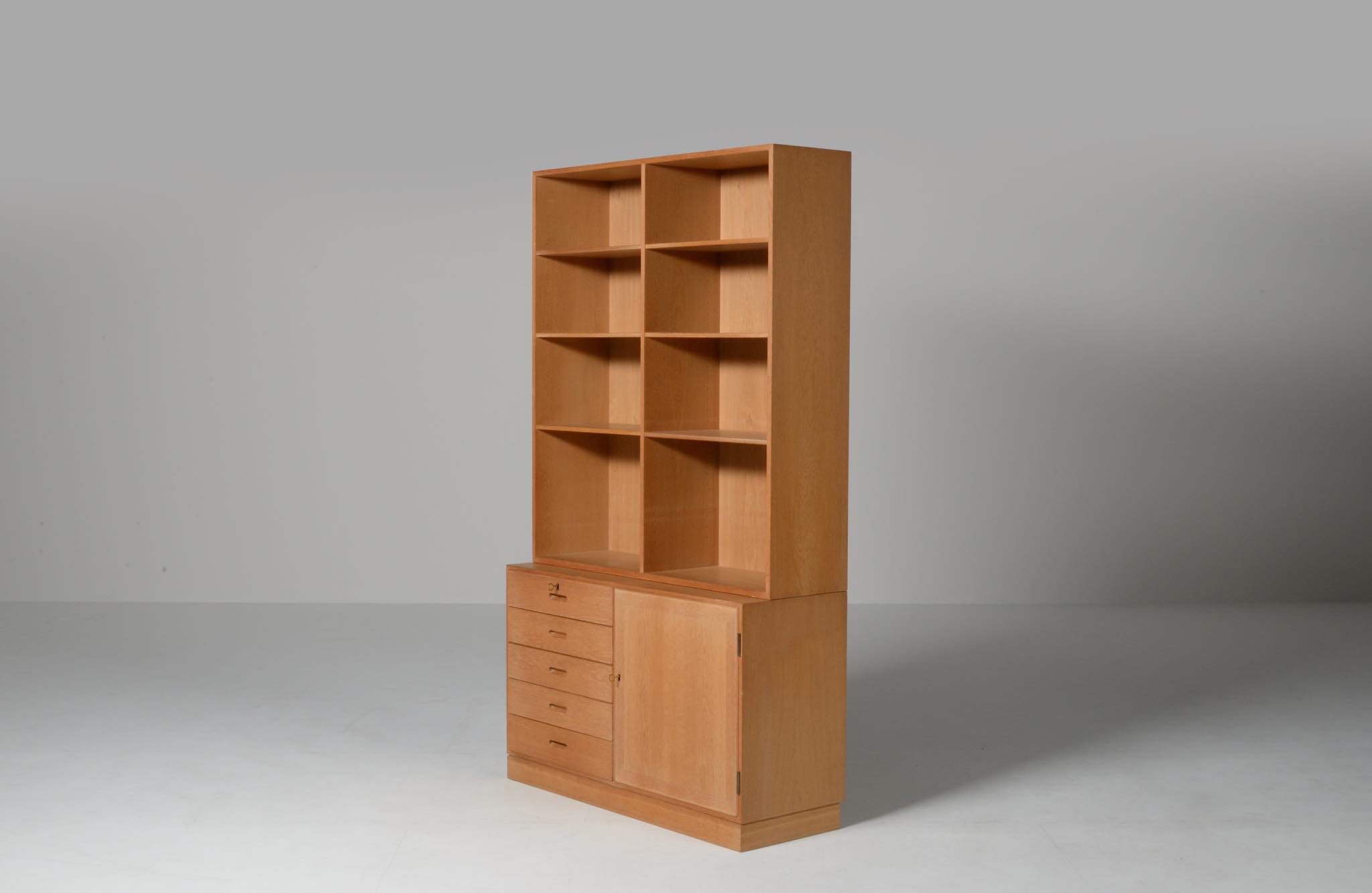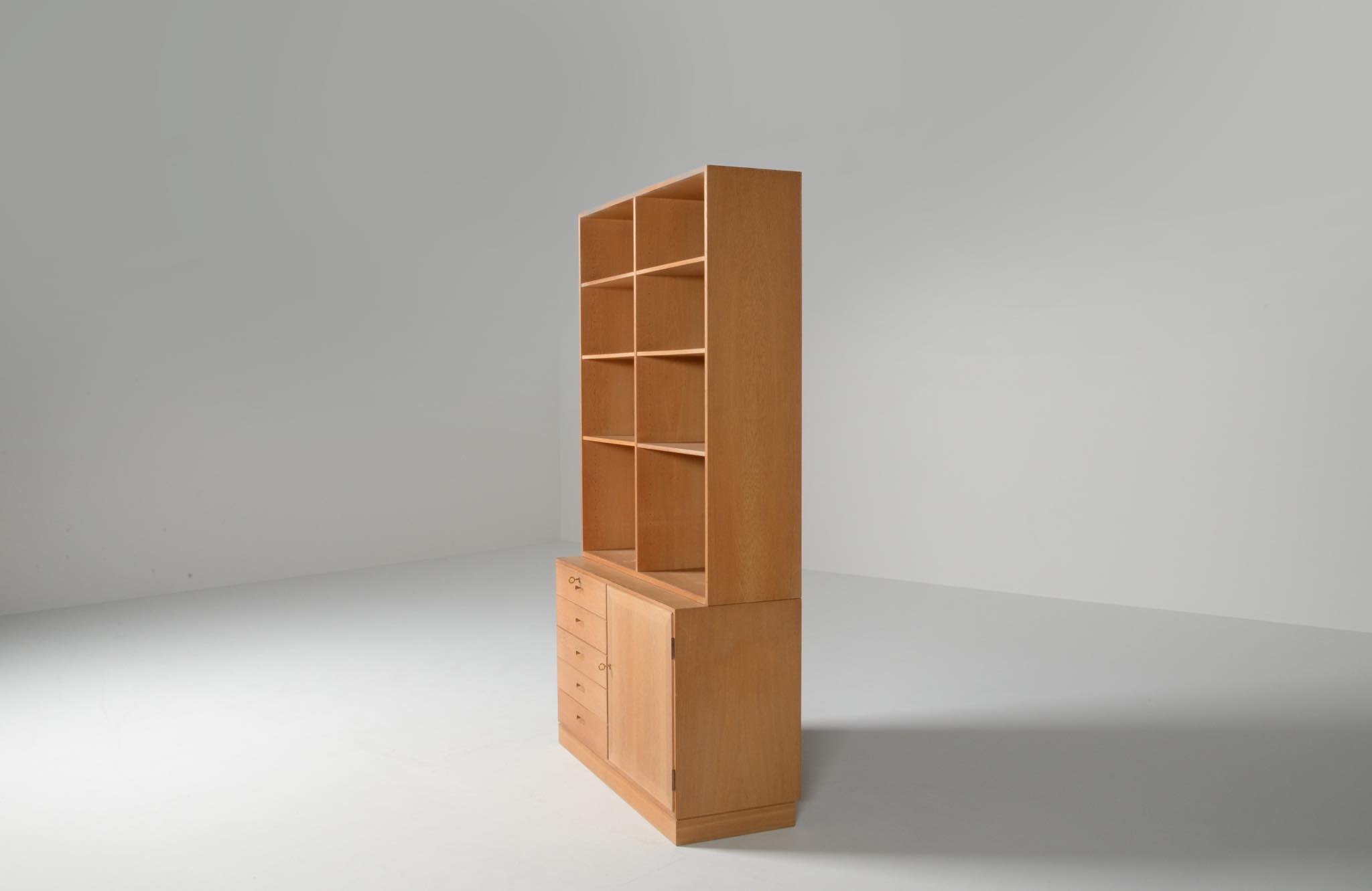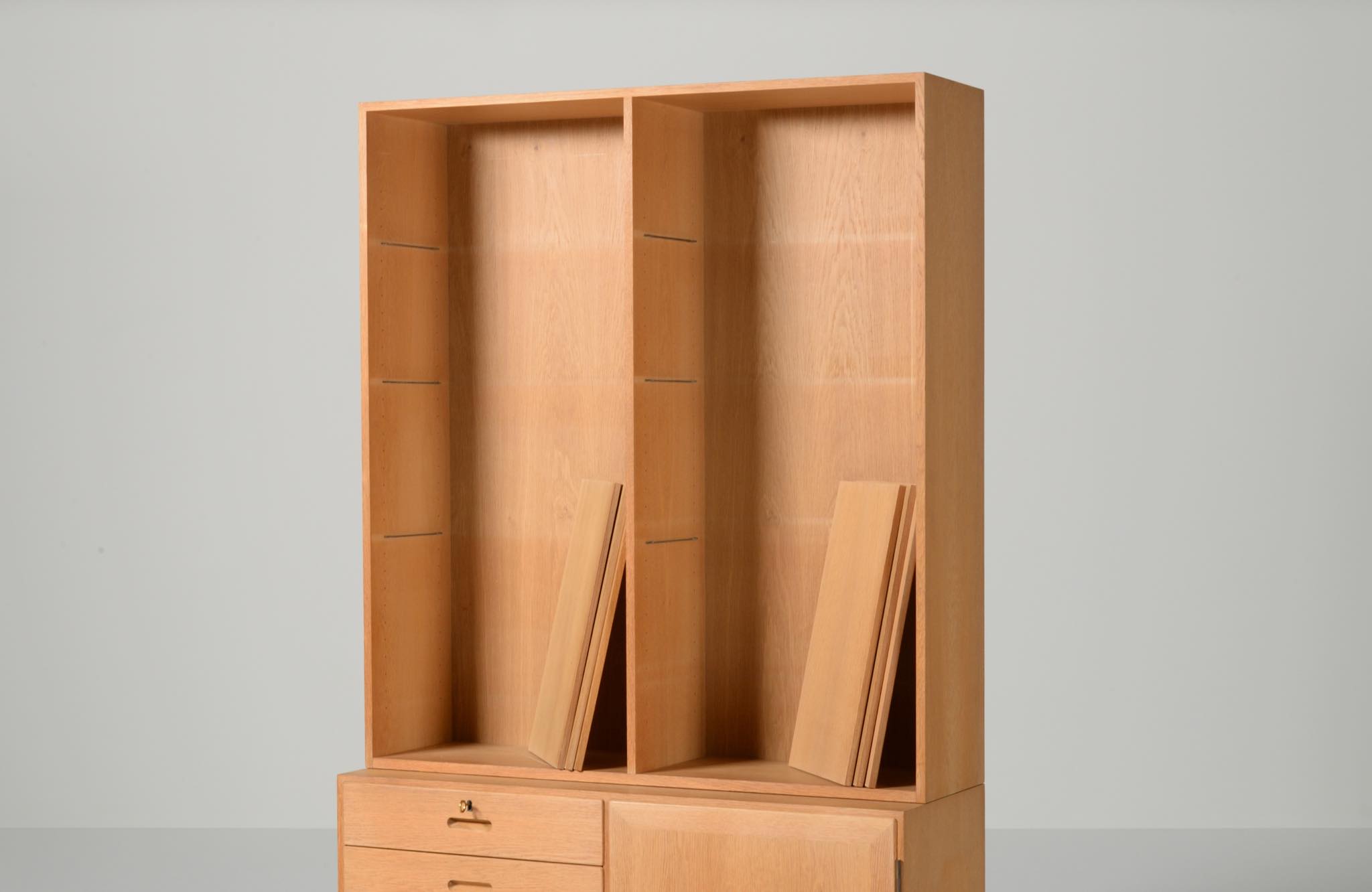 デンマークの家具デザイナー、Kai Winding/カイ・ウィンディングによるブックシェルフです。1960~70年代に書庫として作られたものでしょう。丁寧に設計されたことが伺えます。本体はオーク材が用いられています。棚板等に若干の染みや経年感が見られますが、綺麗な状態です。