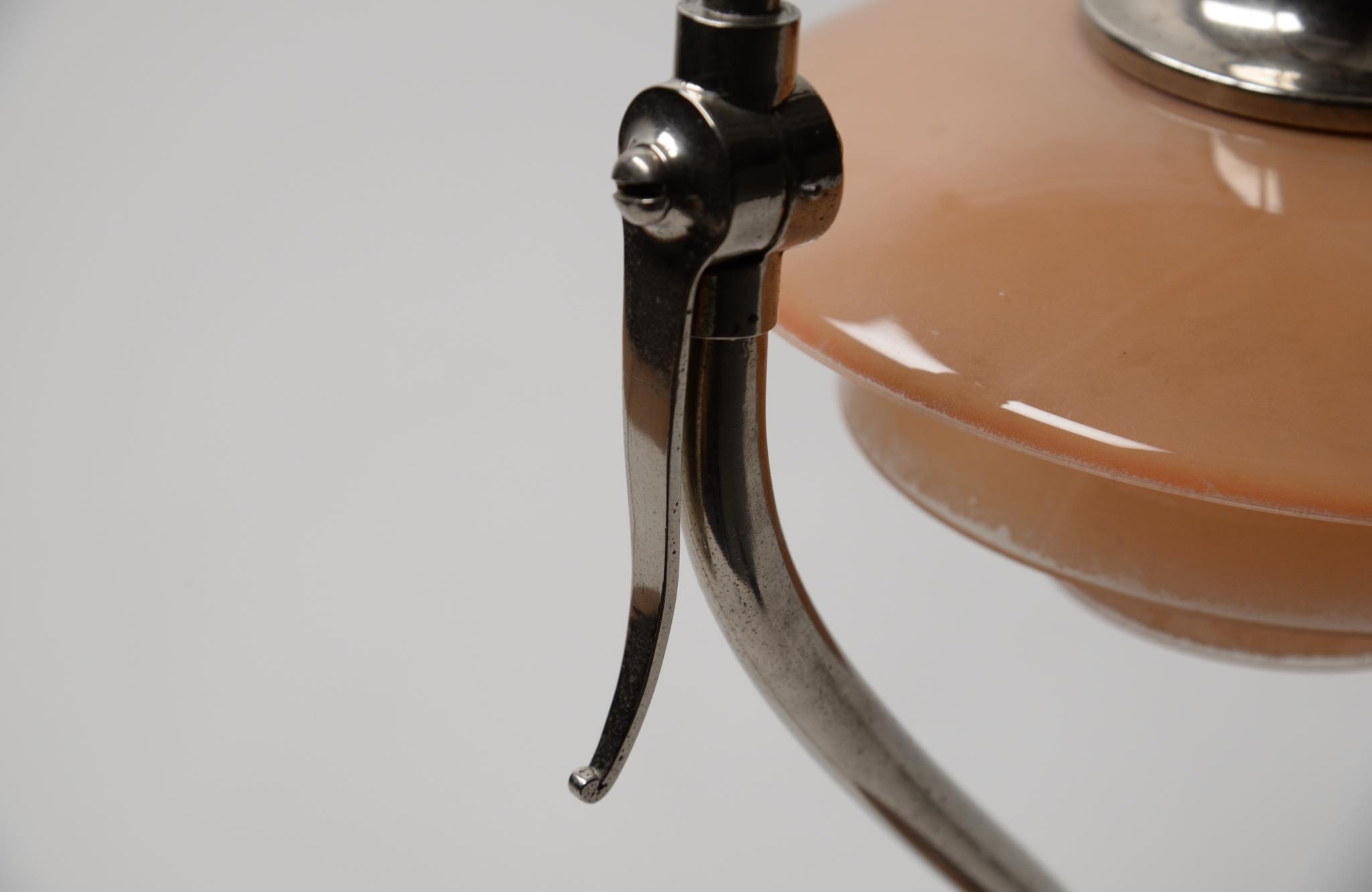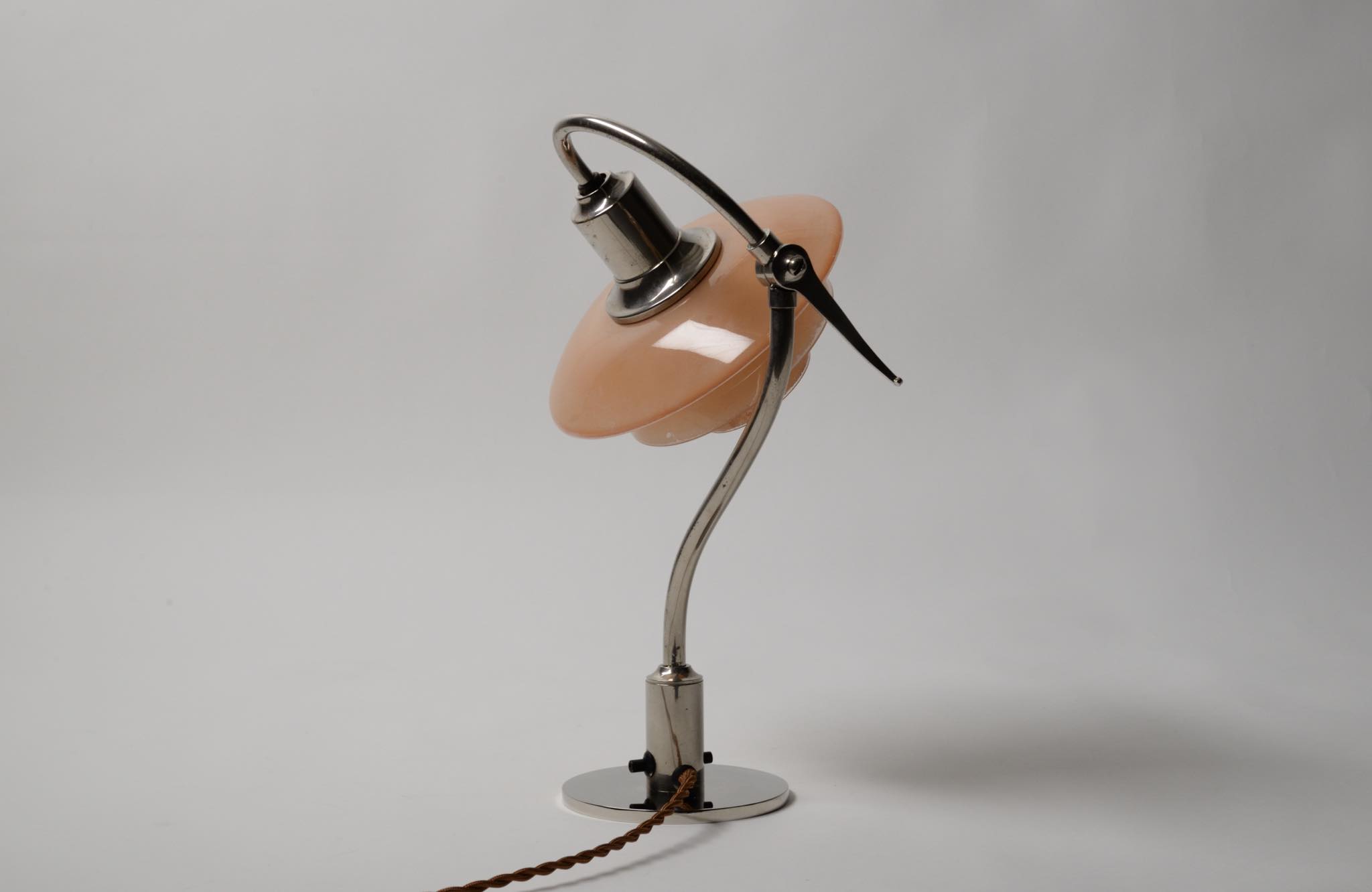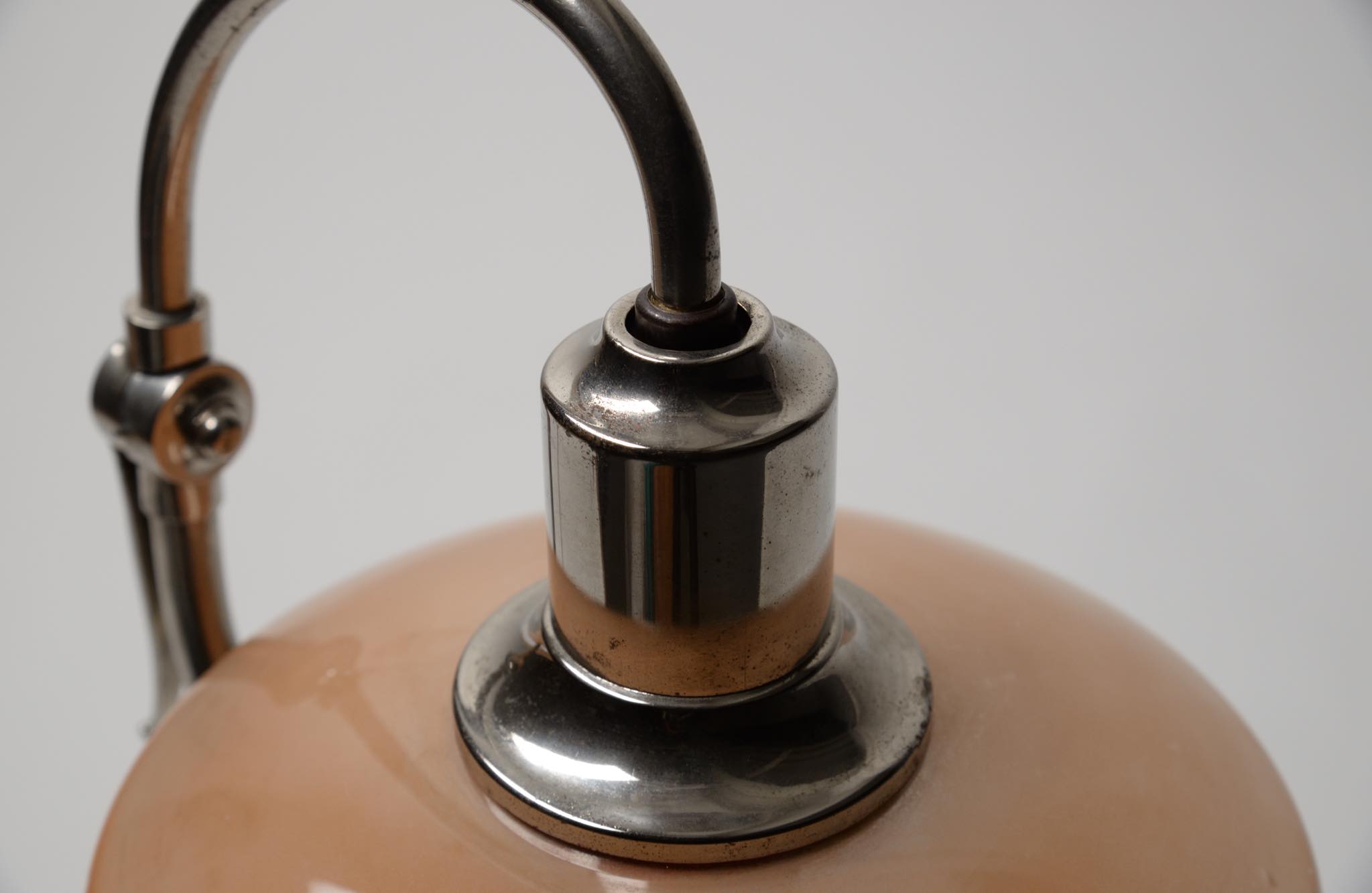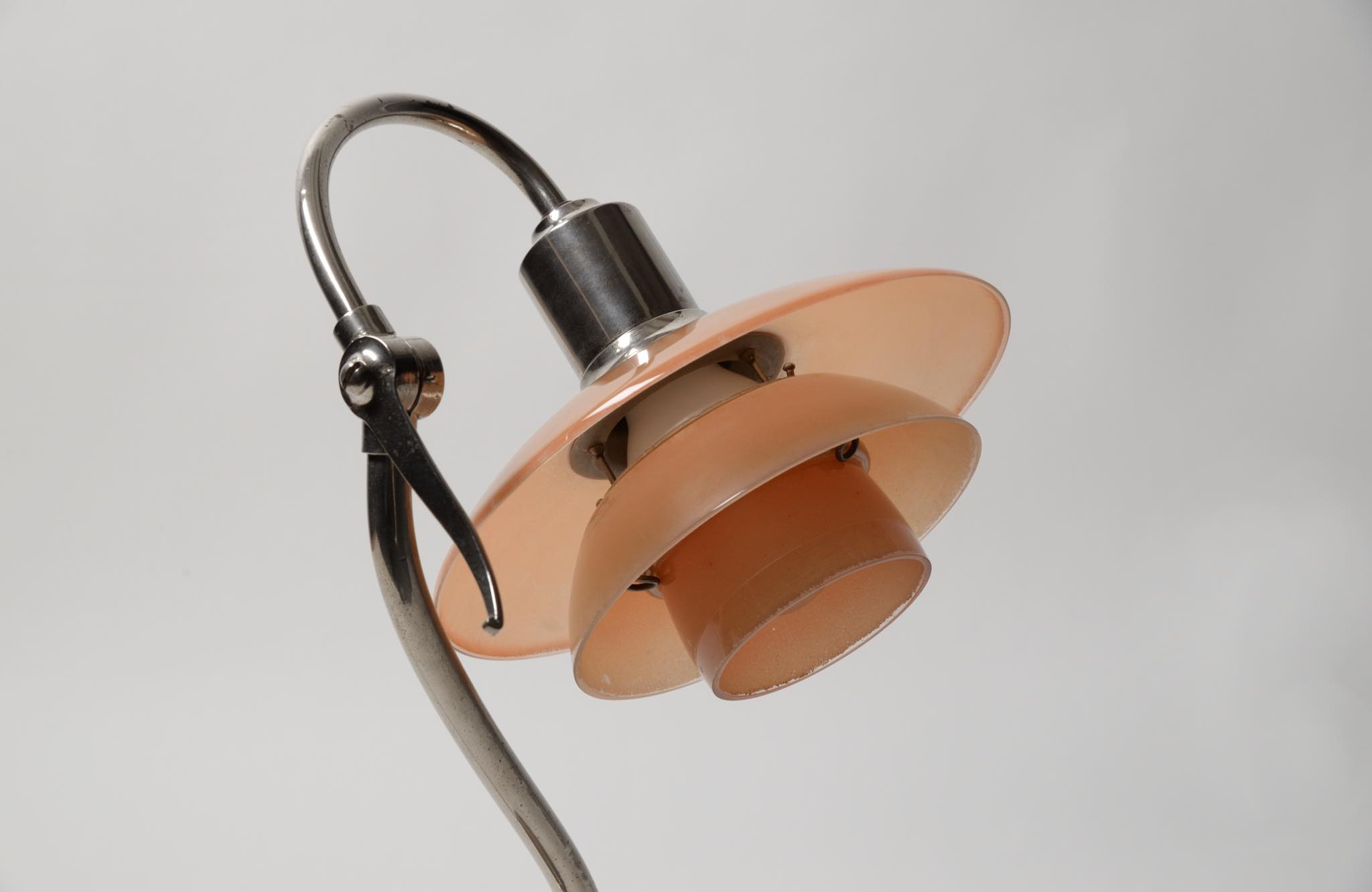 デンマークのデザイナー、Poul Henningsen/ポール・ヘニングセンによるPH2/2”クエスチョンマーク”テーブルランプです。1930年代に作られたもので、レッド/フロステッド(フロストガラスにコーラルピンク色の内側塗装)のシェードに、ステムは比較的希少なクロームメッキ仕上げの様です。傷みがちなシェードの塗膜の剥落は少なく、良好な状態を保っています。ステムは所々錆や変色などが見られますが、ヴィンテージコンディションとして綺麗な状態です。詳しくはお問い合わせください。