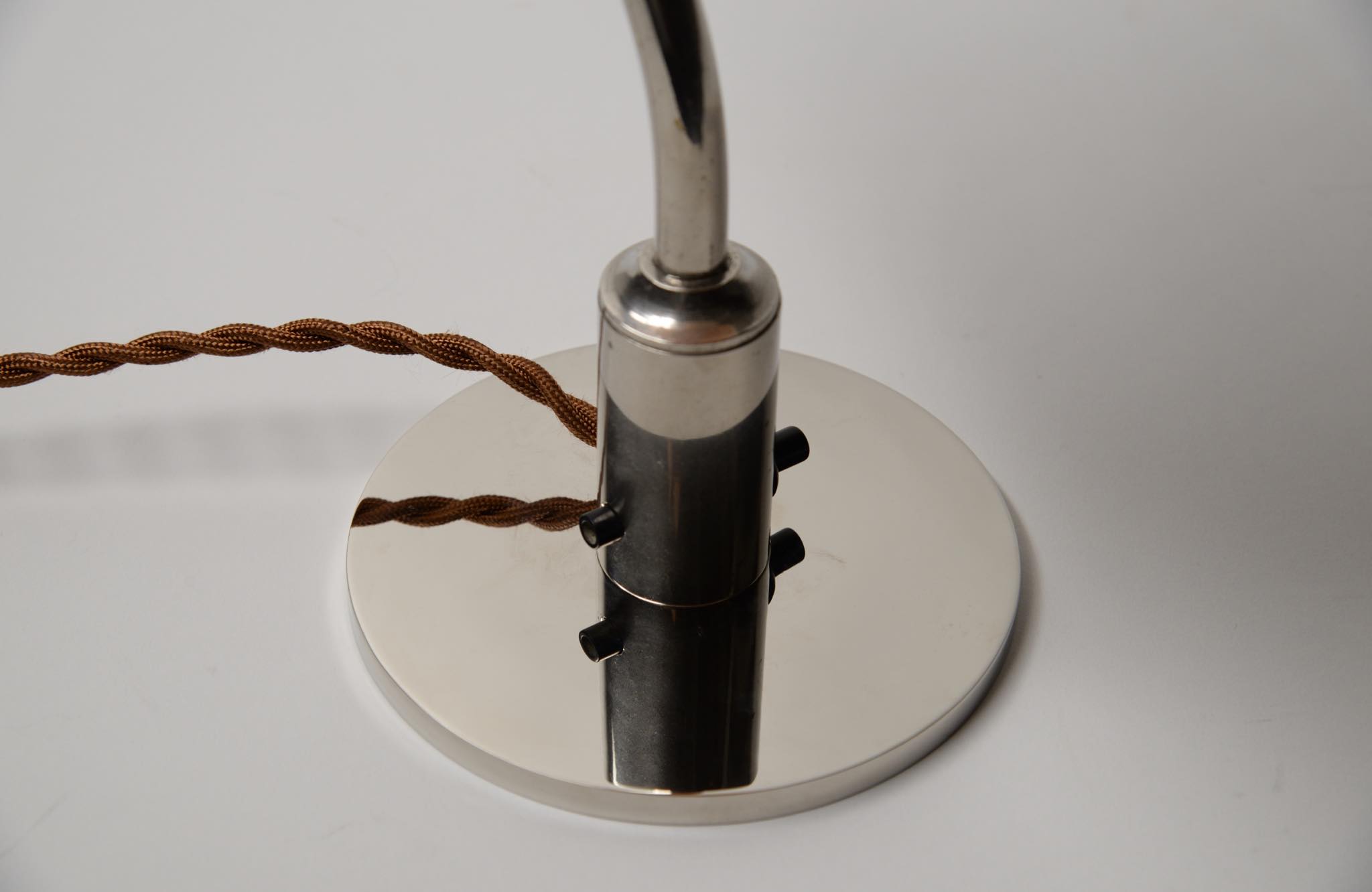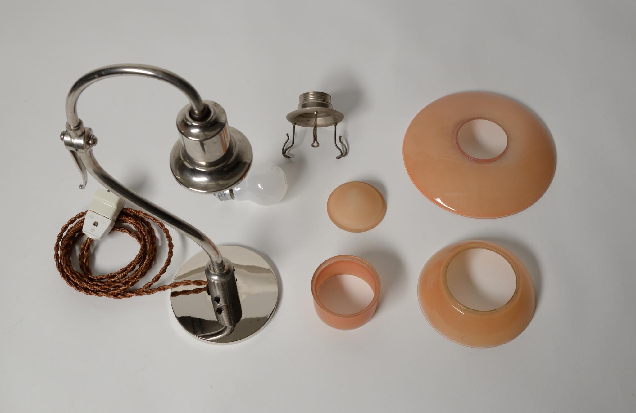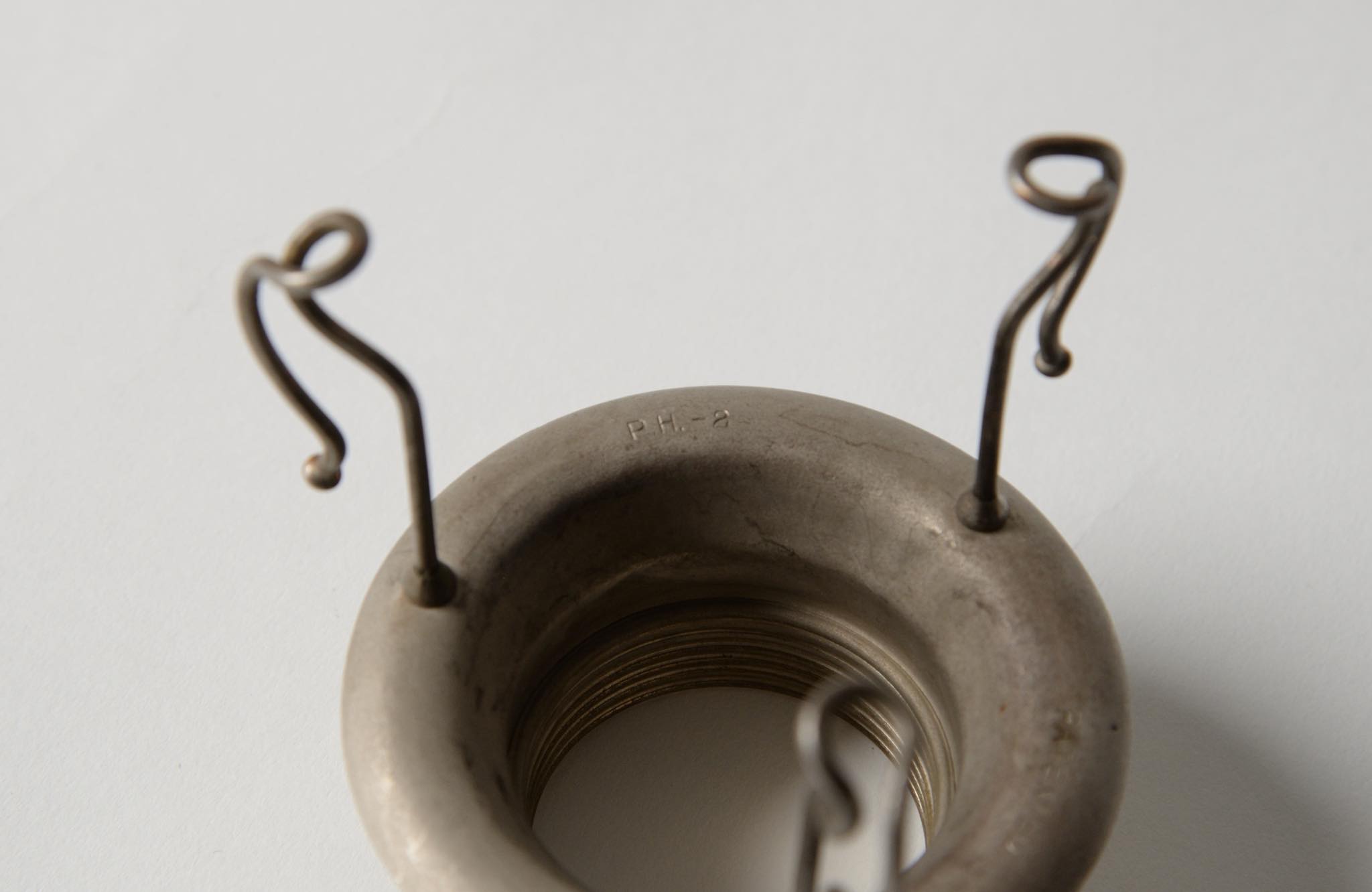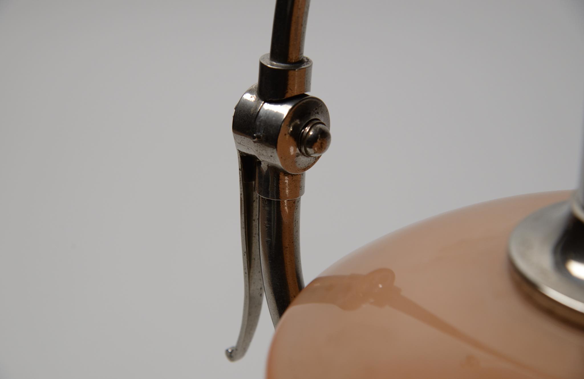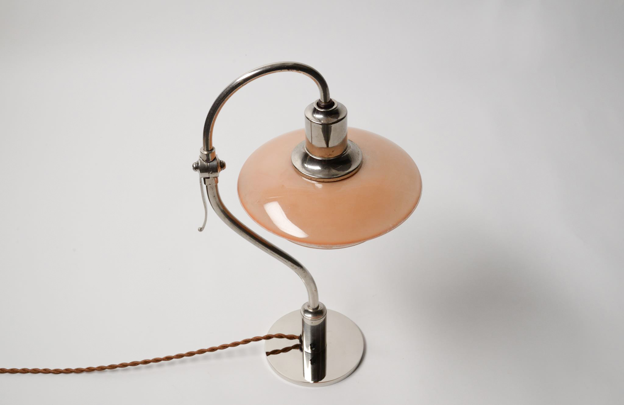 デンマークのデザイナー、Poul Henningsen/ポール・ヘニングセンによるPH2/2”クエスチョンマーク”テーブルランプです。1930年代に作られたもので、レッド/フロステッド(フロストガラスにコーラルピンク色の内側塗装)のシェードに、ステムは比較的希少なクロームメッキ仕上げの様です。傷みがちなシェードの塗膜の剥落は少なく、良好な状態を保っています。ステムは所々錆や変色などが見られますが、ヴィンテージコンディションとして綺麗な状態です。詳しくはお問い合わせください。