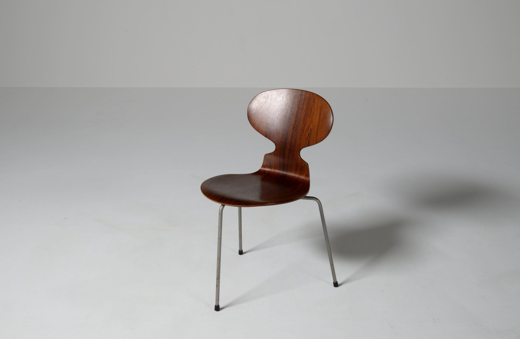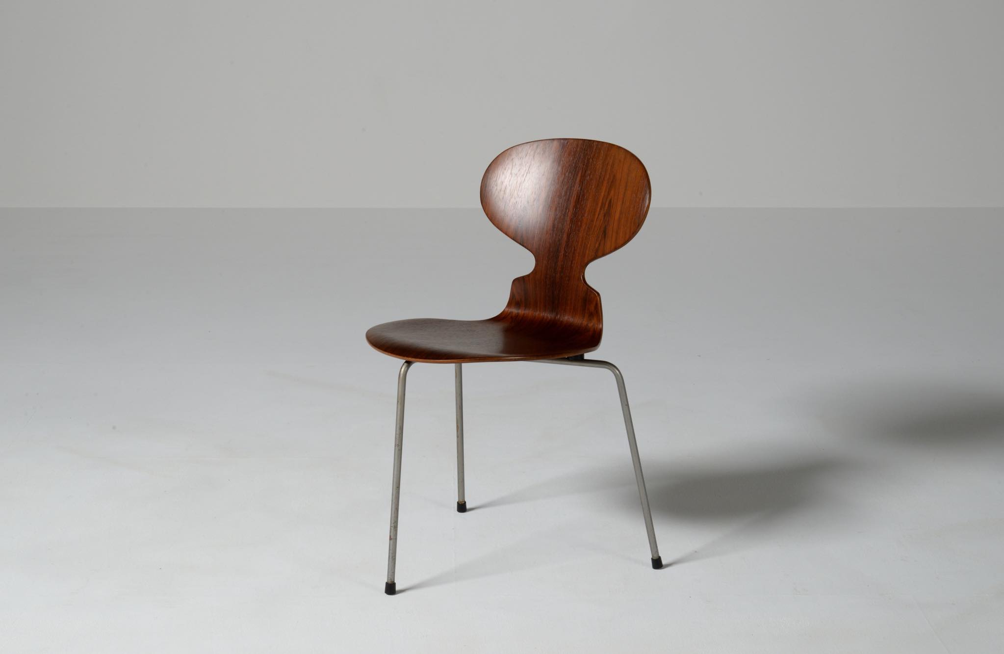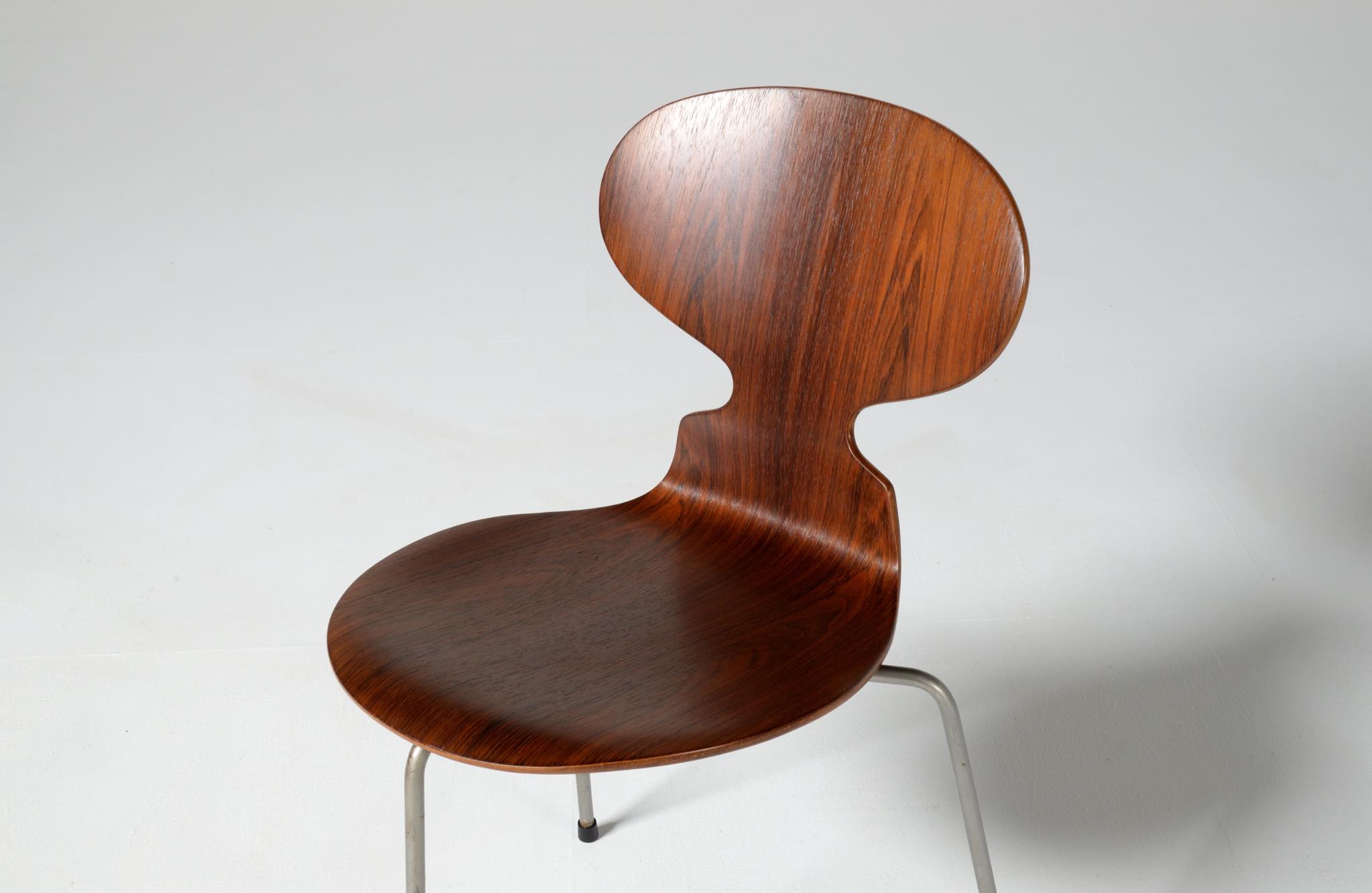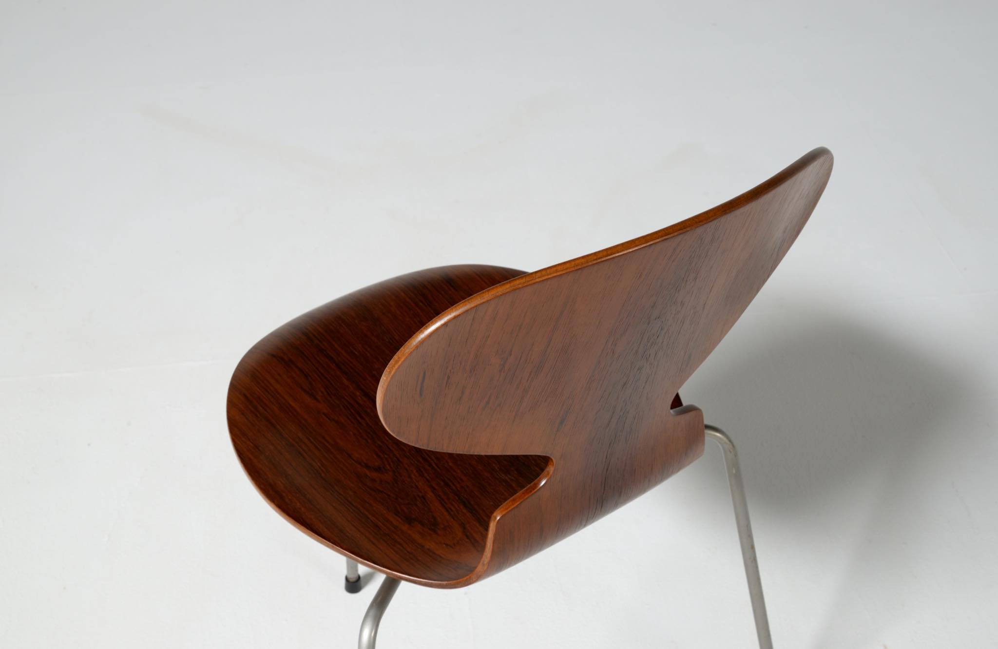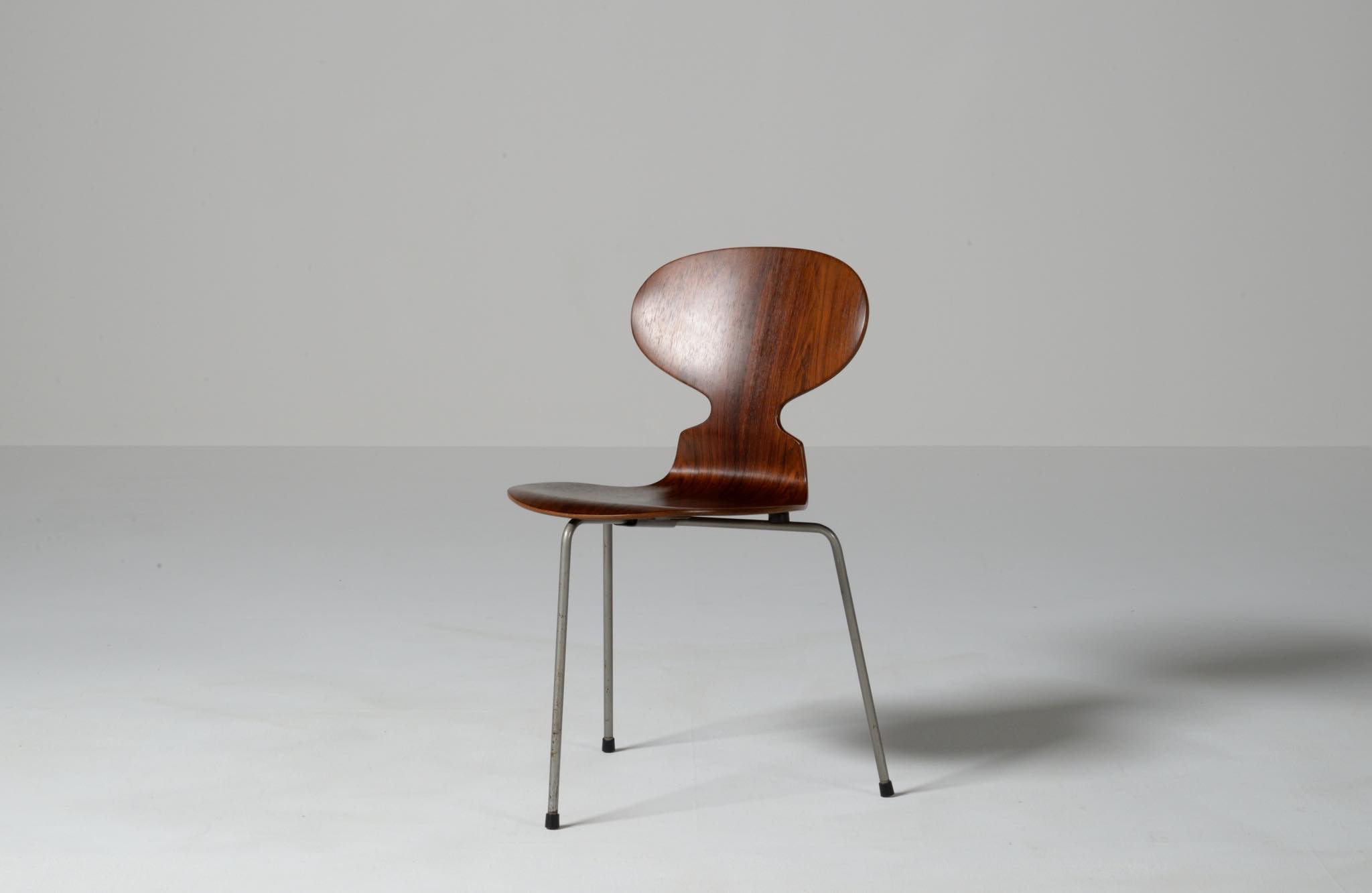 デンマークを代表する建築家のArne Jacobsen/アルネ・ヤコブセンによるアントチェア、ブラジリアンローズウッドのタイプです。1950〜60年代に作られたものでしょう。落ち着いた木目紋様のローズウッドが用いられています。傷みやすい背もたれの曲木も良好で、綺麗な状態です。