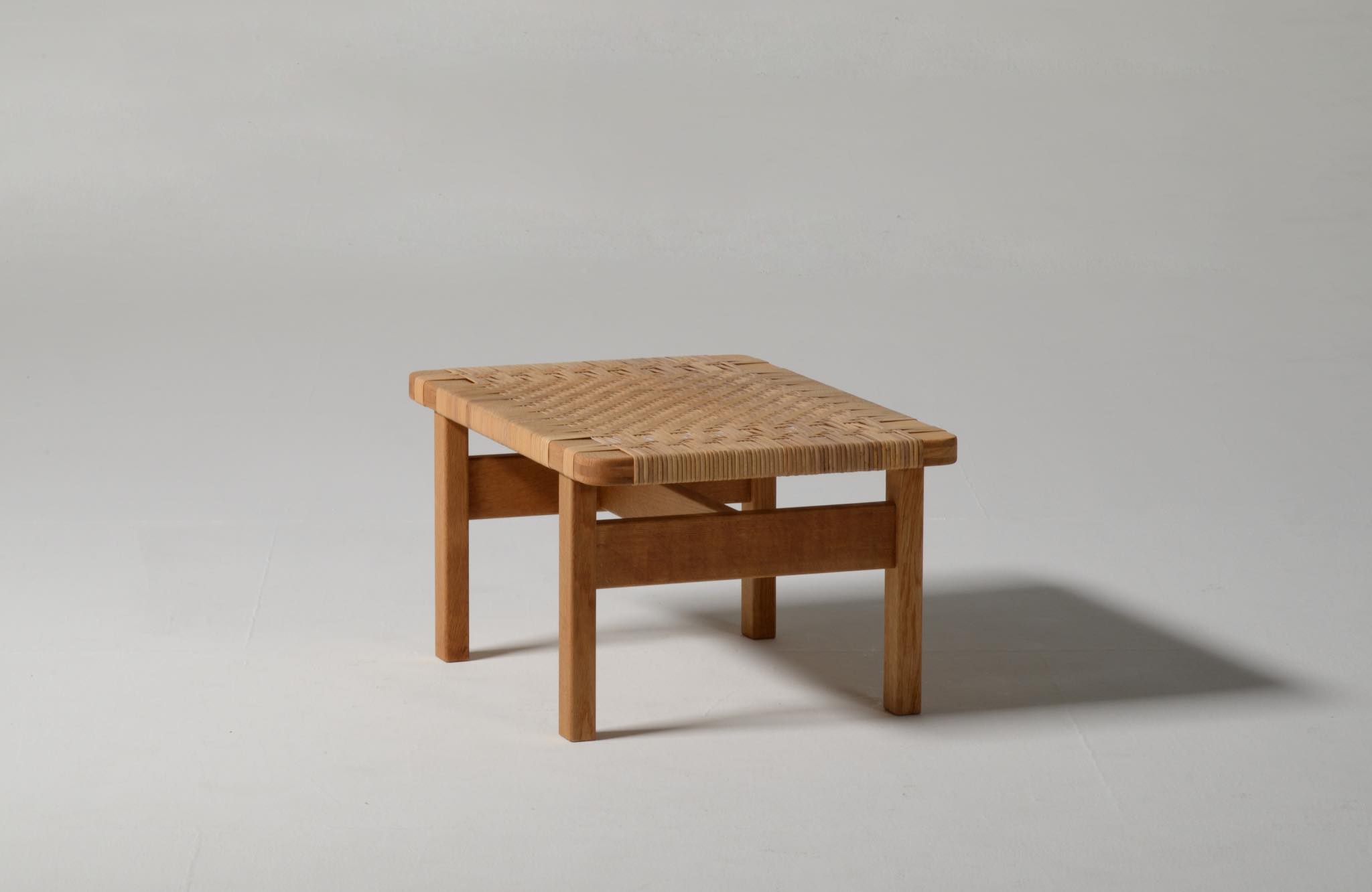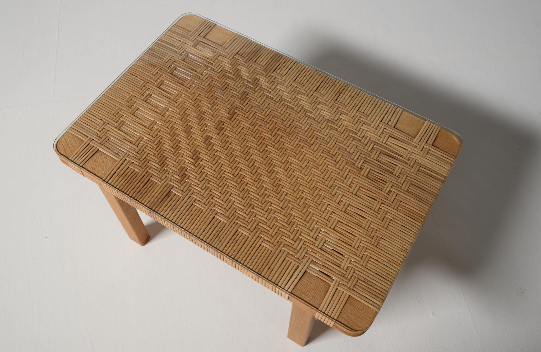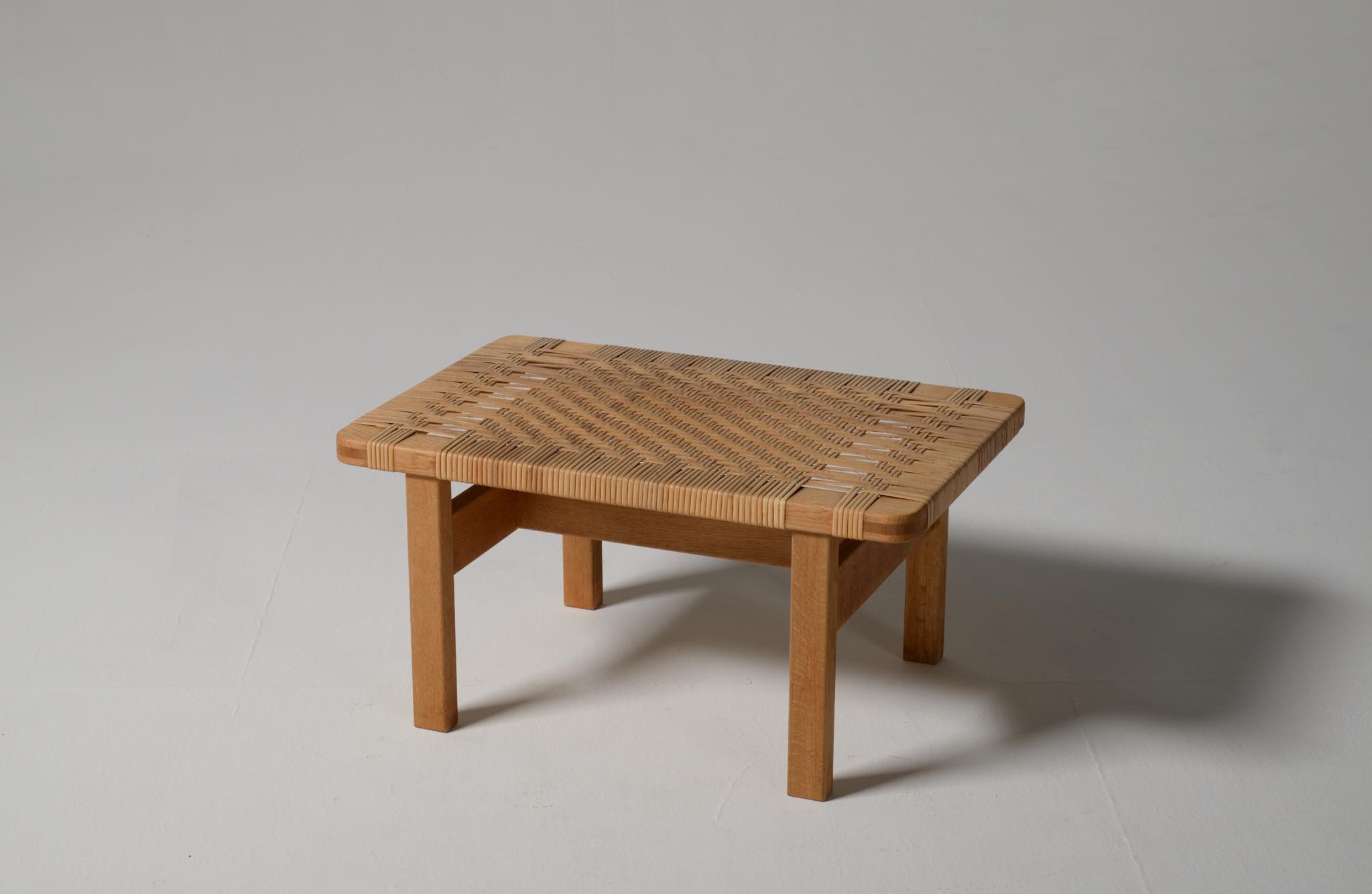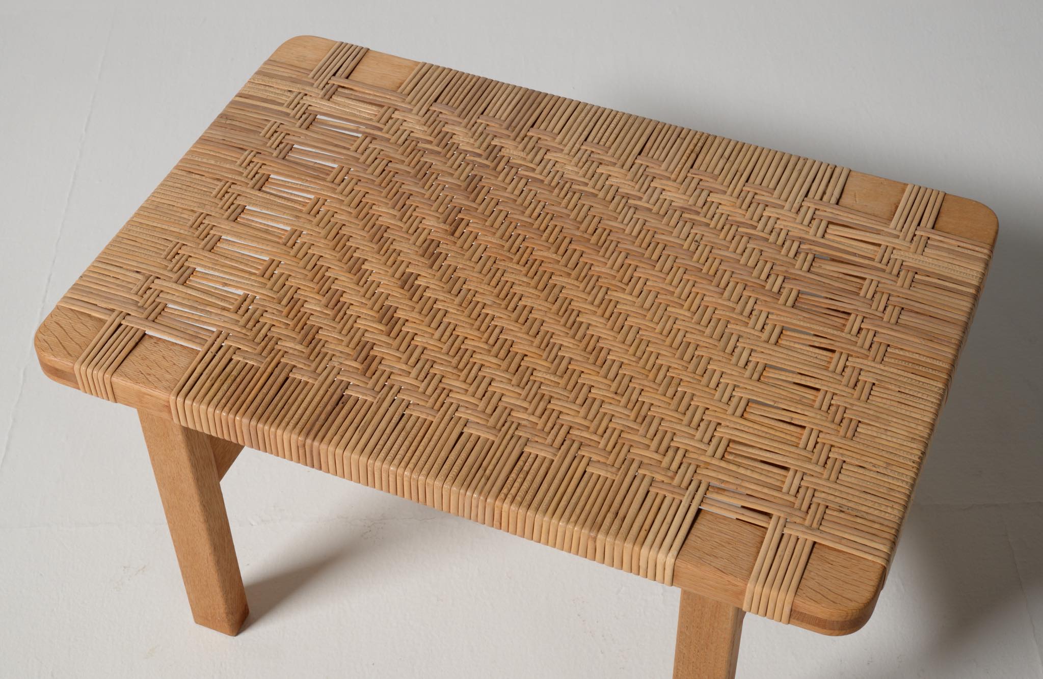 デンマークを代表する家具デザイナーのBørge Mogensen/ボーエ・モーエンセンによる "model 5273" ベンチ、スモールタイプです。家具工房のフレデリシア社によって1955年に発表されたモデルで、こちらの製作もその頃でしょう。無垢のオーク材のフレームに、籐を矢の葉編みで張った和の設を思わせるデザインが特徴的です。後から製作したガラスの天板が付属します。