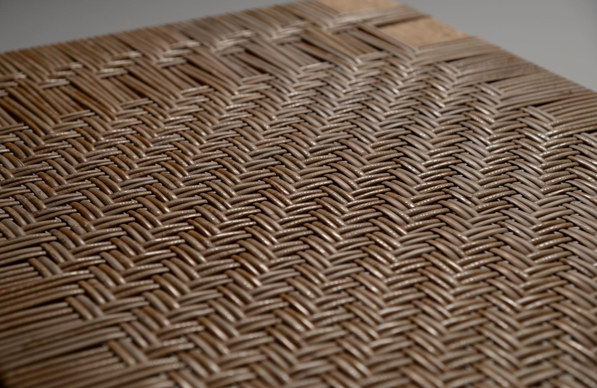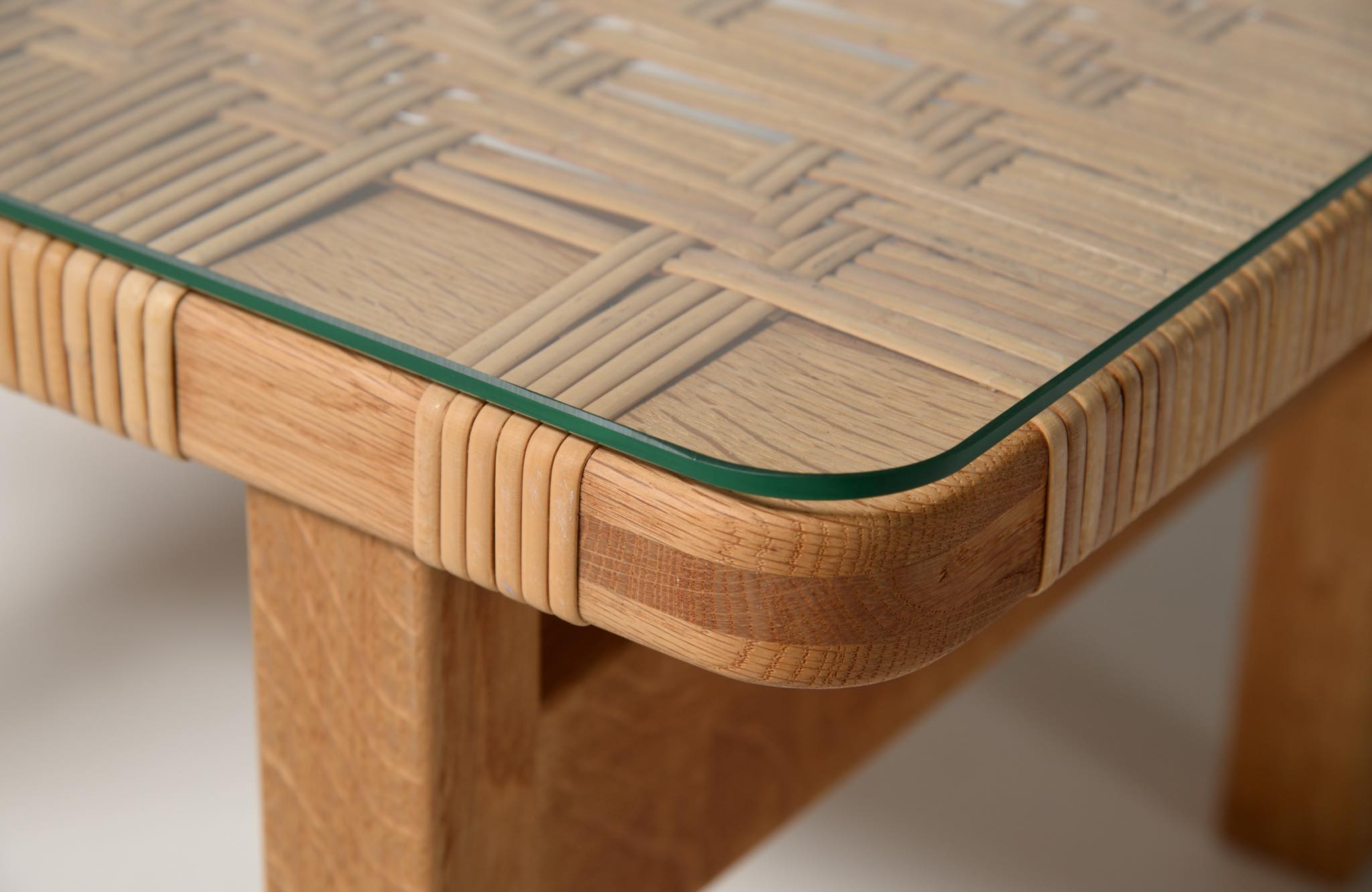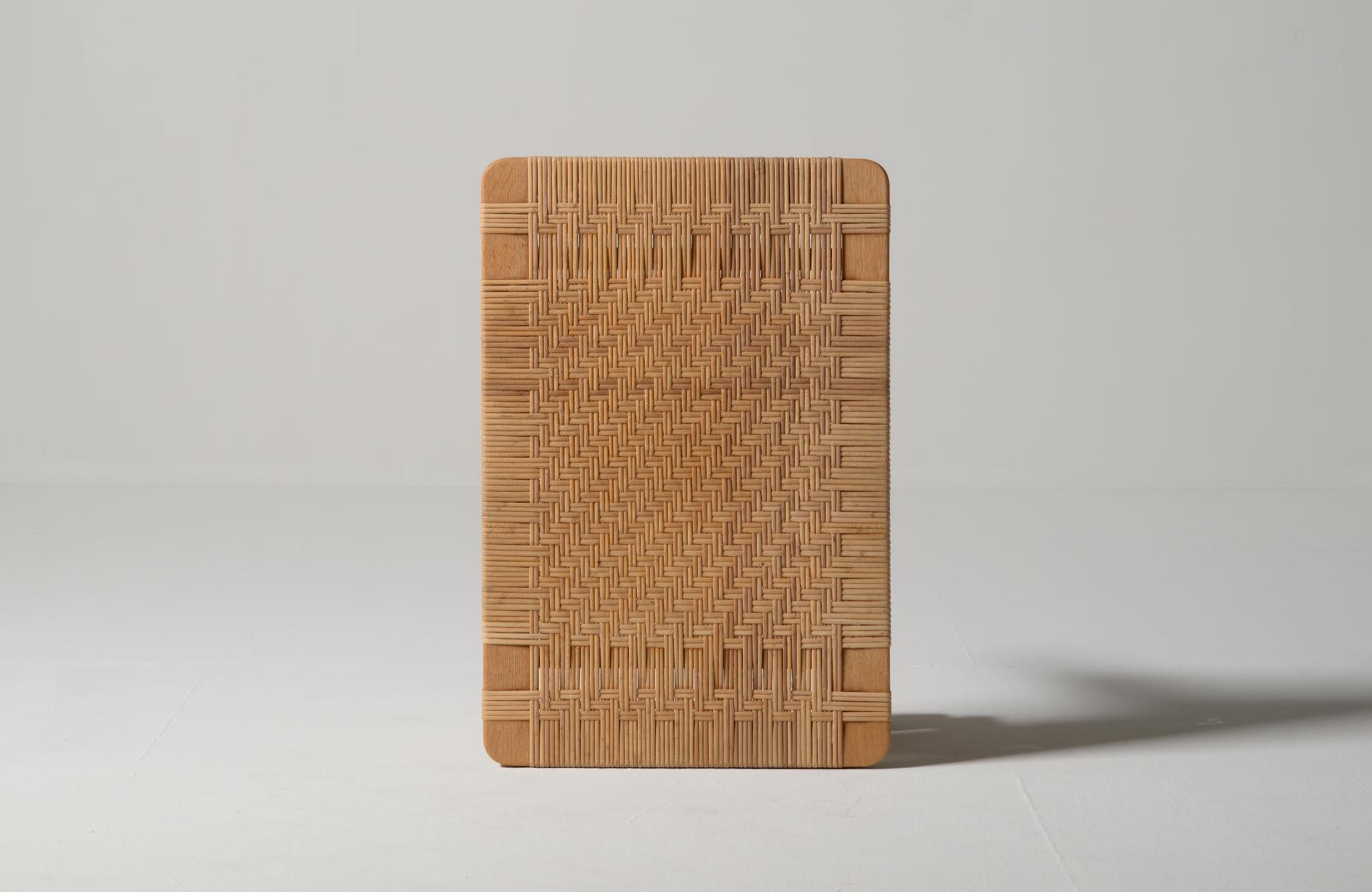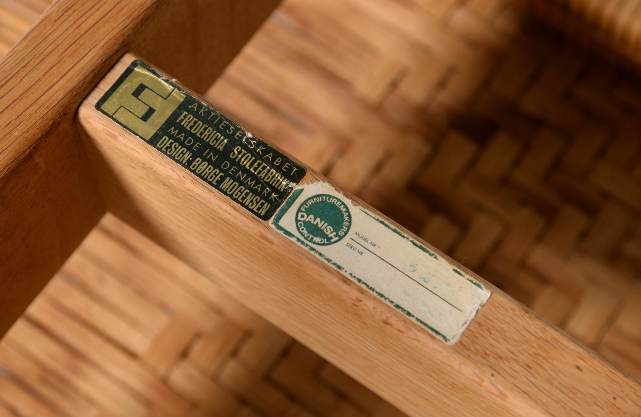 デンマークを代表する家具デザイナーのBørge Mogensen/ボーエ・モーエンセンによる "model 5273" ベンチ、スモールタイプです。家具工房のフレデリシア社によって1955年に発表されたモデルで、こちらの製作もその頃でしょう。無垢のオーク材のフレームに、籐を矢の葉編みで張った和の設を思わせるデザインが特徴的です。後から製作したガラスの天板が付属します。
