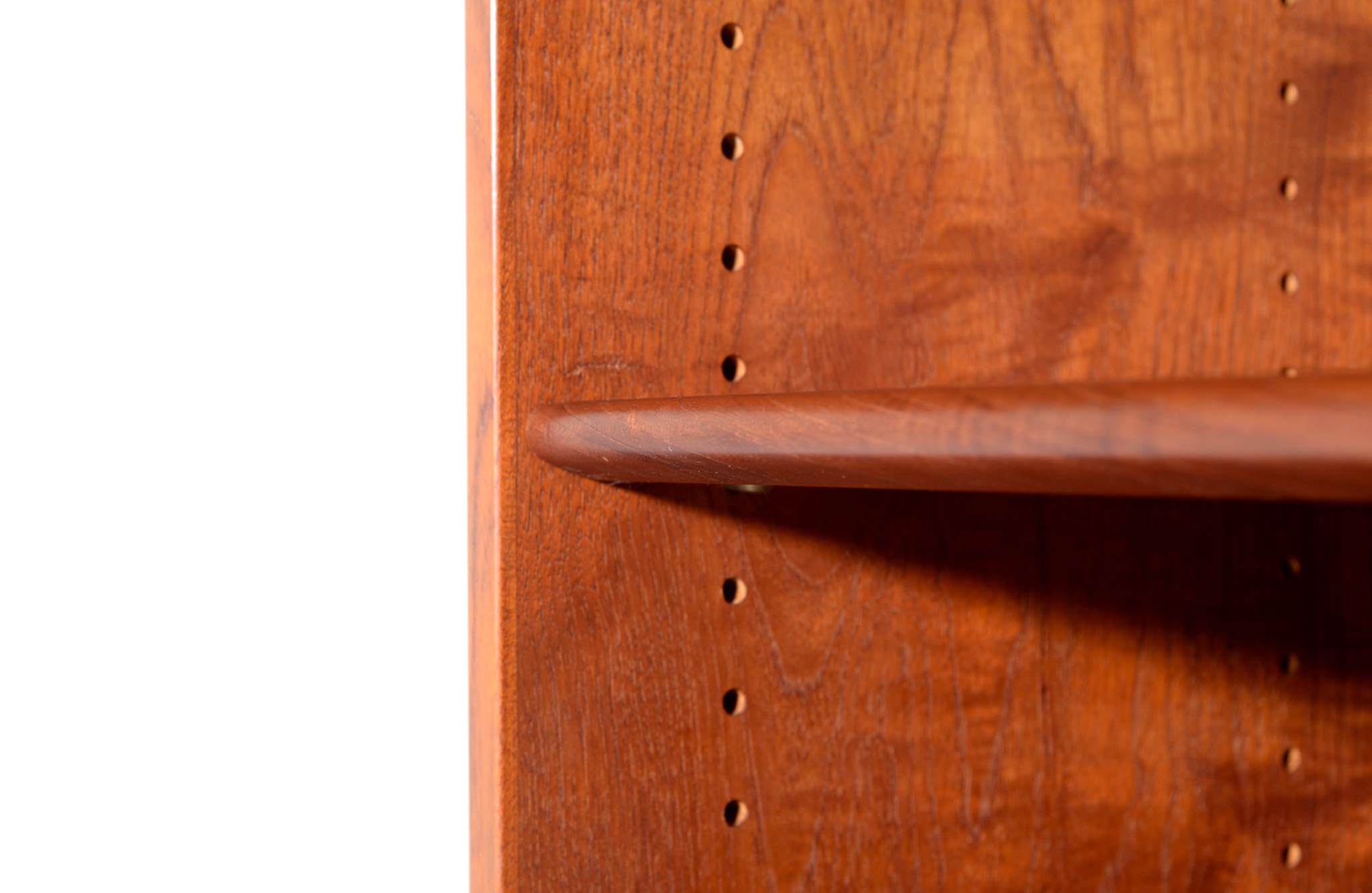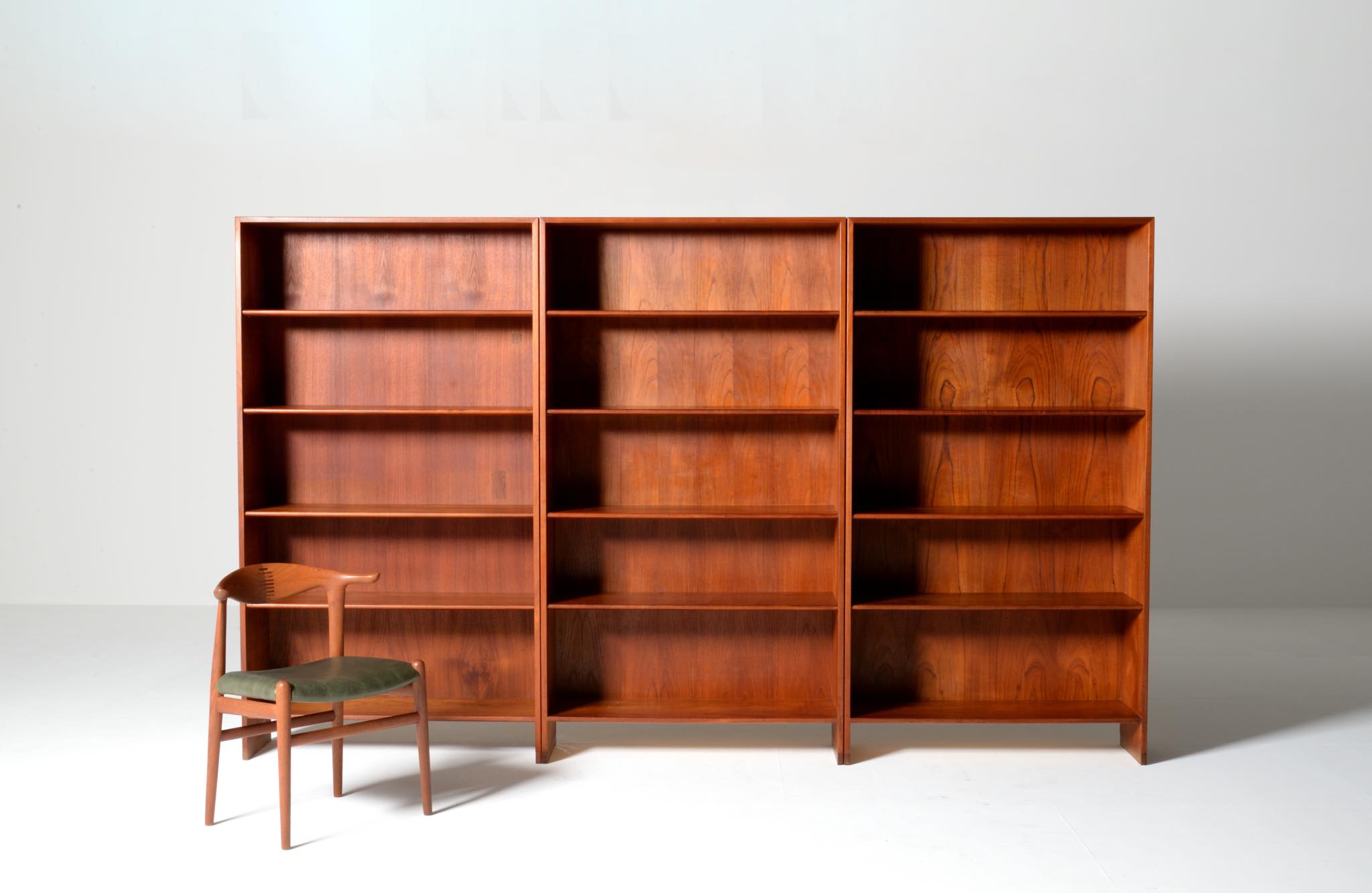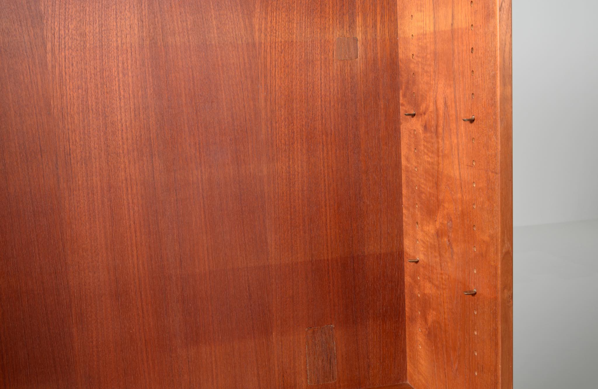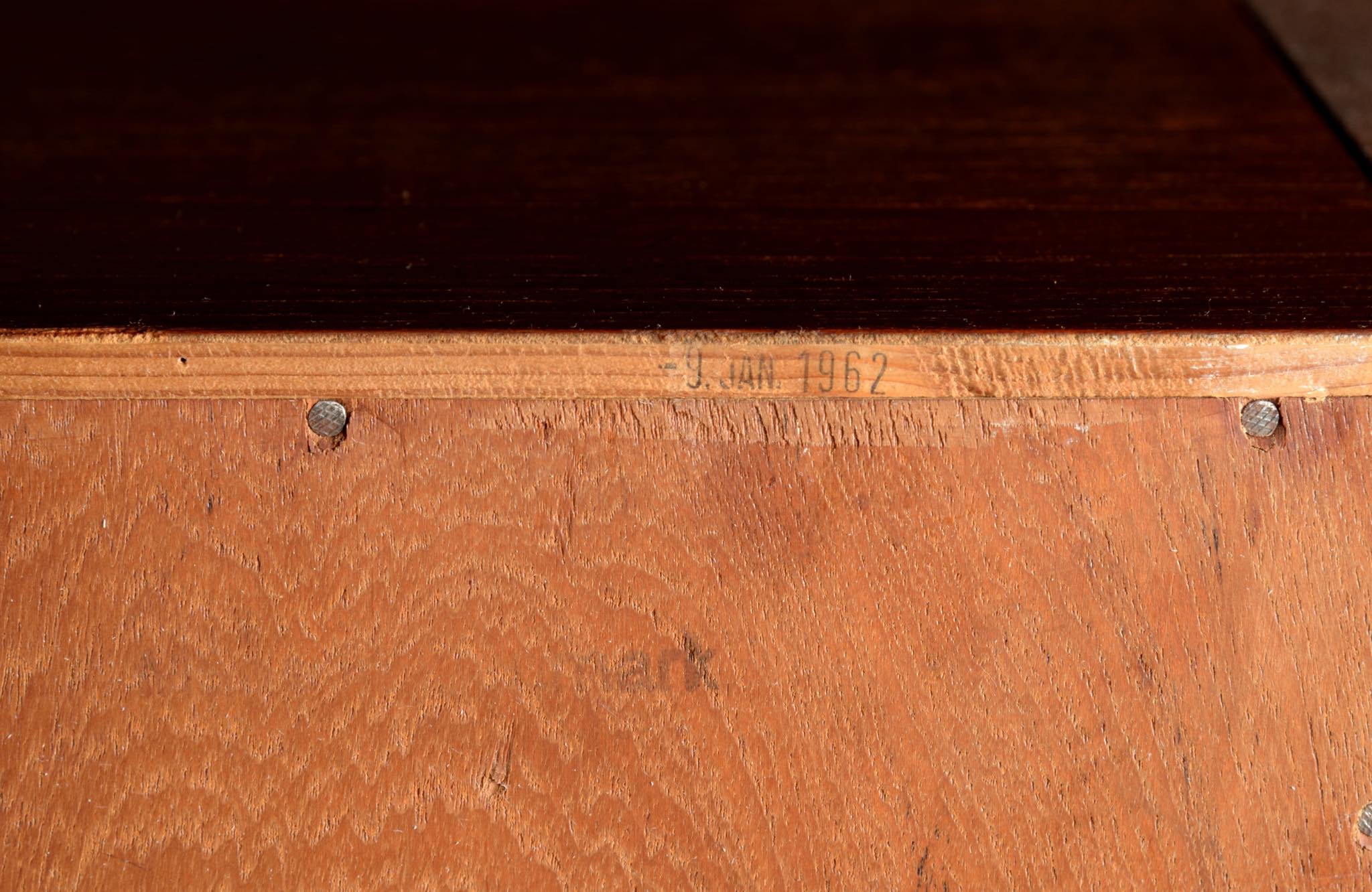 デンマークを代表する家具デザイナーのHans J. Wegner/ハンス・ウェグナーによる、RY8ブックケースキャビネット、チーク材のタイプで、1957年と1962年の製造年記が見られます。余計な装飾を施さず、シンプルな形状ですが、チーク材の持つ見事な構造の棚板固定にオーク材の木栓を用いている点や、地擦りにオーク無垢材を履かせて摩耗に耐えられる構造とするなど、随所に工夫の見られる設計となっています。3棹共にコンディションは良好ですが、個体差がありますので、詳しくはお問い合わせください。