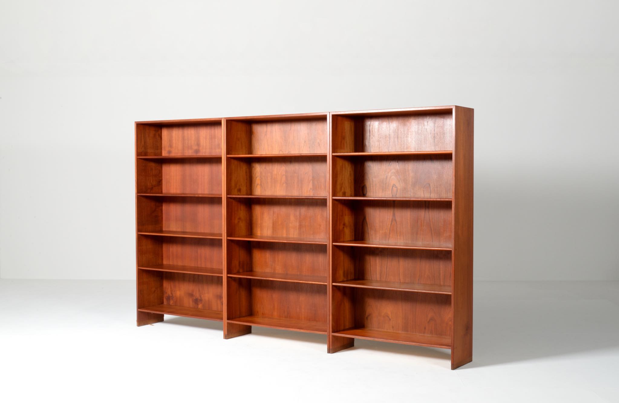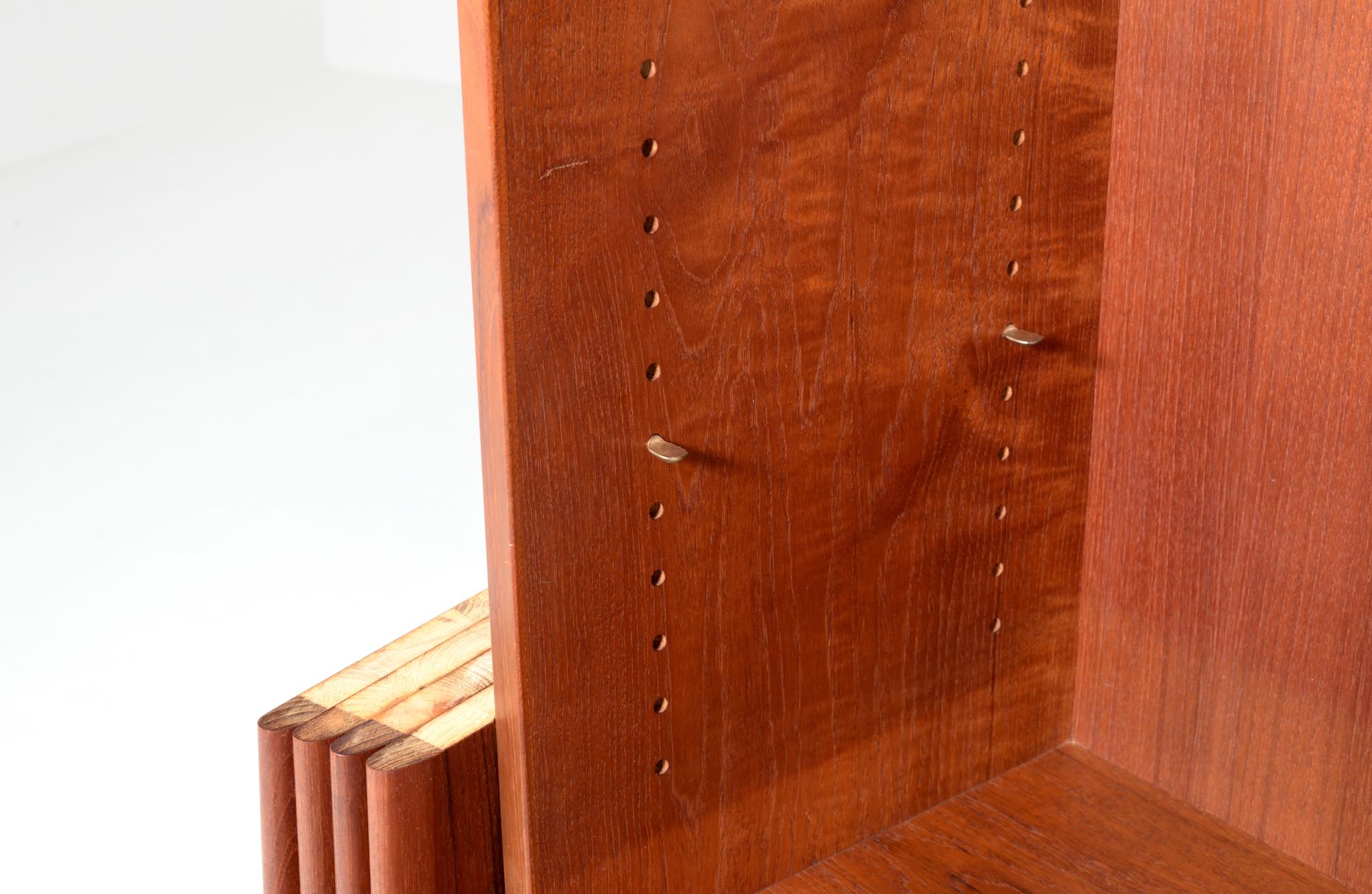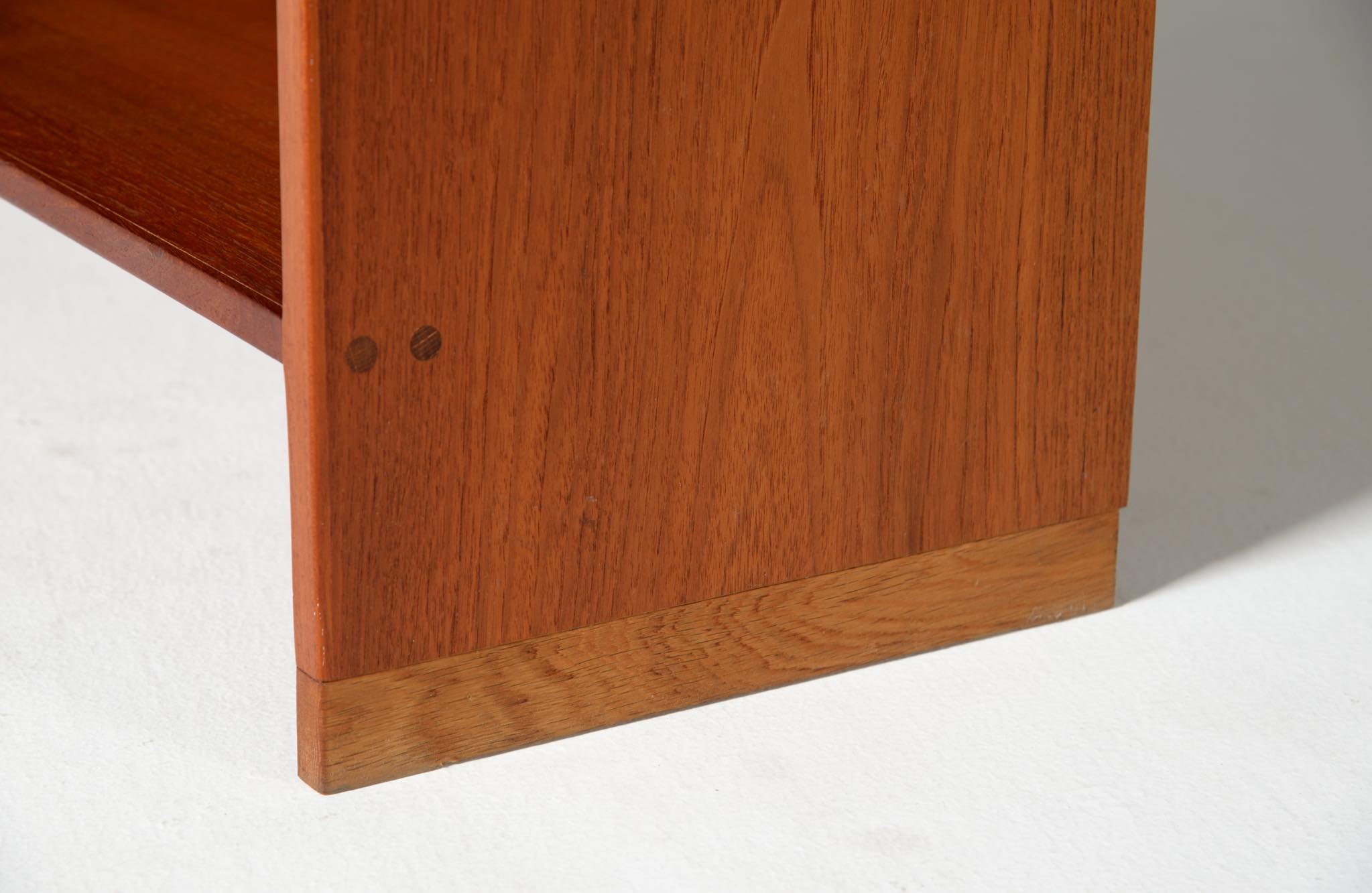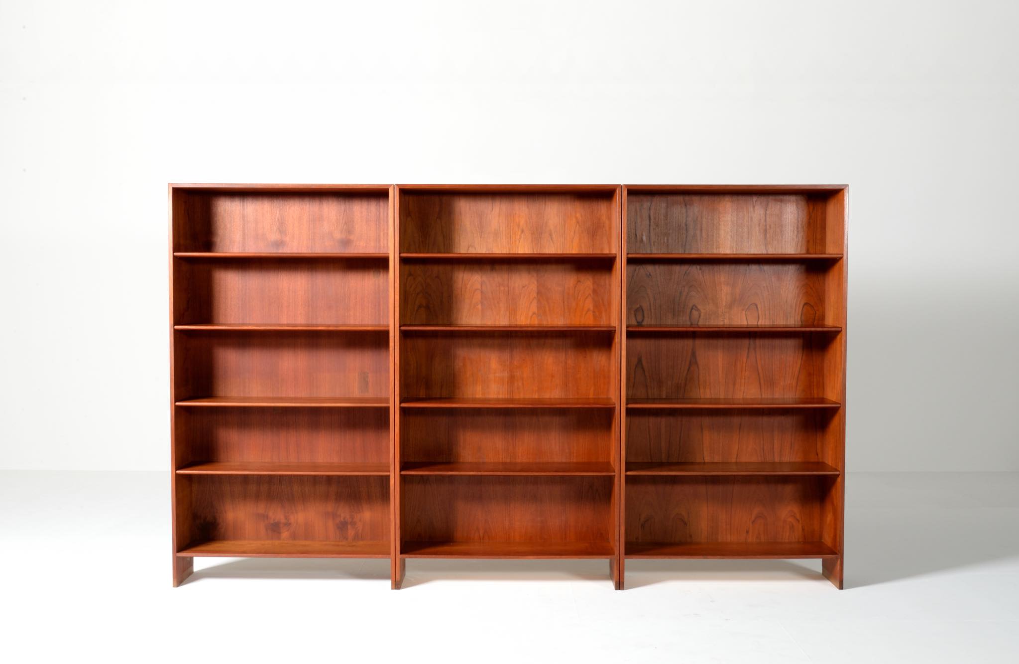 デンマークを代表する家具デザイナーのHans J. Wegner/ハンス・ウェグナーによる、RY8ブックケースキャビネット、チーク材のタイプで、1957年と1962年の製造年記が見られます。余計な装飾を施さず、シンプルな形状ですが、チーク材の持つ見事な構造の棚板固定にオーク材の木栓を用いている点や、地擦りにオーク無垢材を履かせて摩耗に耐えられる構造とするなど、随所に工夫の見られる設計となっています。3棹共にコンディションは良好ですが、個体差がありますので、詳しくはお問い合わせください。