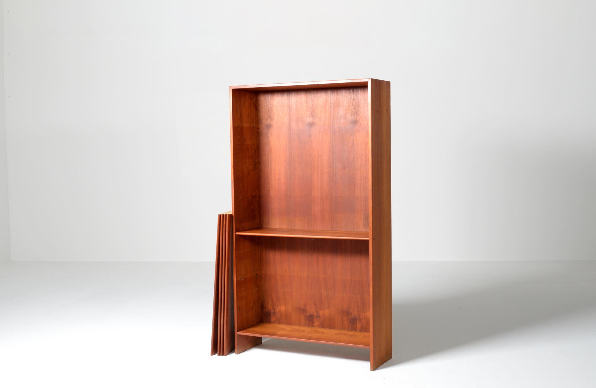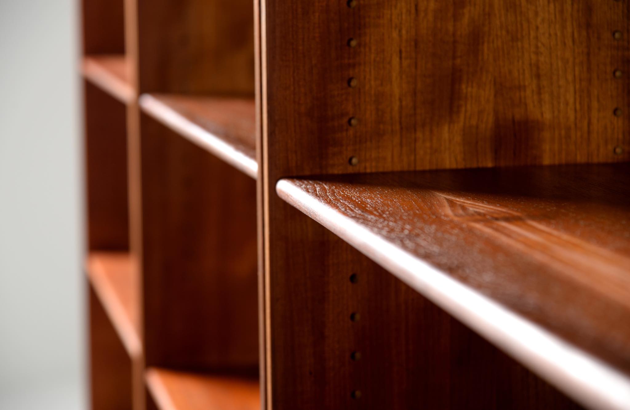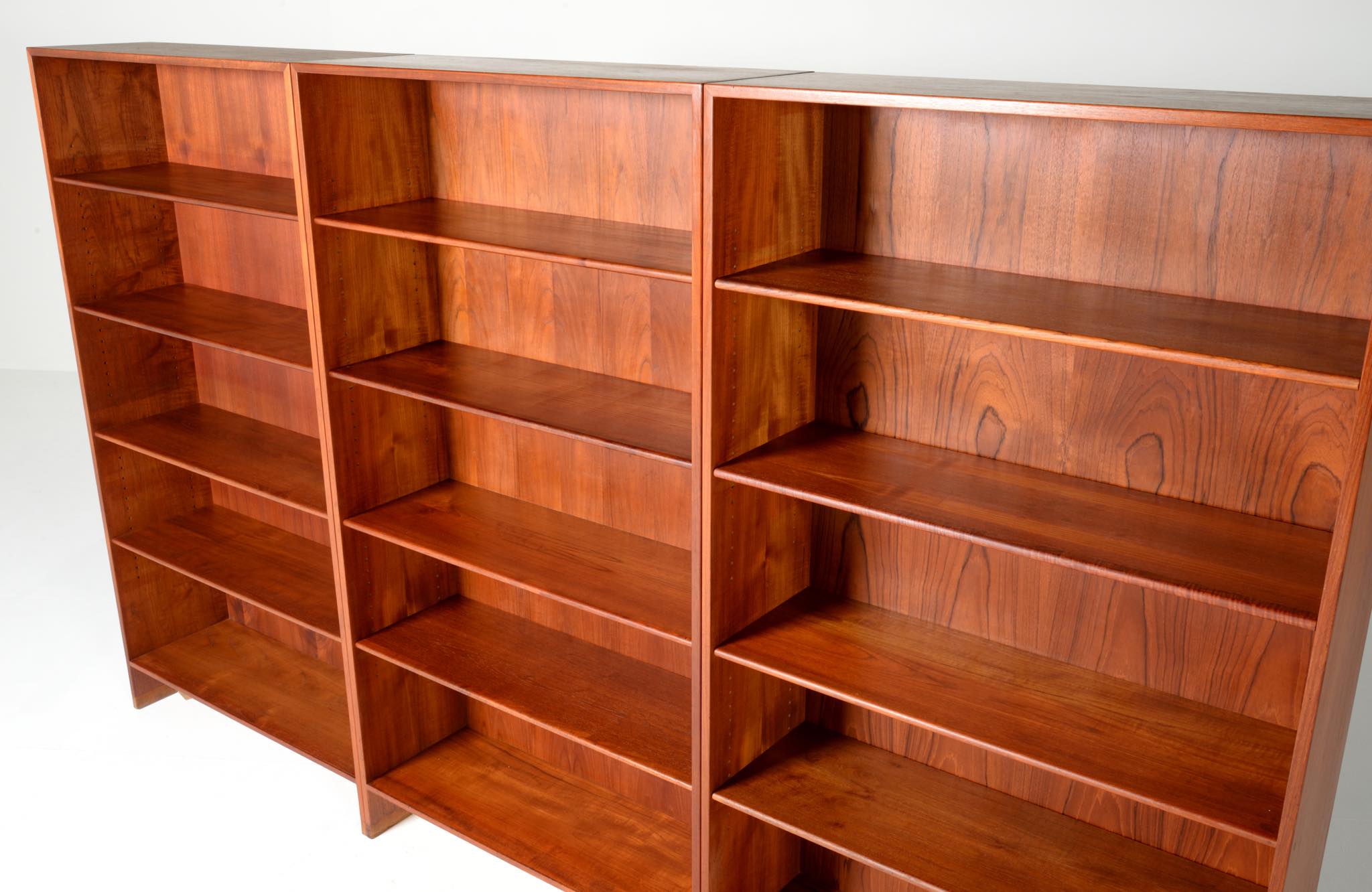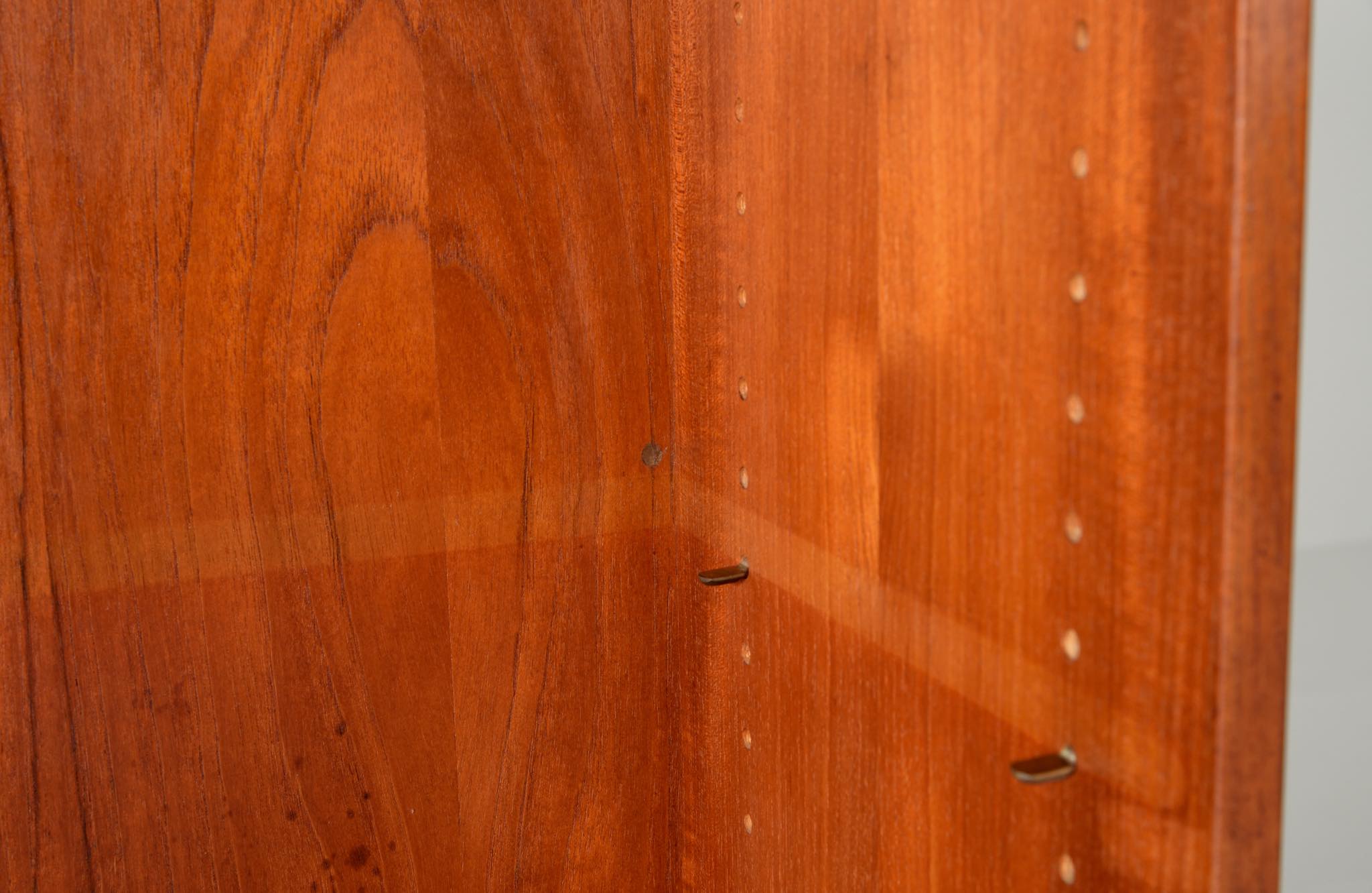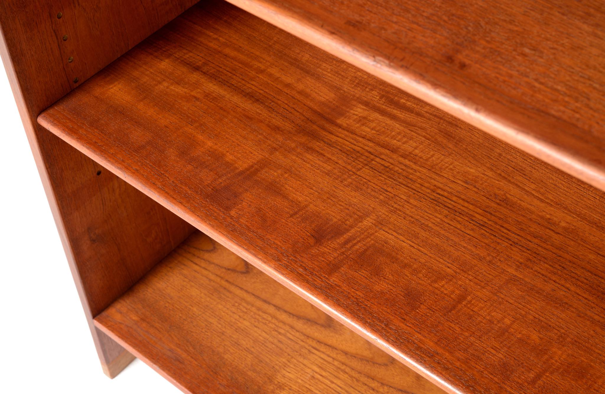 デンマークを代表する家具デザイナーのHans J. Wegner/ハンス・ウェグナーによる、RY8ブックケースキャビネット、チーク材のタイプで、1957年と1962年の製造年記が見られます。余計な装飾を施さず、シンプルな形状ですが、チーク材の持つ見事な構造の棚板固定にオーク材の木栓を用いている点や、地擦りにオーク無垢材を履かせて摩耗に耐えられる構造とするなど、随所に工夫の見られる設計となっています。3棹共にコンディションは良好ですが、個体差がありますので、詳しくはお問い合わせください。