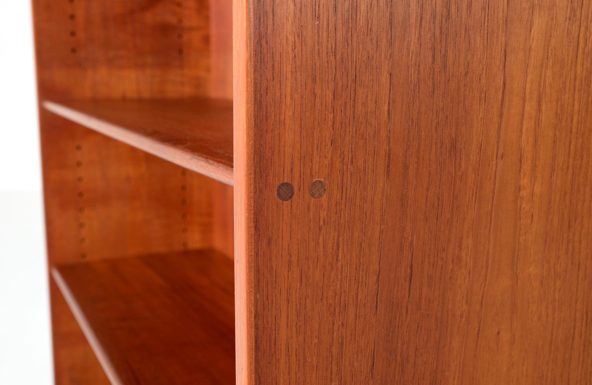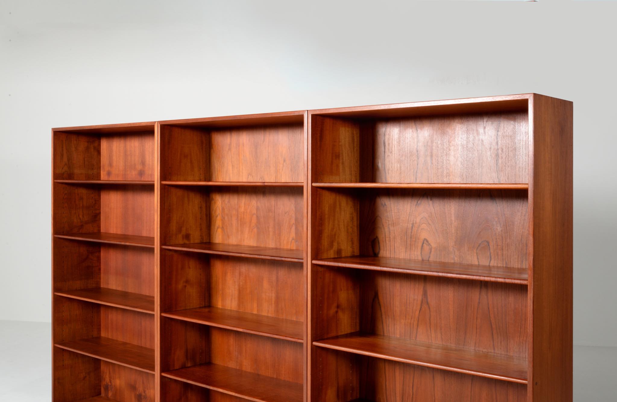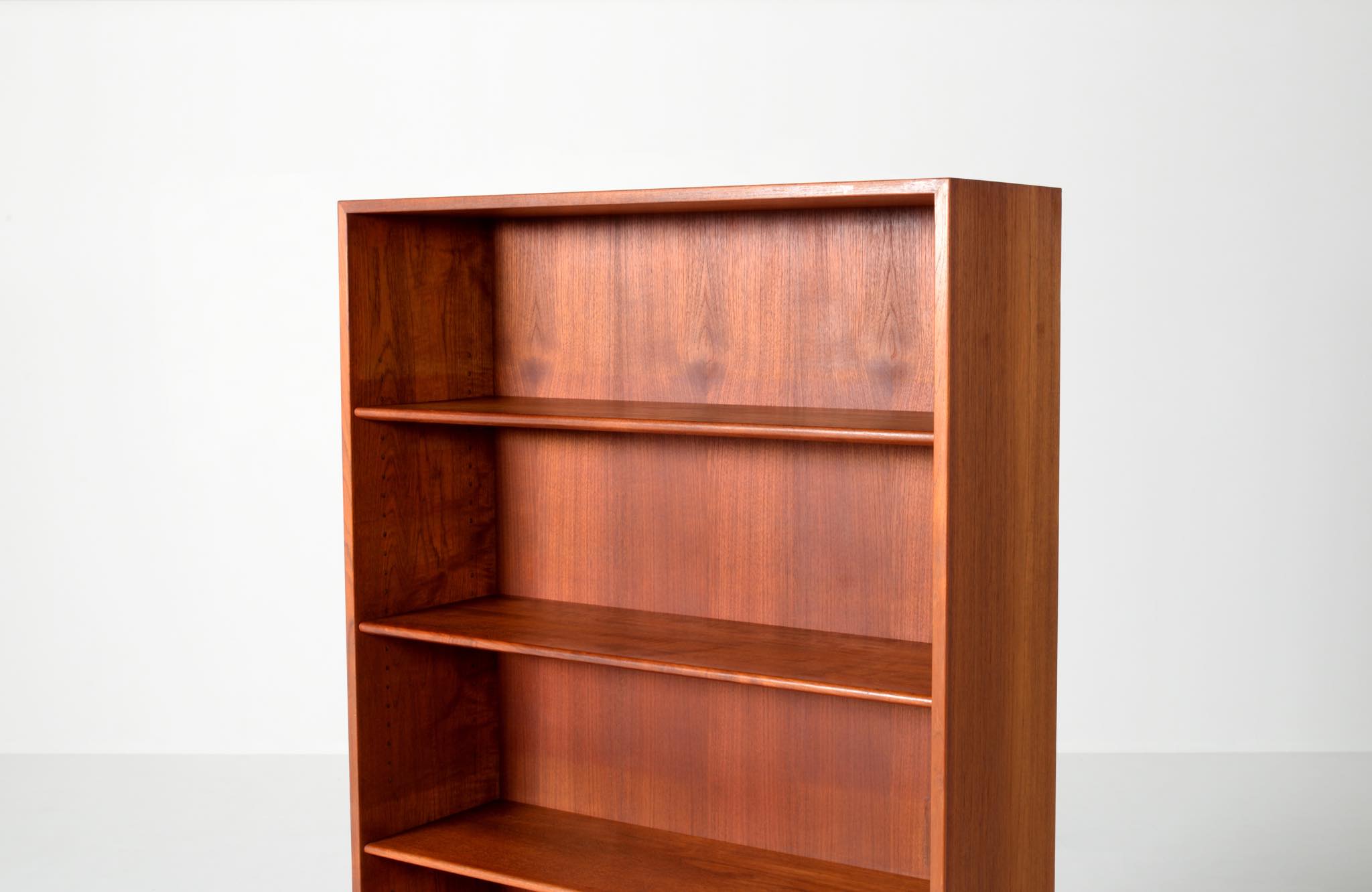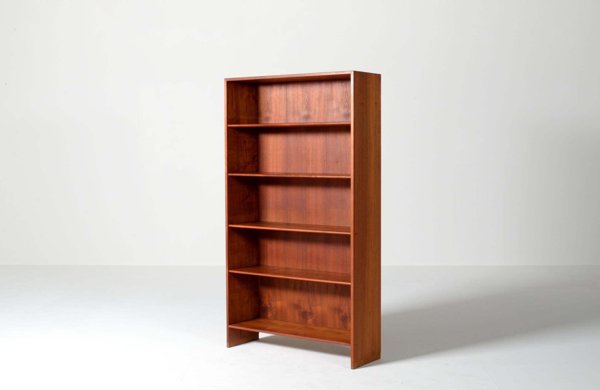 デンマークを代表する家具デザイナーのHans J. Wegner/ハンス・ウェグナーによる、RY8ブックケースキャビネット、チーク材のタイプで、1957年と1962年の製造年記が見られます。余計な装飾を施さず、シンプルな形状ですが、チーク材の持つ見事な構造の棚板固定にオーク材の木栓を用いている点や、地擦りにオーク無垢材を履かせて摩耗に耐えられる構造とするなど、随所に工夫の見られる設計となっています。3棹共にコンディションは良好ですが、個体差がありますので、詳しくはお問い合わせください。
