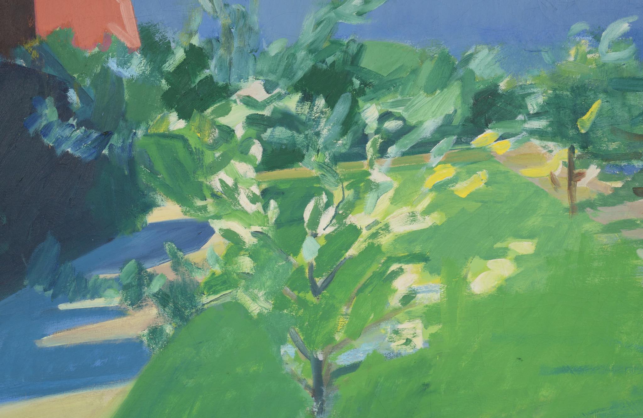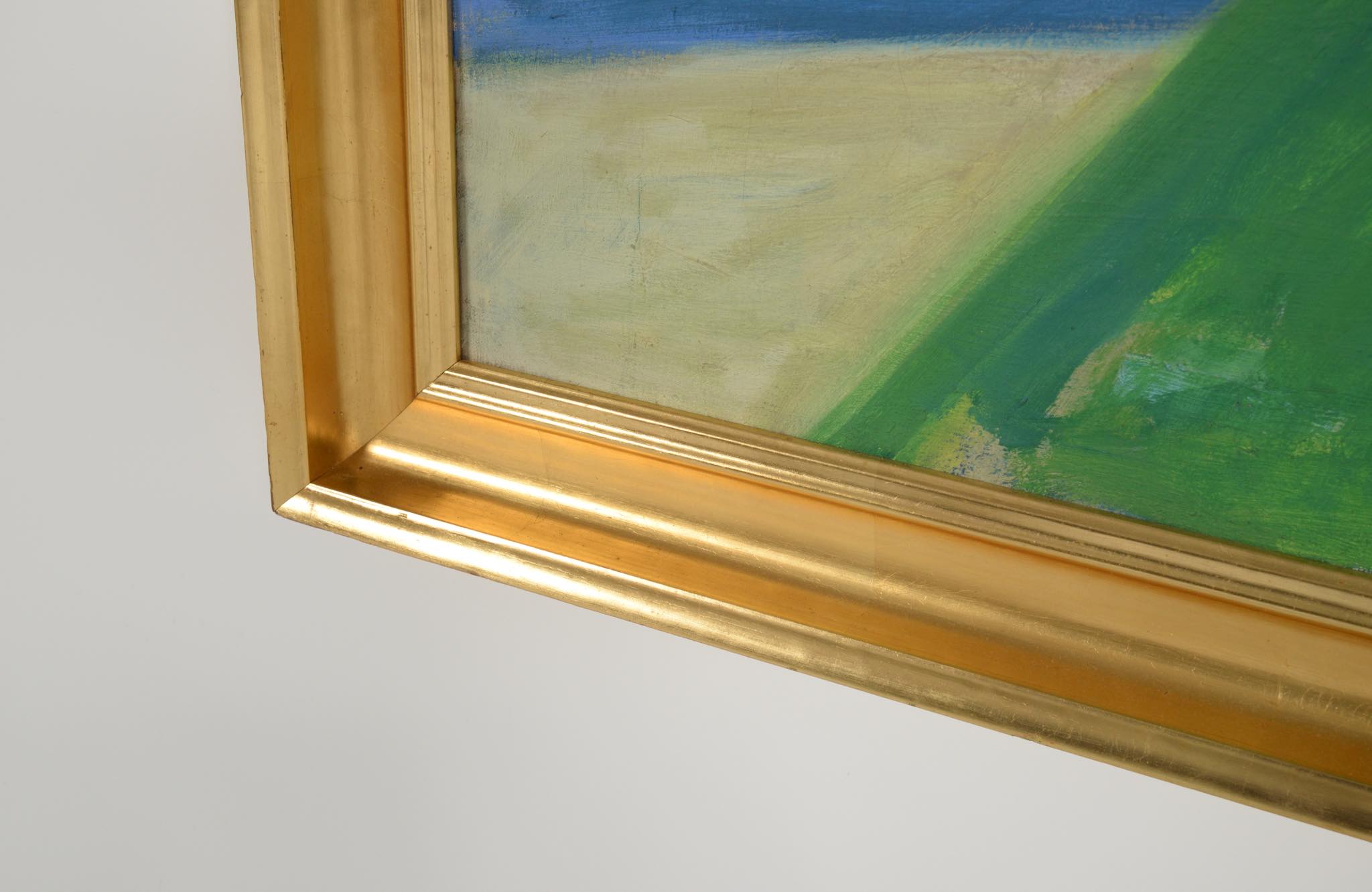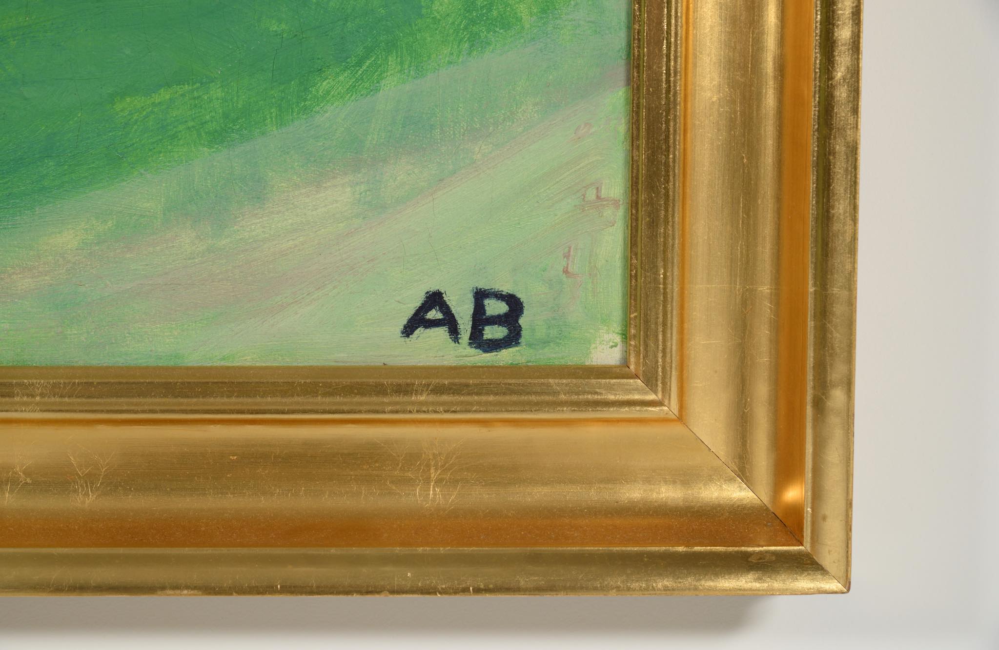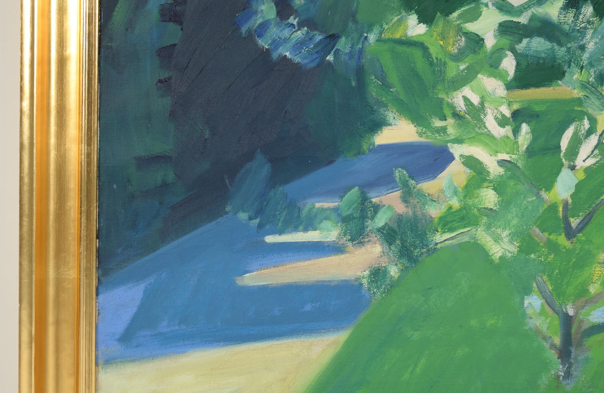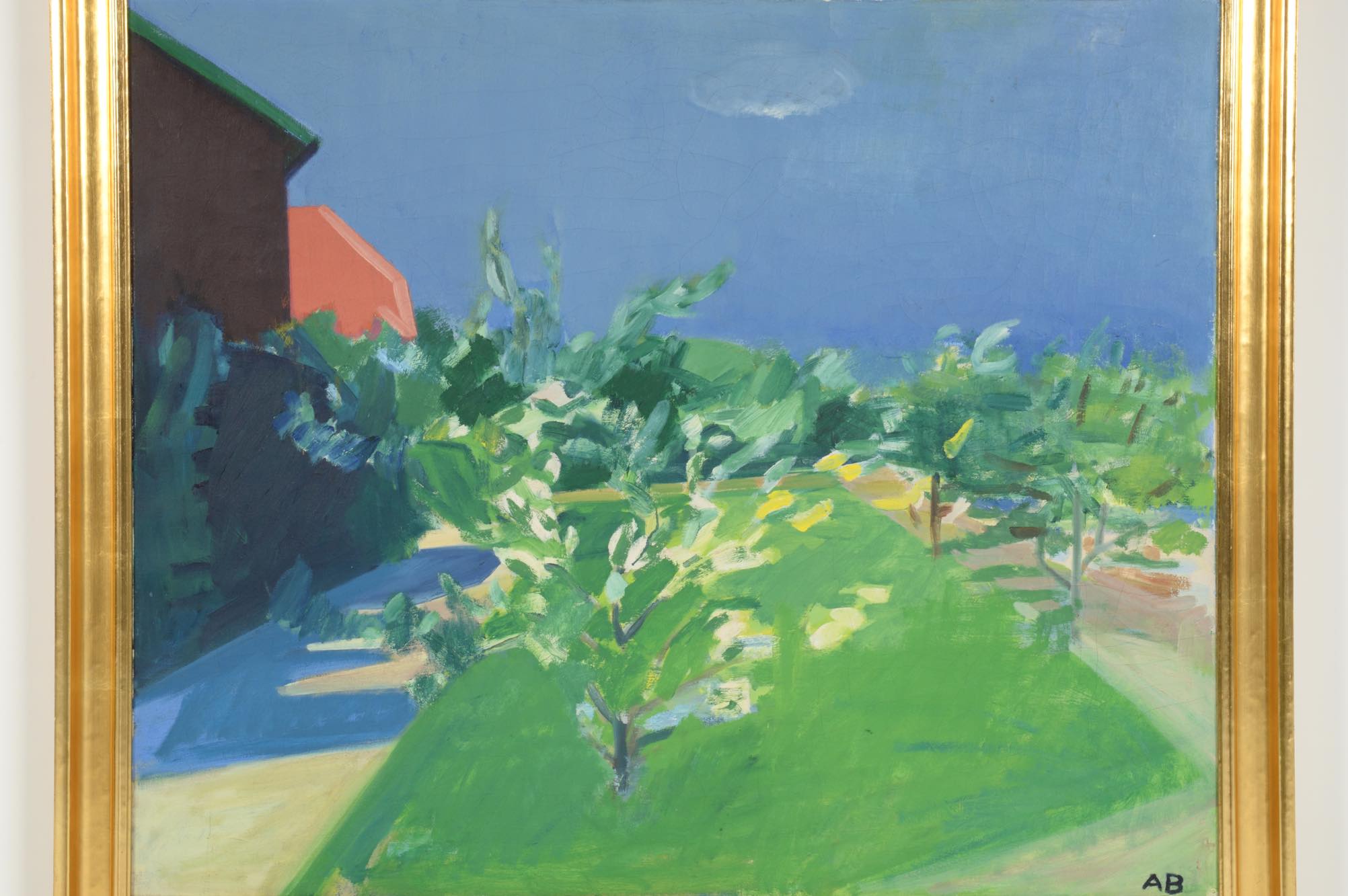 20世紀前葉に活躍したデンマークの芸術家、Axel Bentzen/アクセル・ベンツェンによる風景画油彩作品です。1940年頃に描かれたものでしょう。大振りな作品で、爽やかな中庭の風景が独特のタッチで表現されています。金箔のフレームはオリジナルです。クラックが見られますが、剥落の心配はなく、コンディションは概ね良好です。
