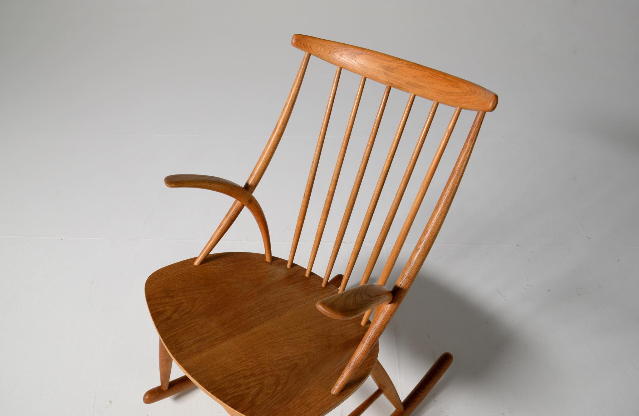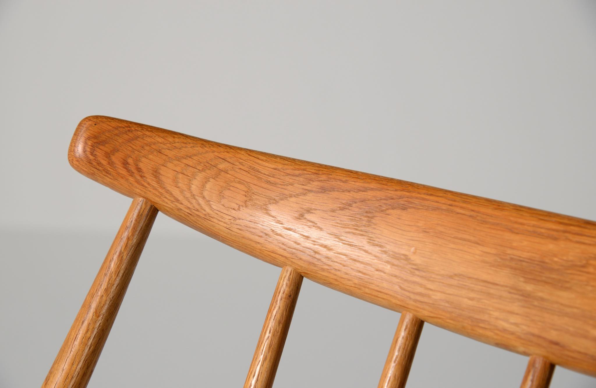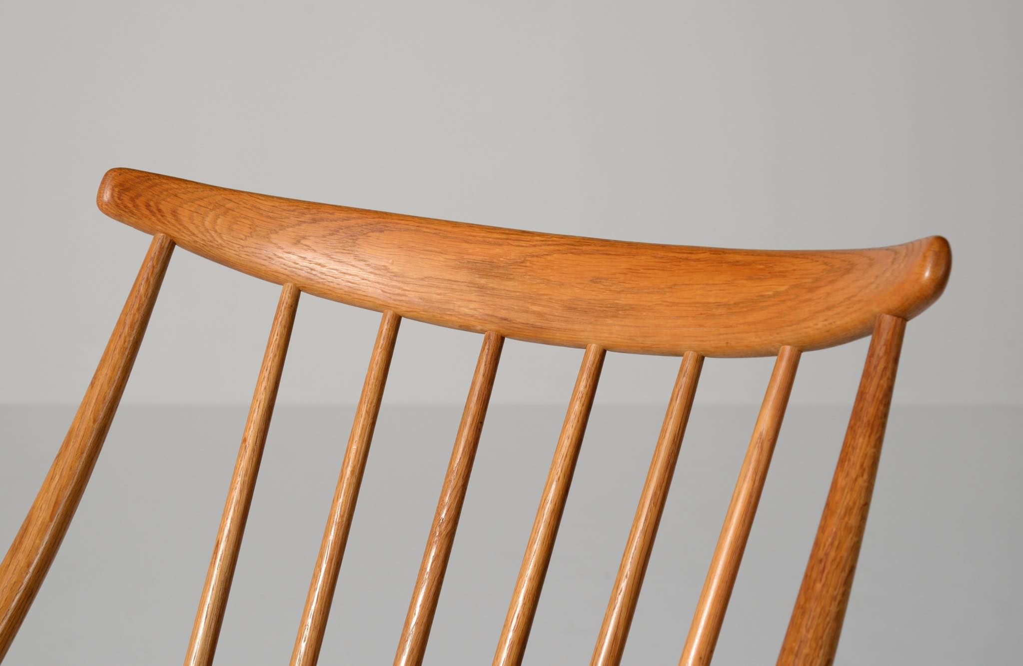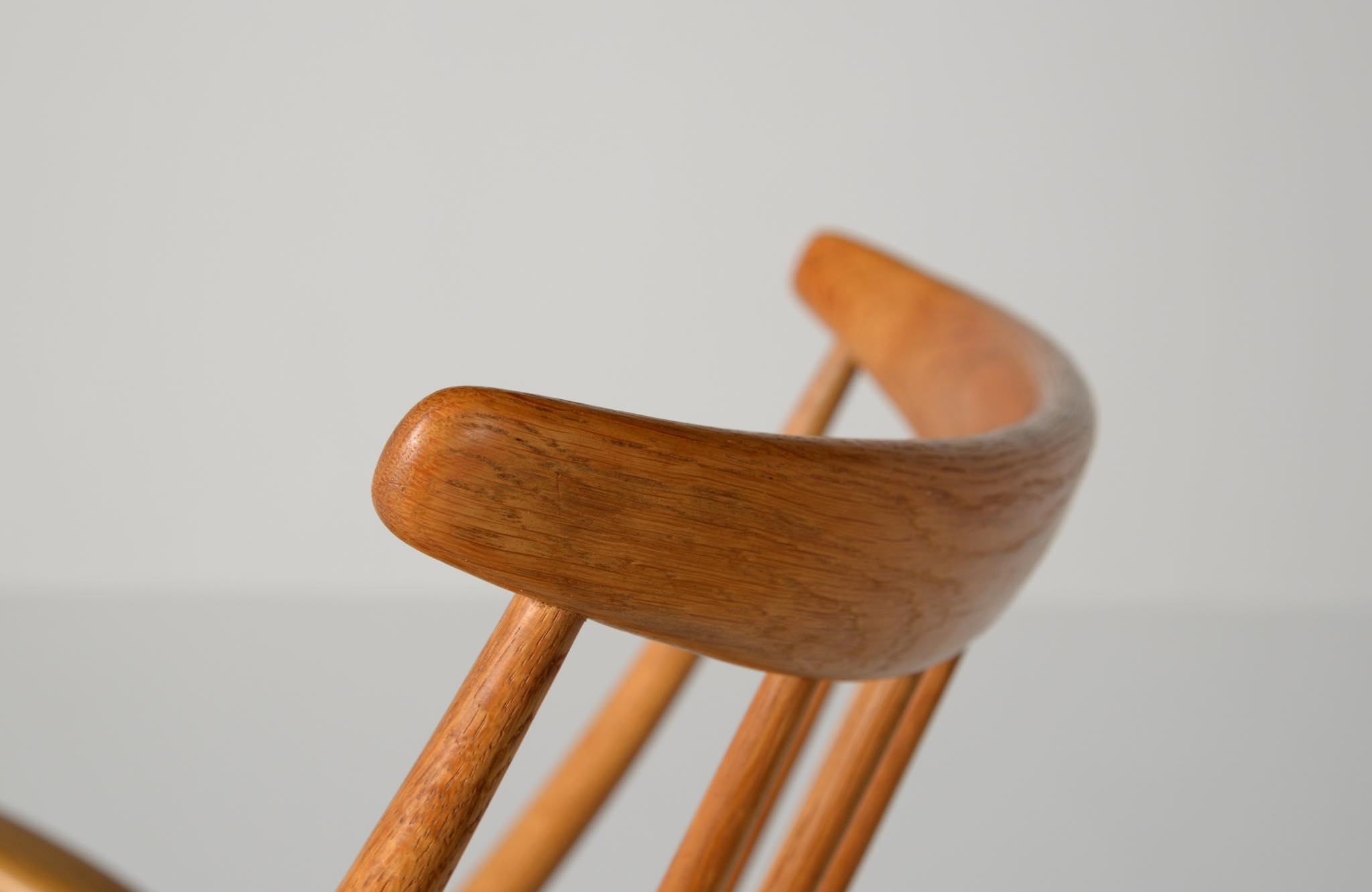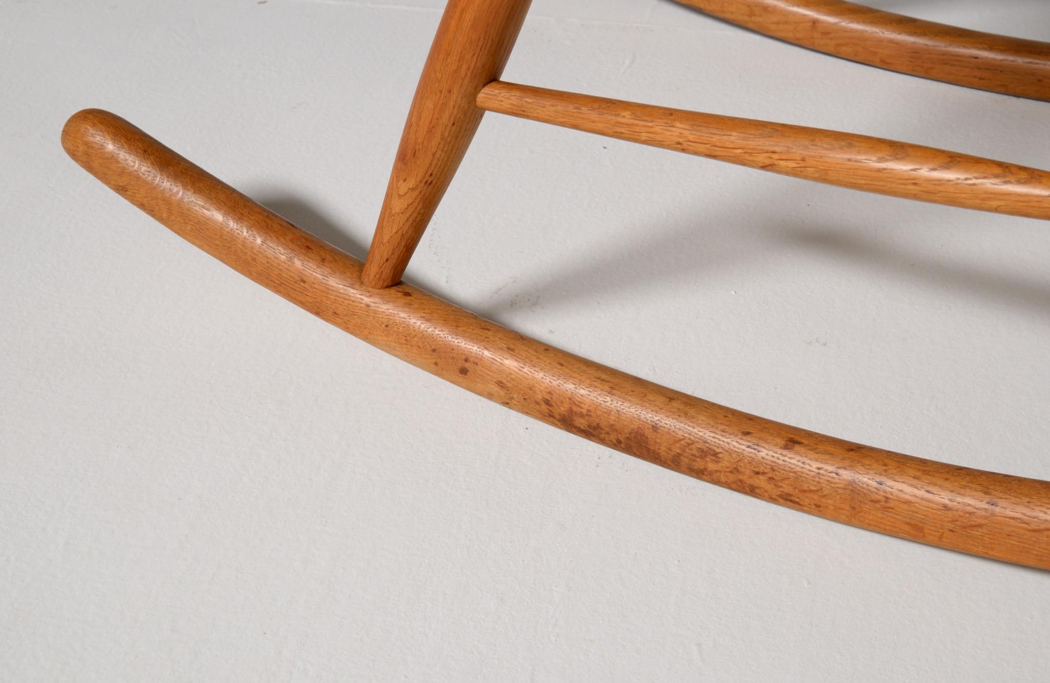 20世紀中葉のデンマークで活躍した、Illum Wikkelsø/イルム・ヴィッケルソーによる1958年発表のロッキングチェア。ユニークなデザインの椅子で、当時人気を博しました。フレームはオイル仕上げのオーク材です。小振りで掛け心地も良く、重量も軽めです。脚部に染みが見られますが、綺麗な状態です。