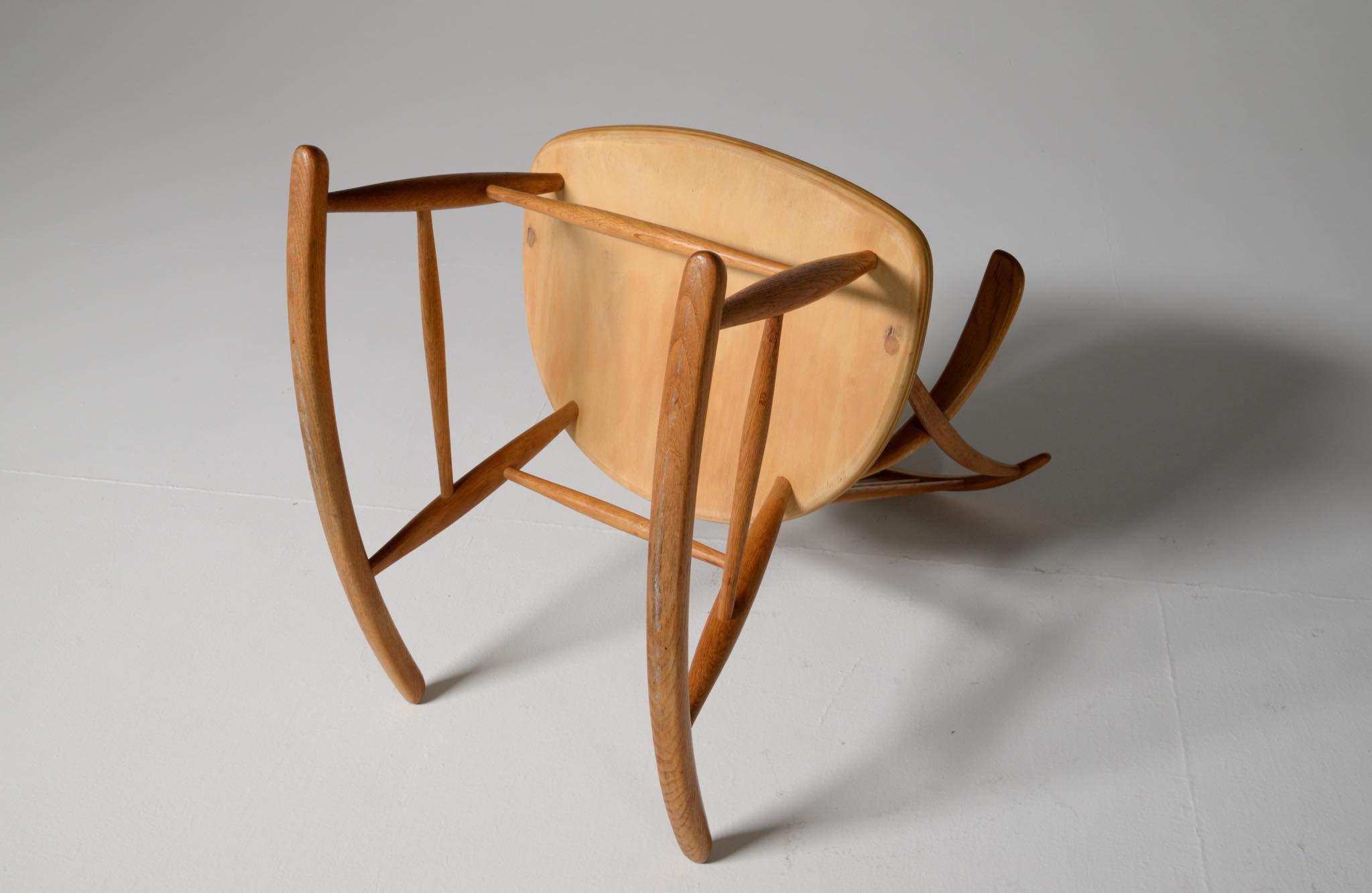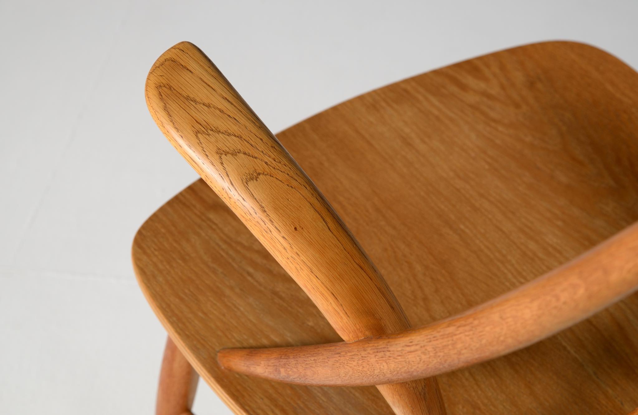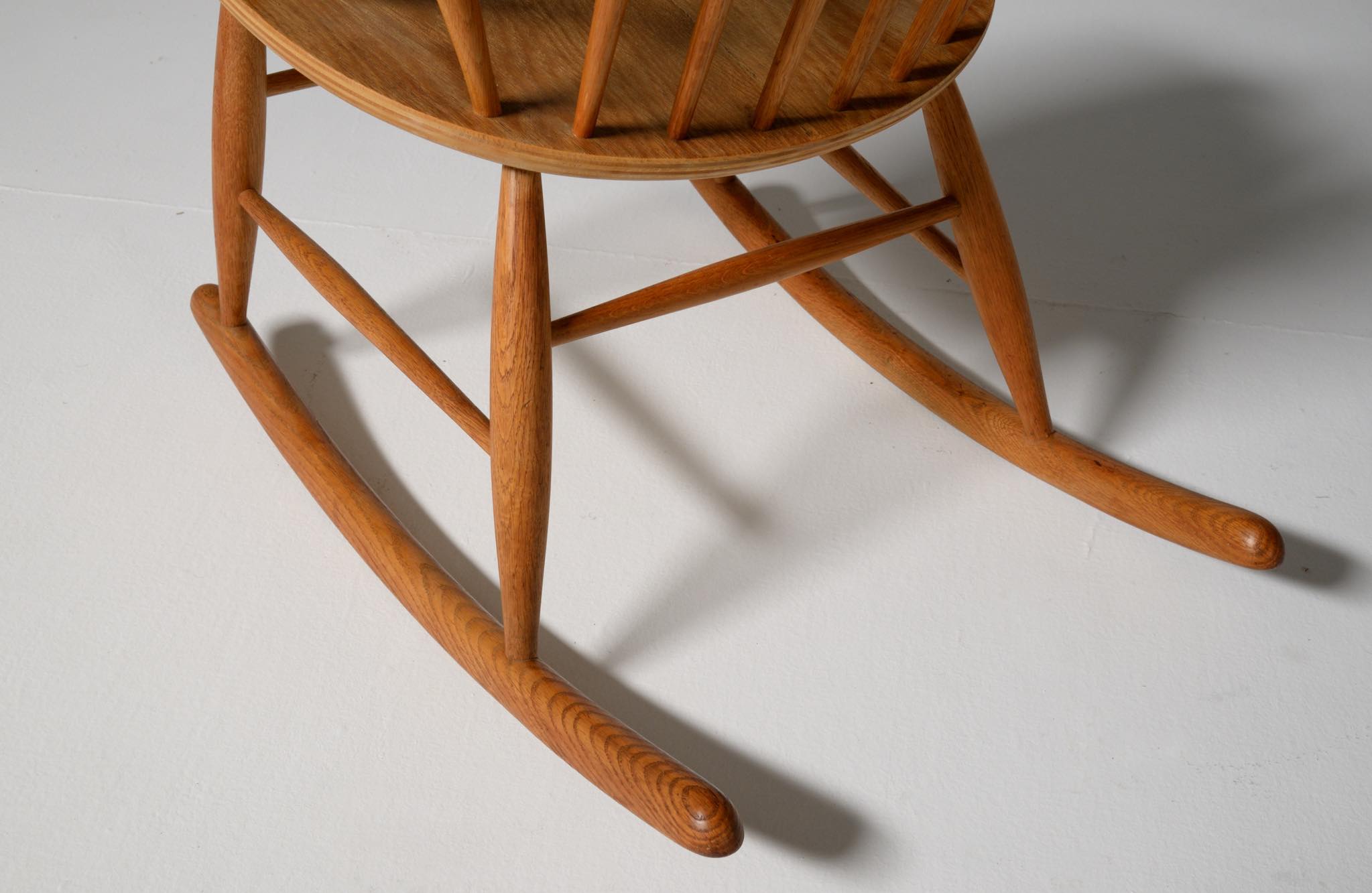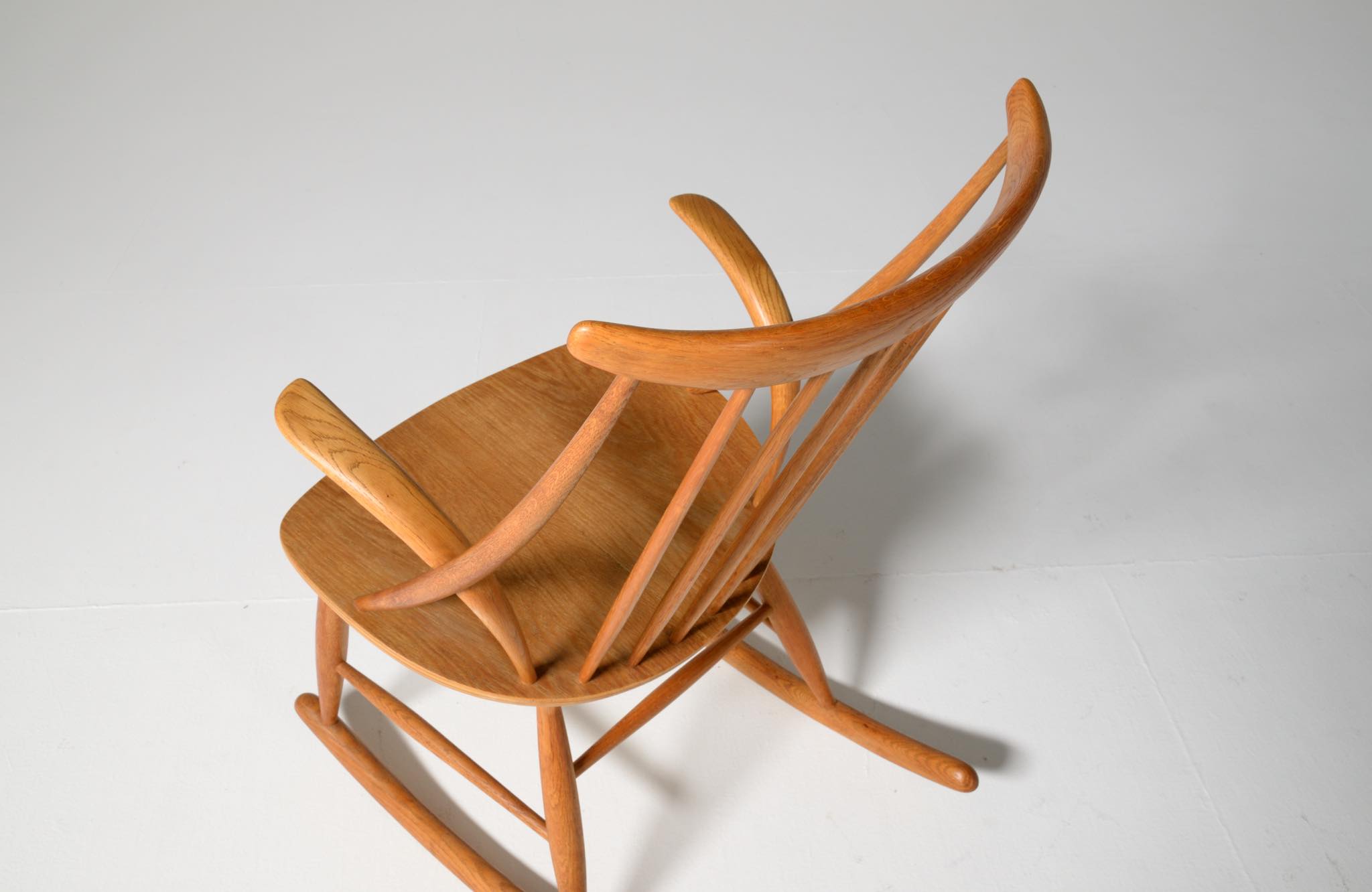 20世紀中葉のデンマークで活躍した、Illum Wikkelsø/イルム・ヴィッケルソーによる1958年発表のロッキングチェア。ユニークなデザインの椅子で、当時人気を博しました。フレームはオイル仕上げのオーク材です。小振りで掛け心地も良く、重量も軽めです。脚部に染みが見られますが、綺麗な状態です。