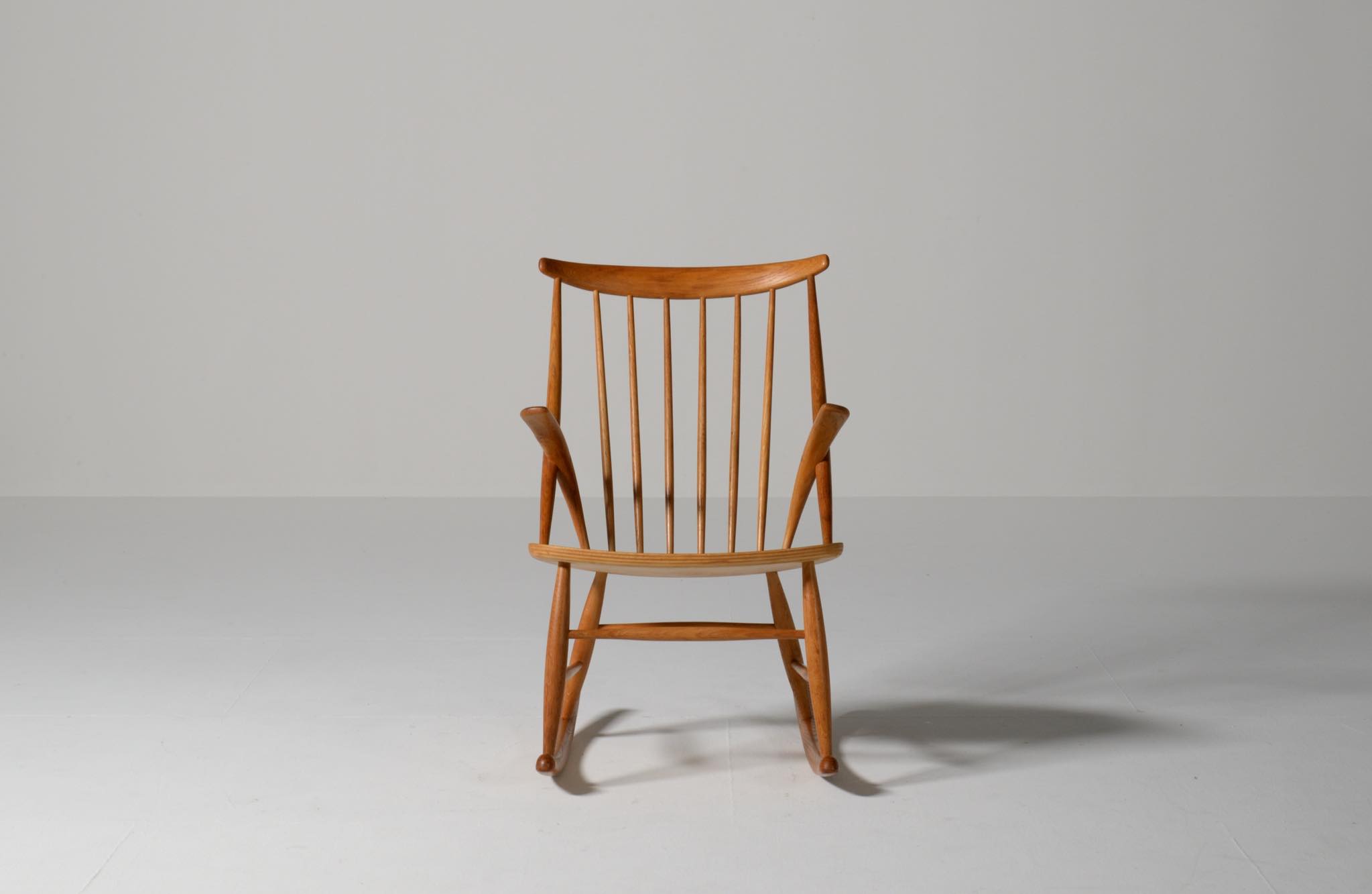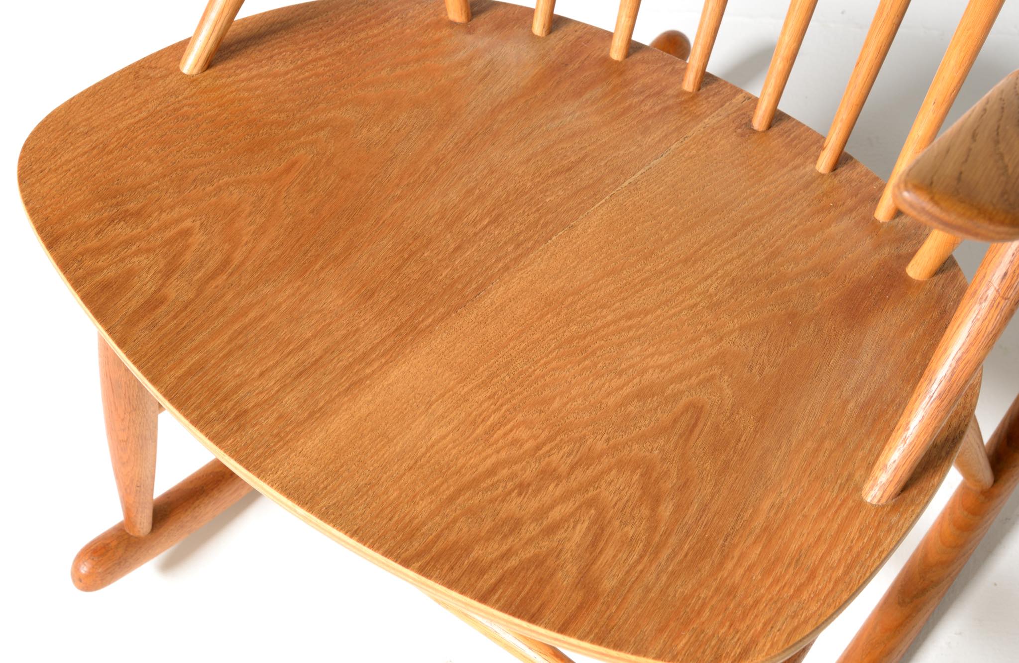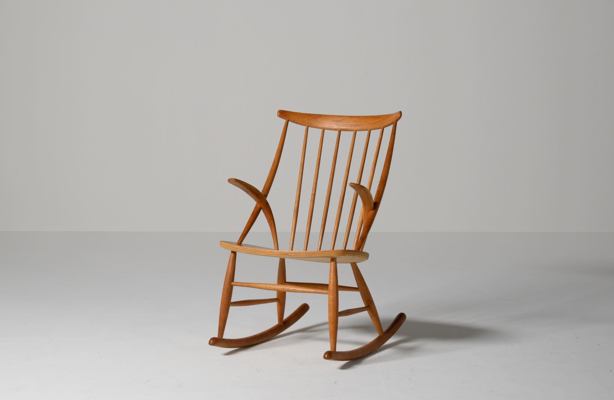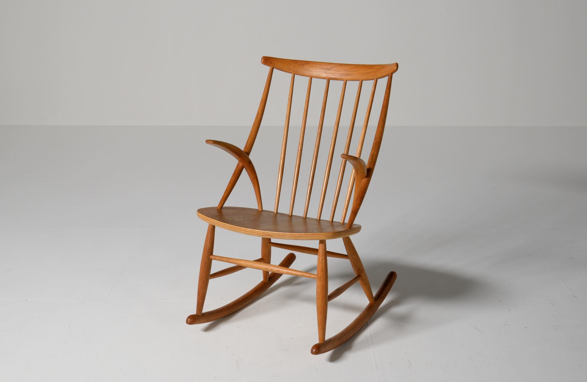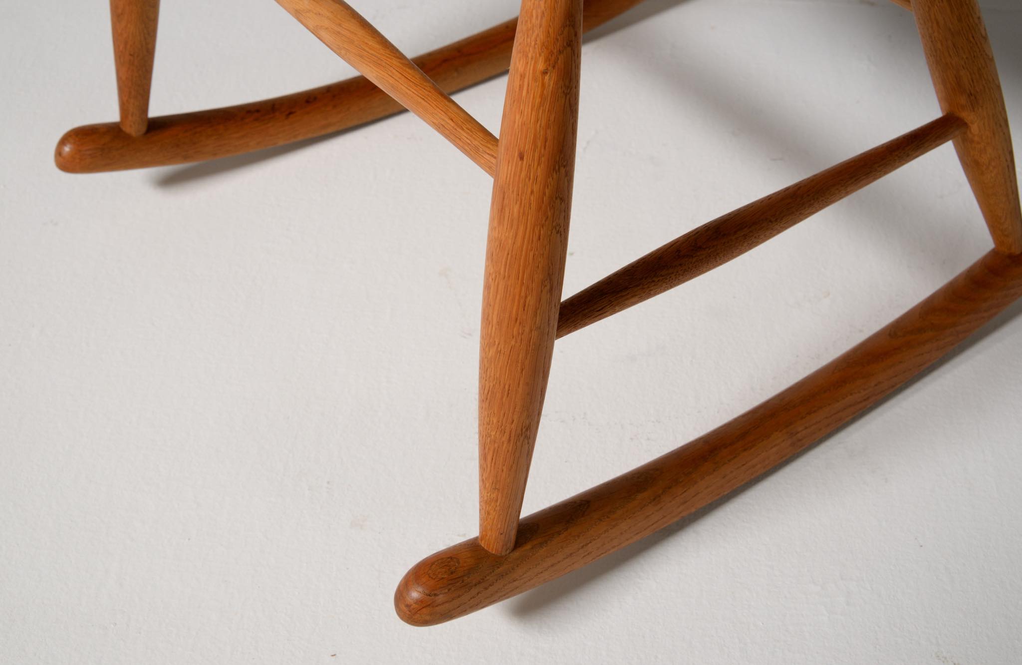 20世紀中葉のデンマークで活躍した、Illum Wikkelsø/イルム・ヴィッケルソーによる1958年発表のロッキングチェア。ユニークなデザインの椅子で、当時人気を博しました。フレームはオイル仕上げのオーク材です。小振りで掛け心地も良く、重量も軽めです。脚部に染みが見られますが、綺麗な状態です。