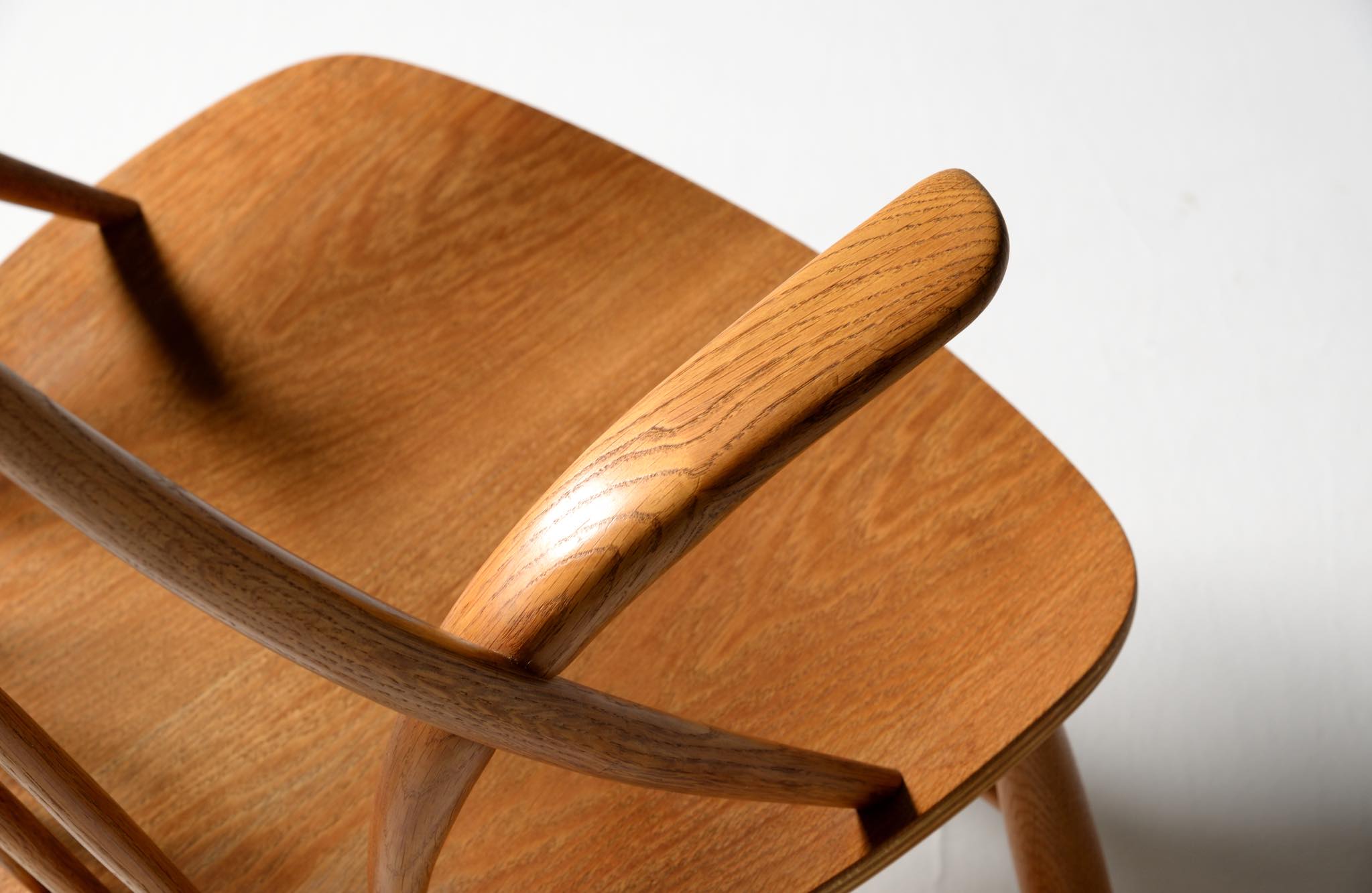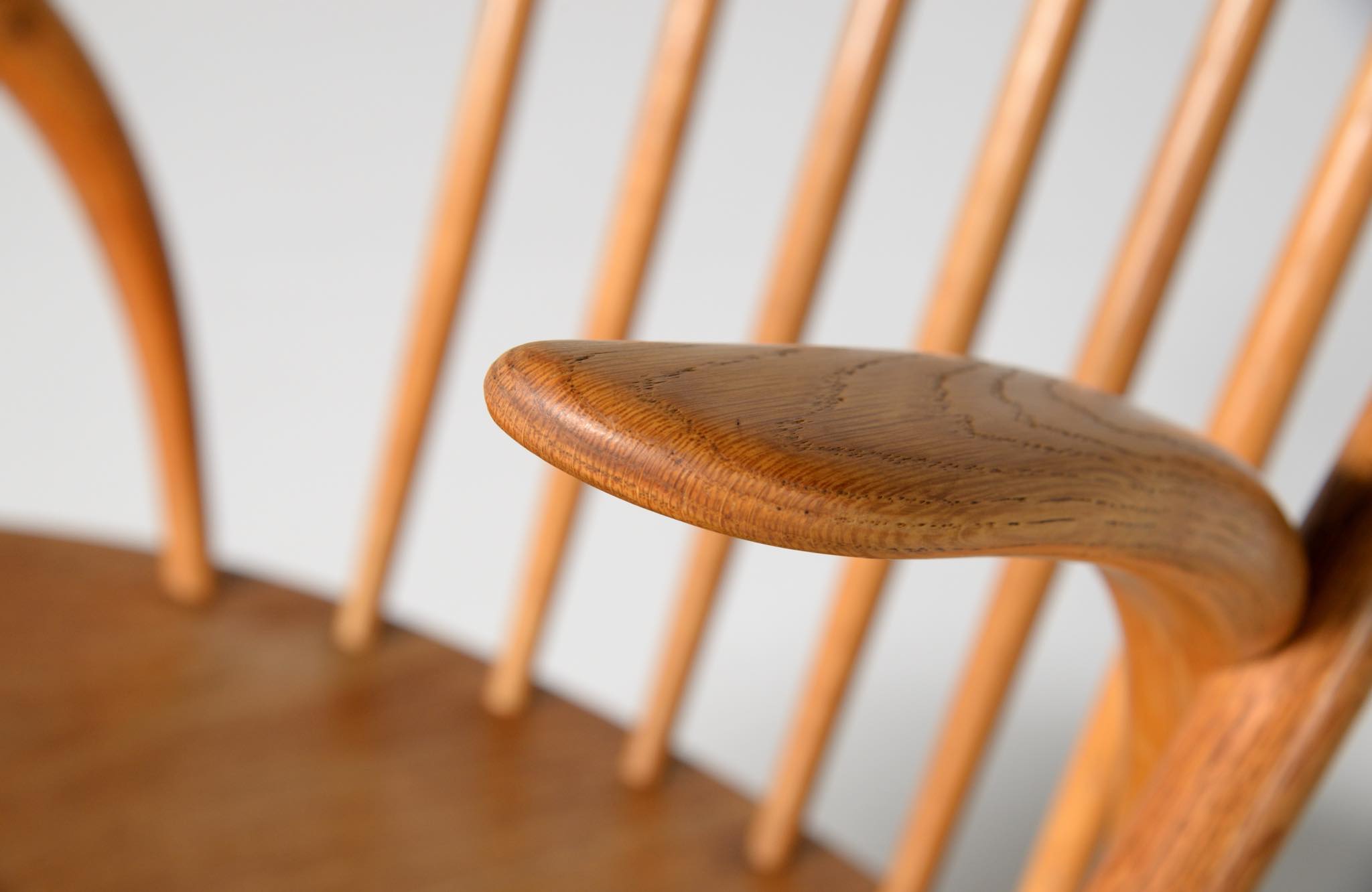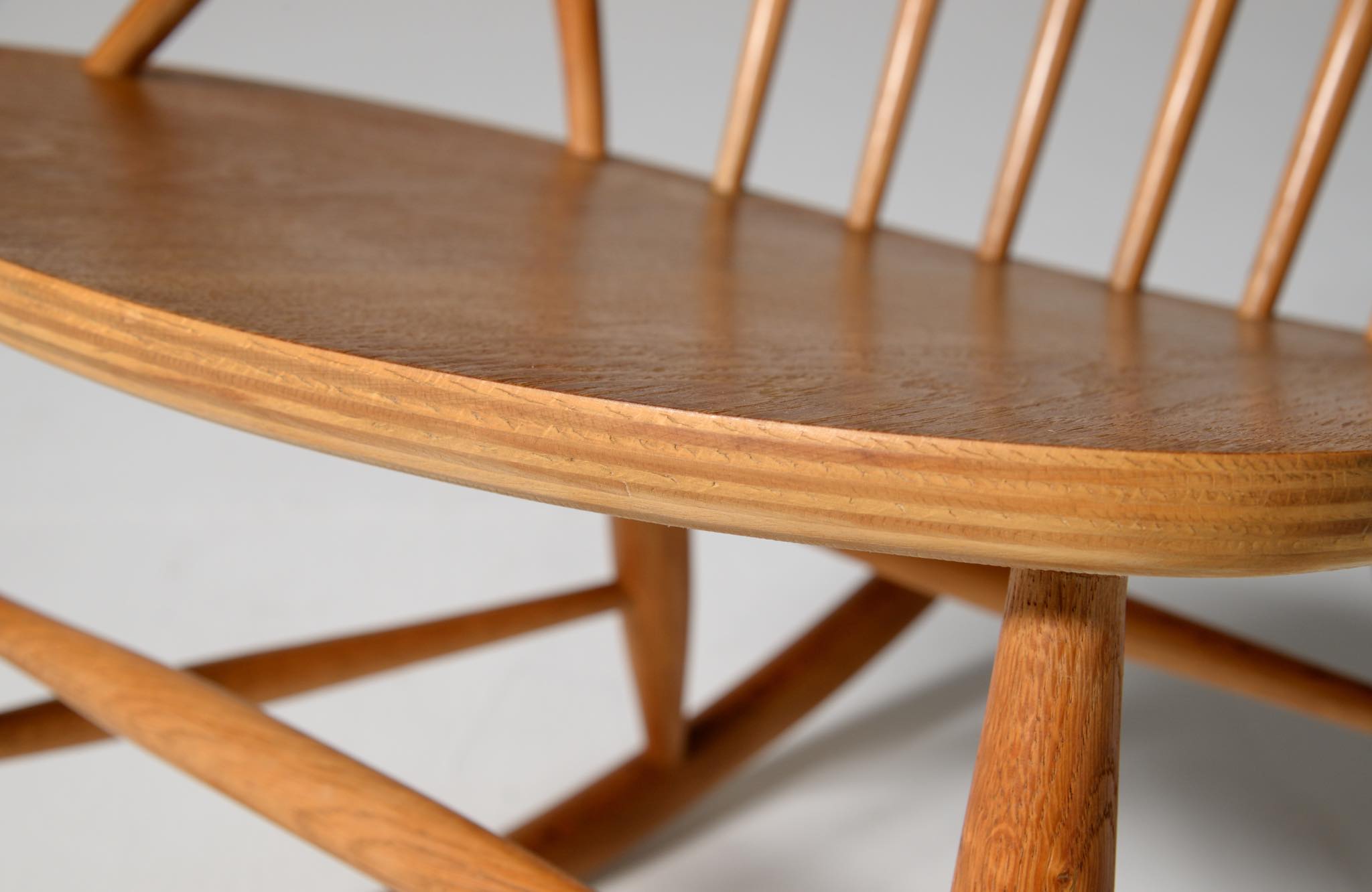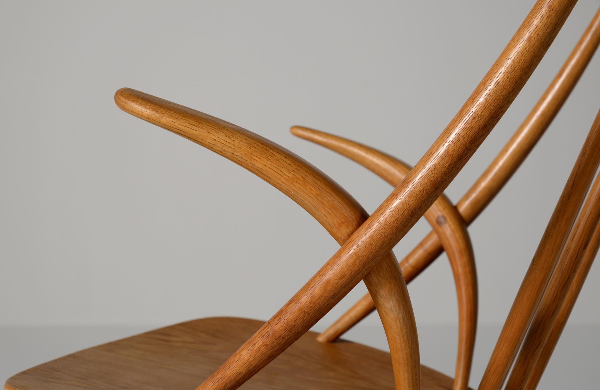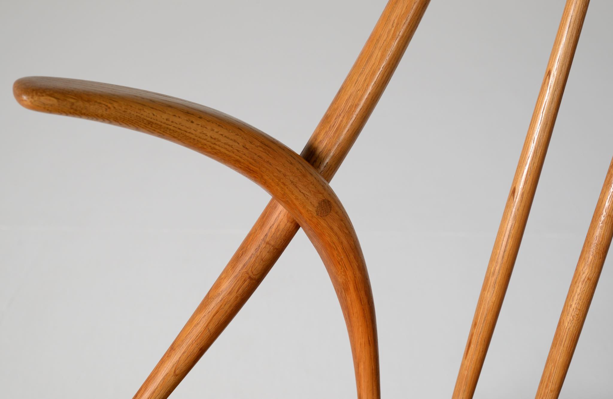 20世紀中葉のデンマークで活躍した、Illum Wikkelsø/イルム・ヴィッケルソーによる1958年発表のロッキングチェア。ユニークなデザインの椅子で、当時人気を博しました。フレームはオイル仕上げのオーク材です。小振りで掛け心地も良く、重量も軽めです。脚部に染みが見られますが、綺麗な状態です。
