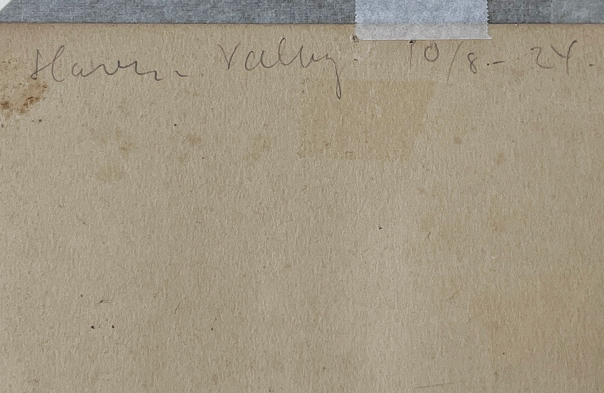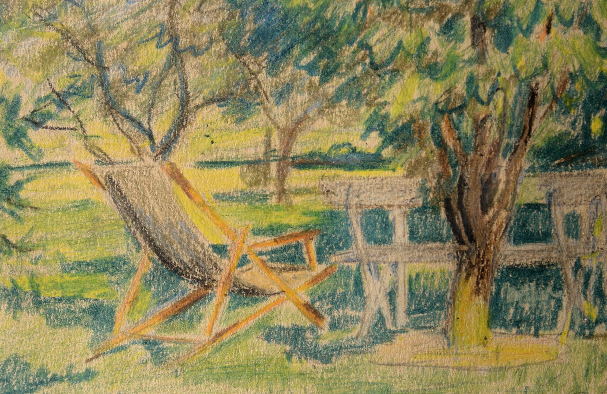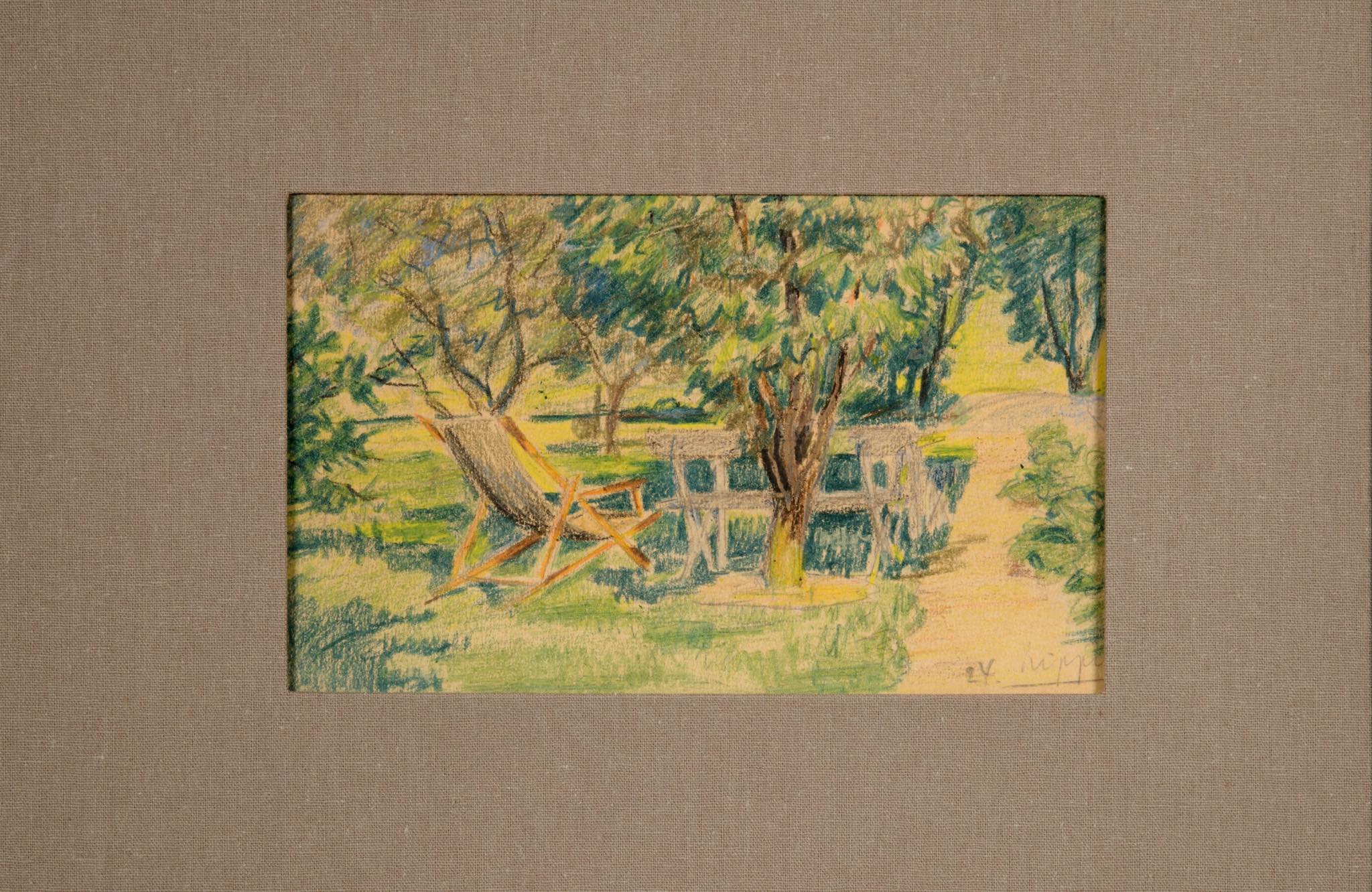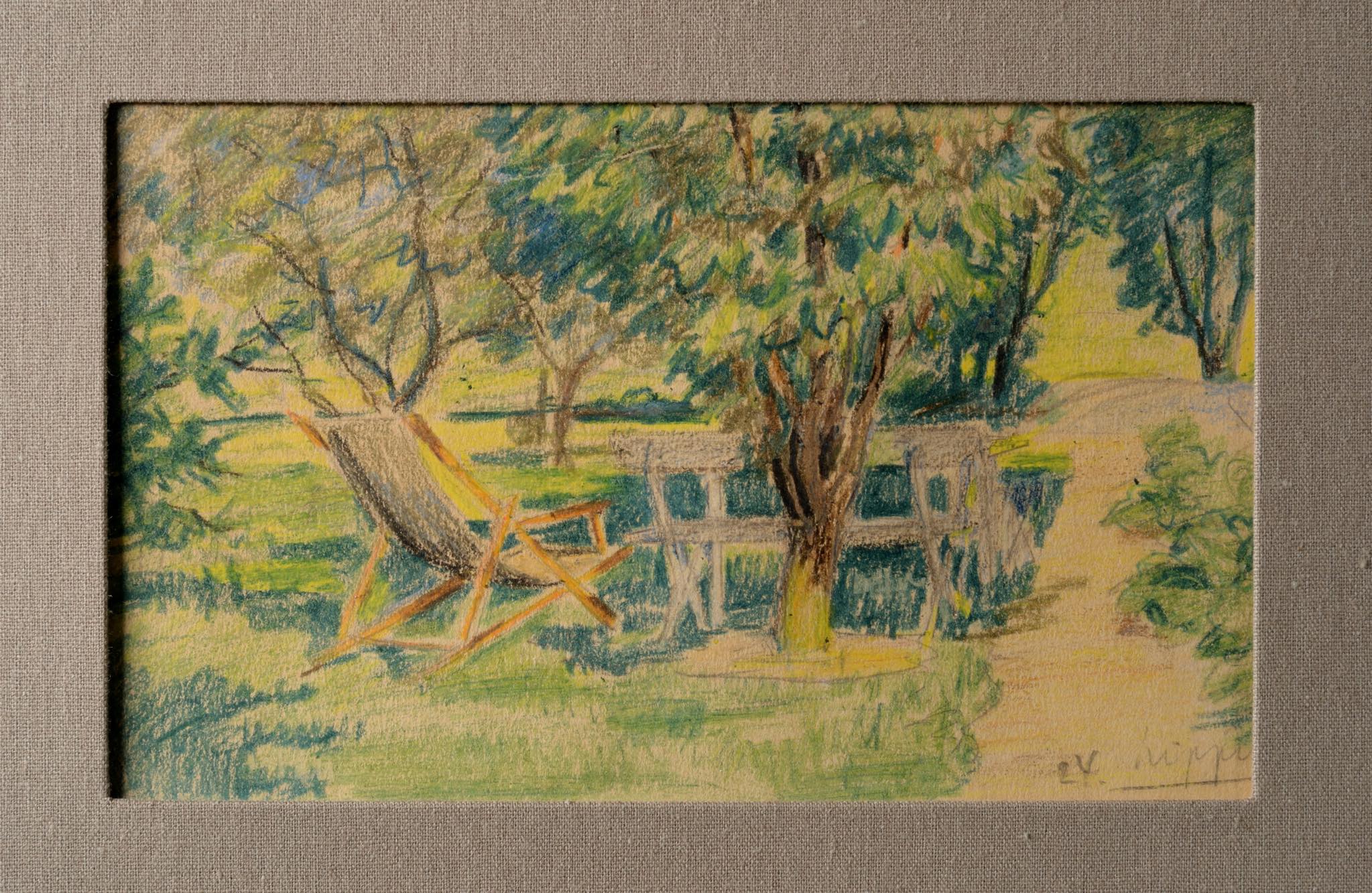 19世紀生まれのデンマークの画家、Aage Lippert/オーゲ・リパートによるパステル画、1924年8月10日に描かれたものです。コペンハーゲンの Griffenfeldsgade 31に住んでいた頃の初期作品で、住居の隣の公園 ”Folkets Park” の風景か、あるいは裏書きにある”Valby”の緑地を描いたものと思われます。フレームとガラスはオリジナルで、布被せのダブルマットはこちらで整えました。コンディションは良好です。