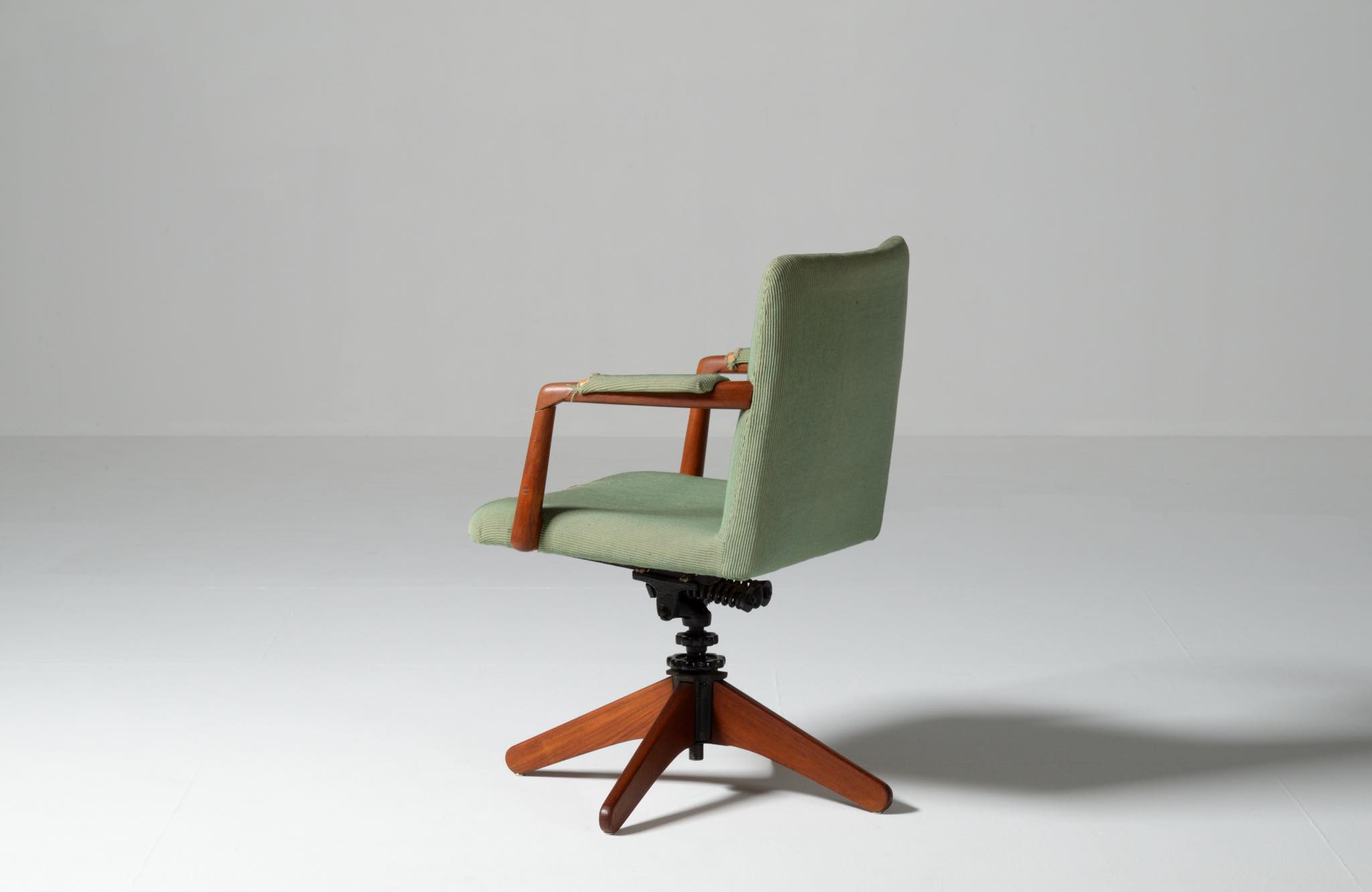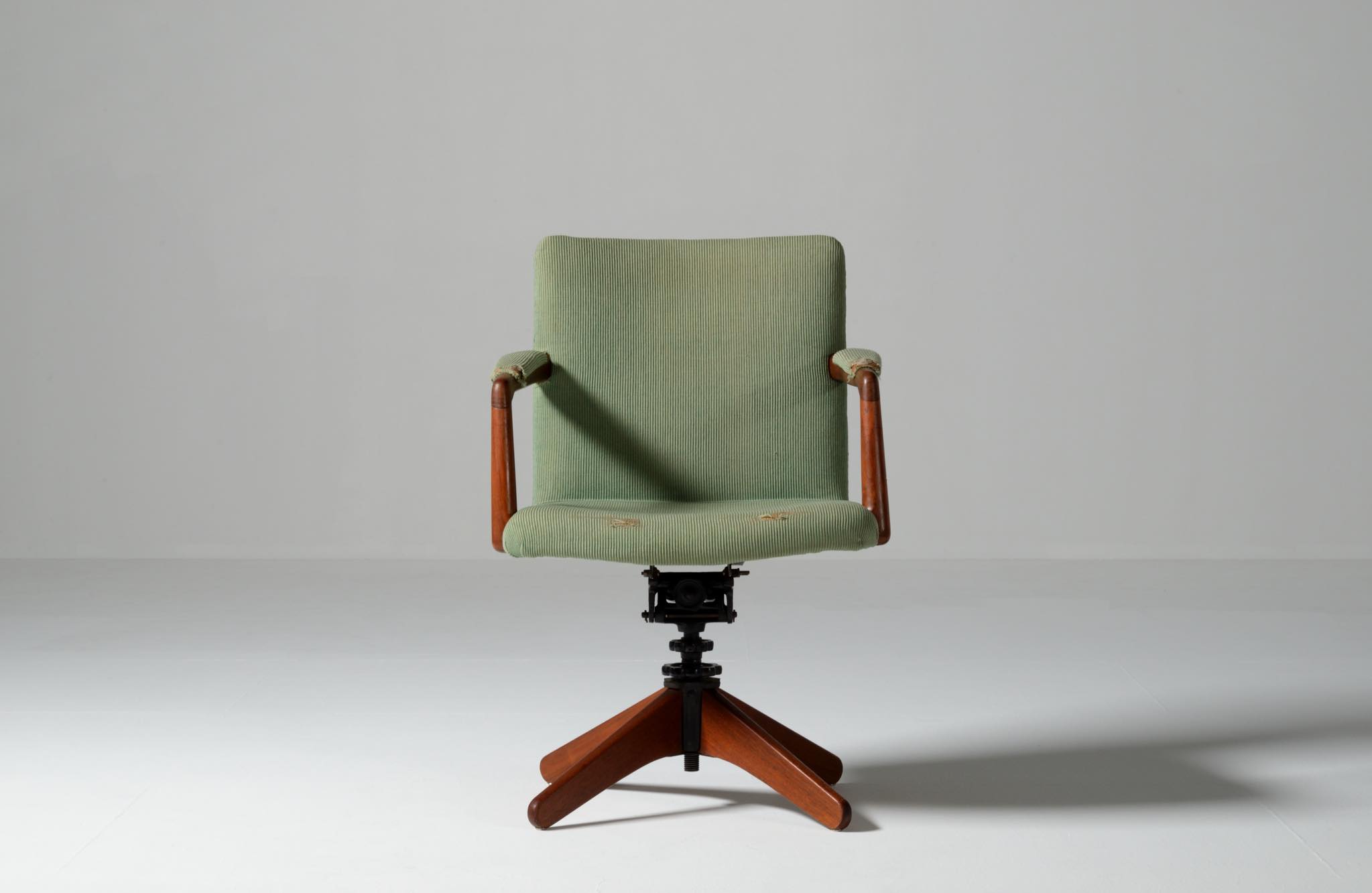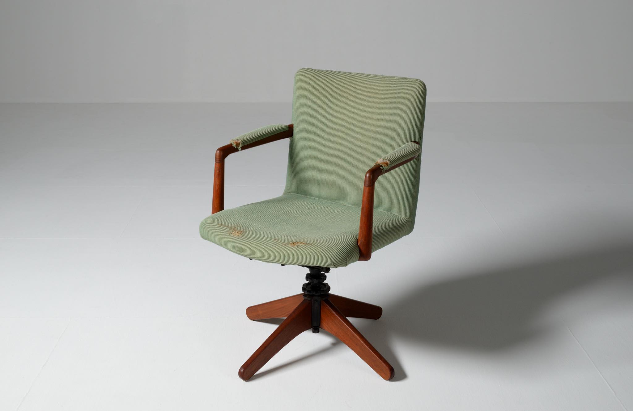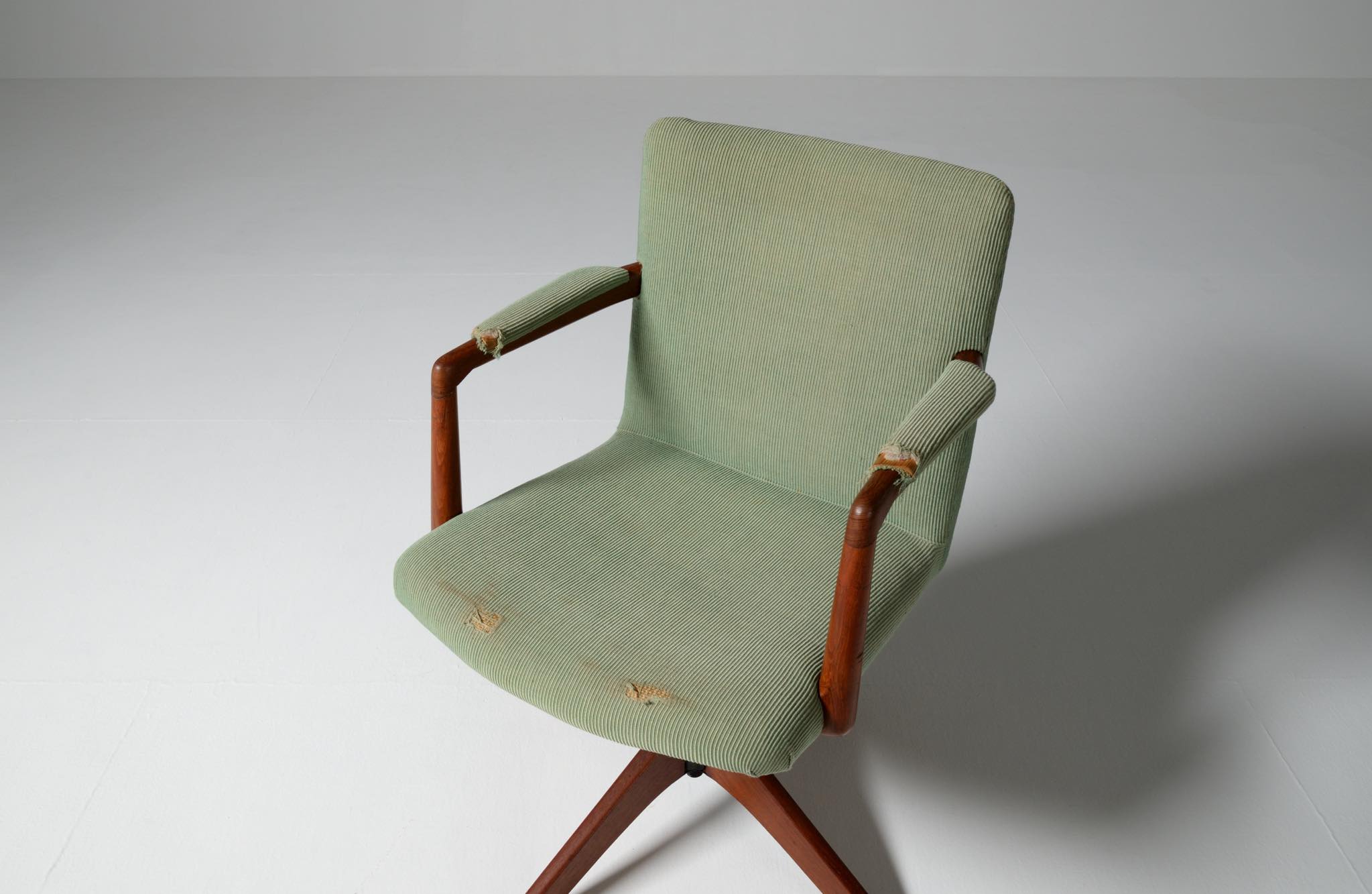 デンマークを代表する家具デザイナーの Hans J. Wegner/ハンス・ウェグナーによるワーキング用のデスクチェアです。オーフス時代にプランモブラー社と協働されたもので、オーフス市庁舎か、あるいは、オーフスのユトランド電話会社のために設計されたモデルと思われます。支柱部分にリクライニング機能を備えており、座籠がそっくり後方へ傾きます。ファブリックはおそらくオリジナルと思われ、歴史的価値を踏まえ、敢えてそのままの状態としておりますが、張り替えも承ります。中材は自然素材(椰子の繊維や綿)が用いられており、硬めの座り心地です。両アームに古い補修があります。