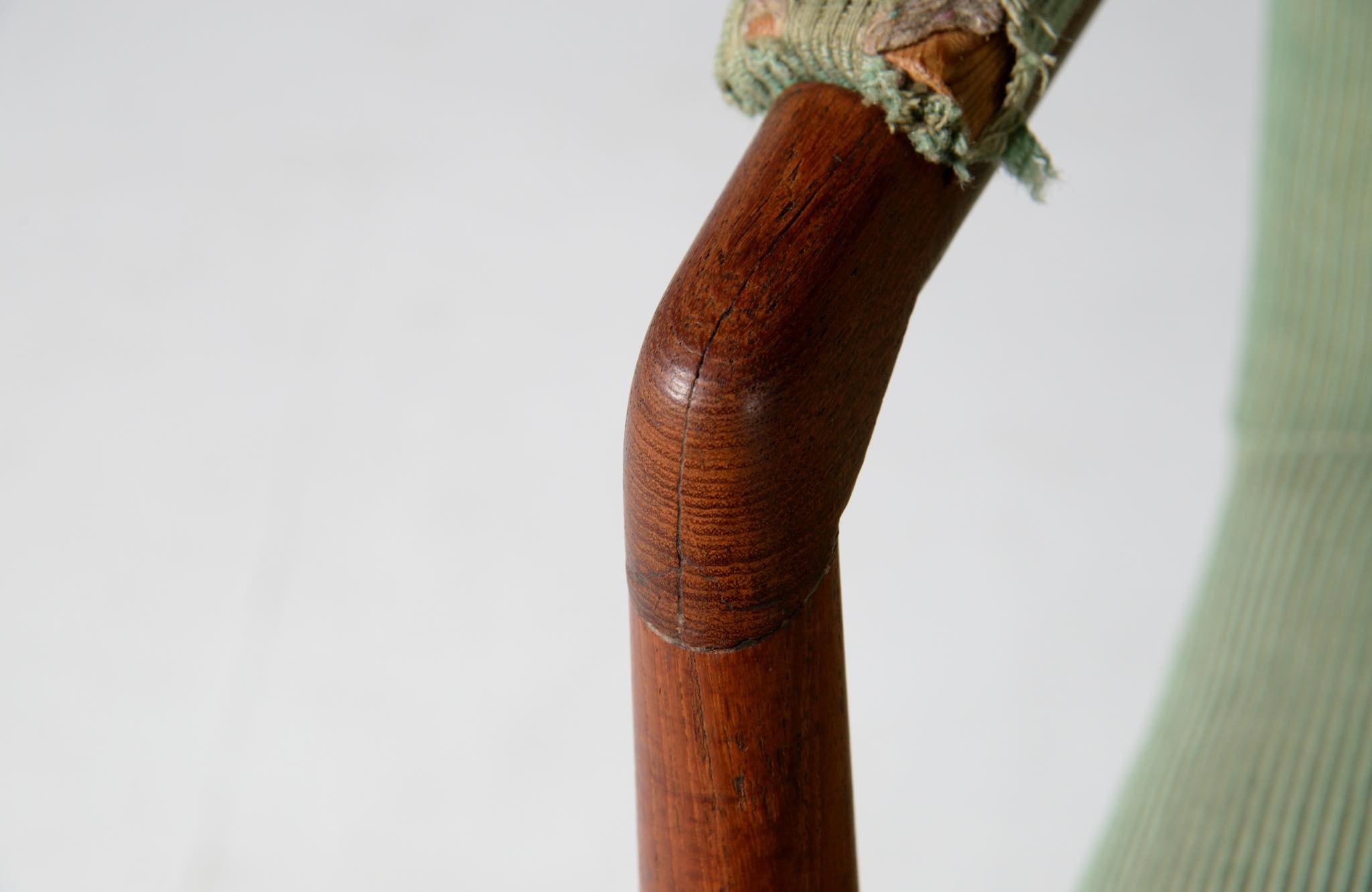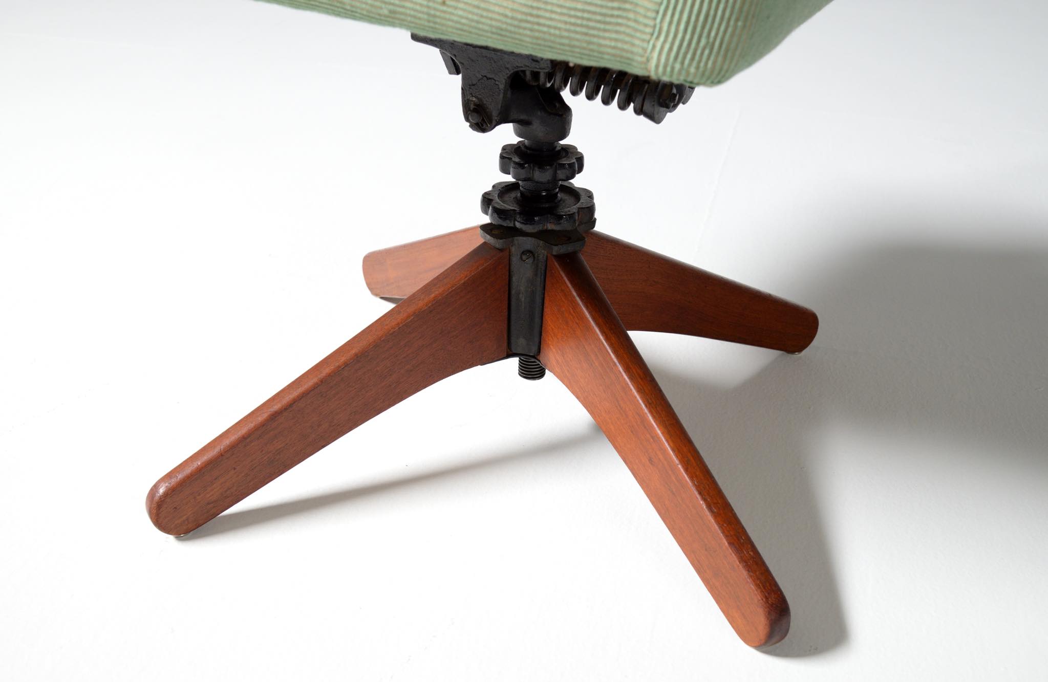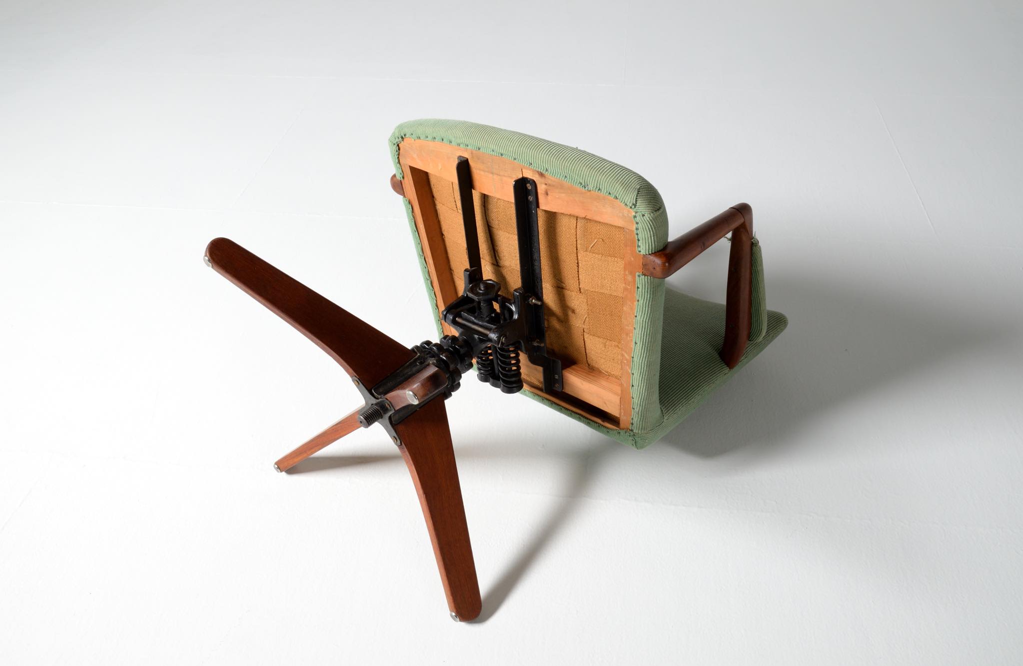 デンマークを代表する家具デザイナーの Hans J. Wegner/ハンス・ウェグナーによるワーキング用のデスクチェアです。オーフス時代にプランモブラー社と協働されたもので、オーフス市庁舎か、あるいは、オーフスのユトランド電話会社のために設計されたモデルと思われます。支柱部分にリクライニング機能を備えており、座籠がそっくり後方へ傾きます。ファブリックはおそらくオリジナルと思われ、歴史的価値を踏まえ、敢えてそのままの状態としておりますが、張り替えも承ります。中材は自然素材(椰子の繊維や綿)が用いられており、硬めの座り心地です。両アームに古い補修があります。