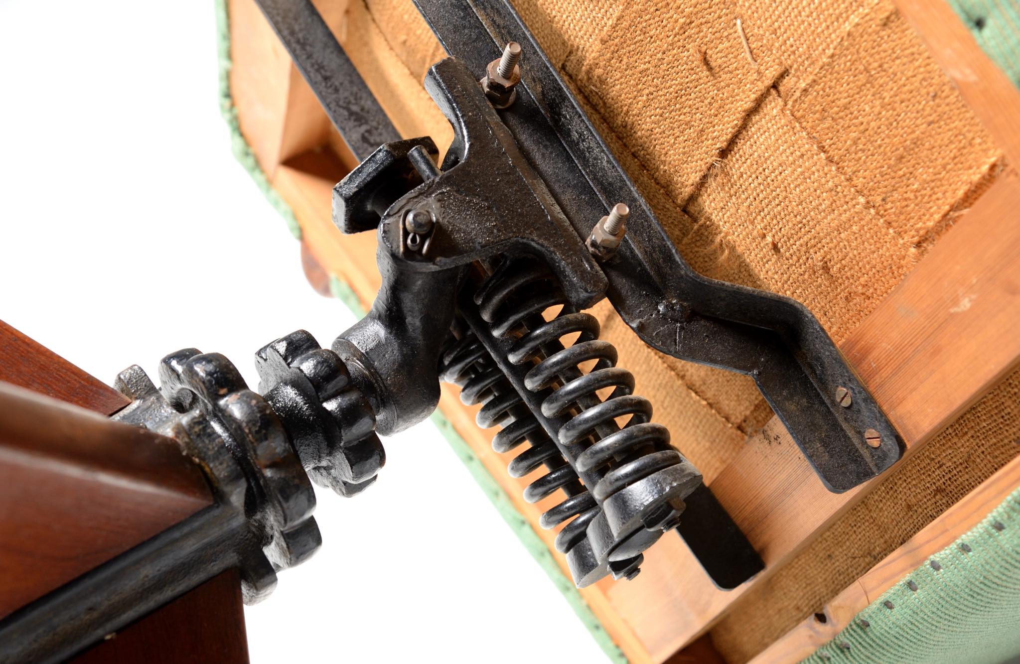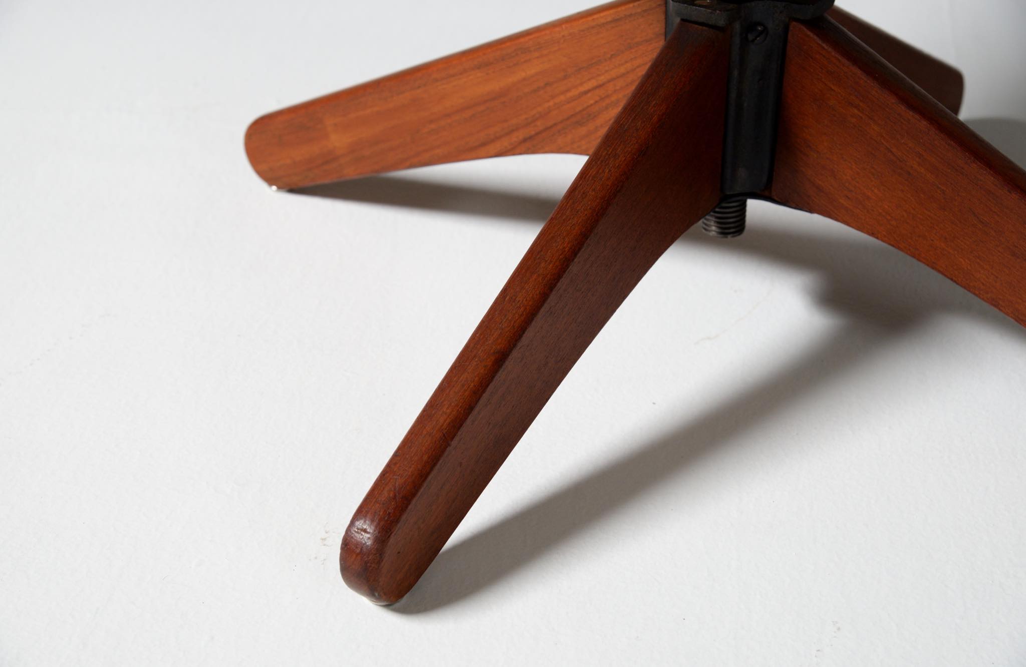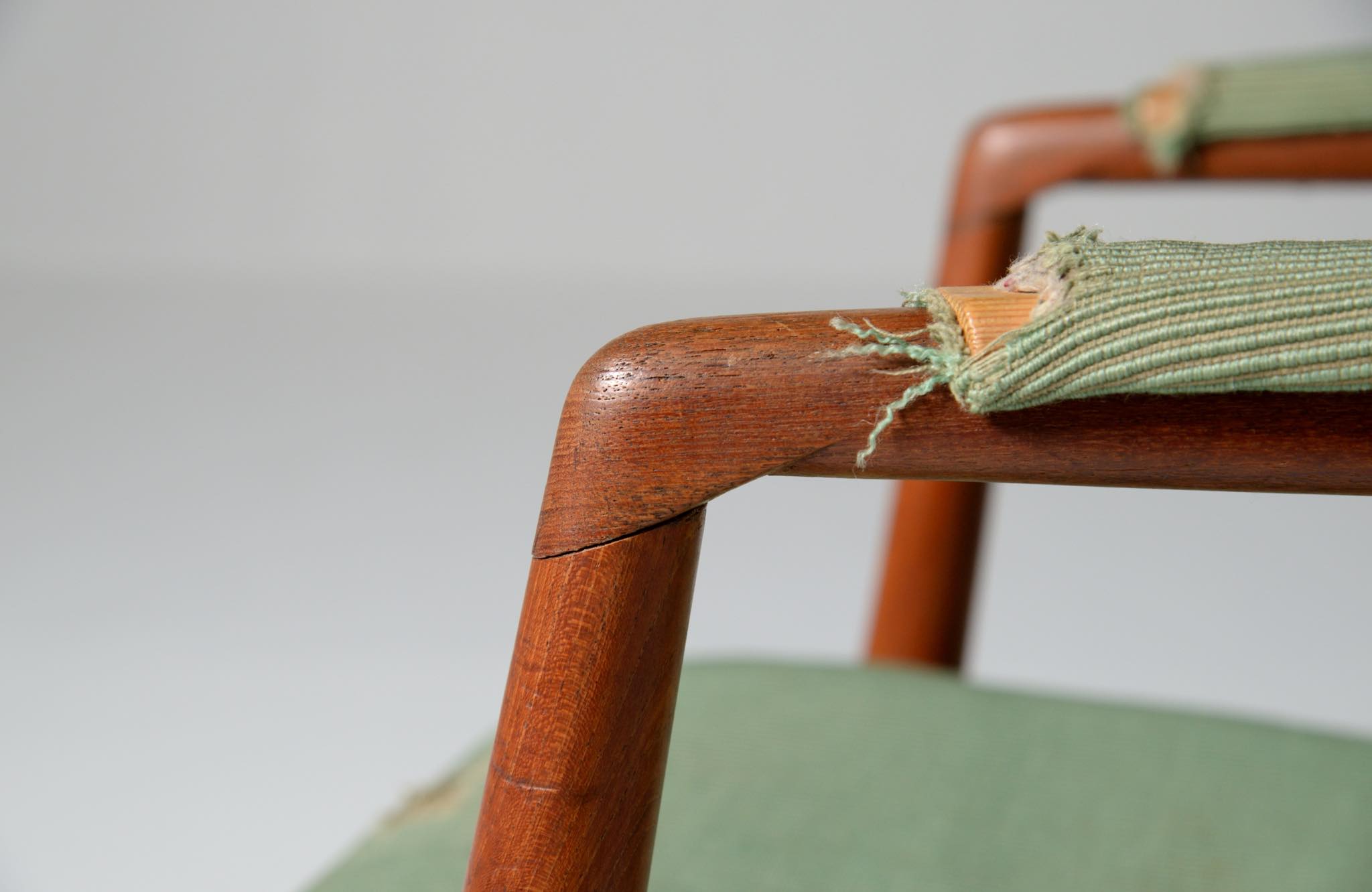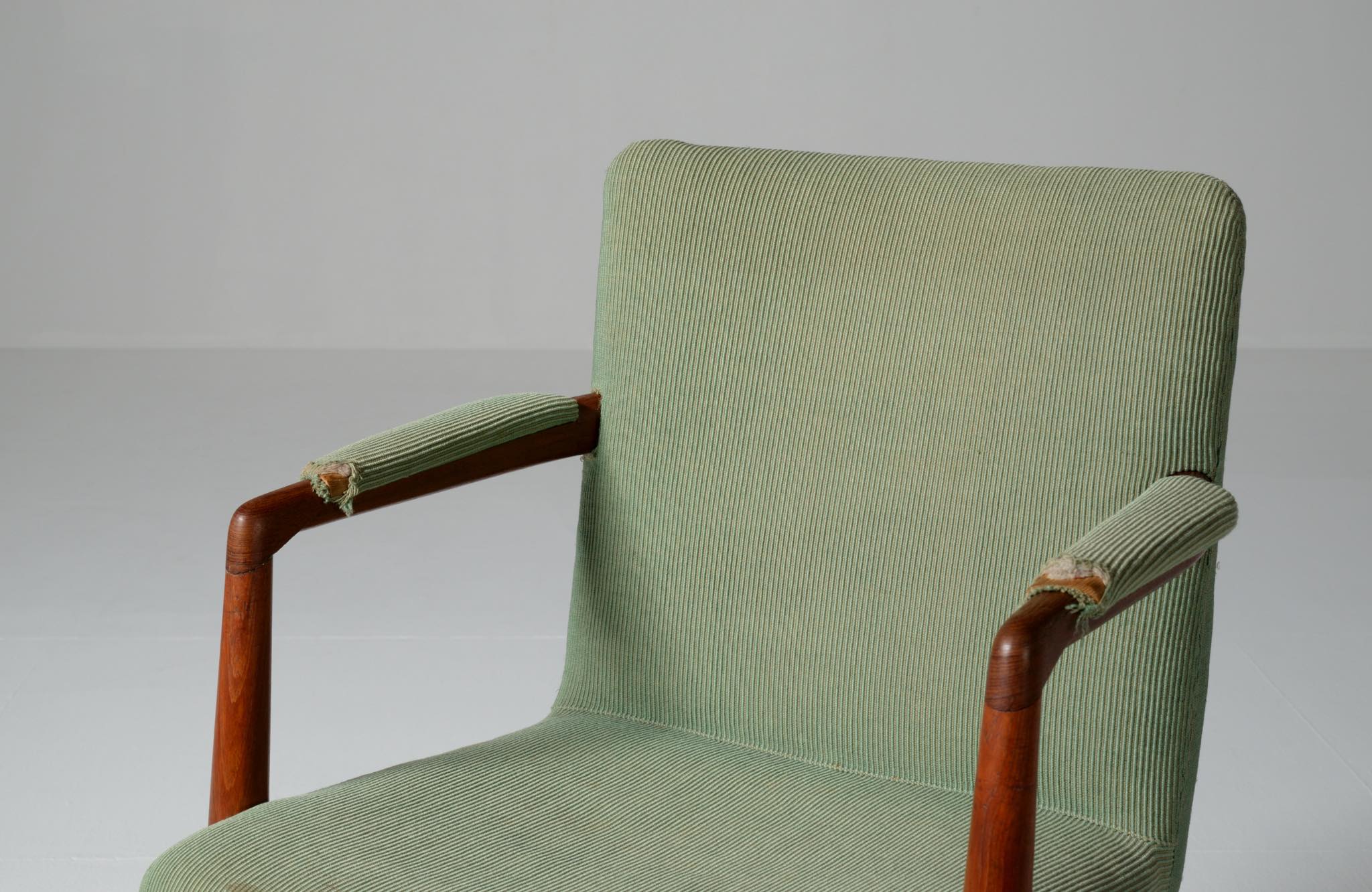 デンマークを代表する家具デザイナーの Hans J. Wegner/ハンス・ウェグナーによるワーキング用のデスクチェアです。オーフス時代にプランモブラー社と協働されたもので、オーフス市庁舎か、あるいは、オーフスのユトランド電話会社のために設計されたモデルと思われます。支柱部分にリクライニング機能を備えており、座籠がそっくり後方へ傾きます。ファブリックはおそらくオリジナルと思われ、歴史的価値を踏まえ、敢えてそのままの状態としておりますが、張り替えも承ります。中材は自然素材(椰子の繊維や綿)が用いられており、硬めの座り心地です。両アームに古い補修があります。