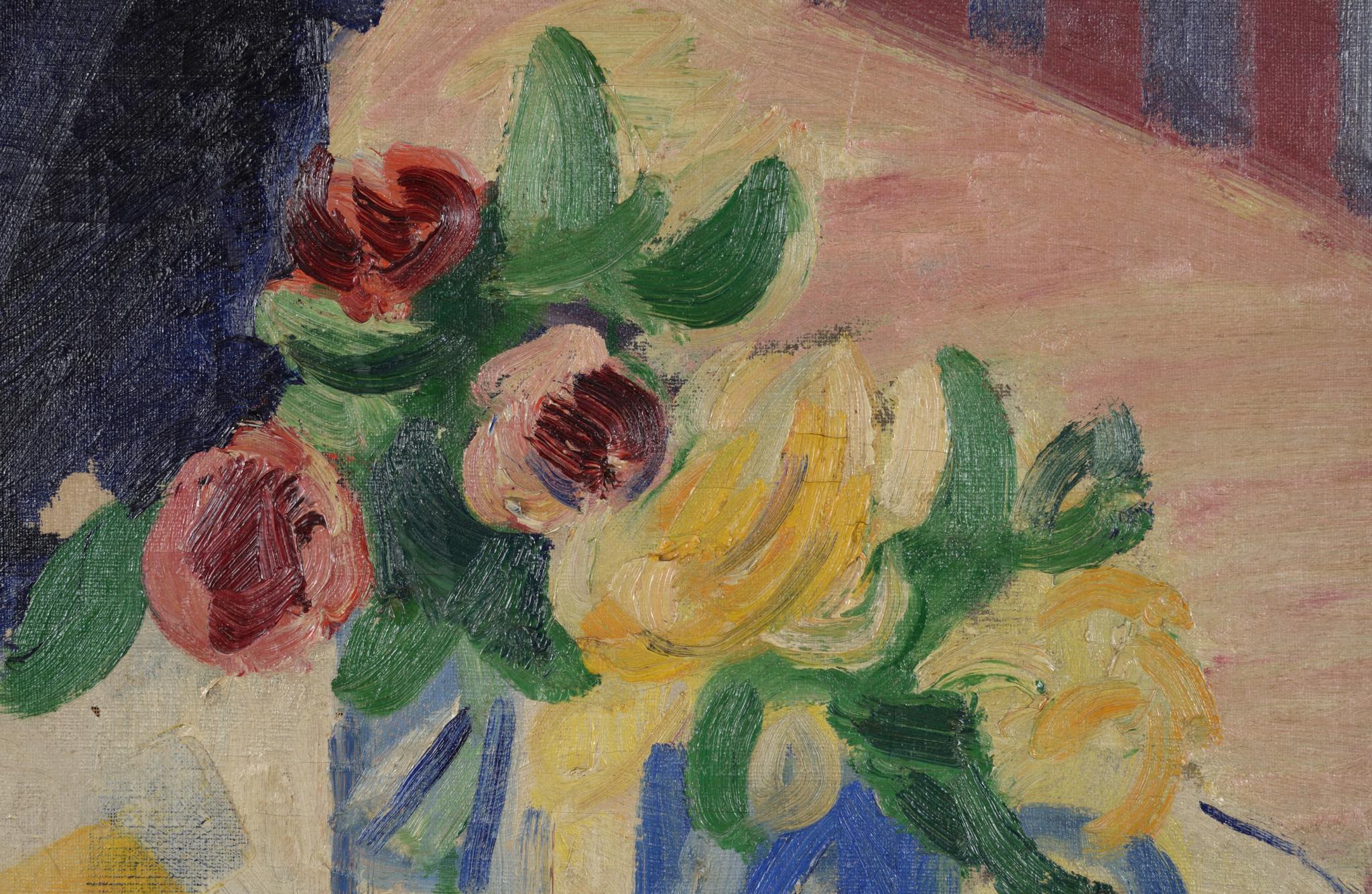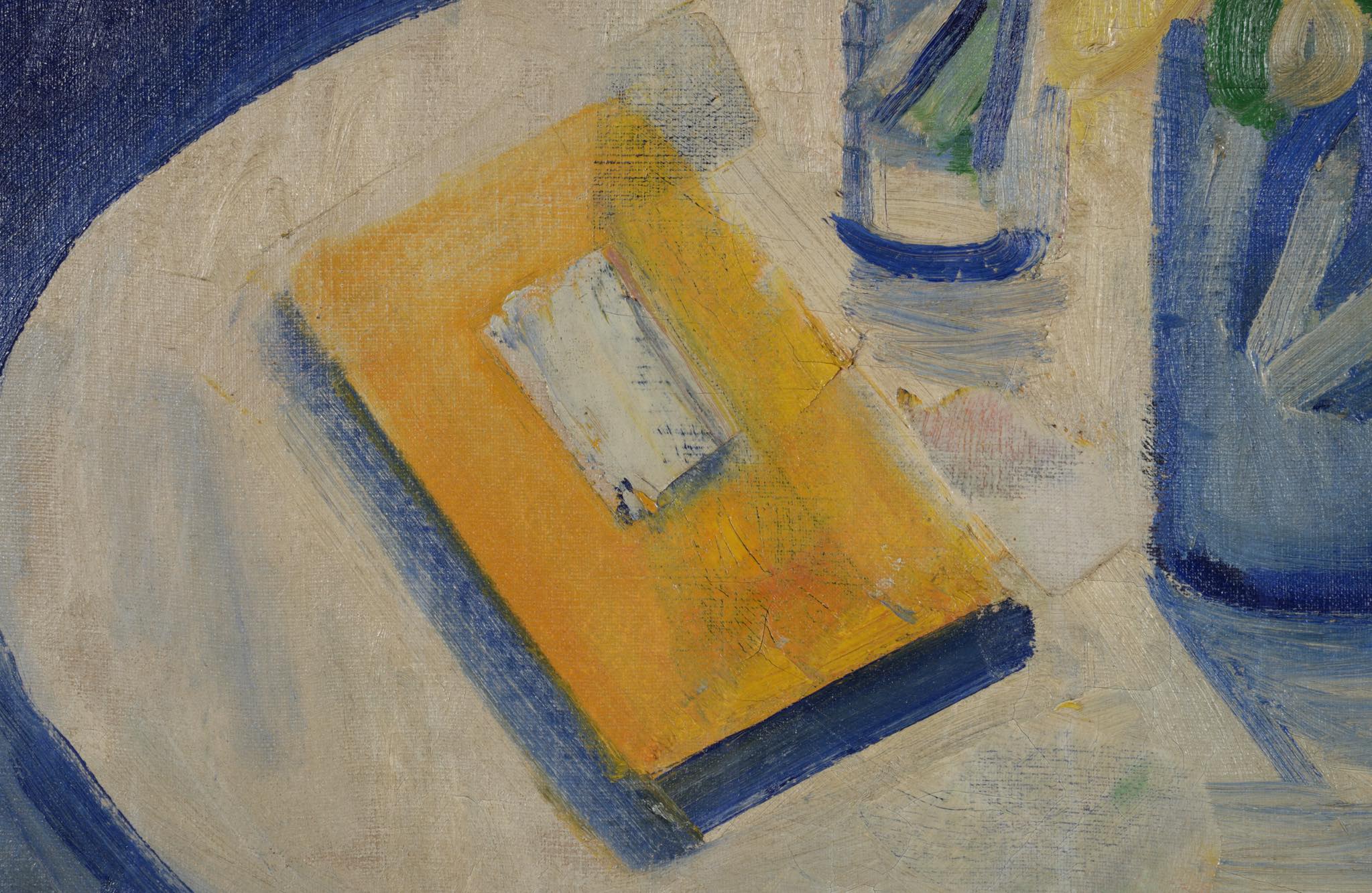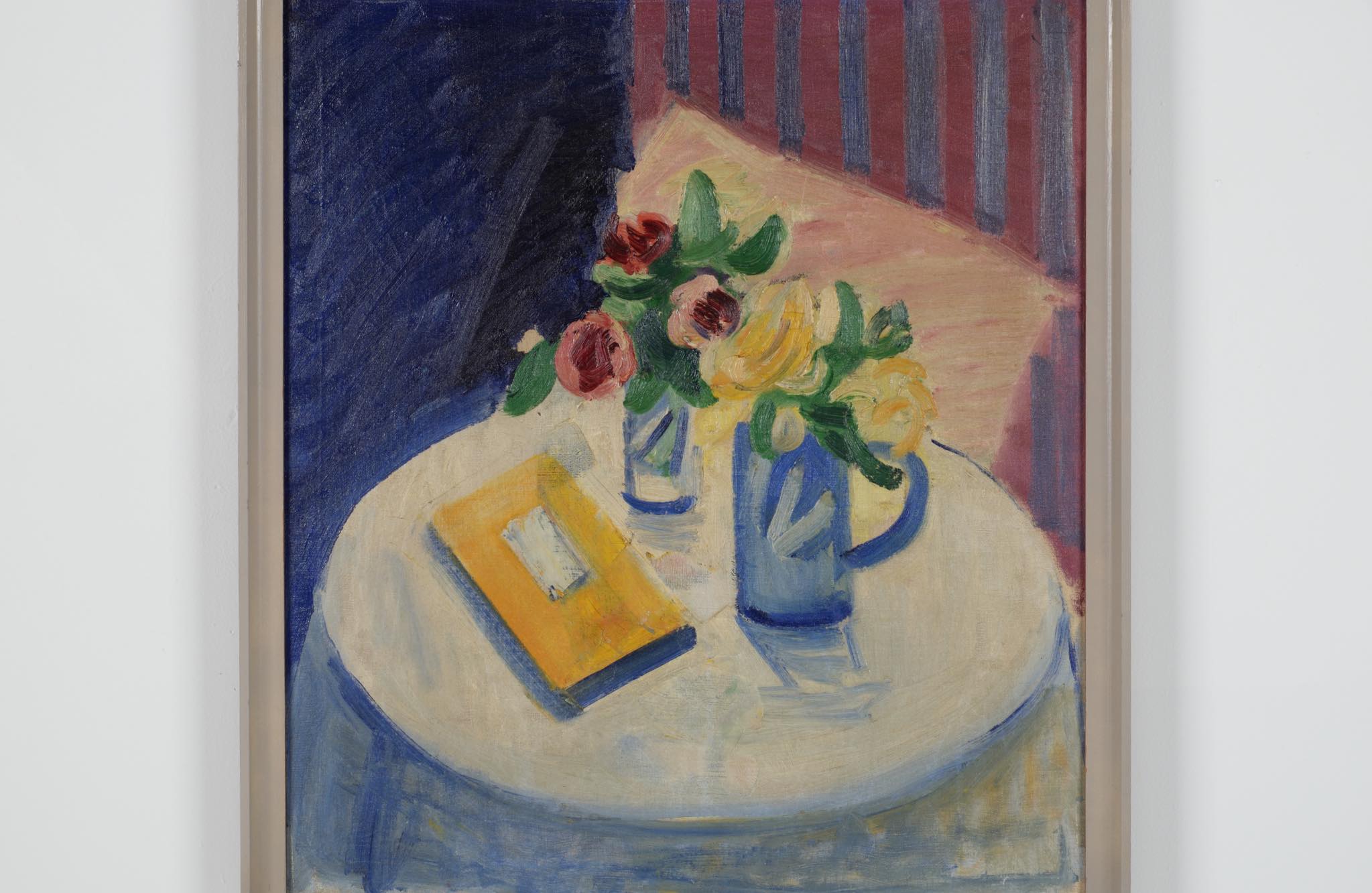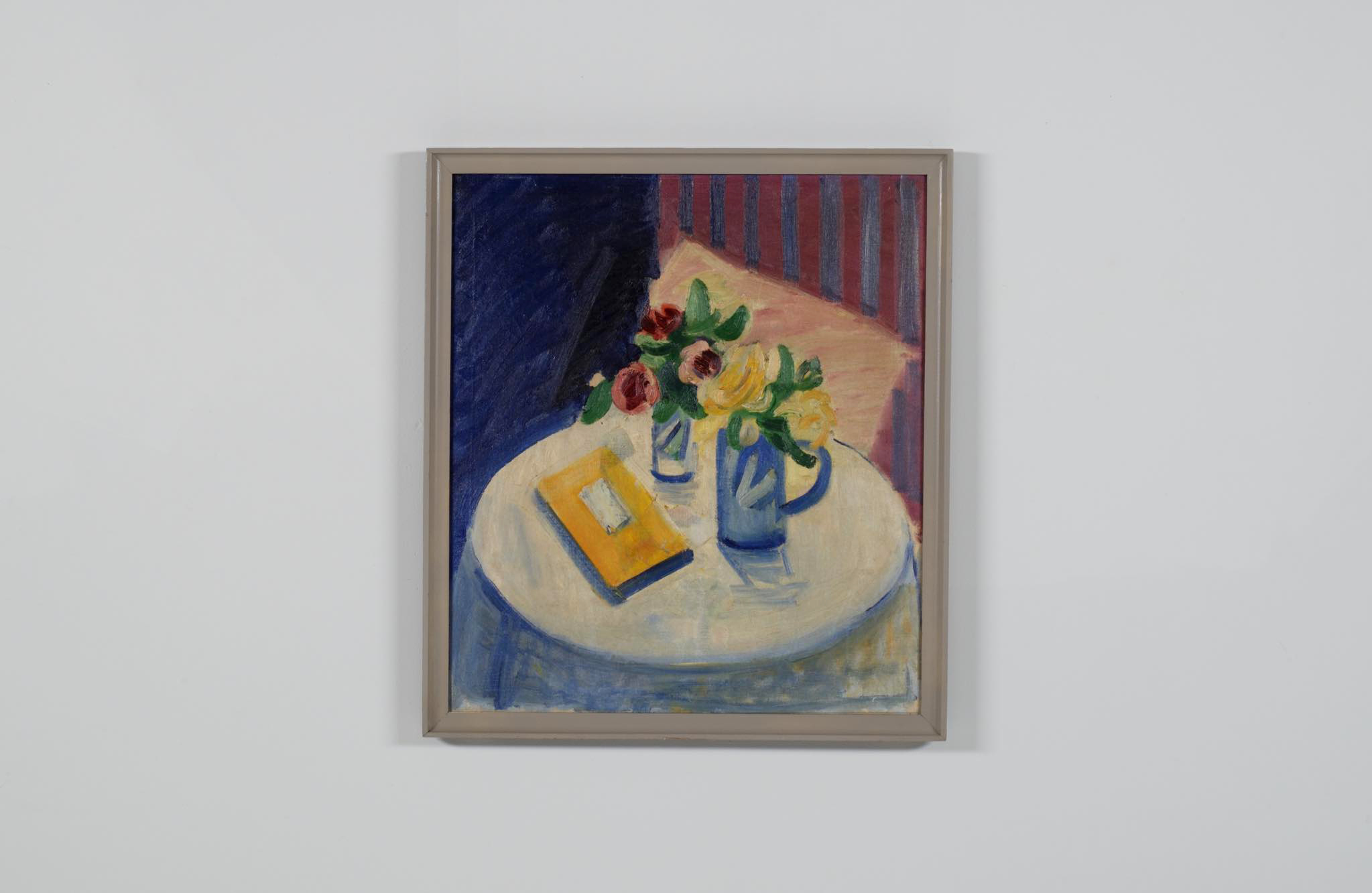 20世紀前葉のデンマークで活動した画家のAxel Bentzen/アクセル・ベンツェンによる油彩静物画作品です。卓上に置かれた花や書籍などが独自の筆致で描かれています。フレームはオリジナルですが、塗装に劣化が見られたため補修を行なっています。コンディションは良好です。