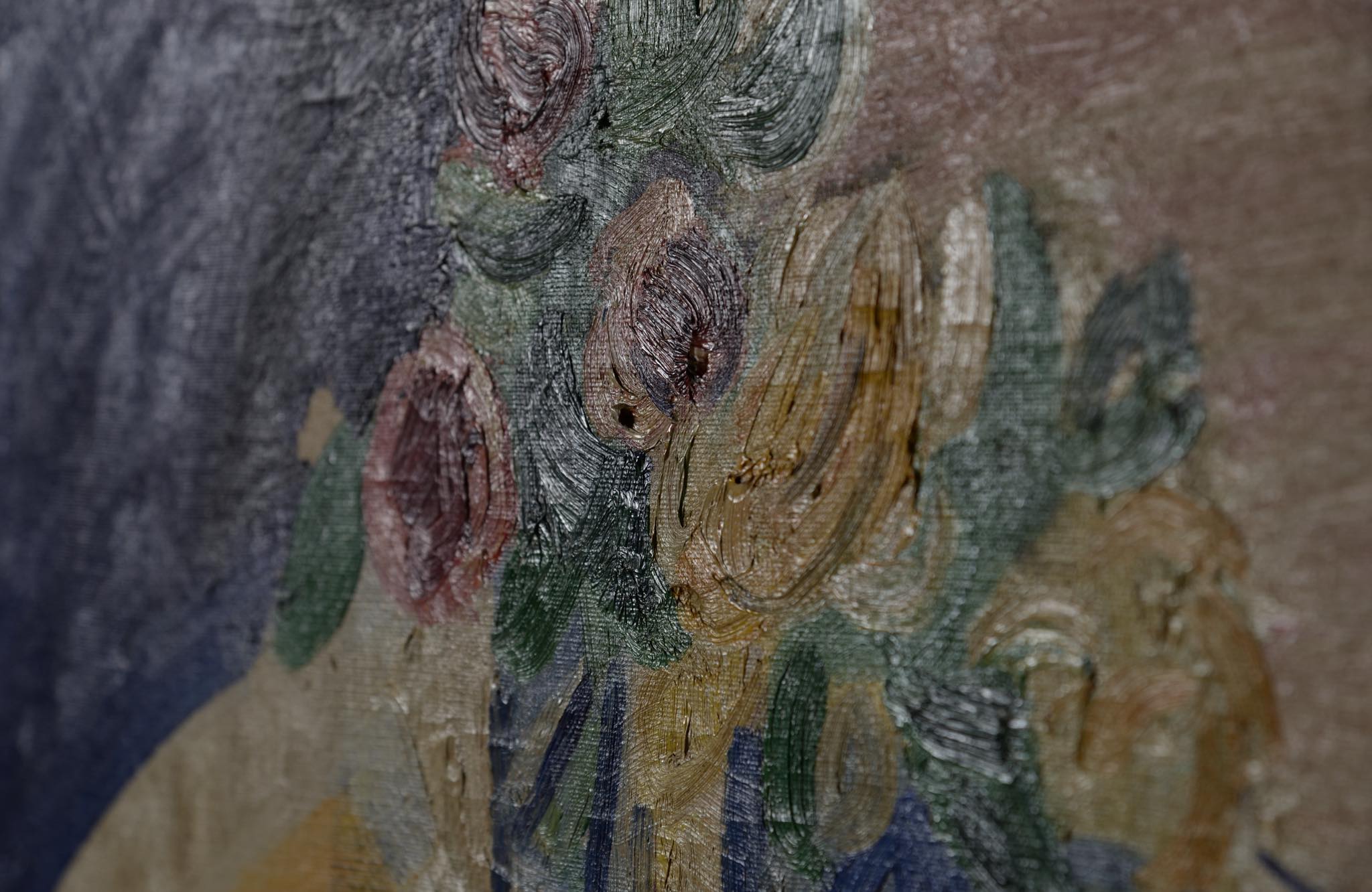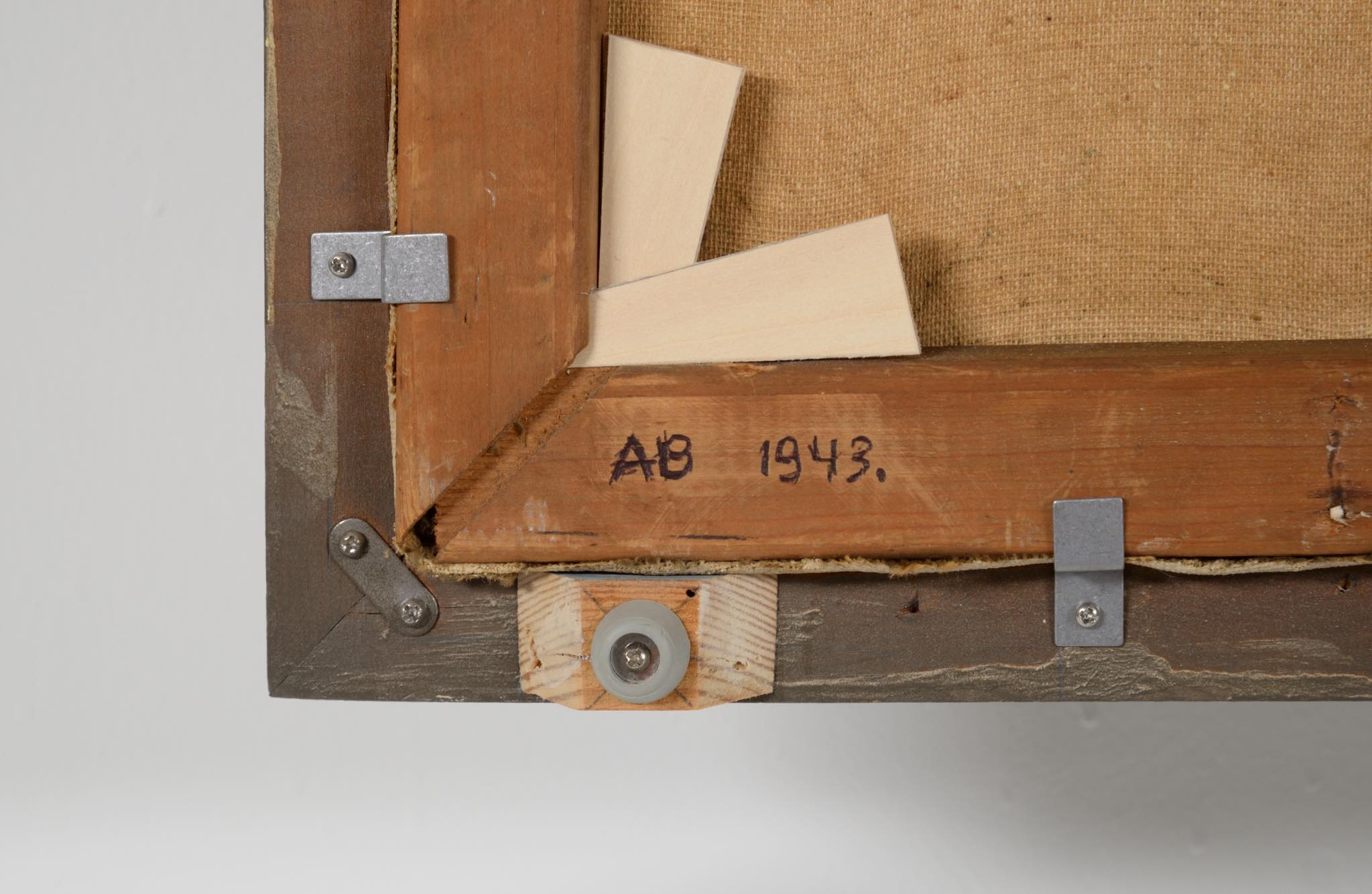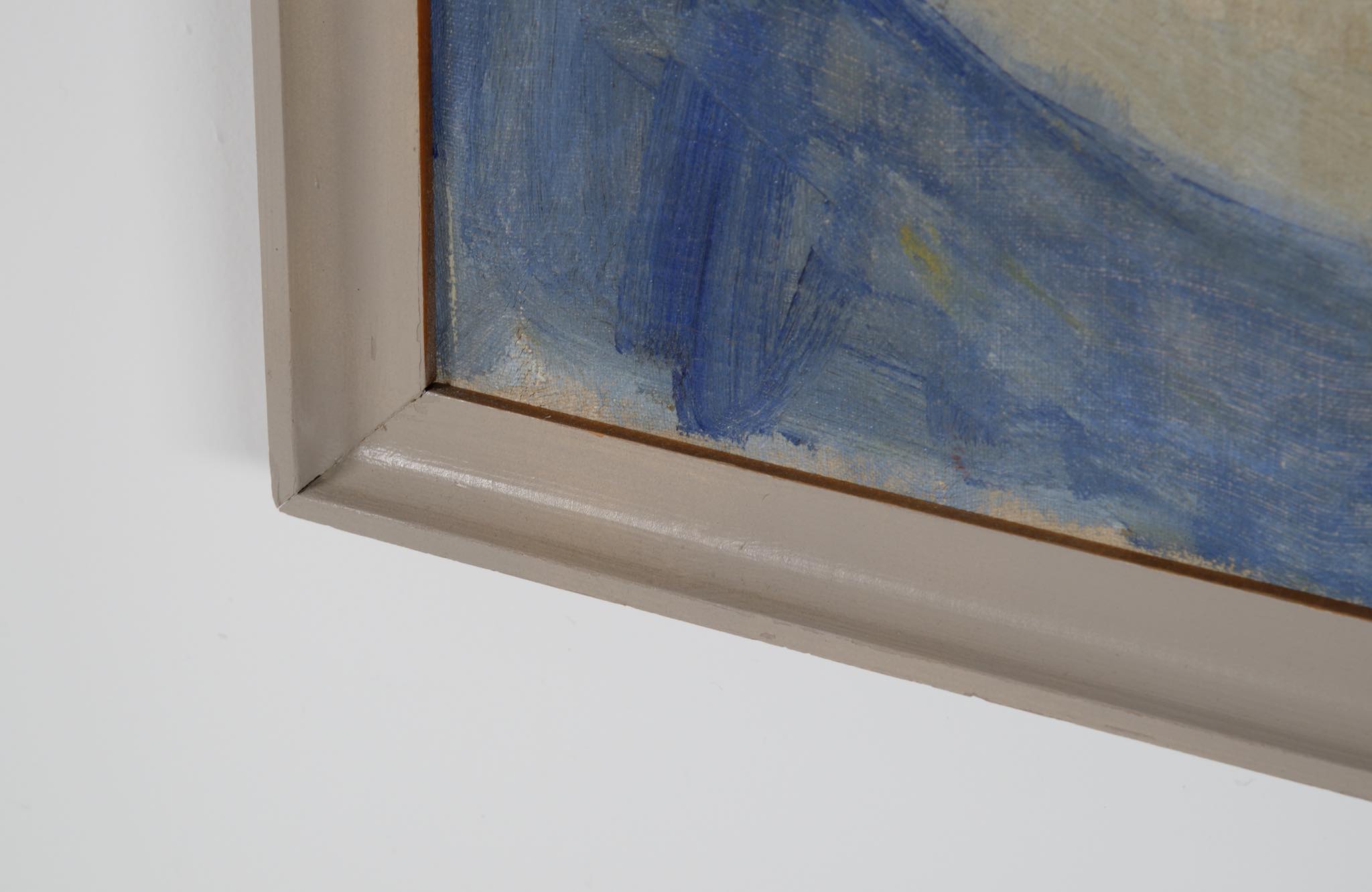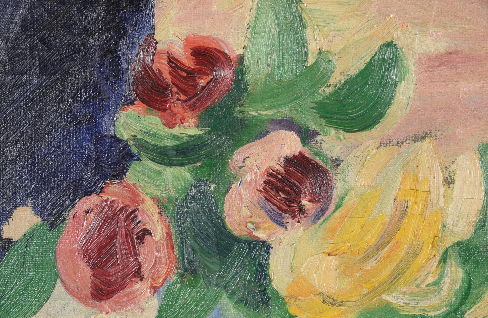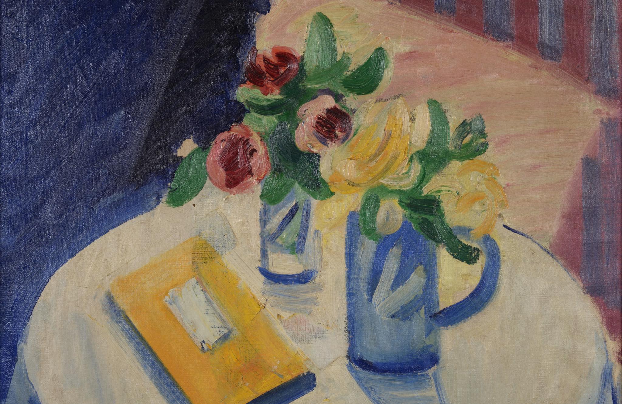 20世紀前葉のデンマークで活動した画家のAxel Bentzen/アクセル・ベンツェンによる油彩静物画作品です。卓上に置かれた花や書籍などが独自の筆致で描かれています。フレームはオリジナルですが、塗装に劣化が見られたため補修を行なっています。コンディションは良好です。