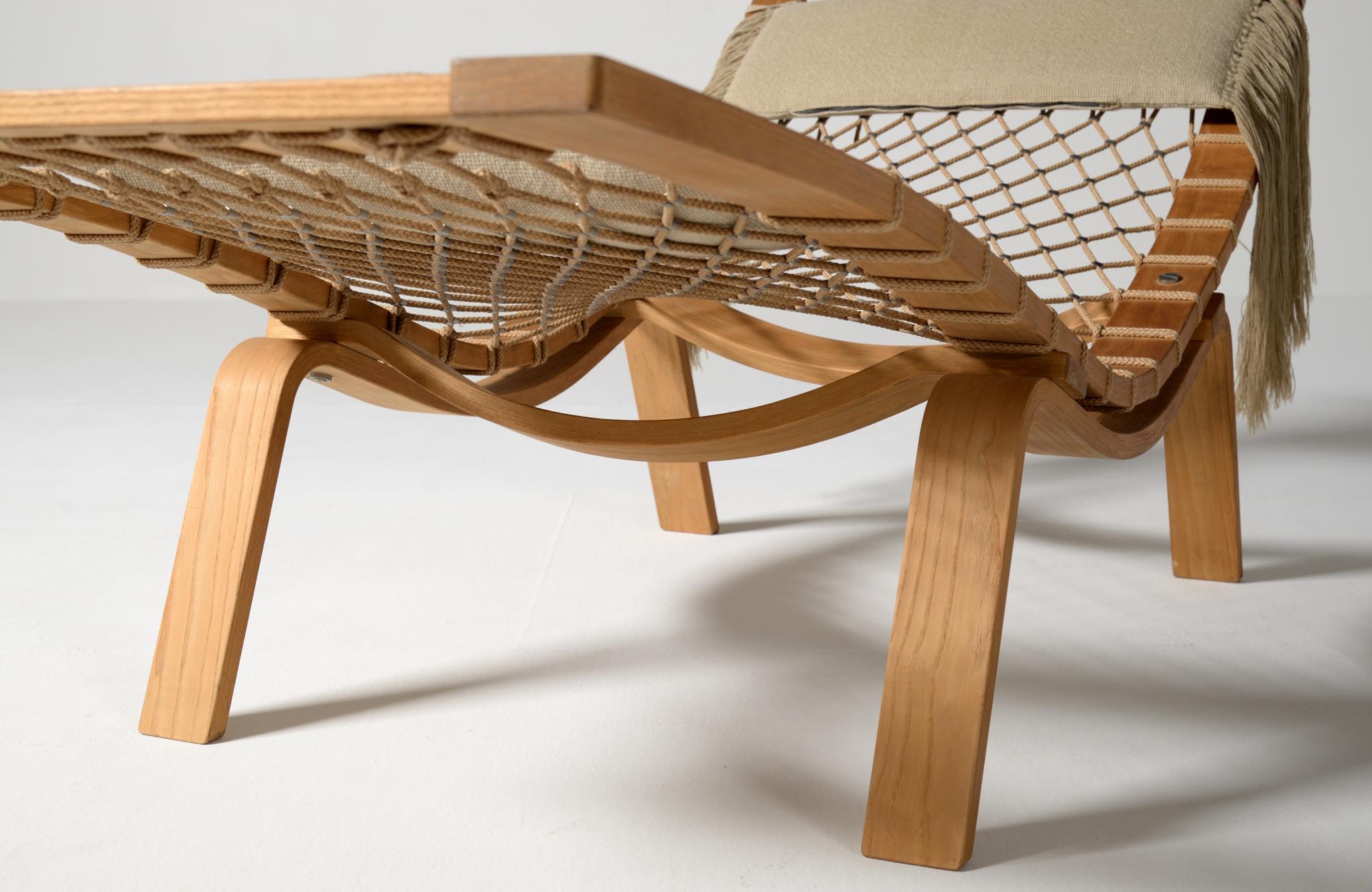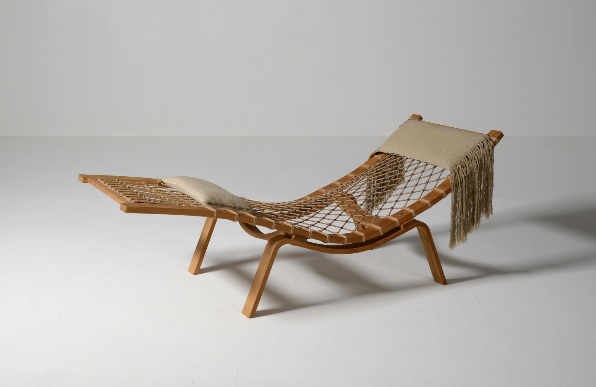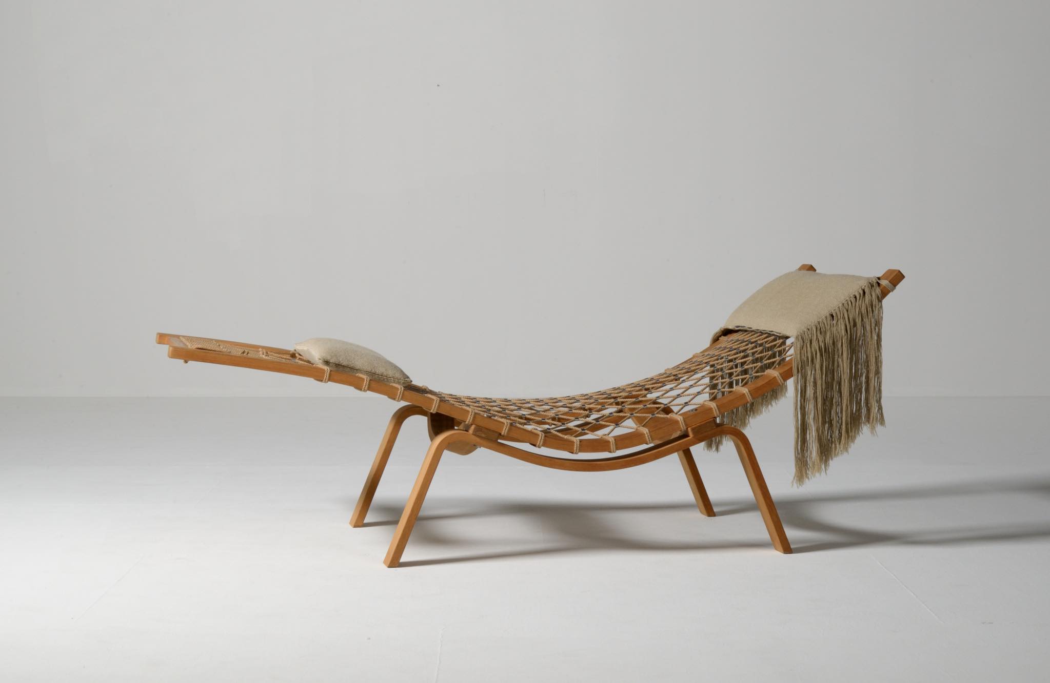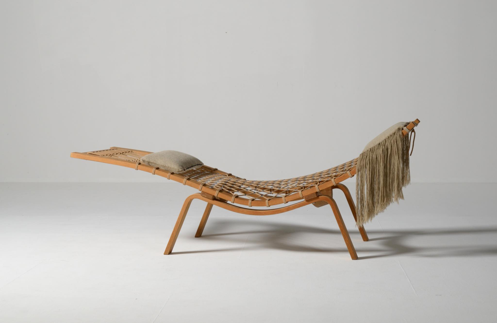 デンマークを代表する家具デザイナーのHans J. Wegner/ハンス・ウェグナーによる名作椅子、PP135ハンモックチェアです。オリジナルは1967年にゲタマ社から発表〜発売されましたが、僅かしか生産されなかったようです。こちらは1990年代にPPモブラー社により復刻されたものと思われ、刻印等は見られませんが、ウール生地のヘッドレスト、ふくらはぎ当てのクッションが備わります。コンディションは良好です。