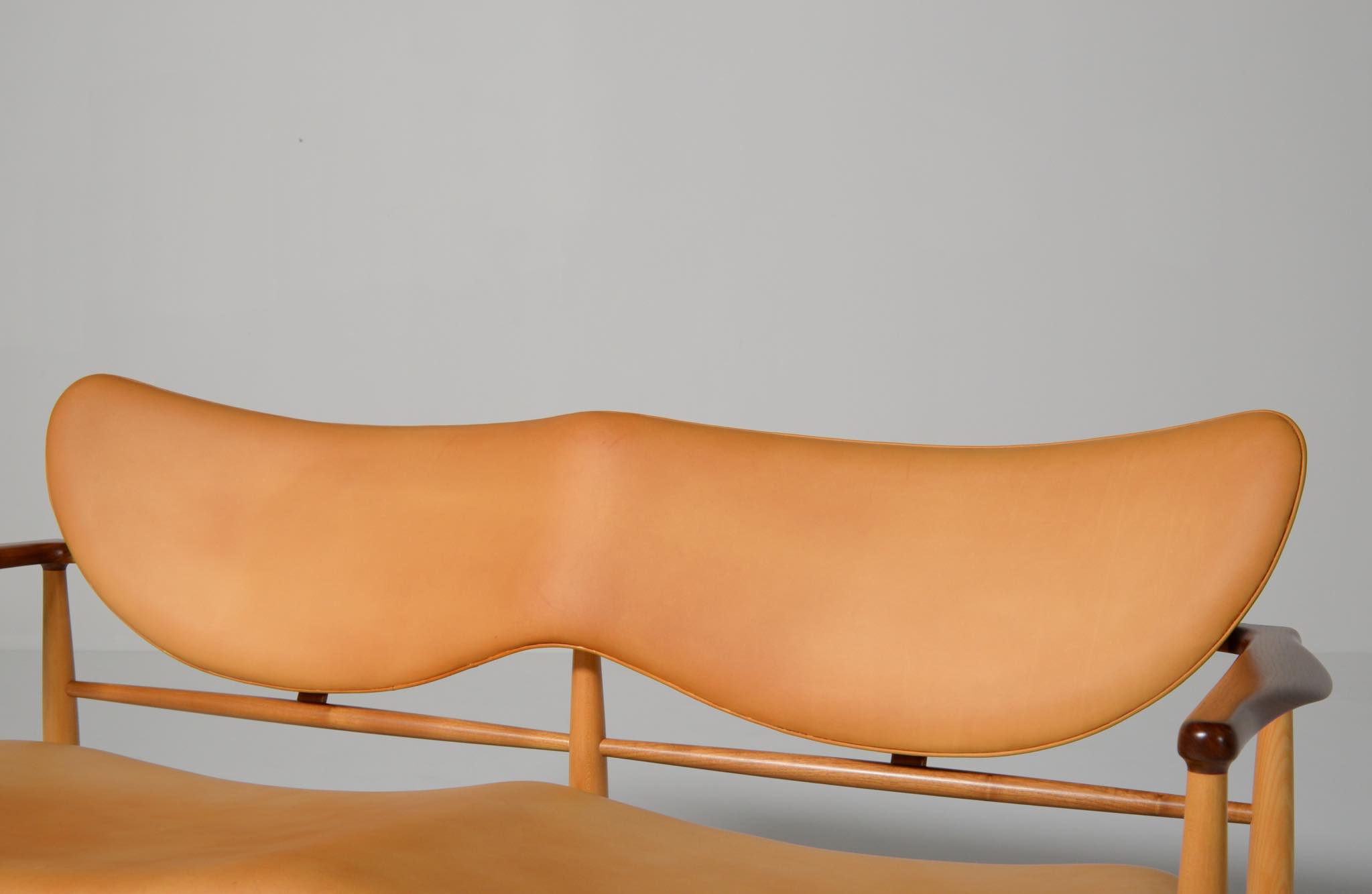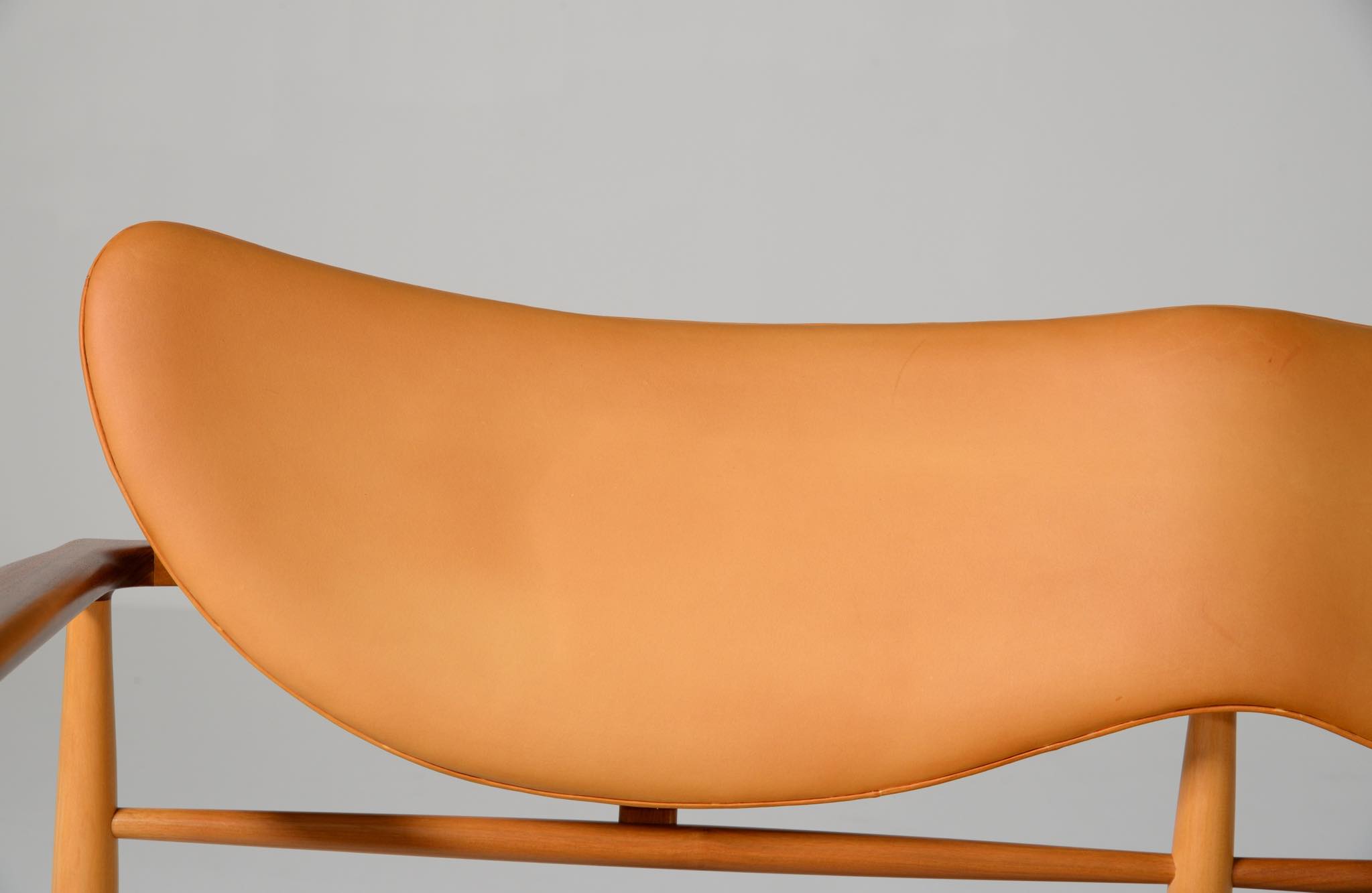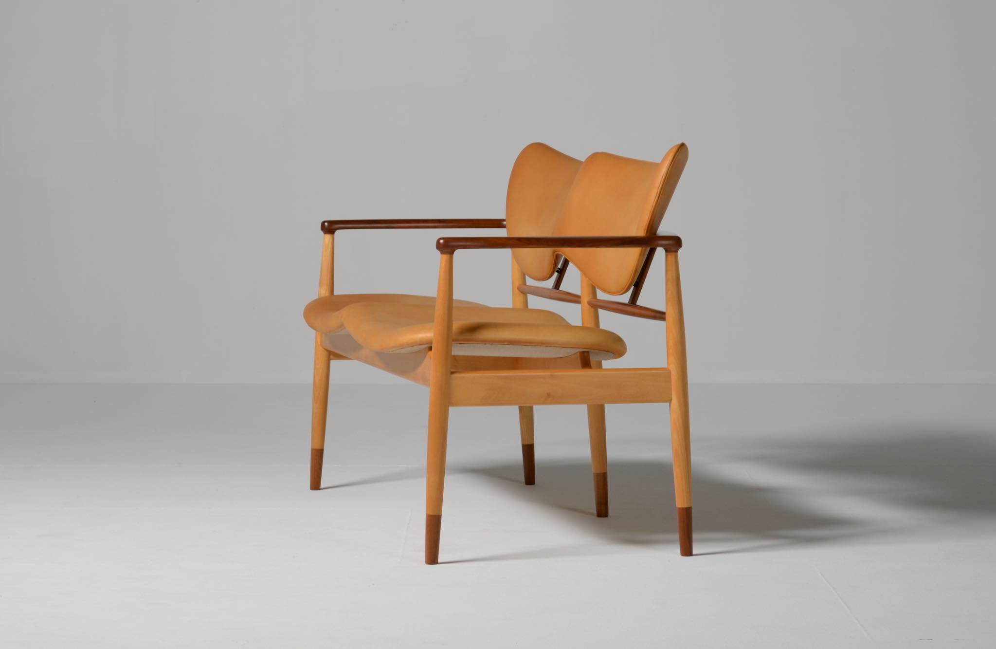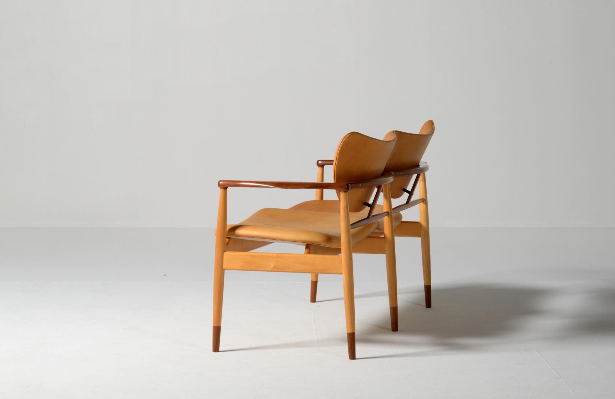 デンマークを代表する家具デザイナー、Finn Juhl/フィン・ユールによる1948年に発表された名作椅子 "FJ48" セッティです。シャルロッテンルンドにあるフィン・ユール自邸の寝室に置かれていることで知られ、特異なデザインは他に類を見ない存在感を放ちます。こちらはニールス・ロス・アナセンのロゴからかつて師事した親方のSøren Hornの冠を外し、自身のイニシャルのNRAをロゴに用いた1998年以降に作られた作品となります。フレームはチェリー材、アームとシューズにはウォルナットが用いられています。ナチュラルレザーは若干の経年感がありますが、コンディションは良好です。