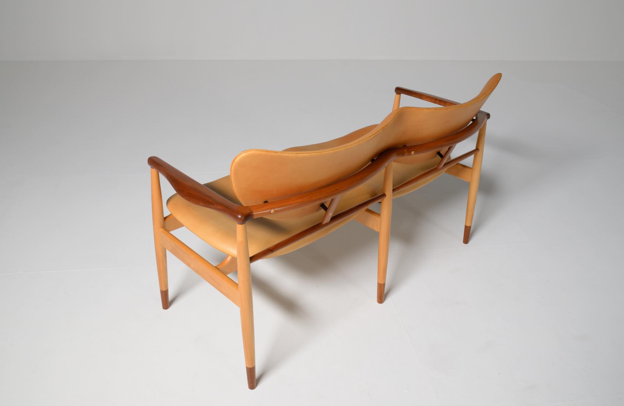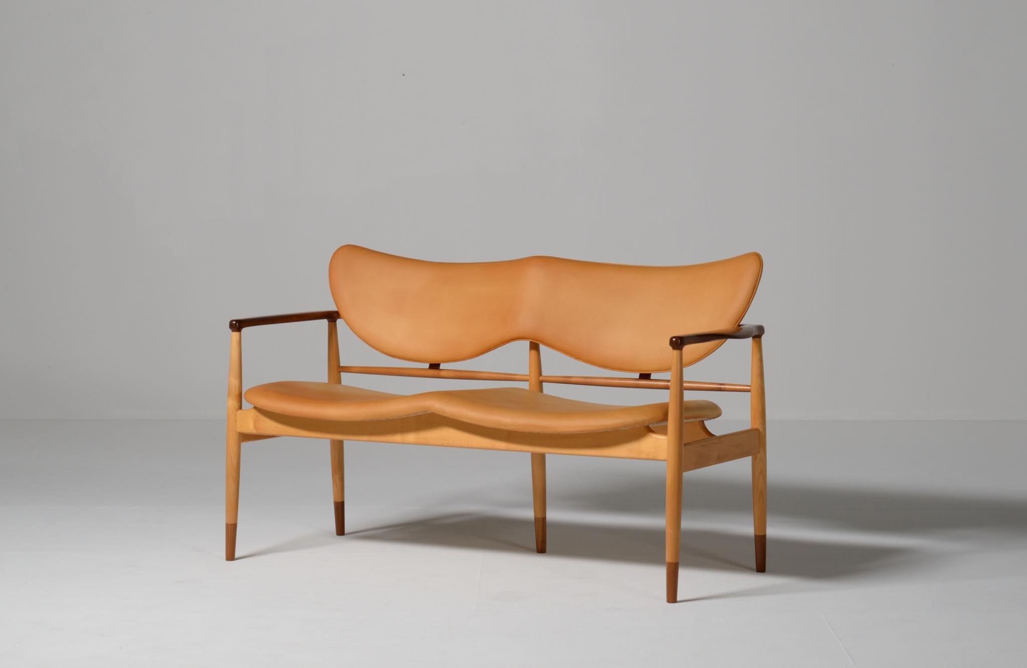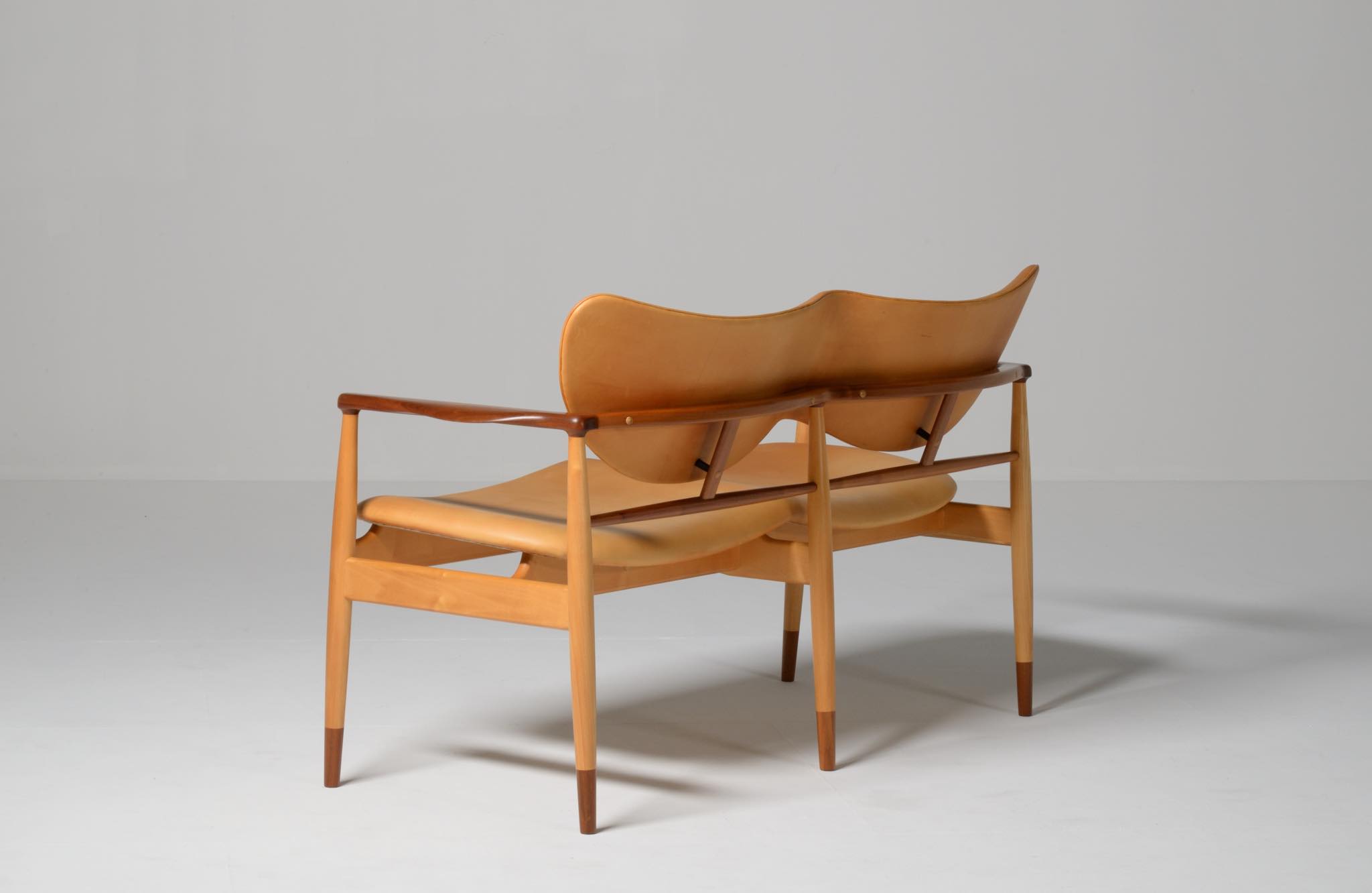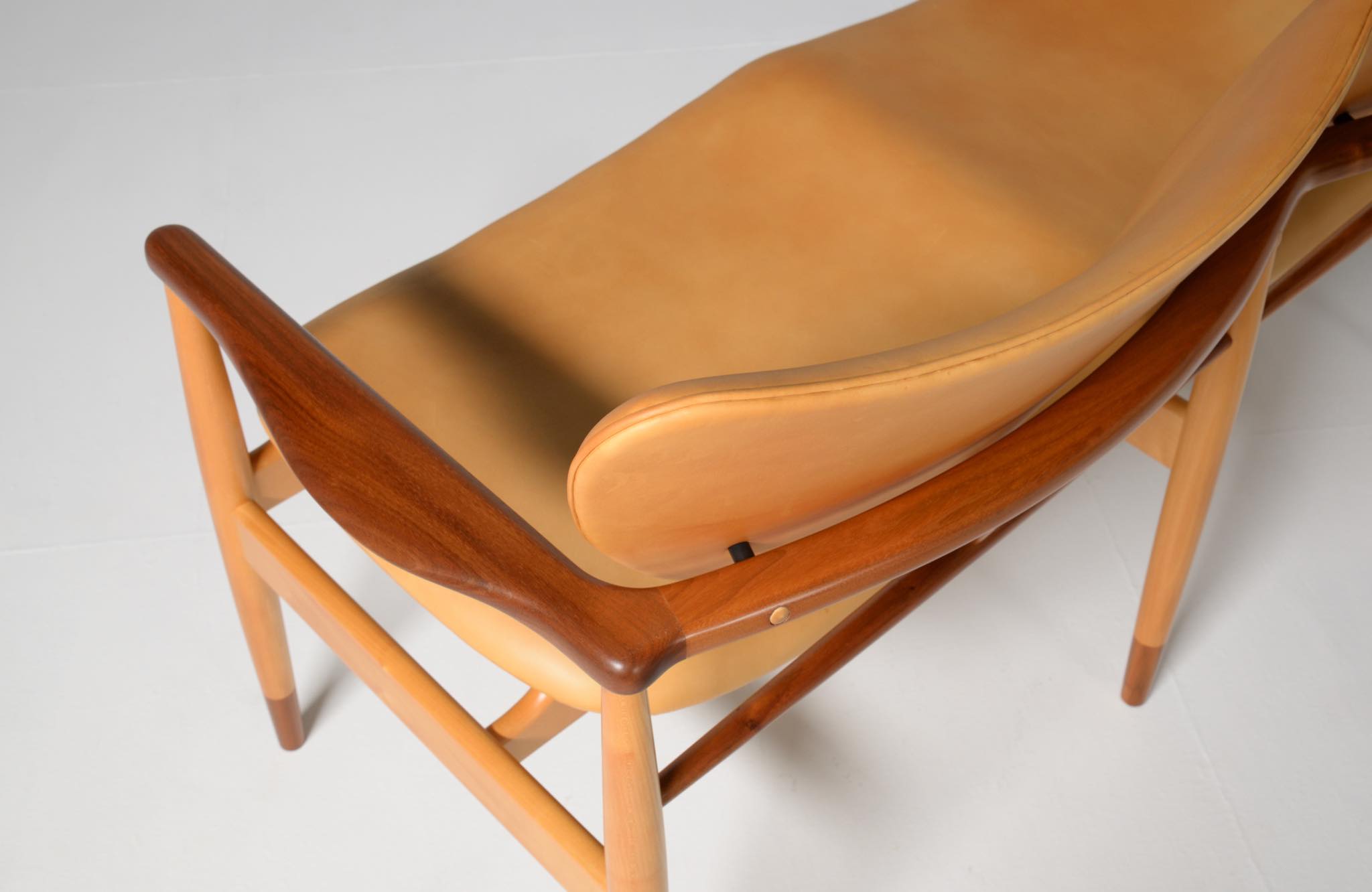 デンマークを代表する家具デザイナー、Finn Juhl/フィン・ユールによる1948年に発表された名作椅子 "FJ48" セッティです。シャルロッテンルンドにあるフィン・ユール自邸の寝室に置かれていることで知られ、特異なデザインは他に類を見ない存在感を放ちます。こちらはニールス・ロス・アナセンのロゴからかつて師事した親方のSøren Hornの冠を外し、自身のイニシャルのNRAをロゴに用いた1998年以降に作られた作品となります。フレームはチェリー材、アームとシューズにはウォルナットが用いられています。ナチュラルレザーは若干の経年感がありますが、コンディションは良好です。