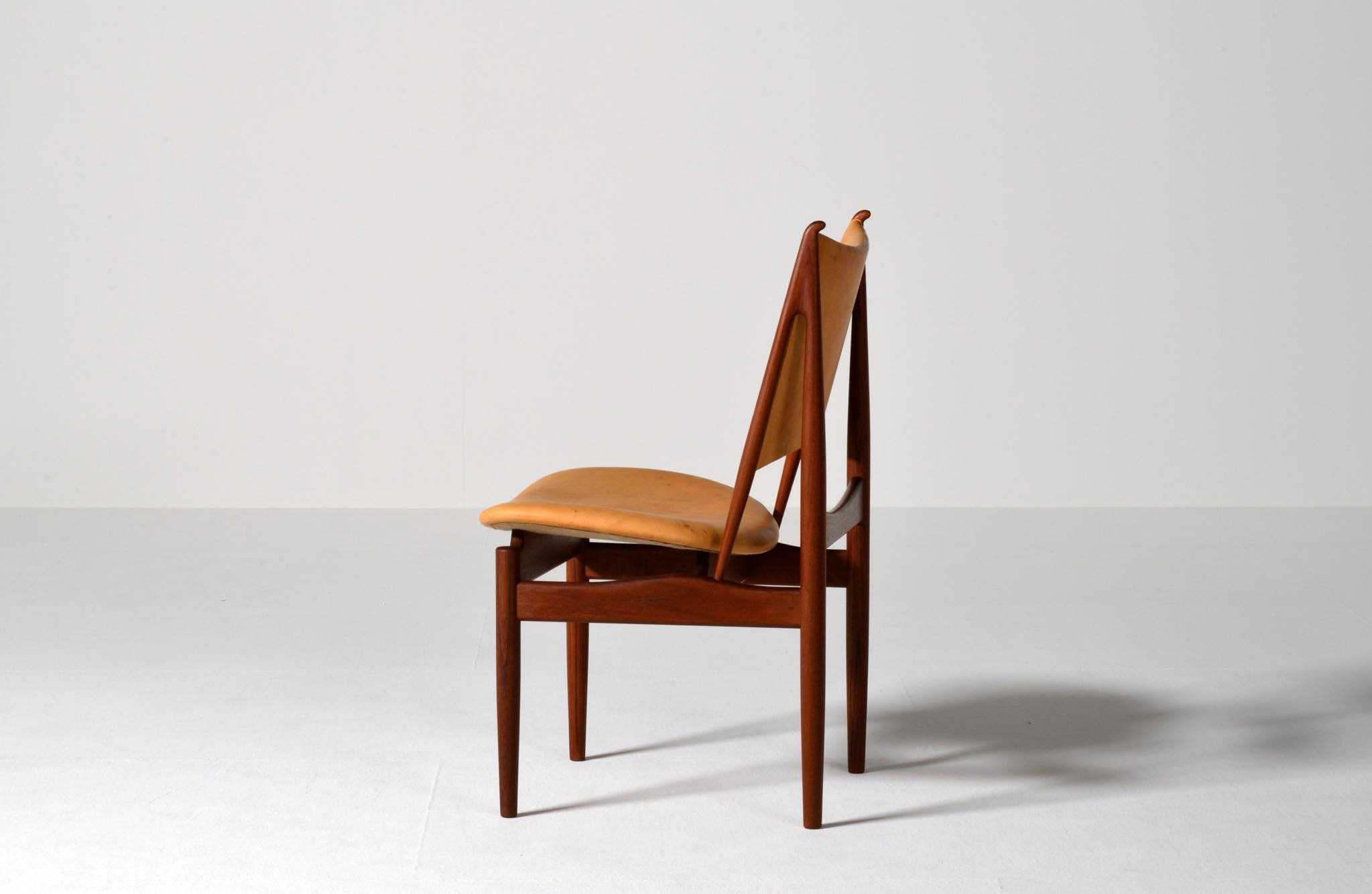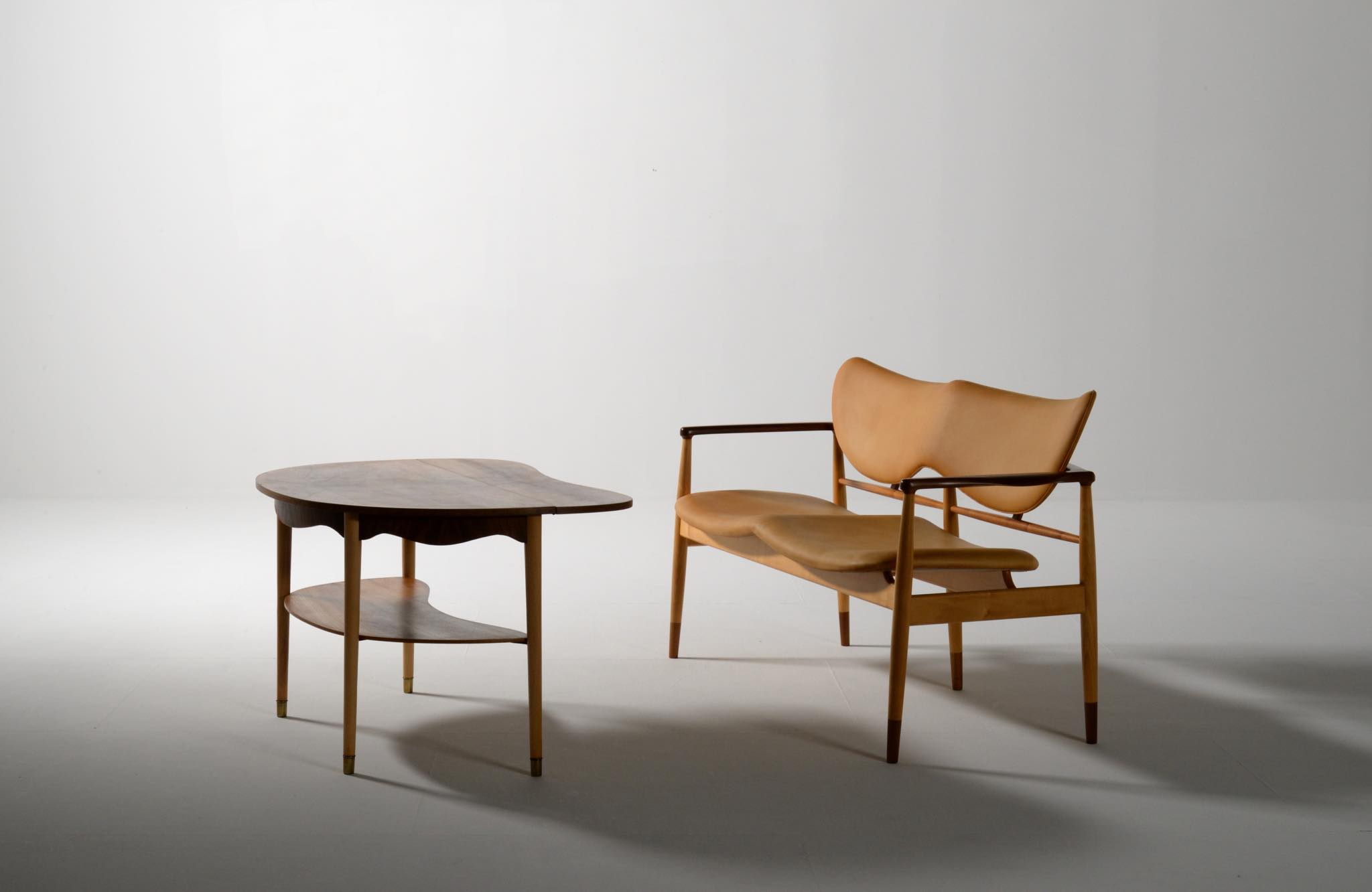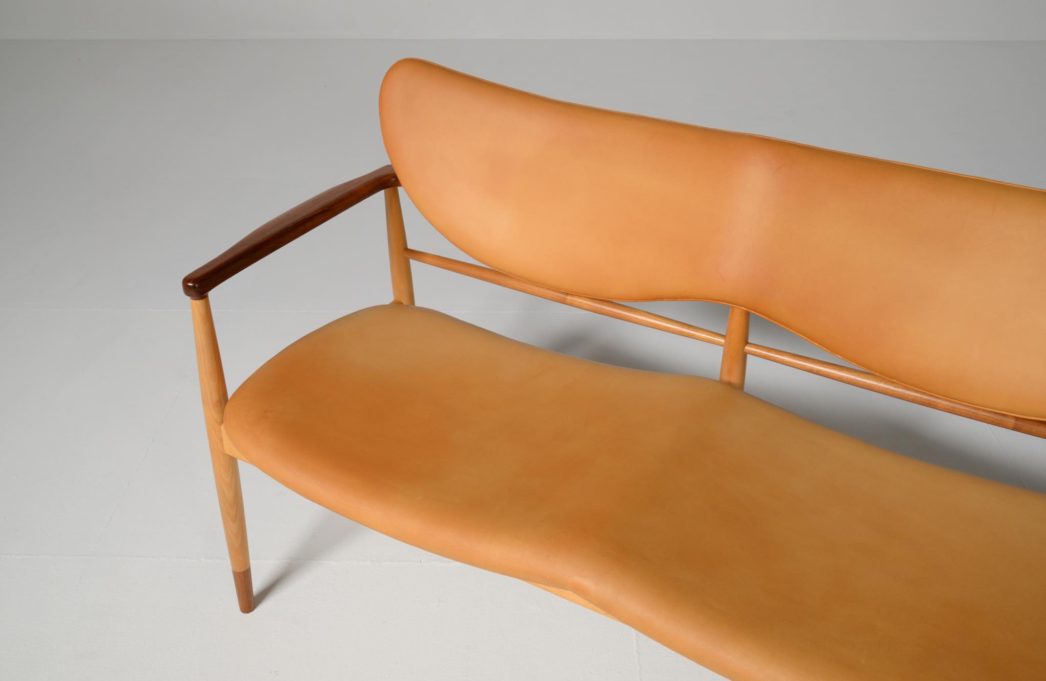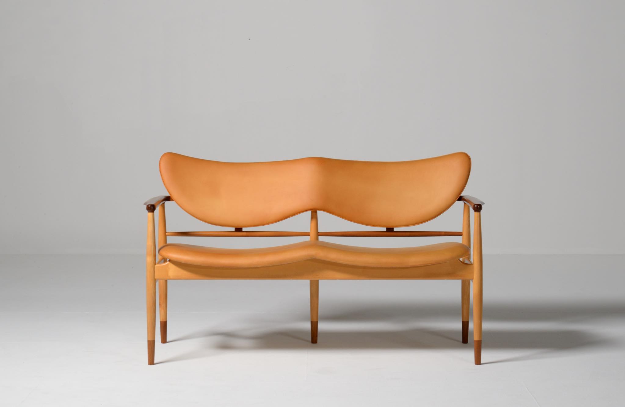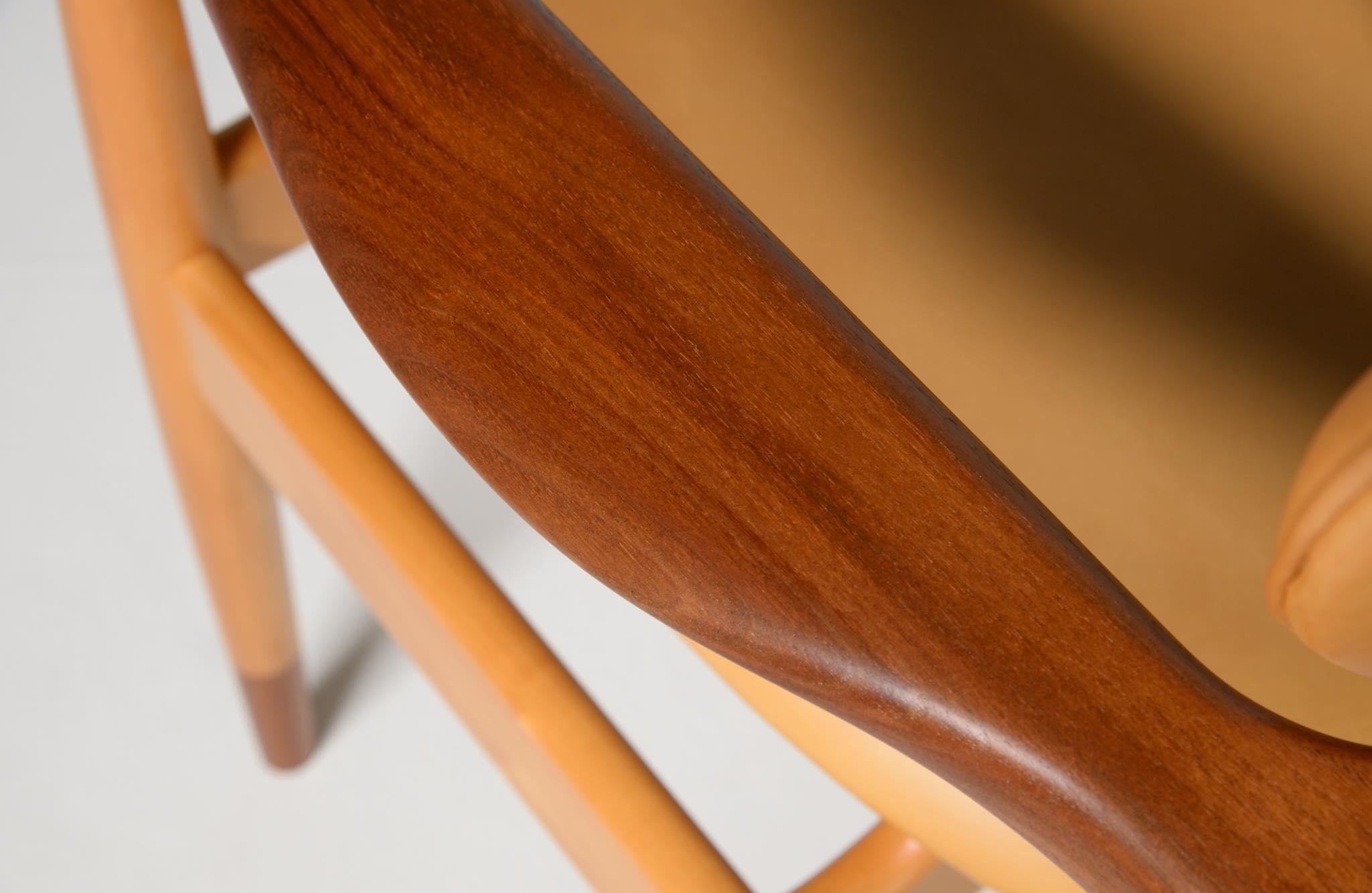 デンマークを代表する家具デザイナー、Finn Juhl/フィン・ユールによる1948年に発表された名作椅子 "FJ48" セッティです。シャルロッテンルンドにあるフィン・ユール自邸の寝室に置かれていることで知られ、特異なデザインは他に類を見ない存在感を放ちます。こちらはニールス・ロス・アナセンのロゴからかつて師事した親方のSøren Hornの冠を外し、自身のイニシャルのNRAをロゴに用いた1998年以降に作られた作品となります。フレームはチェリー材、アームとシューズにはウォルナットが用いられています。ナチュラルレザーは若干の経年感がありますが、コンディションは良好です。