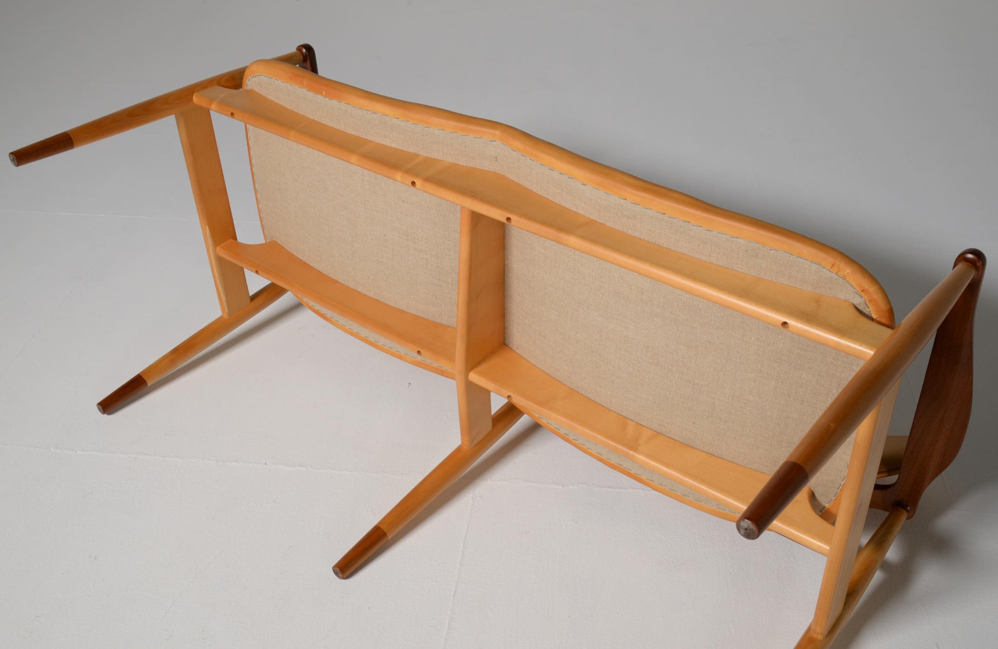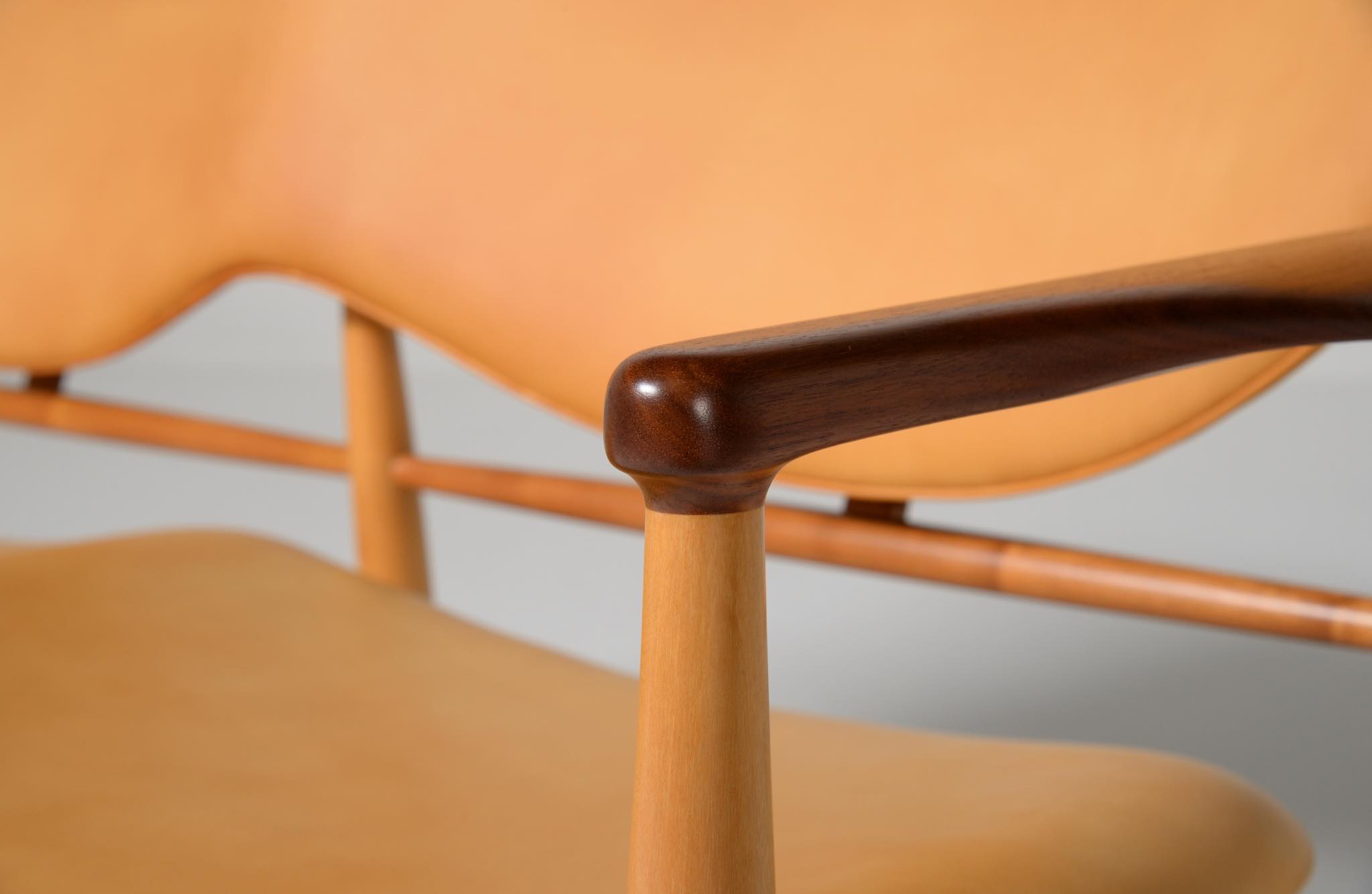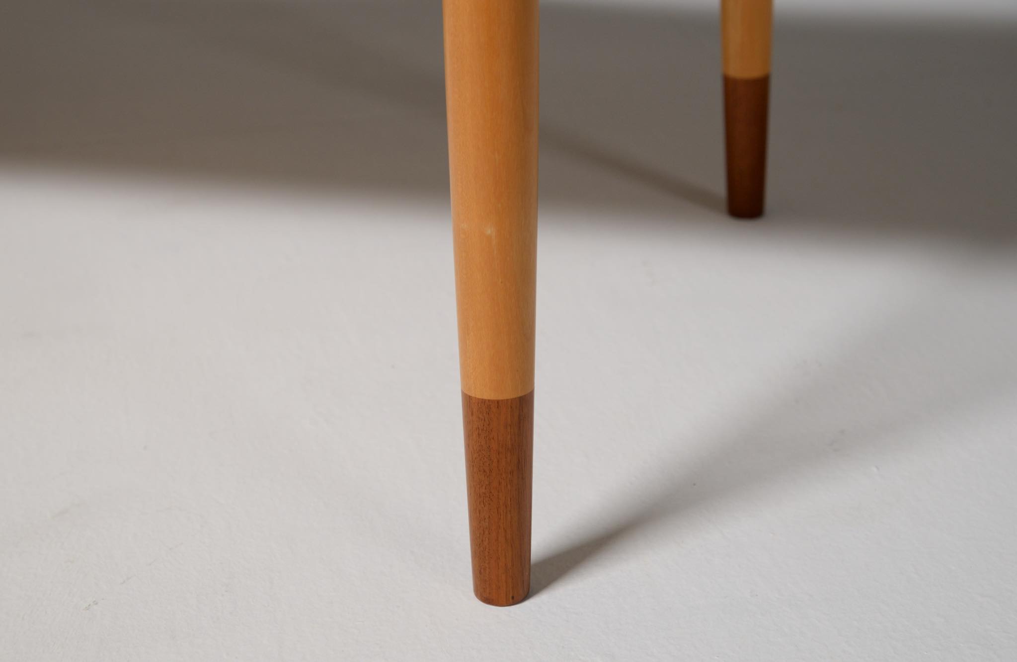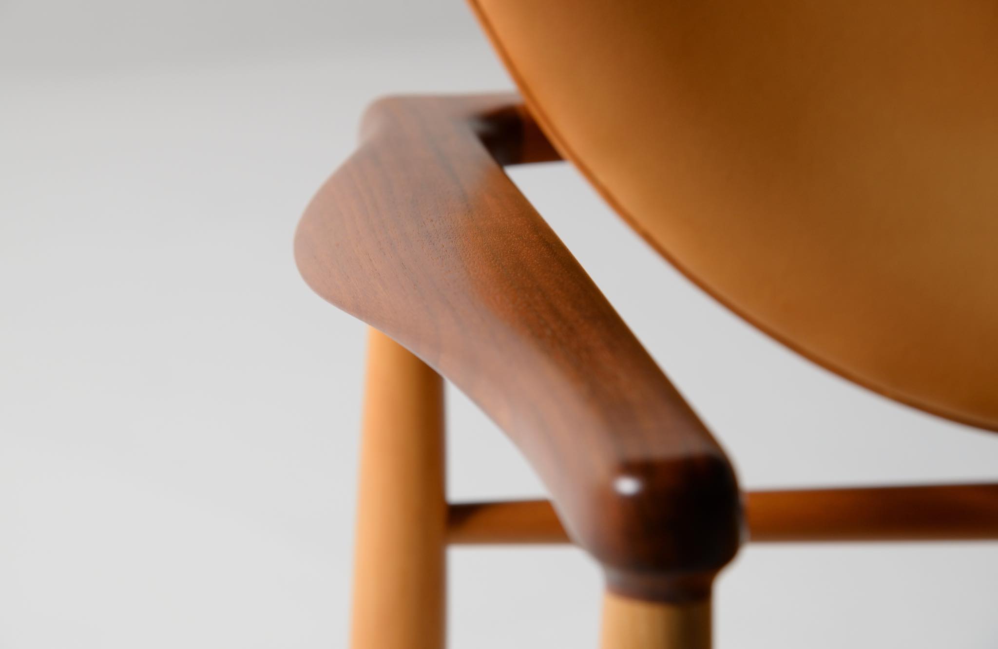 デンマークを代表する家具デザイナー、Finn Juhl/フィン・ユールによる1948年に発表された名作椅子 "FJ48" セッティです。シャルロッテンルンドにあるフィン・ユール自邸の寝室に置かれていることで知られ、特異なデザインは他に類を見ない存在感を放ちます。こちらはニールス・ロス・アナセンのロゴからかつて師事した親方のSøren Hornの冠を外し、自身のイニシャルのNRAをロゴに用いた1998年以降に作られた作品となります。フレームはチェリー材、アームとシューズにはウォルナットが用いられています。ナチュラルレザーは若干の経年感がありますが、コンディションは良好です。