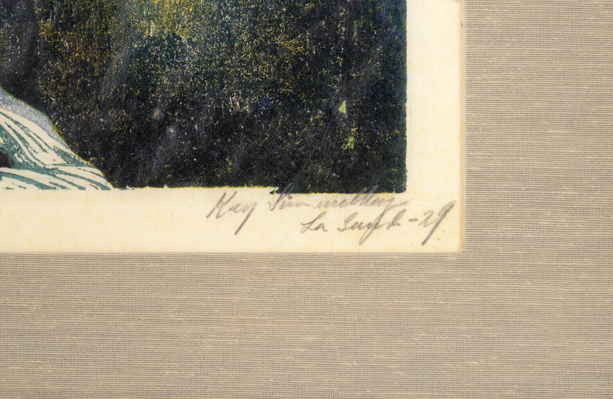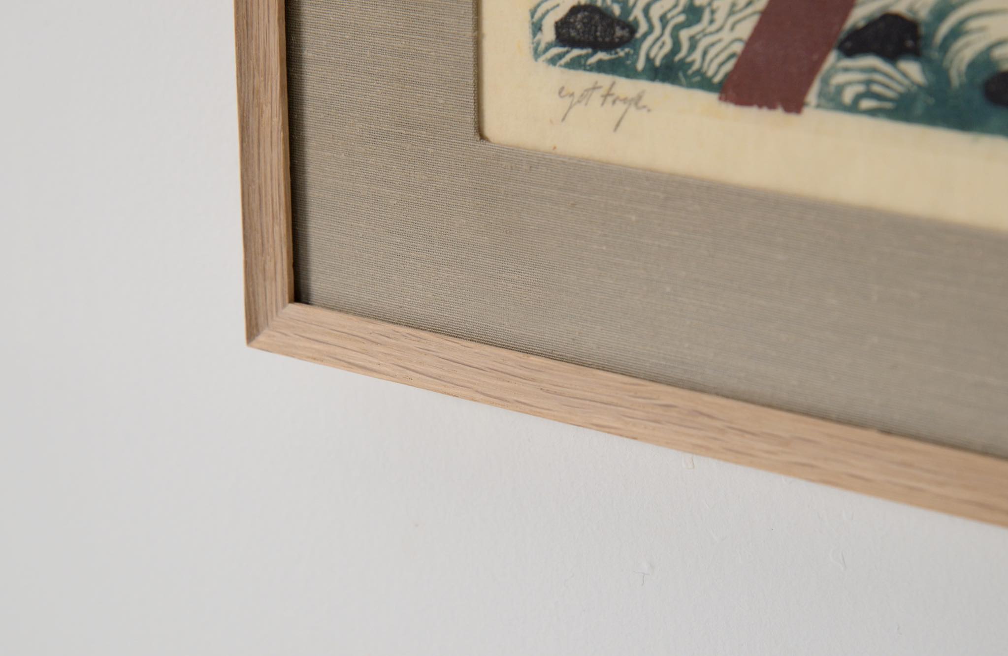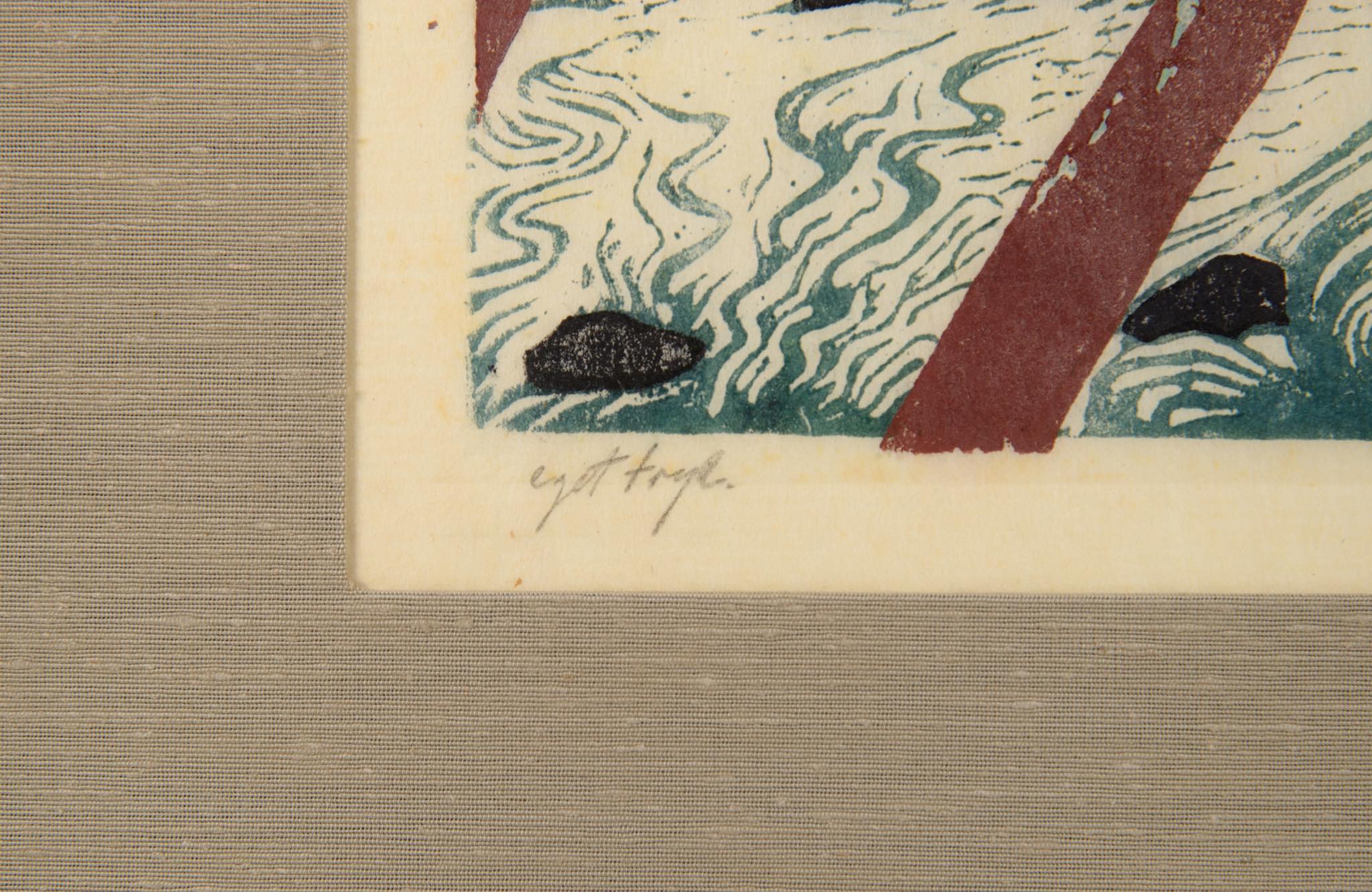 1920〜1930年代のデンマークで活動した芸術家、Kay Simmelhag/カイ・シムヘイによる木版画です。「Le torrent/急流」と題された作品で、紙は桑紙とのことです。1930年に販売されたこの版画は「Le Fleuve/川」と題された木版画シリーズのひとつで、南フランスのラ・ゴードにある「川」を題材としたものです。長年仕舞われていたのか、若干の染みは見られますが、日焼け等なく良好です。こちらは単体での販売となります。