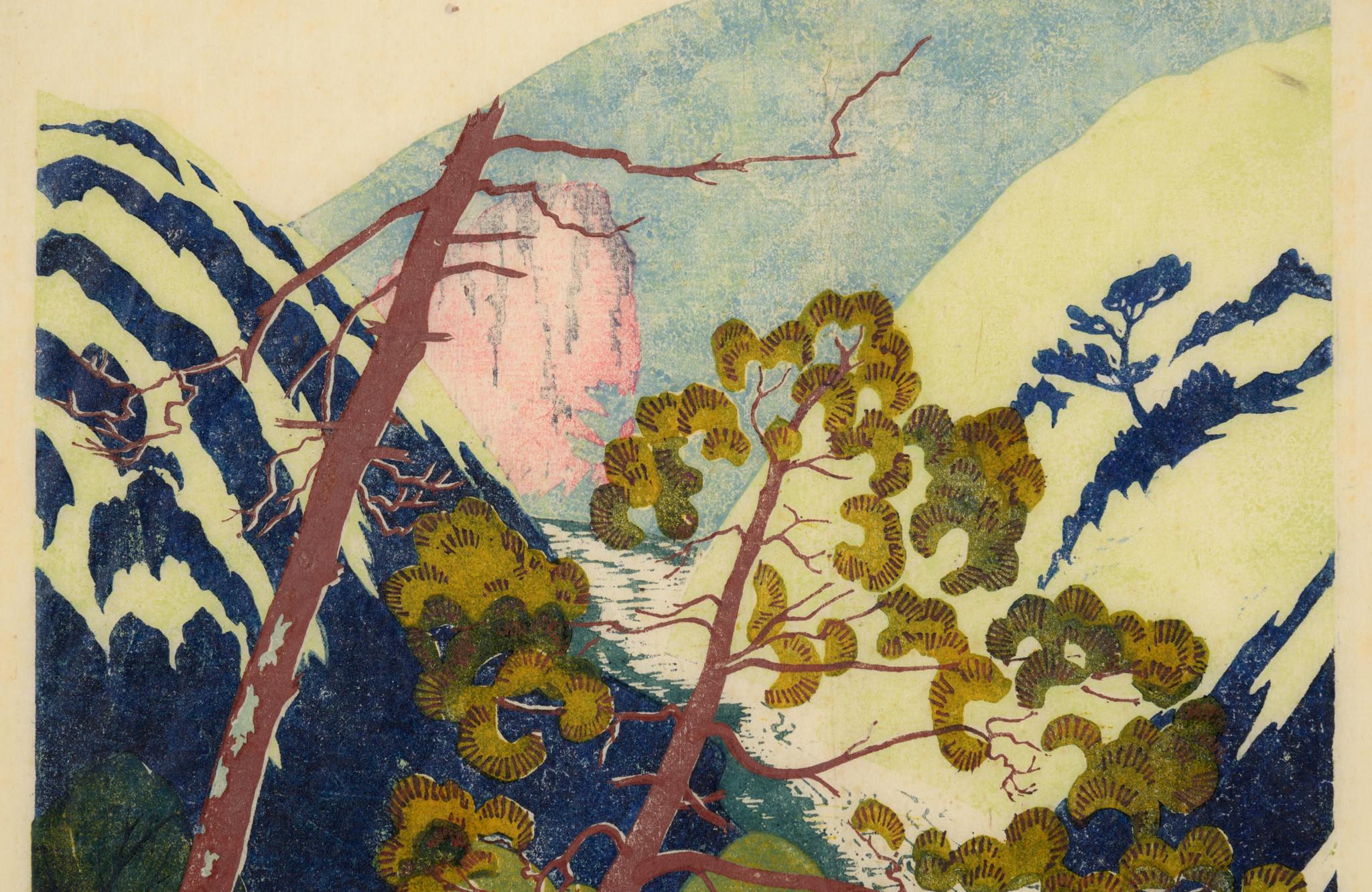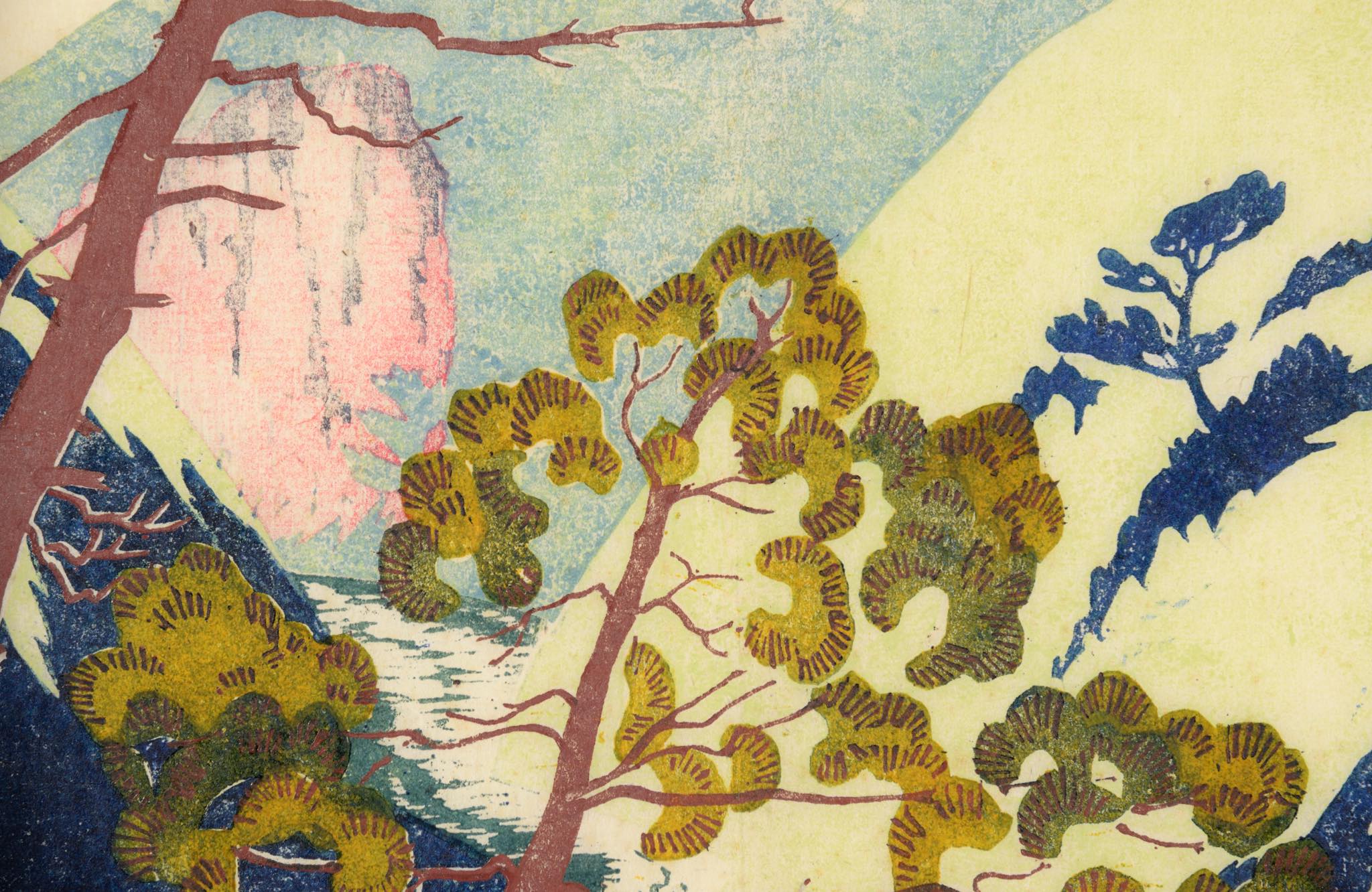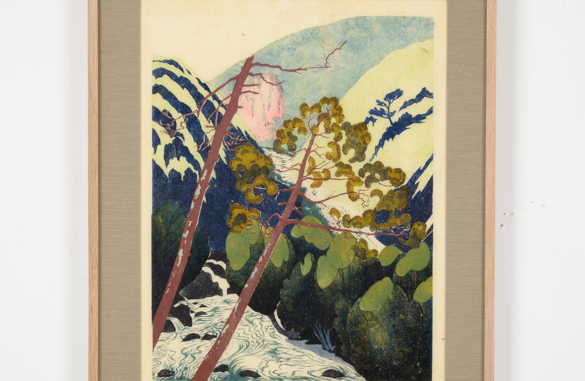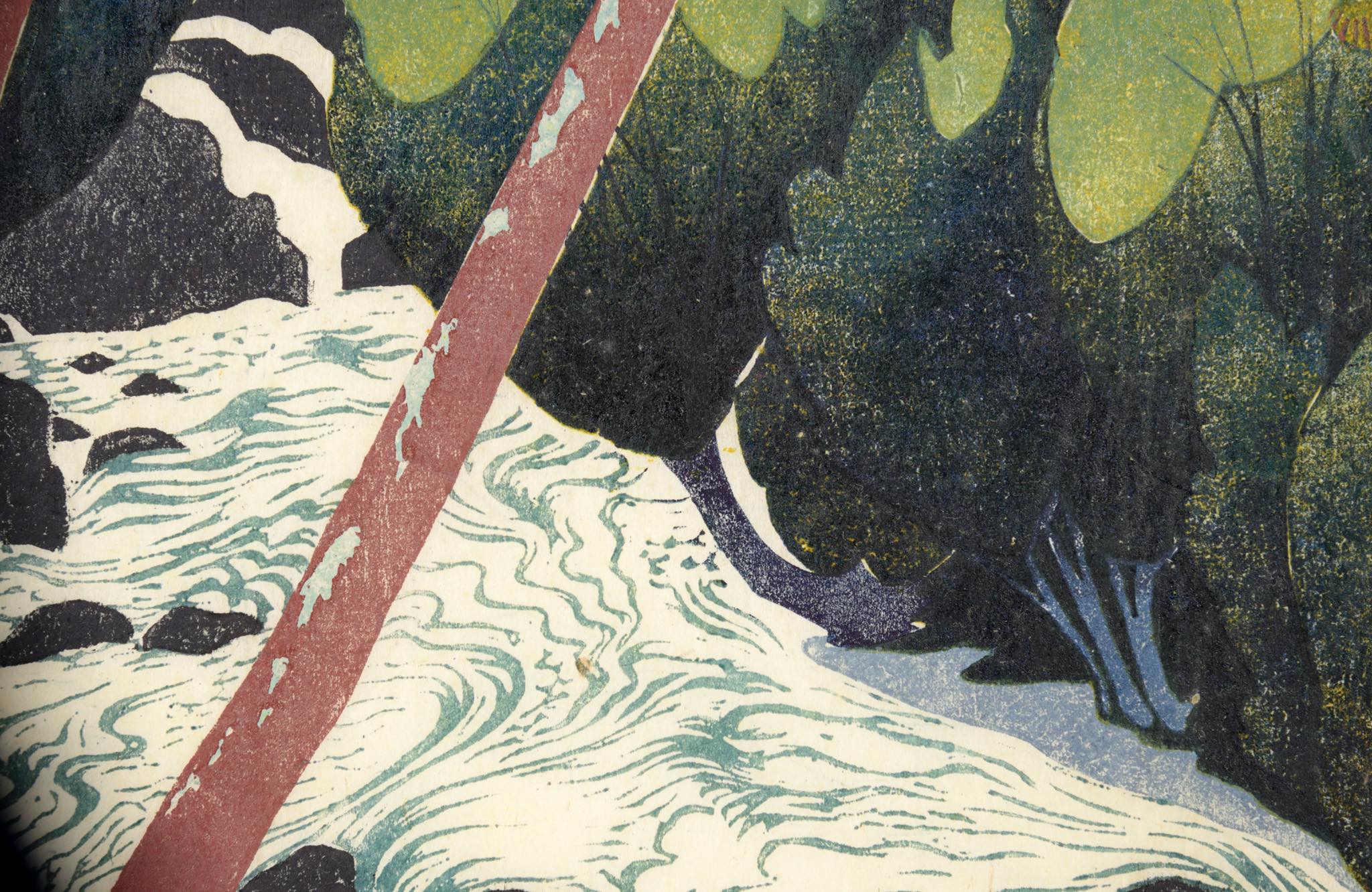 1920〜1930年代のデンマークで活動した芸術家、Kay Simmelhag/カイ・シムヘイによる木版画です。「Le torrent/急流」と題された作品で、紙は桑紙とのことです。1930年に販売されたこの版画は「Le Fleuve/川」と題された木版画シリーズのひとつで、南フランスのラ・ゴードにある「川」を題材としたものです。長年仕舞われていたのか、若干の染みは見られますが、日焼け等なく良好です。こちらは単体での販売となります。