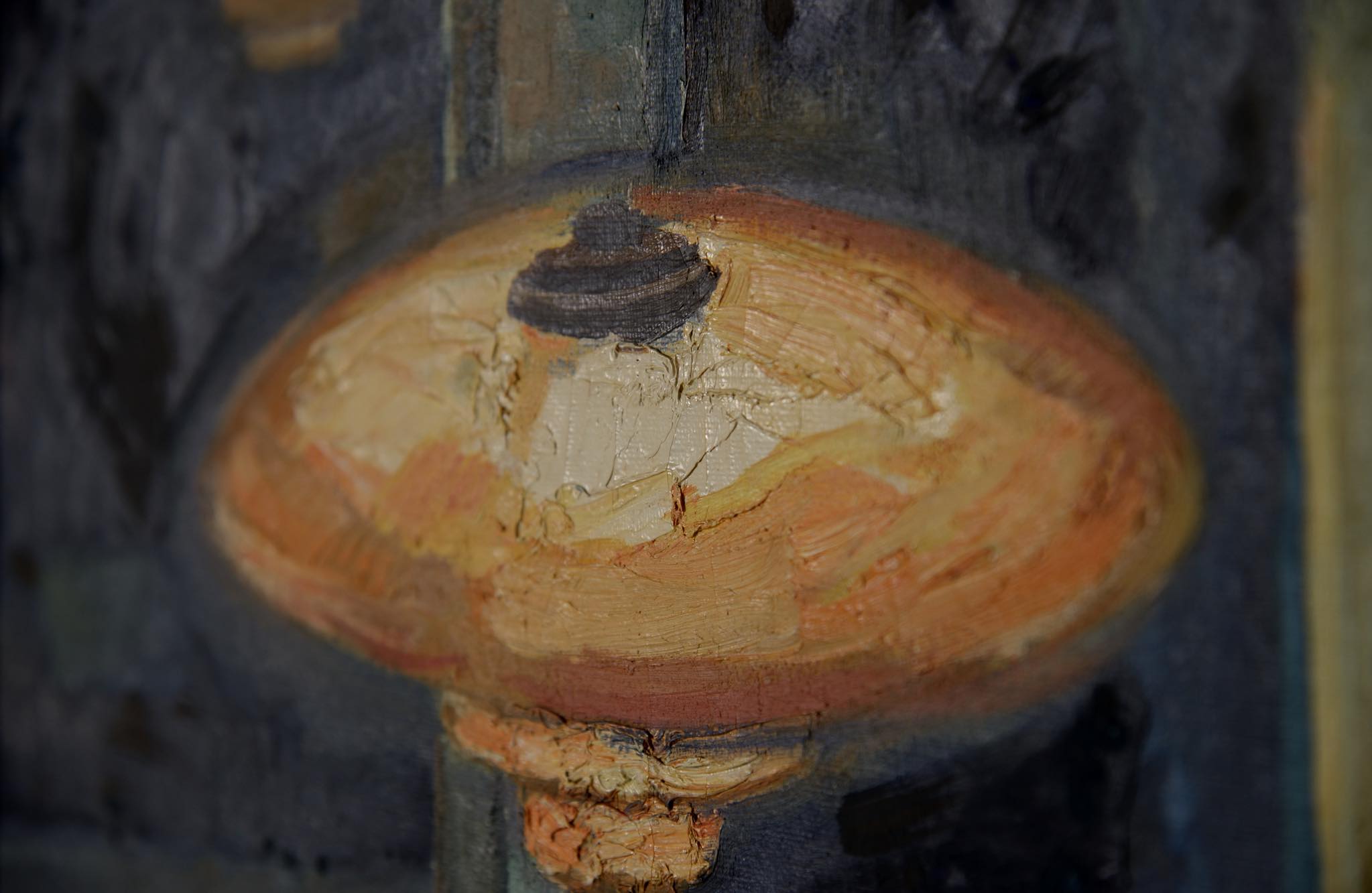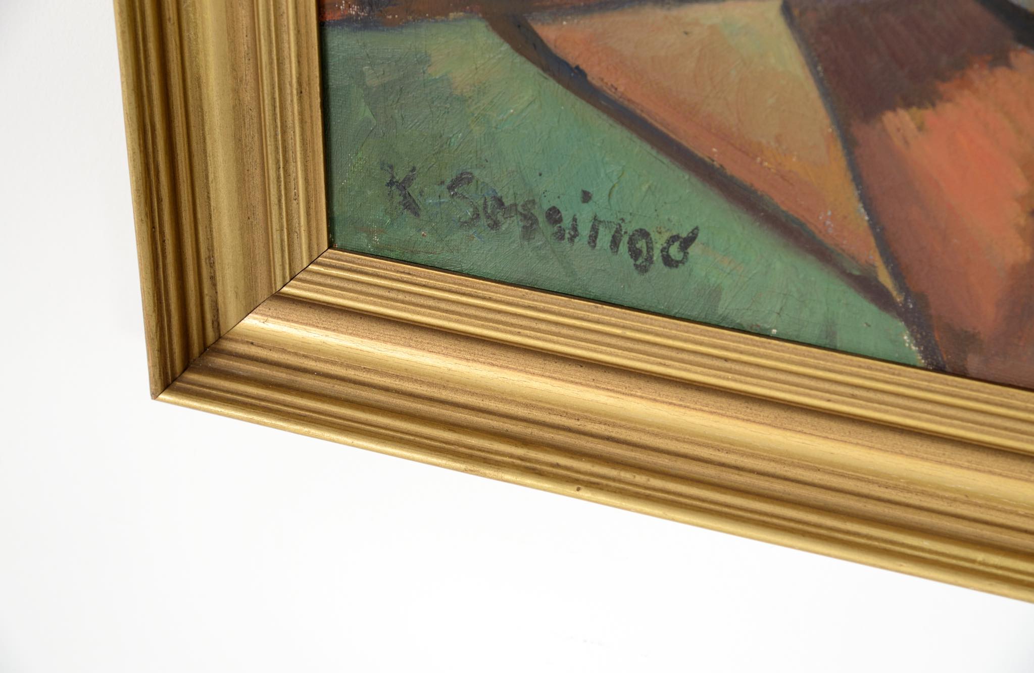 長く厳しい冬を如何に心落ち着かせて過ごすかがテーマとなっているようで、多くの照明デザインは冬に生まれたのだろうと想像します。キャンバスの古さから1940〜50年代頃に描かれたものと思われます。絵の具に若干のクラックが見られますが、コンディションは概ね良好です。