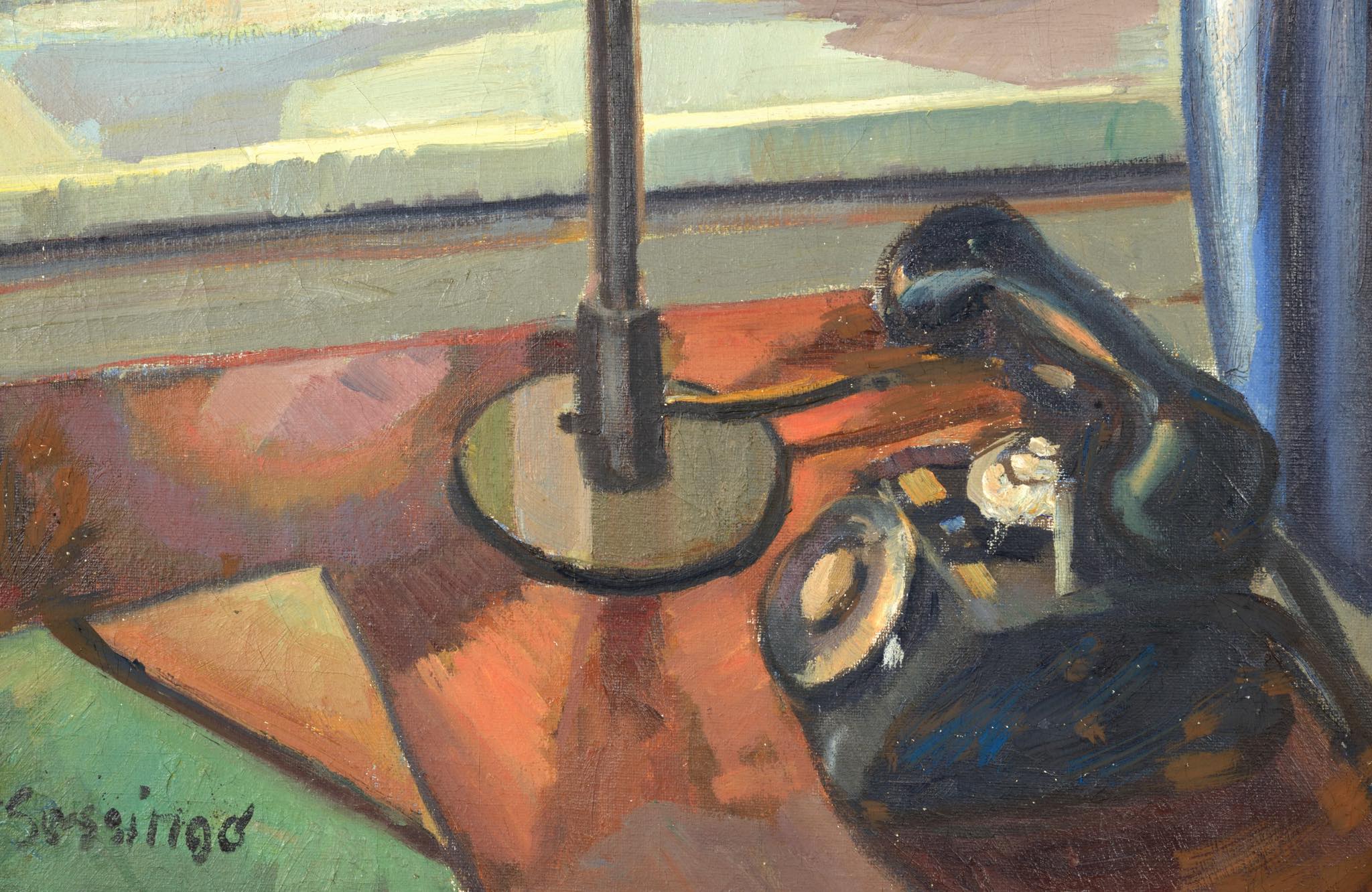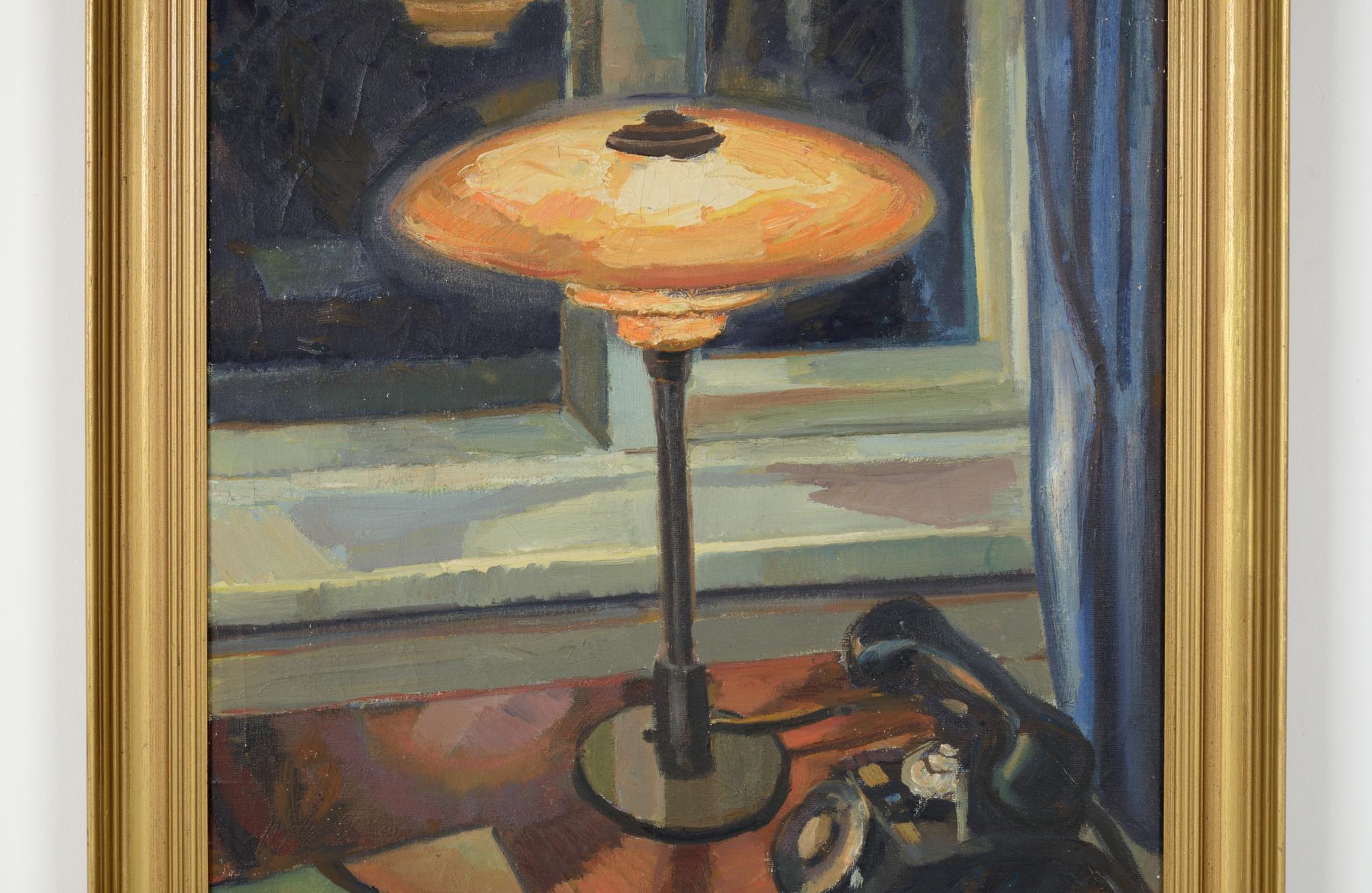 名もなき画家によるものと思われる静物画油彩作品です。窓辺の卓上に、旧式の電話機やアンバーガラスのPHランプが置かれており、暮れかかる頃の窓辺と、そこに映るランプなどの情景が描かれています。デンマークは家具の他、照明類にも長けたデザインが数多く存在し、PH-lampはその代表格です。