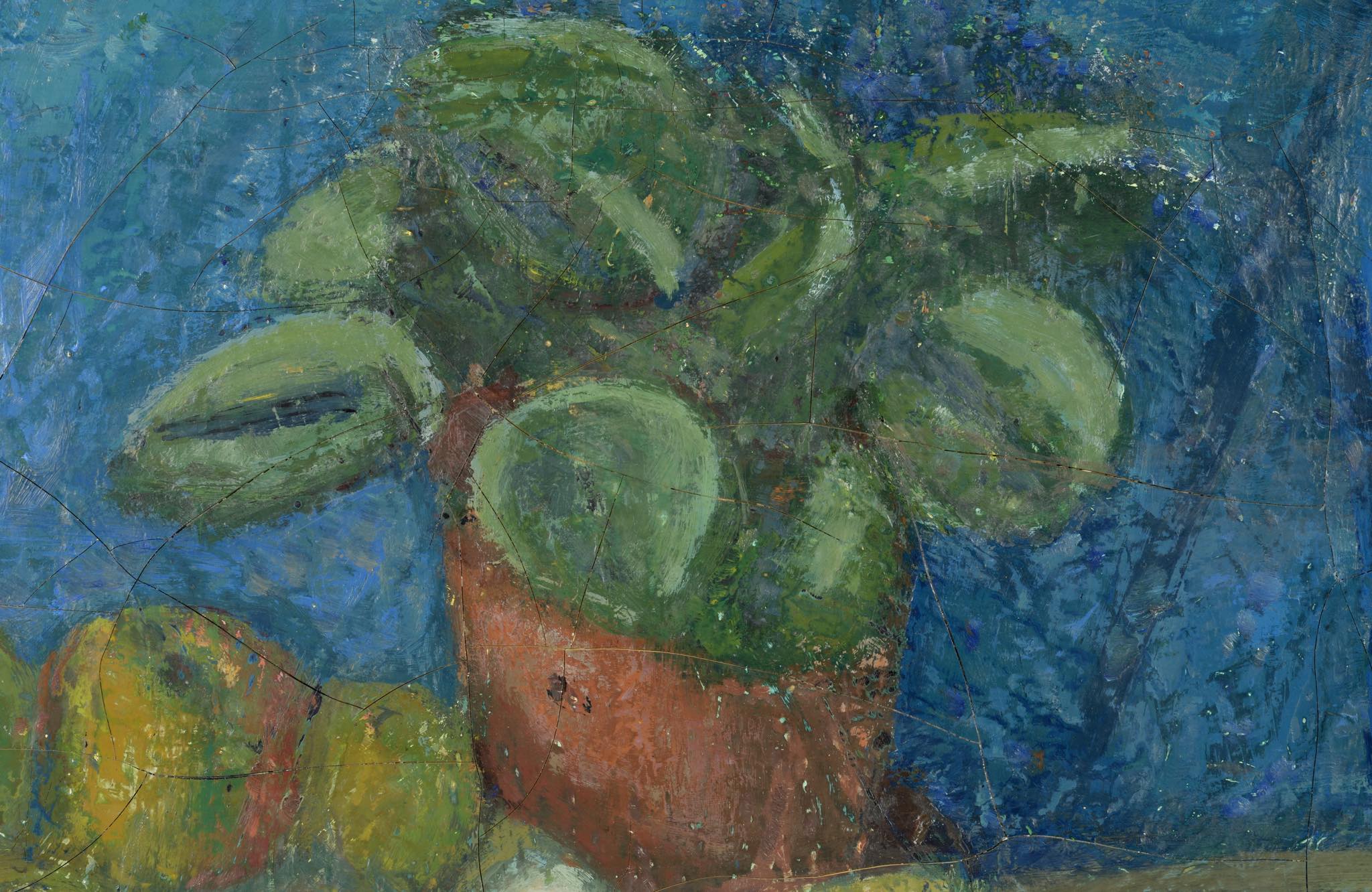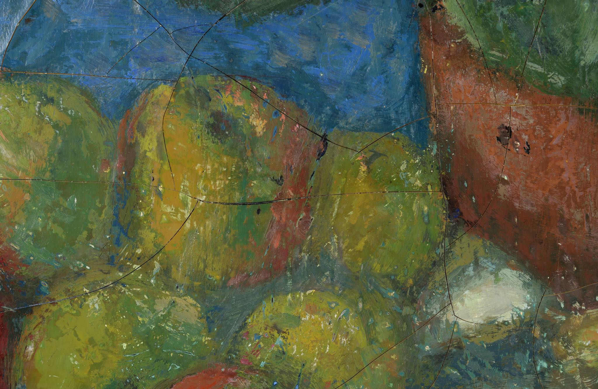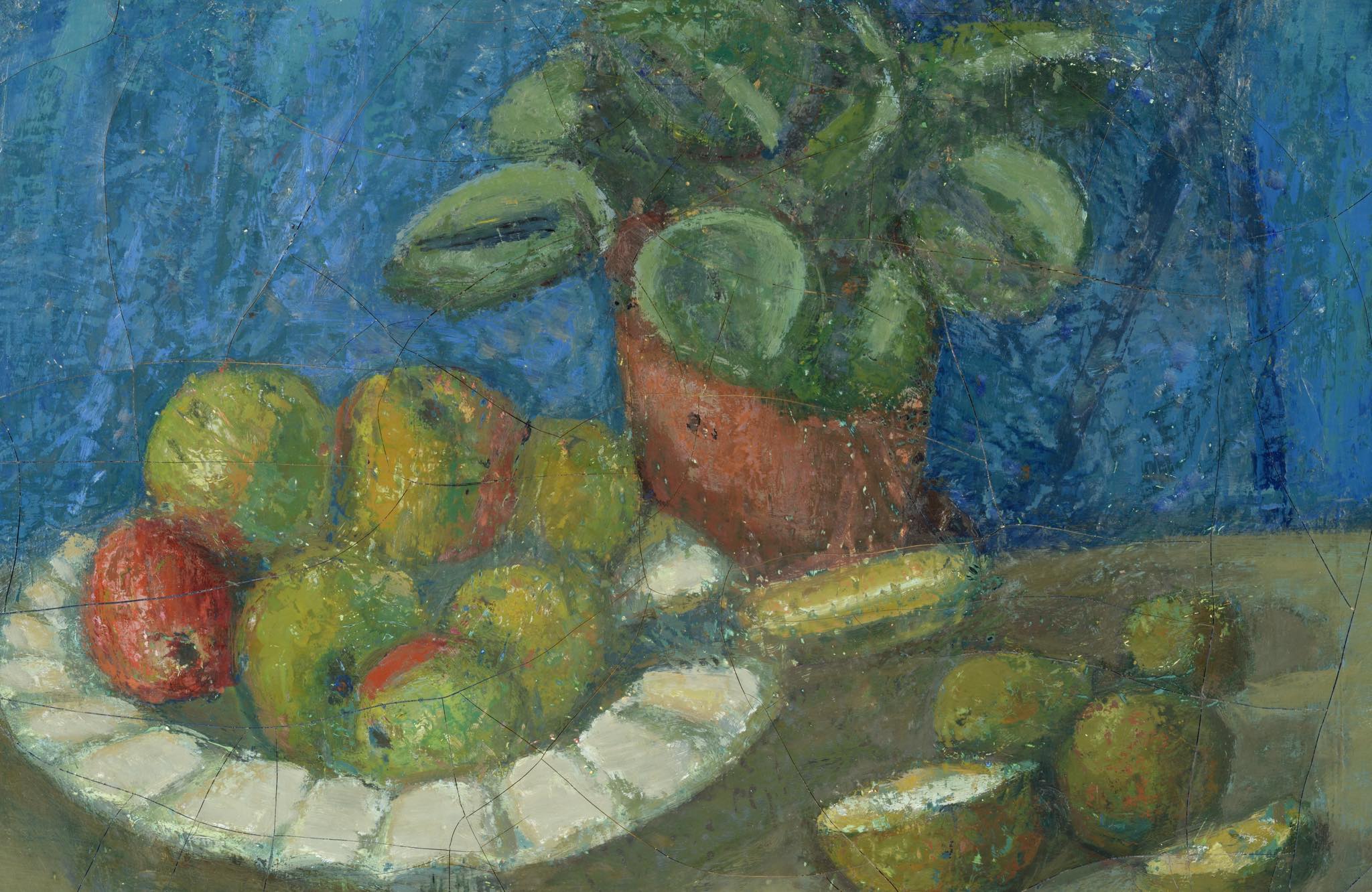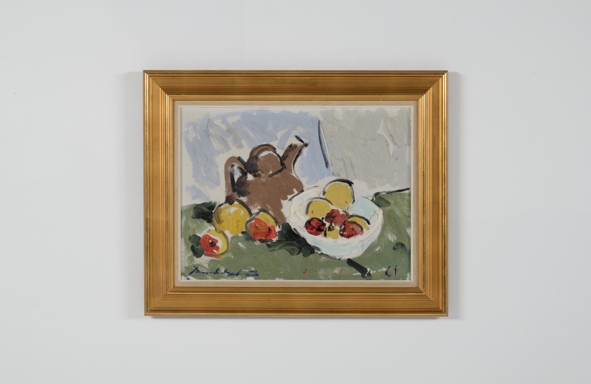 20世紀前葉のデンマークで活躍した画家、Karl Larsen/カール・ラーセンによる油彩作品です。卓上に置かれた果物や鉢植えの植物が独特のタッチで描かれています。下地と絵の具の収縮の差なのか、全体にクラックが見られますが、剥落の恐れはなさそうです。フレームはブラックチェリー材を用いて新たに作成しました。