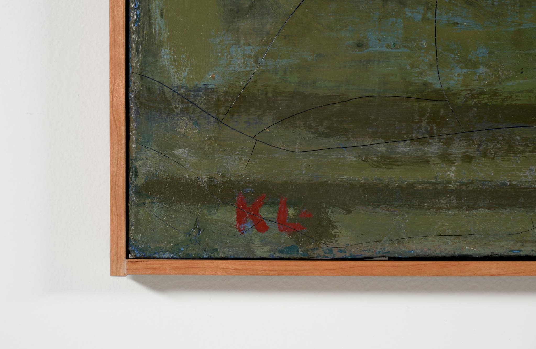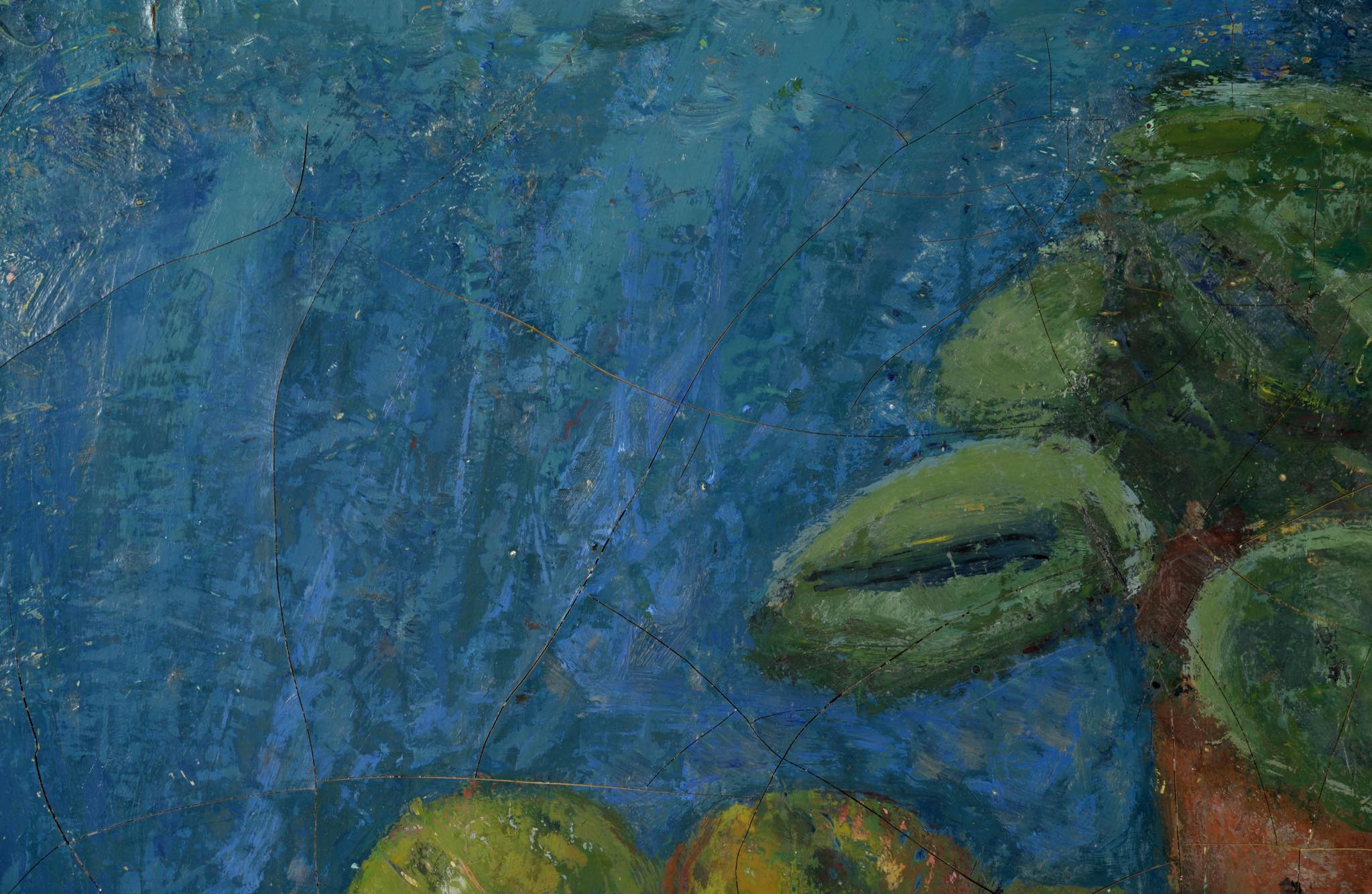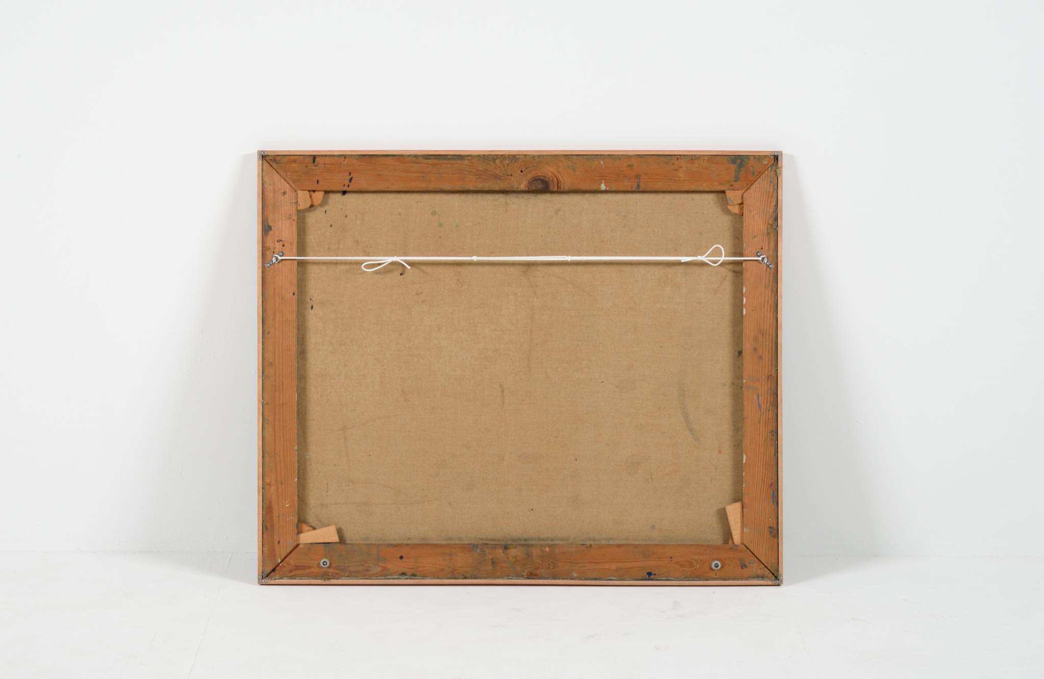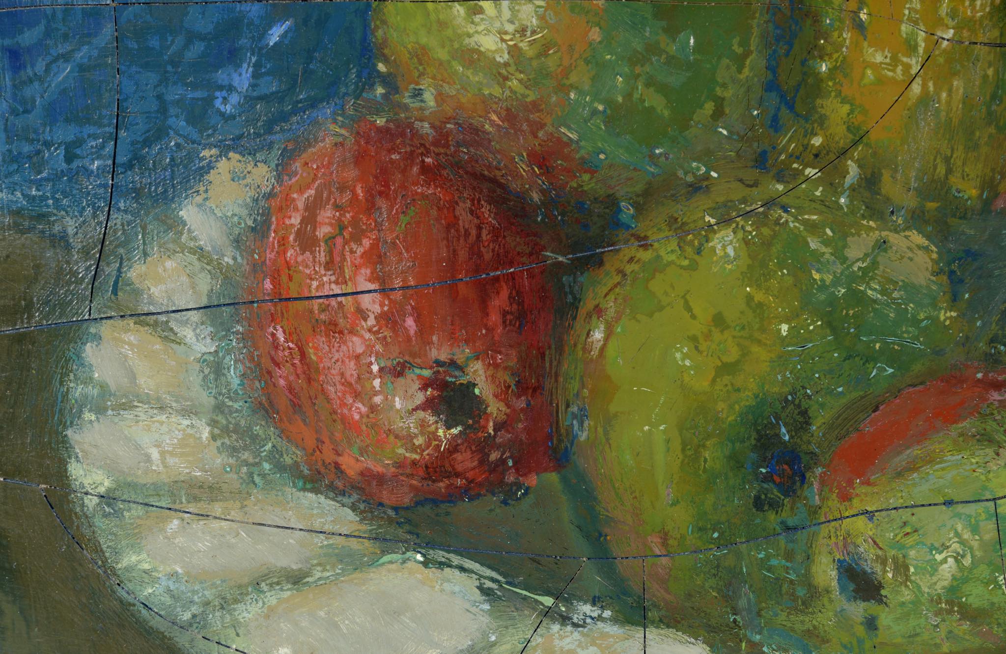 20世紀前葉のデンマークで活躍した画家、Karl Larsen/カール・ラーセンによる油彩作品です。卓上に置かれた果物や鉢植えの植物が独特のタッチで描かれています。下地と絵の具の収縮の差なのか、全体にクラックが見られますが、剥落の恐れはなさそうです。フレームはブラックチェリー材を用いて新たに作成しました。