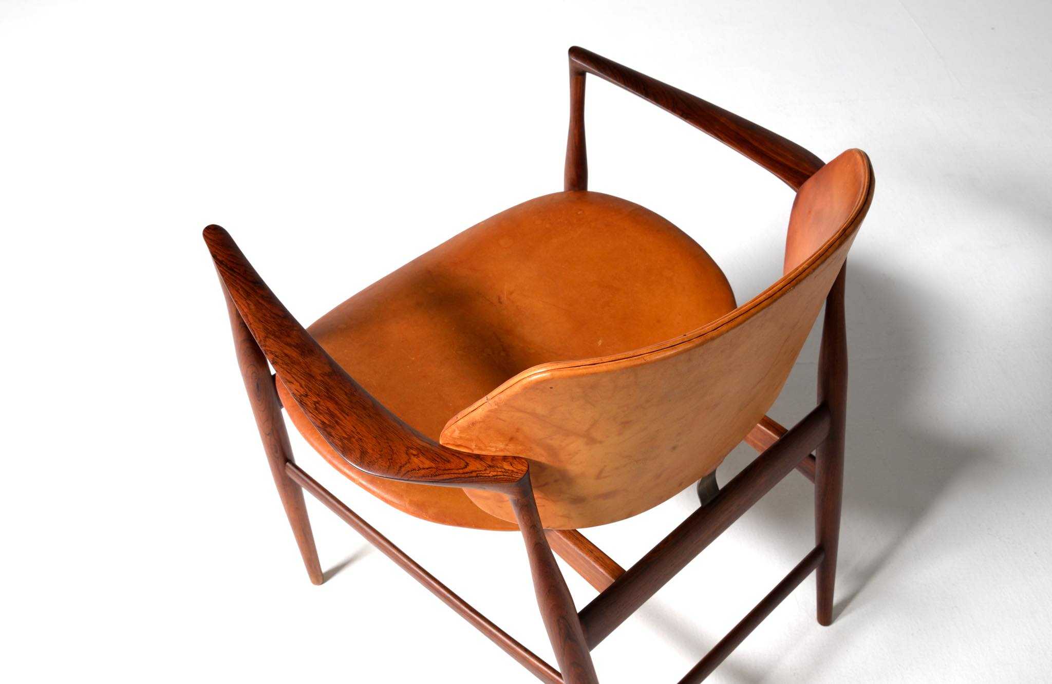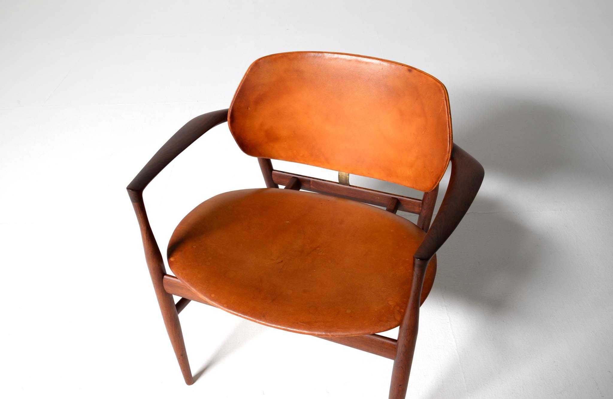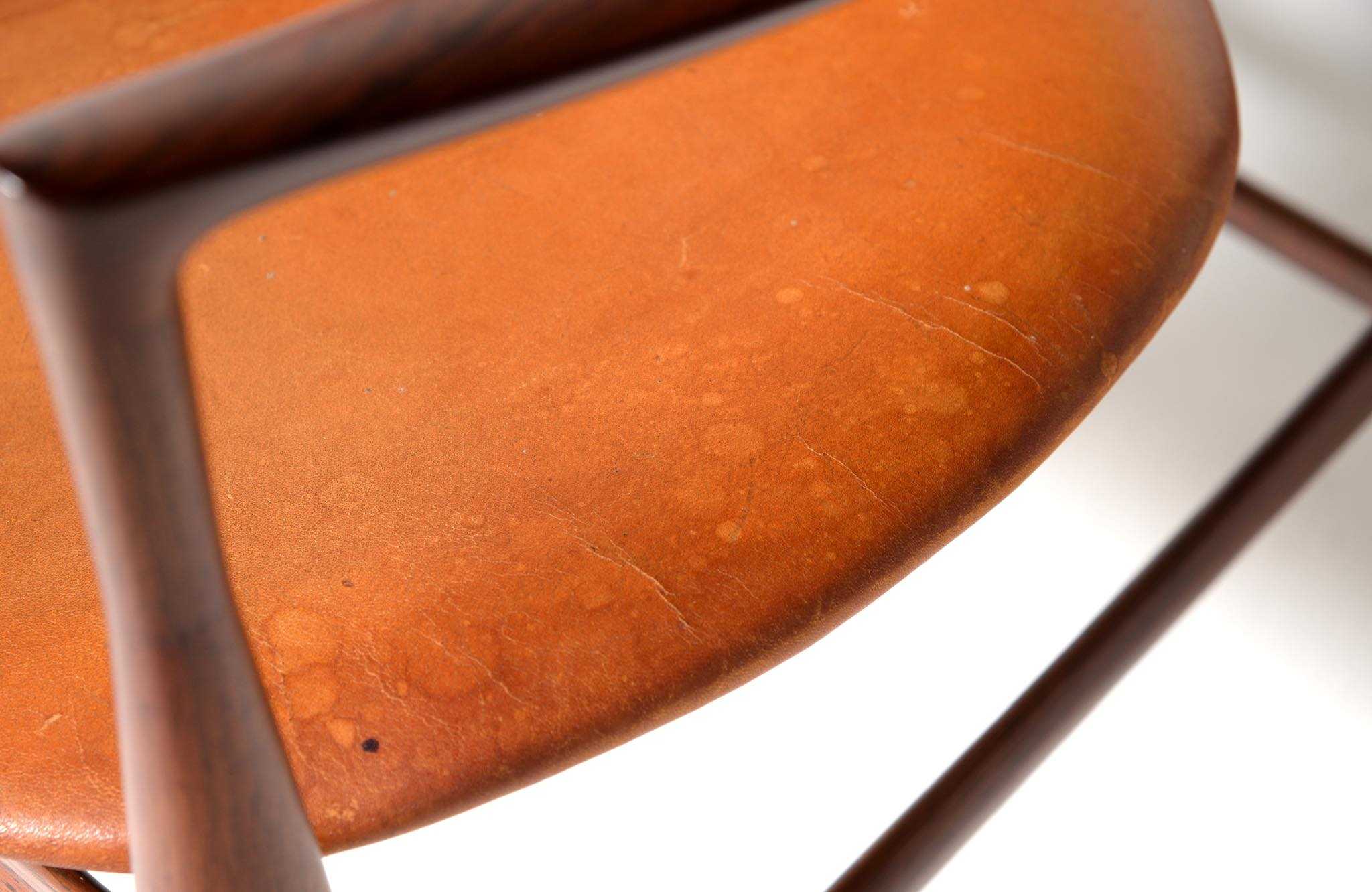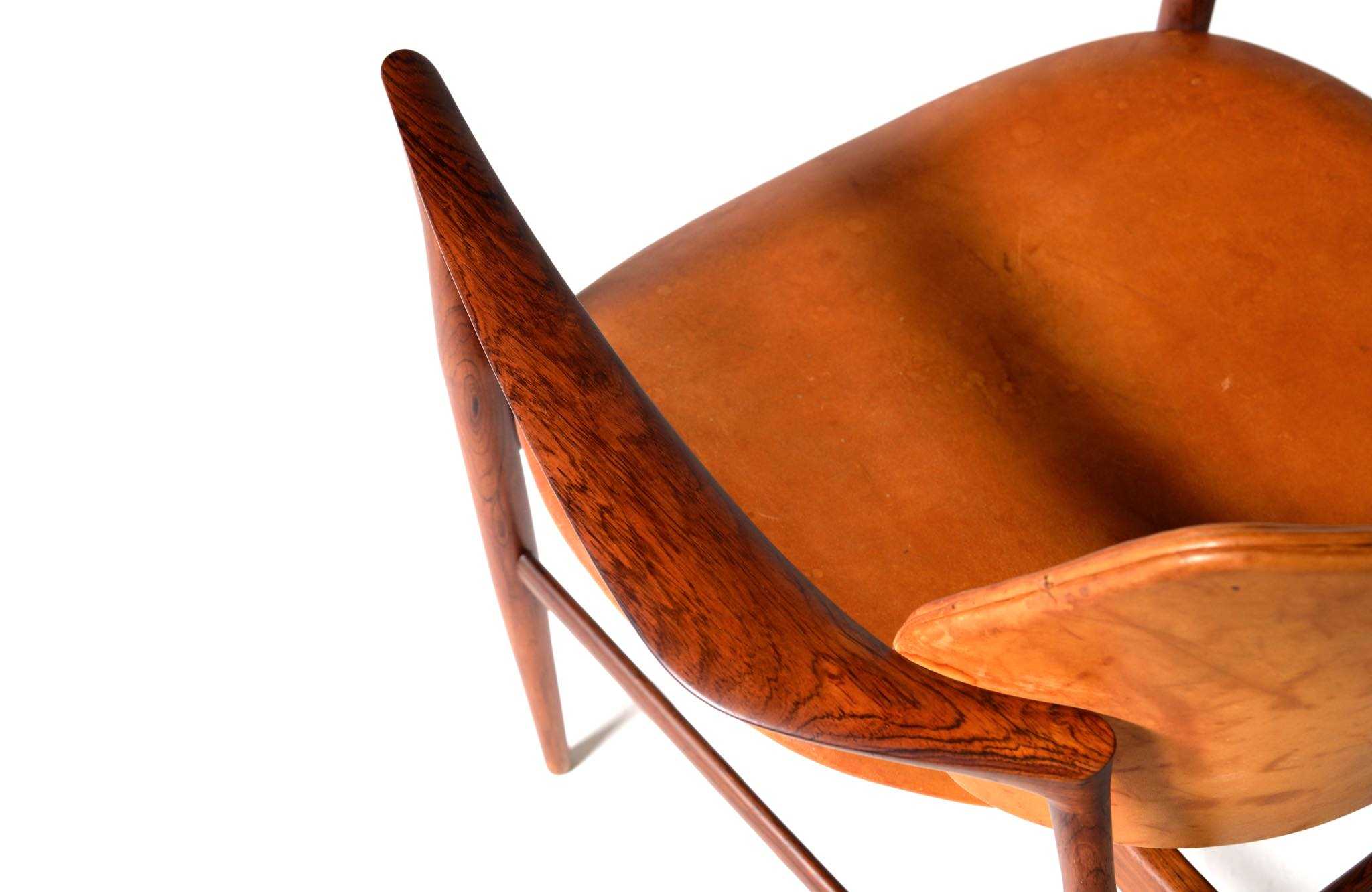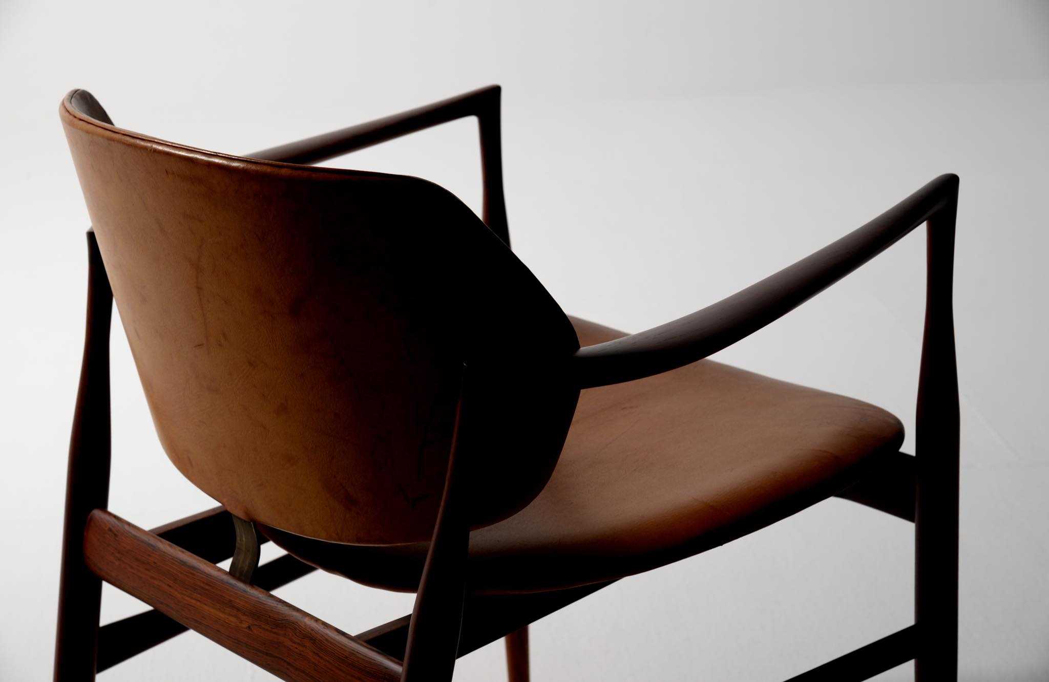 1958年、英国のエリザベス女王とフィリップ殿下がコペンハーゲン滞在中に購入した、と伝えられる ”Elizabeth chair/エリザベスチェア” のアームチェア(カンファレンスタイプ)です。デンマークを代表する家具デザイナーのIb Kofod-Larsen/イブ・コフォード・ラーセンによって1958年に発表され、1960年代にかけて作られたものでしょう。フレームはブラジリアンと思しきローズウッドが用いられており、とても良い木取りがなされています。シートはオリジナルの皮革のようで、使い込まれながらも大きなダメージのないベストな状態を保っていますが、背もたれとフレームの接合にわずかな緩みがみられますので、労わりながら使われると良いでしょう。張り替えの際に緩みを締めることは可能です。