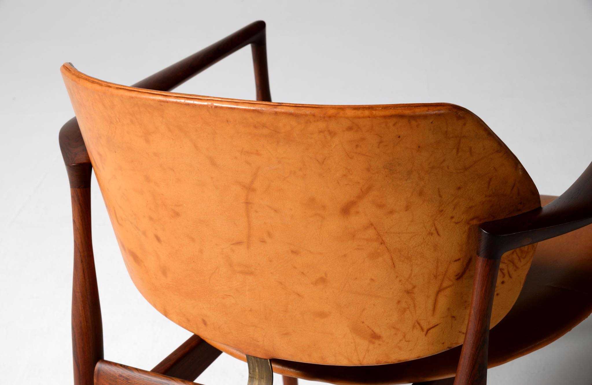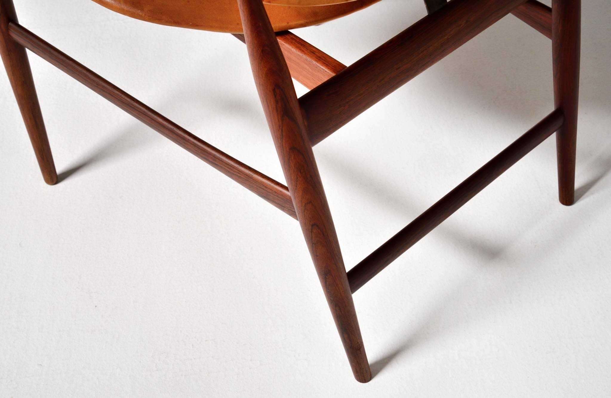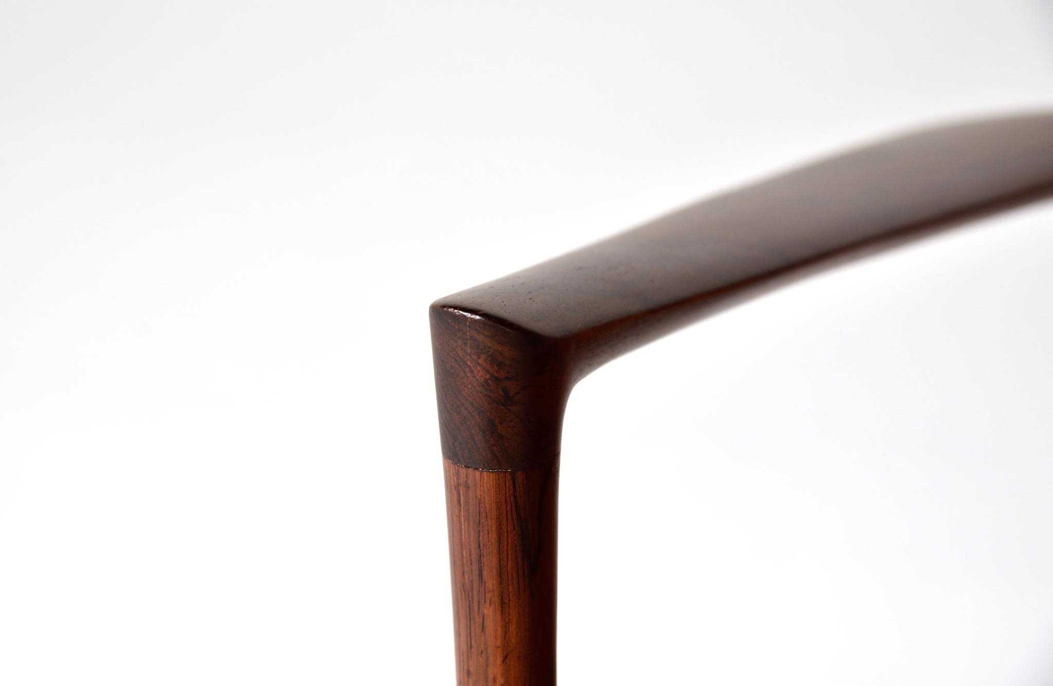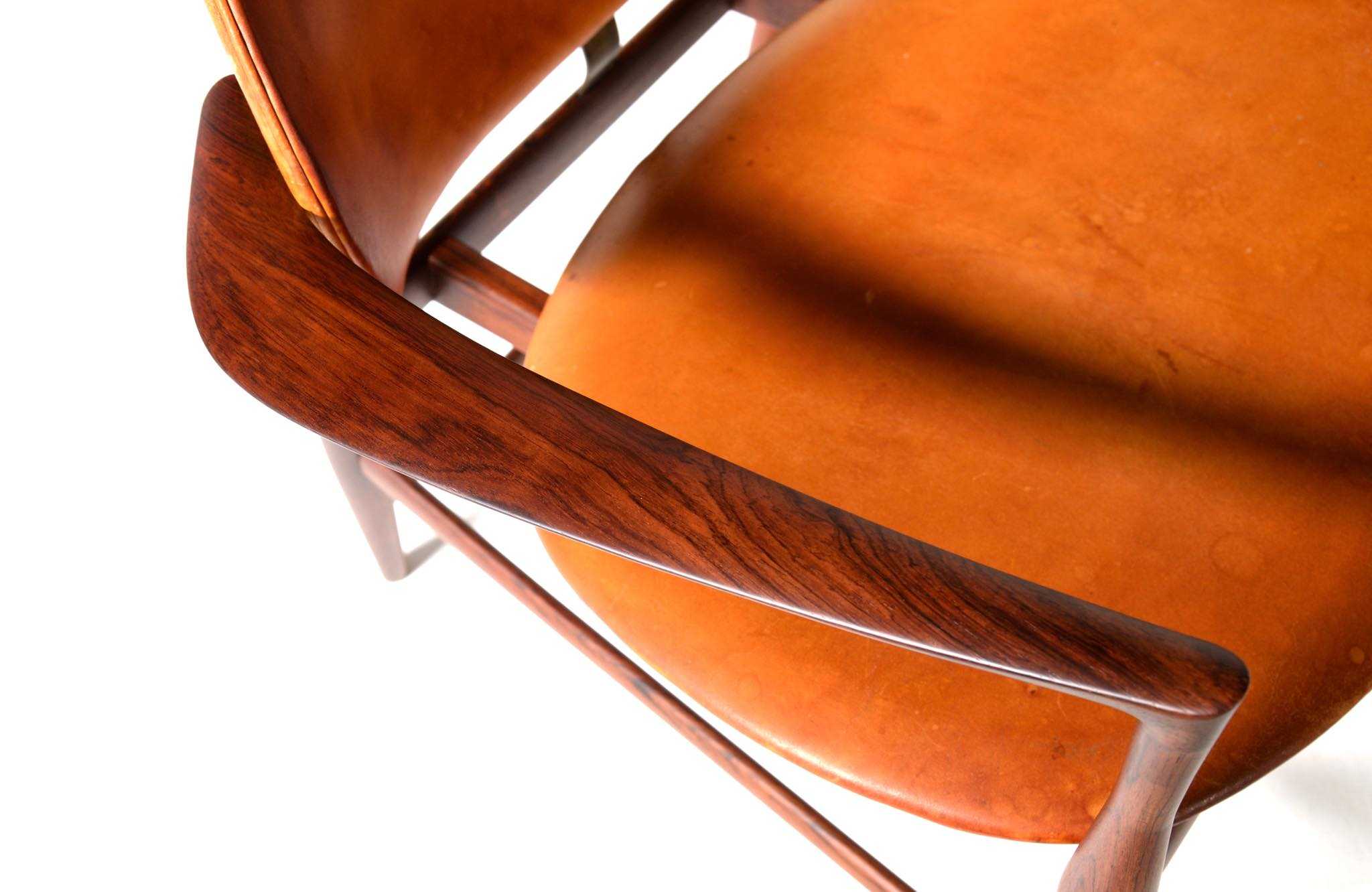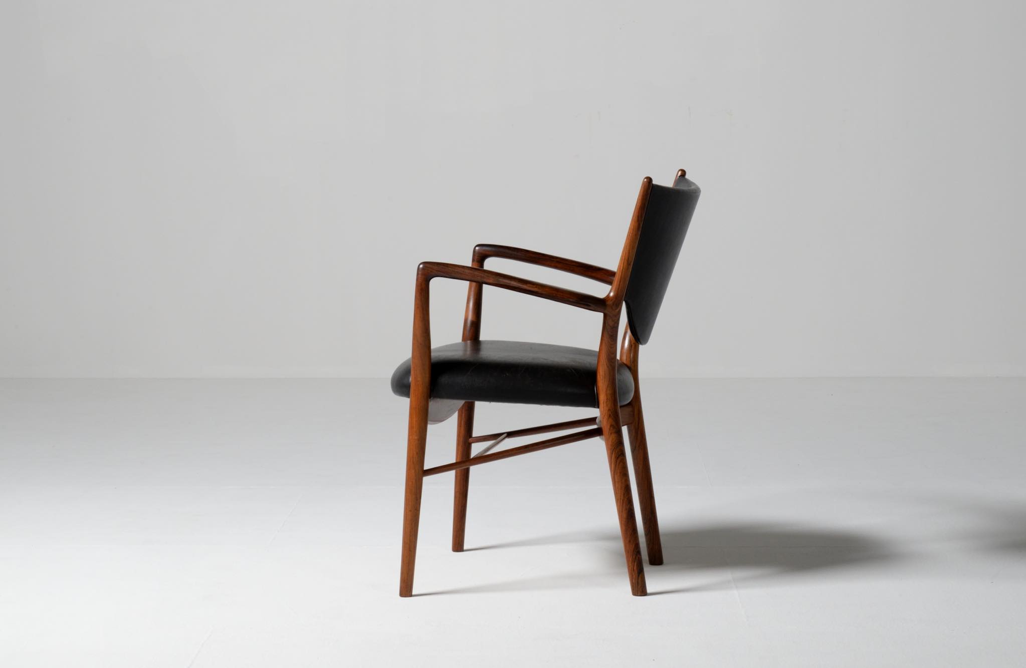 1958年、英国のエリザベス女王とフィリップ殿下がコペンハーゲン滞在中に購入した、と伝えられる ”Elizabeth chair/エリザベスチェア” のアームチェア(カンファレンスタイプ)です。デンマークを代表する家具デザイナーのIb Kofod-Larsen/イブ・コフォード・ラーセンによって1958年に発表され、1960年代にかけて作られたものでしょう。フレームはブラジリアンと思しきローズウッドが用いられており、とても良い木取りがなされています。シートはオリジナルの皮革のようで、使い込まれながらも大きなダメージのないベストな状態を保っていますが、背もたれとフレームの接合にわずかな緩みがみられますので、労わりながら使われると良いでしょう。張り替えの際に緩みを締めることは可能です。