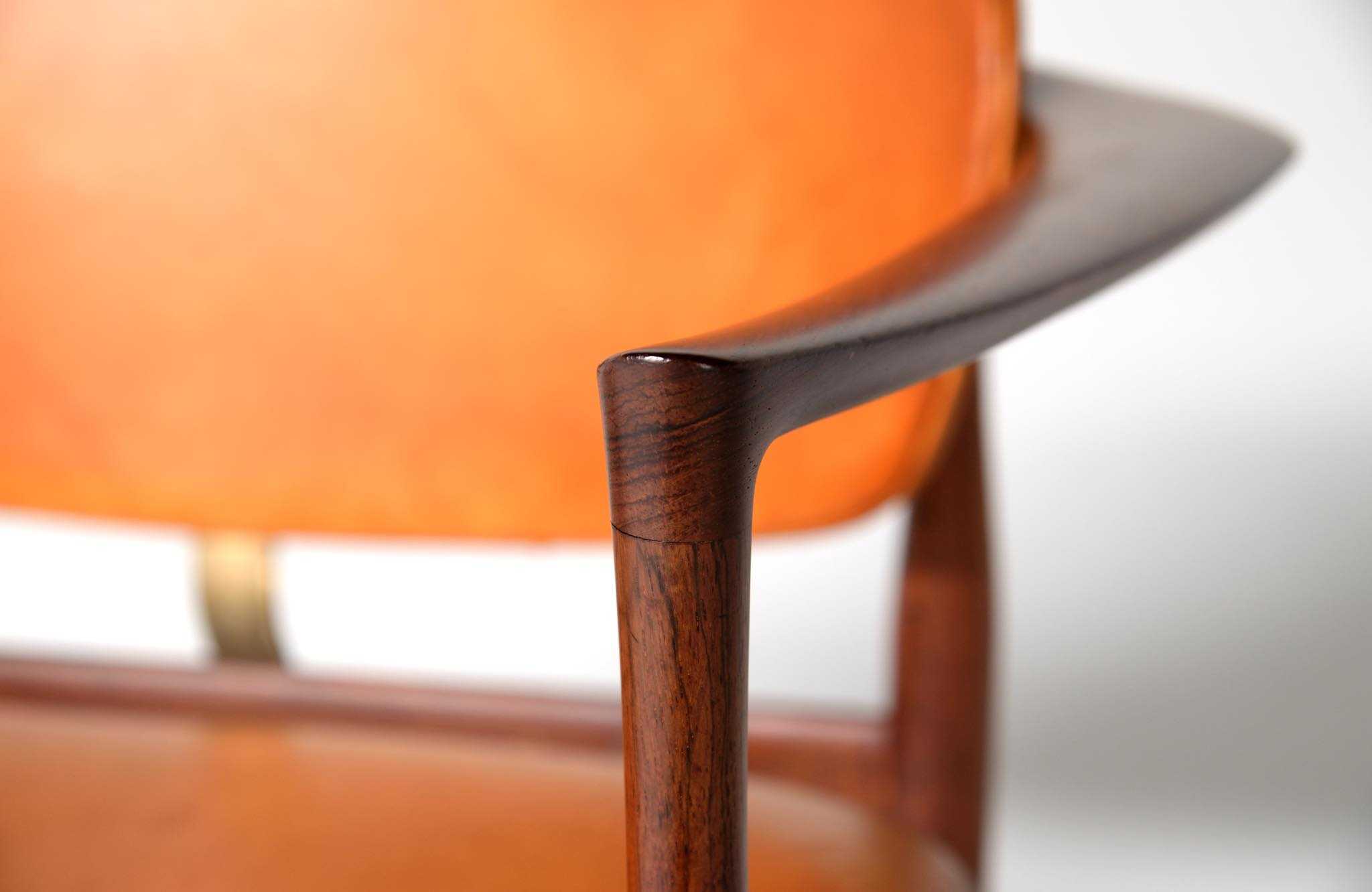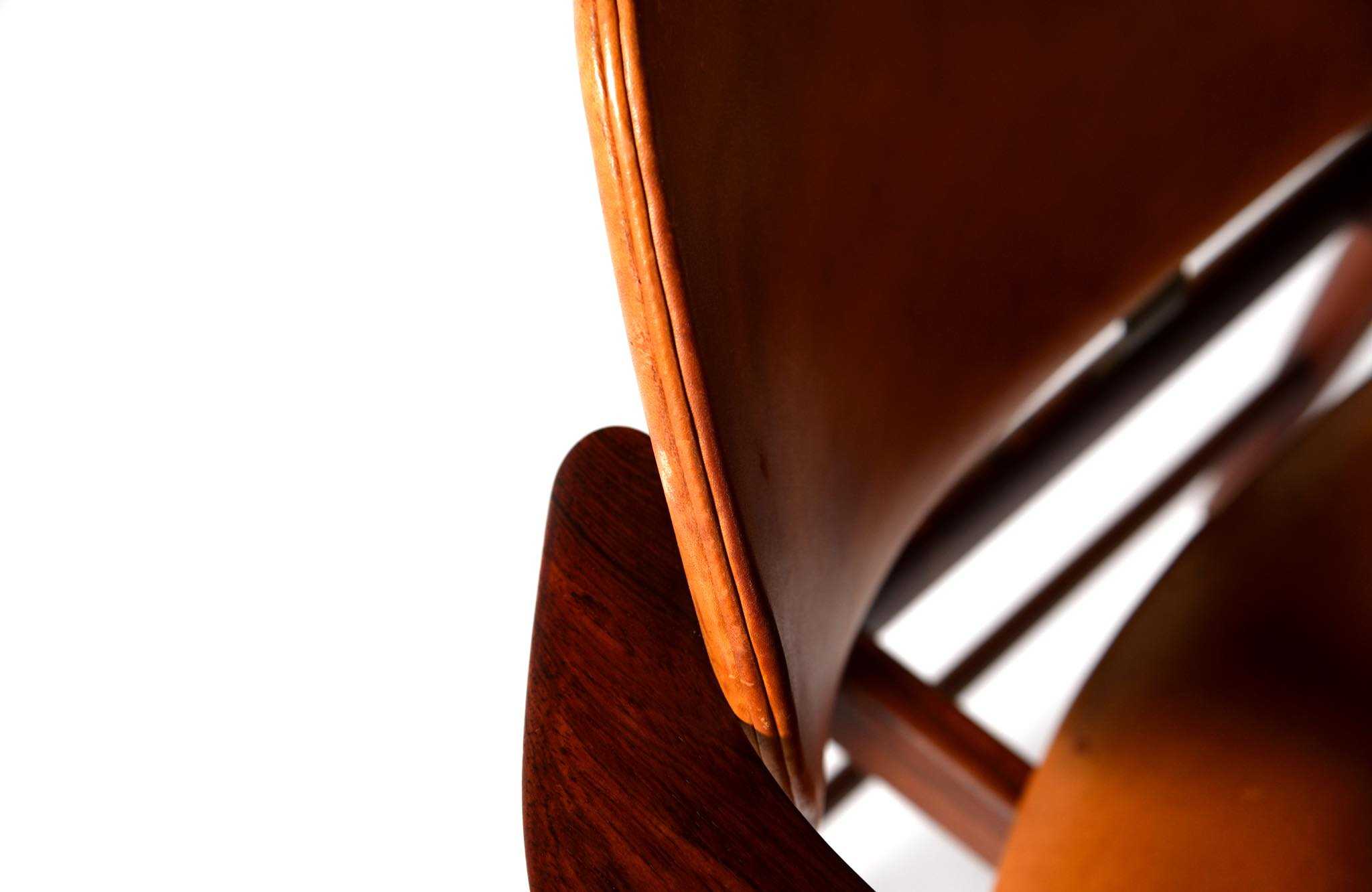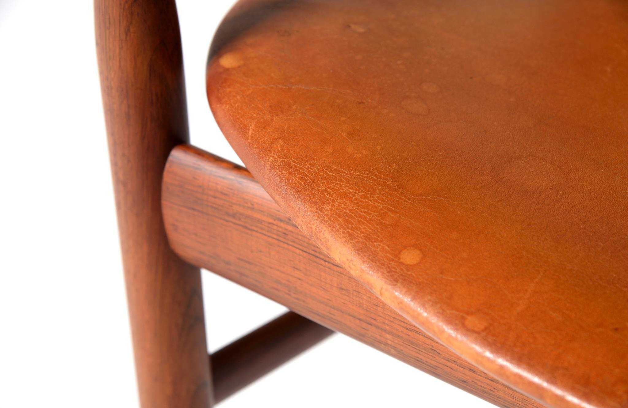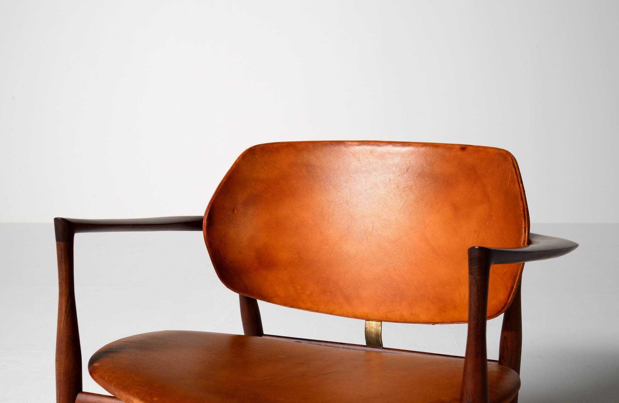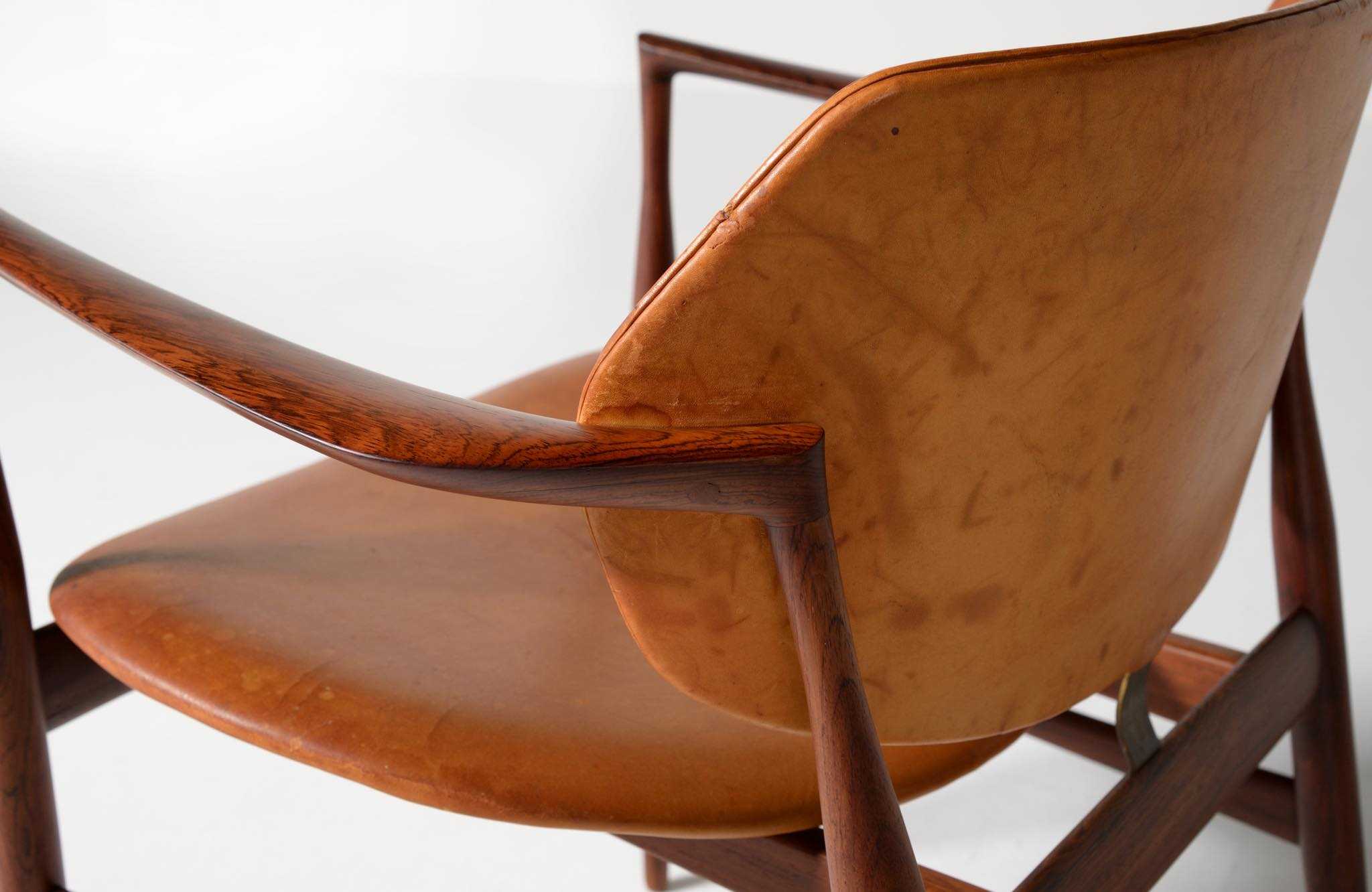 1958年、英国のエリザベス女王とフィリップ殿下がコペンハーゲン滞在中に購入した、と伝えられる ”Elizabeth chair/エリザベスチェア” のアームチェア(カンファレンスタイプ)です。デンマークを代表する家具デザイナーのIb Kofod-Larsen/イブ・コフォード・ラーセンによって1958年に発表され、1960年代にかけて作られたものでしょう。フレームはブラジリアンと思しきローズウッドが用いられており、とても良い木取りがなされています。シートはオリジナルの皮革のようで、使い込まれながらも大きなダメージのないベストな状態を保っていますが、背もたれとフレームの接合にわずかな緩みがみられますので、労わりながら使われると良いでしょう。張り替えの際に緩みを締めることは可能です。