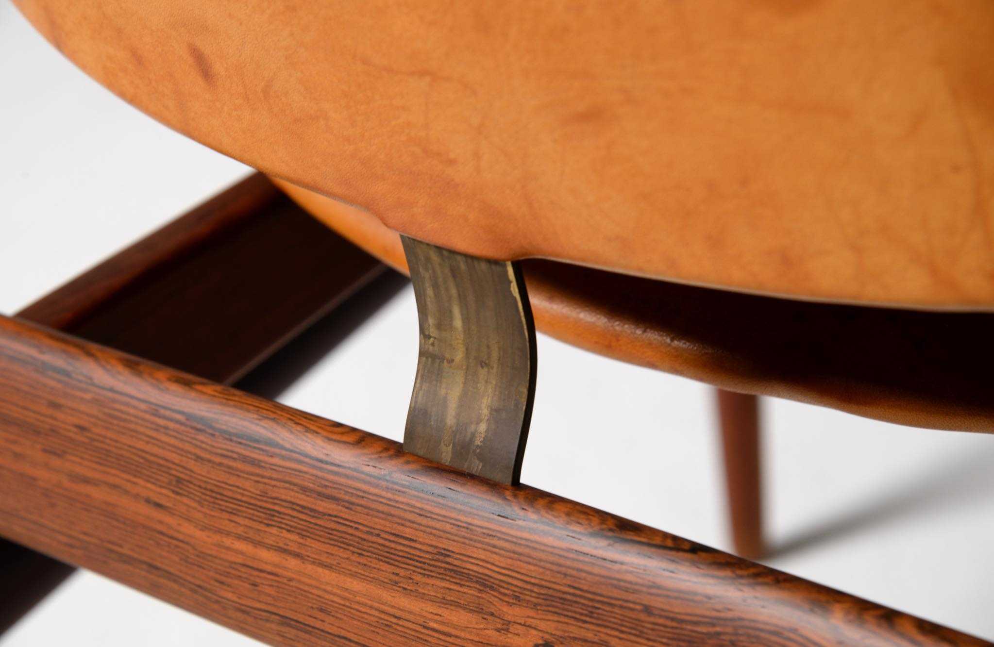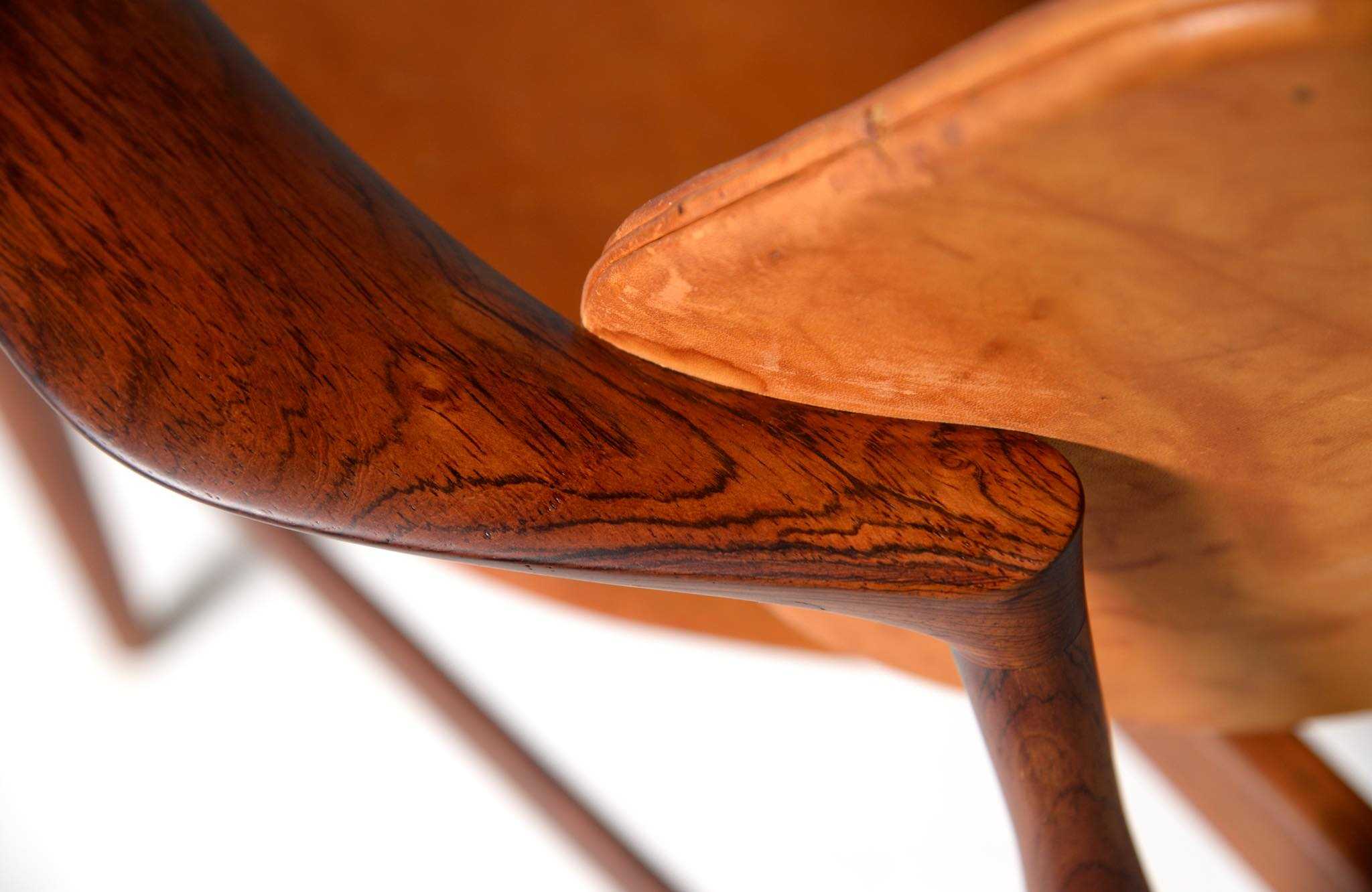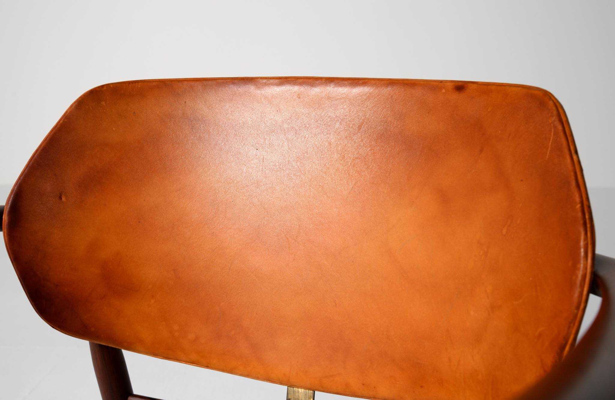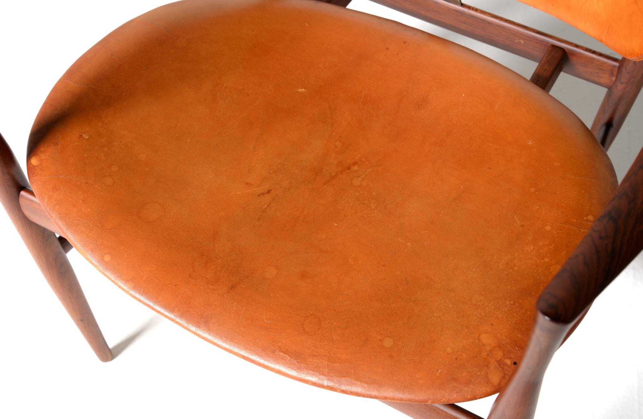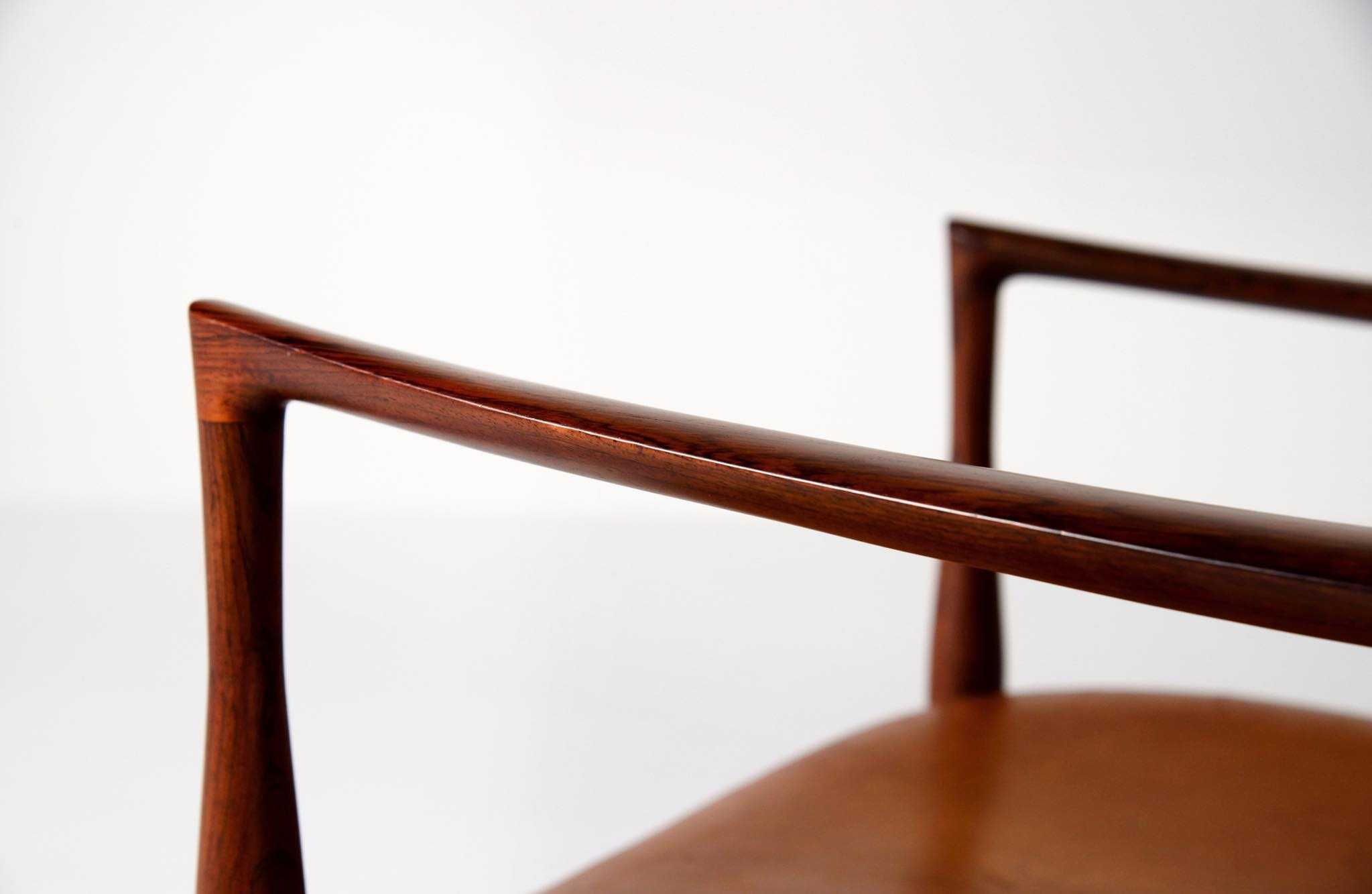 1958年、英国のエリザベス女王とフィリップ殿下がコペンハーゲン滞在中に購入した、と伝えられる ”Elizabeth chair/エリザベスチェア” のアームチェア(カンファレンスタイプ)です。デンマークを代表する家具デザイナーのIb Kofod-Larsen/イブ・コフォード・ラーセンによって1958年に発表され、1960年代にかけて作られたものでしょう。フレームはブラジリアンと思しきローズウッドが用いられており、とても良い木取りがなされています。シートはオリジナルの皮革のようで、使い込まれながらも大きなダメージのないベストな状態を保っていますが、背もたれとフレームの接合にわずかな緩みがみられますので、労わりながら使われると良いでしょう。張り替えの際に緩みを締めることは可能です。
